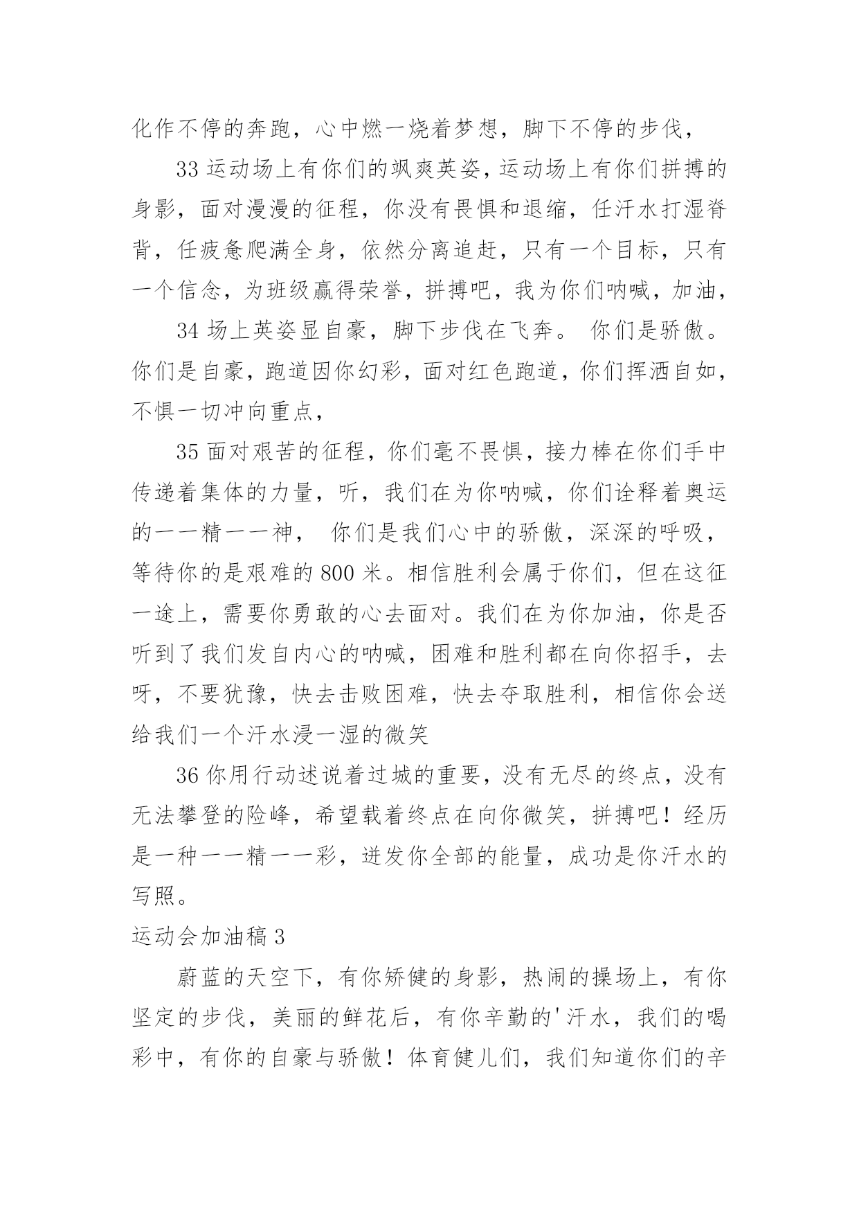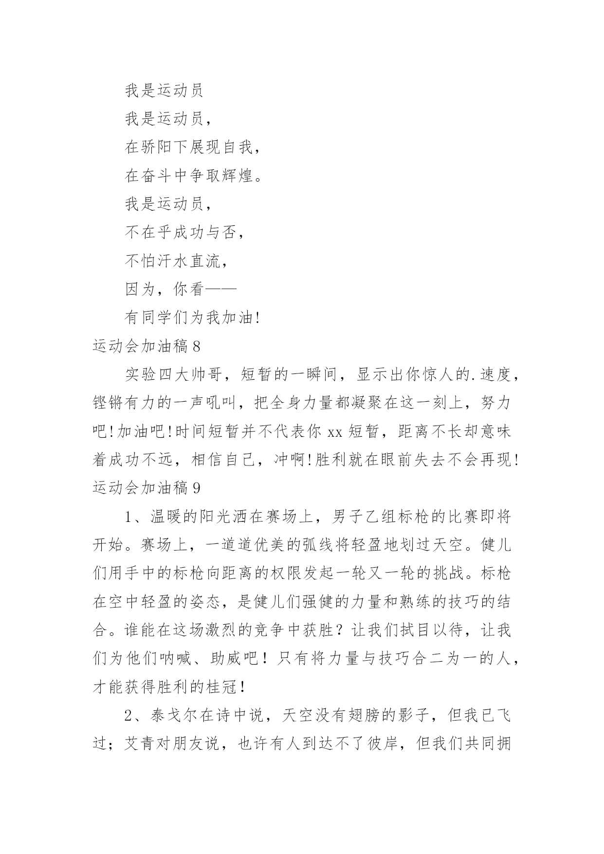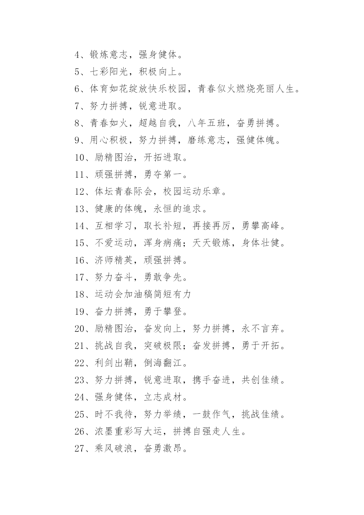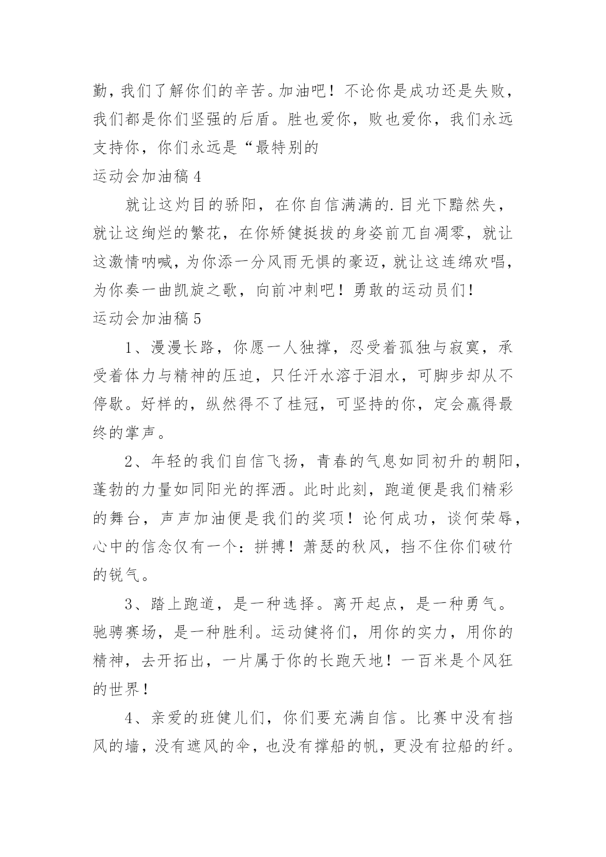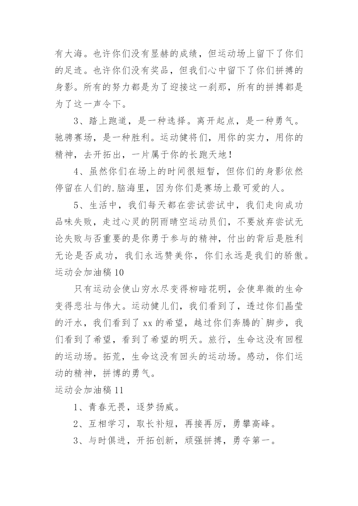 运动会加油稿运动会加油稿在生活中,接触并使用加油稿的人越来越多,加油稿是一种对他人有正向激励作用的文稿。如何写一份恰当的加油稿呢?以下是小编精心整理的运动会加油稿,希望对大家有所帮助。运动会加油稿1人生的路有坦途也有坎坷;走过的岁月有欢笑也有苦涩。泪水告诉我一个跌倒的故事。汗水使我多了一份沉重几多成熟。理想毕竟不一样于现实,失败是生活的一部分谁也无法选取无法拒绝。人生要自我去拼搏去奋斗,在风雨中百屈不挠、勇往直前,在自我的每个驿站都留下一段无悔的回忆。流泪不是失落徘徊不是迷惑,成功属于那些战胜失败坚持不懈勇于追求梦想的'人。白色的跑道是你运动的轨迹台上的呐喊是对你拼搏的肯定。这是耐力与意志的检验超载自我挑战自我是你的目标,当你体验过从他人身边攸勿而过时你将再次获得新的感悟,那是自我人生价值的体现更是为班级争夺荣誉的自豪拼搏吧!努力吧!运动健儿们胜利就在眼前是男儿我们不言放下。运动会加油稿225看,终点就在眼前,听,同学为你呼喊。鼓起勇气奋力向前,用你的荣誉带给我们希望。26看!那一面面迎风飘舞的彩旗,是一朵朵盛开的鲜花;听!那一阵阵惊天动地的欢呼,是回响在耳边胜利的风声。运动场上的你们,是胜利的标志,运动场上的你们,是青春的赞叹。去吧!去迎接那伟大的挑战,去吧!去做一名追风的少年。27人生的路,有坦途,也有坎坷;做过的岁月,有欢笑,也有苦涩,泪水告诉我一个跌倒的故事,汗水使我多了一份沉重,几多成熟。28也许流星并不少见,但它燃一烧的刹那,留给人间最美丽的回忆!也许笑脸并不少见,但胜利的喜悦,总会留给世界一一精一一彩的一瞬!是的,那些曾经美妙的东西只有短短的一瞬间,但那却把最辉煌的一刻留给了人间。胜利,是每个人所追求的,胜利的喜悦,是胜利与重新开始的转折,胜利是新的开始!29不长不短的距离,需要的.是全身心全程投入,自始至终你们都在拼全力此时此刻,你们处在最风光的一刻,无论第几坚持胜利的信心,只要跑下来,你们就是英雄30时间在流逝,赛道在延伸,成功在你面前展现心脏的跳动,热血在沸腾,辉煌在你脚下铸就加油吧,健儿们,31这是意志的拼搏。这是速度的挑战。胜利在向你们招手/胜利在向你们呼唤32不为鲜花的围绕,不为刹那的荣耀,只有执着的信念,化作不停的奔跑,心中燃一烧着梦想,脚下不停的步伐,33运动场上有你们的飒爽英姿,运动场上有你们拼搏的身影,面对漫漫的征程,你没有畏惧和退缩,任汗水打湿脊背,任疲惫爬满全身,依然分离追赶,只有一个目标,只有一个信念,为班级赢得荣誉,拼搏吧,我为你们呐喊,加油,34场上英姿显自豪,脚下步伐在飞奔。你们是骄傲。你们是自豪,跑道因你幻彩,面对红色跑道,你们挥洒自如,不惧一切冲向重点,35面对艰苦的征程,你们毫不畏惧,接力棒在你们手中传递着集体的力量,听,我们在为你呐喊,你们诠释着奥运的一一精一一神,你们是我们心中的骄傲,深深的呼吸,等待你的是艰难的800米。相信胜利会属于你们,但在这征一途上,需要你勇敢的心去面对。我们在为你加油,你是否听到了我们发自内心的呐喊,困难和胜利都在向你招手,去呀,不要犹豫,快去击败困难,快去夺取胜利,相信你会送给我们一个汗水浸一湿的微笑36你用行动述说着过城的重要,没有无尽的终点,没有无法攀登的险峰,希望载着终点在向你微笑,拼搏吧!经历是一种一一精一一彩,迸发你全部的能量,成功是你汗水的写照。运动会加油稿3蔚蓝的天空下,有你矫健的身影,热闹的操场上,有你坚定的步伐,美丽的鲜花后,有你辛勤的'汗水,我们的喝彩中,有你的自豪与骄傲!体育健儿们,我们知道你们的辛勤,我们了解你们的辛苦。加油吧!不论你是成功还是失败,我们都是你们坚强的后盾。胜也爱你,败也爱你,我们永远支持你,你们永远是“最特别的运动会加油稿4就让这灼目的骄阳,在你自信满满的.目光下黯然失,就让这绚烂的繁花,在你矫健挺拔的身姿前兀自凋零,就让这激情呐喊,为你添一分风雨无惧的豪迈,就让这连绵欢唱,为你奏一曲凯旋之歌,向前冲刺吧!勇敢的运动员们!运动会加油稿51、漫漫长路,你愿一人独撑,忍受着孤独与寂寞,承受着体力与精神的压迫,只任汗水溶于泪水,可脚步却从不停歇。好样的,纵然得不了桂冠,可坚持的你,定会赢得最终的掌声。2、年轻的我们自信飞扬,青春的气息如同初升的朝阳,蓬勃的力量如同阳光的挥洒。此时此刻,跑道便是我们精彩的舞台,声声加油便是我们的奖项!论何成功,谈何荣辱,心中的信念仅有一个:拼搏!萧瑟的秋风,挡不住你们破竹的锐气。3、踏上跑道,是一种选择。离开起点,是一种勇气。驰骋赛场,是一种胜利。运动健将们,用你的实力,用你的精神,去开拓出,一片属于你的长跑天地!一百米是个风狂的世界!4、亲爱的班健儿们,你们要充满自信。比赛中没有挡风的墙,没有遮风的伞,也没有撑船的帆,更没有拉船的纤。事在人为,人定胜天。原你们养精蓄锐,对