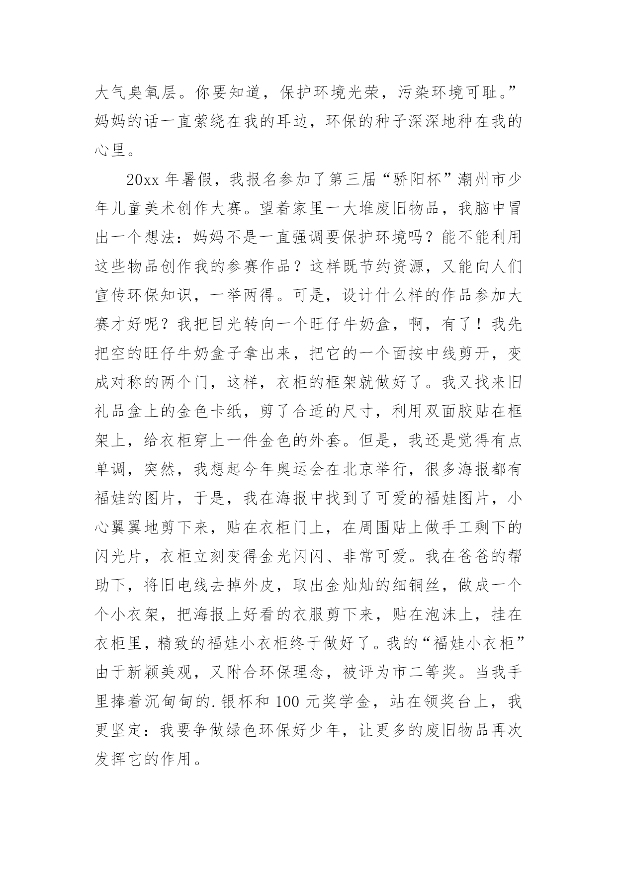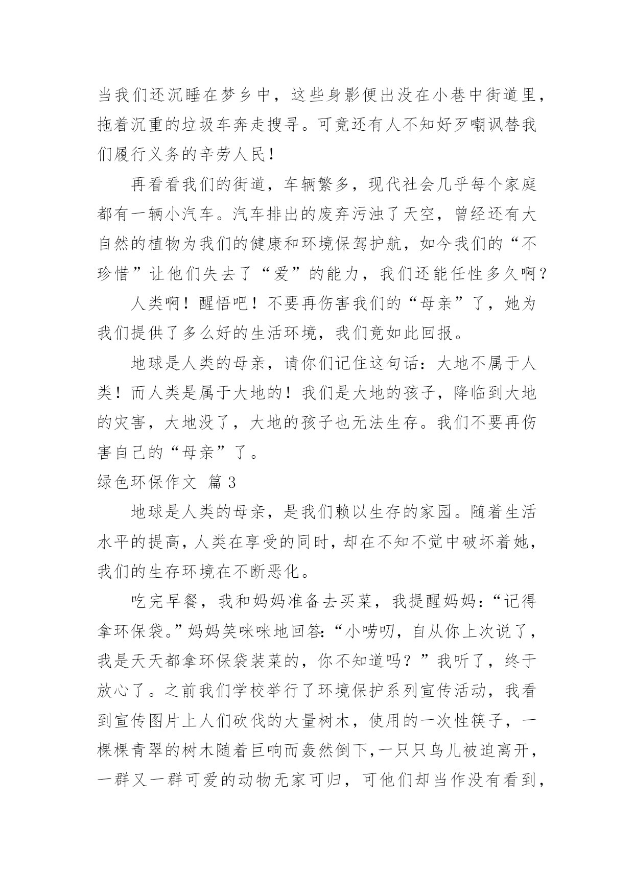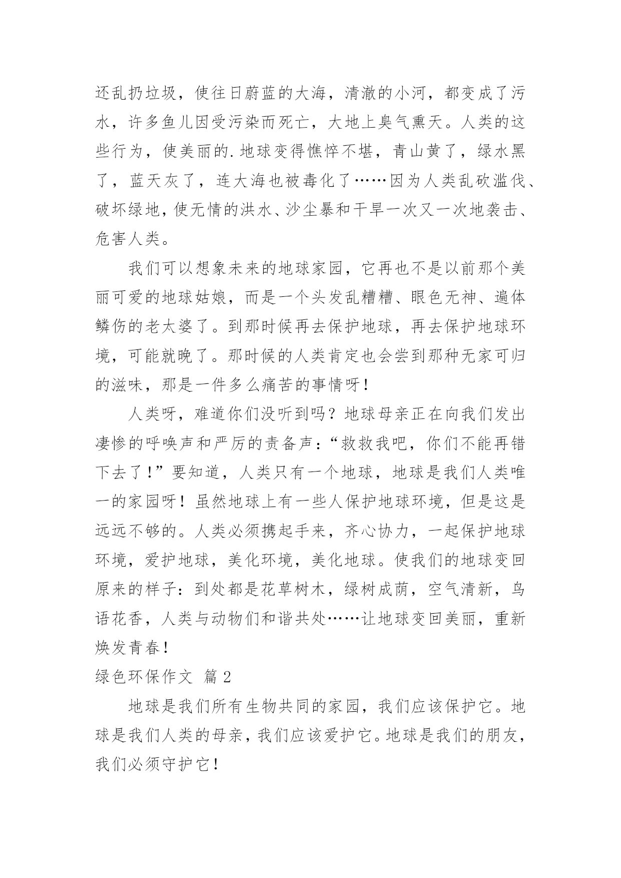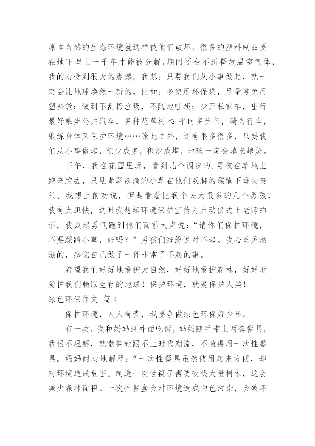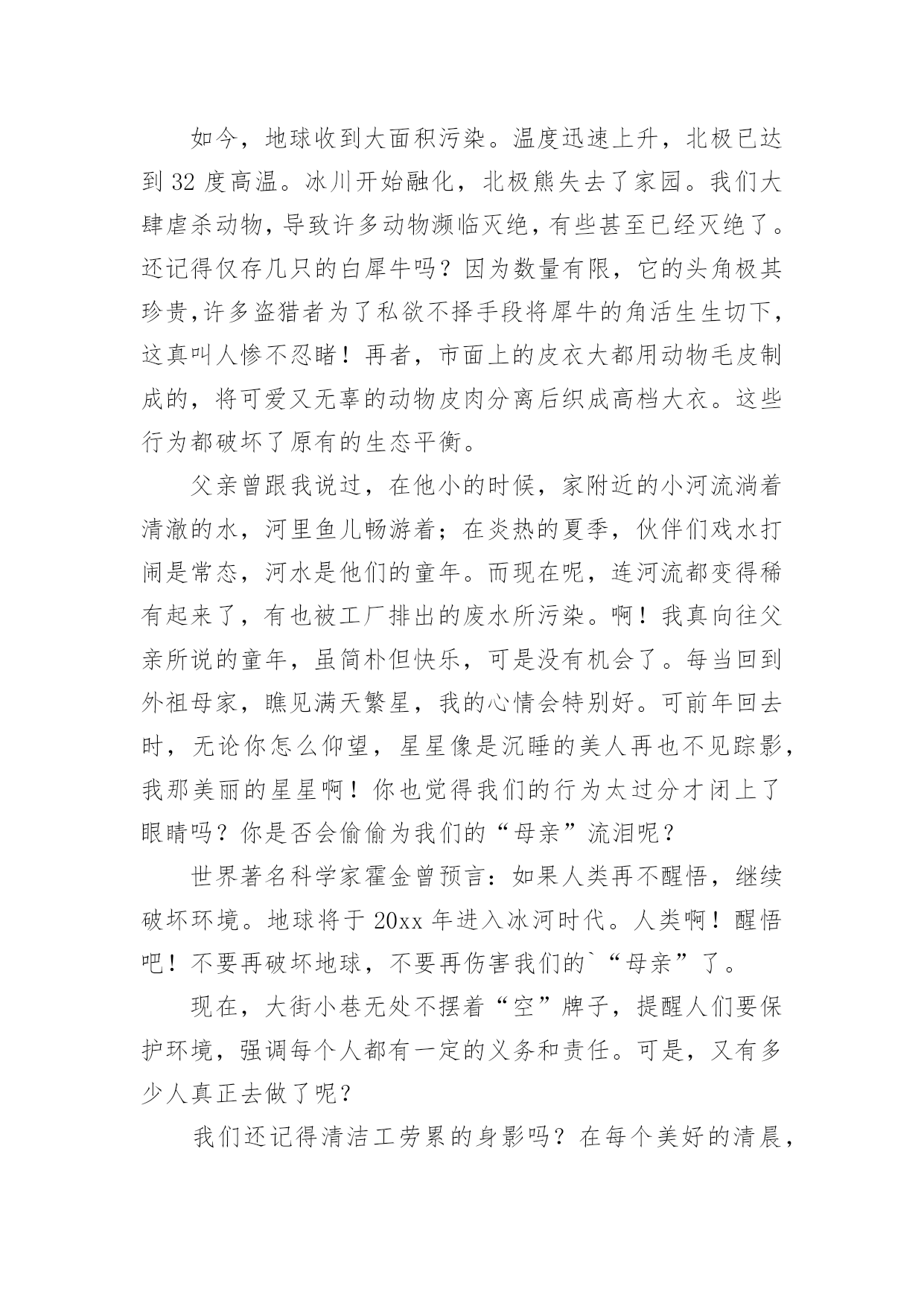 绿色环保作文绿色环保作文(经典4篇)在学习、工作或生活中,大家都写过作文吧,作文是通过文字来表达一个主题意义的记叙方法。你所见过的作文是什么样的呢?下面是小编为大家整理的绿色环保作文4篇,仅供参考,希望能够帮助到大家。绿色环保作文篇1在茫茫浩瀚的宇宙中,有无数星球。其中有一个本来很美丽可爱的星球,它在众星球中显得格外娇艳,是那么楚楚动人,生机勃勃,它就是地球——人类唯一的家园。以前,地球上是一片生机勃勃的景象:在蔚蓝的蓝天下,欢快的小溪唱着歌儿;潺潺的流水从山上流淌下来;远处的森林是多么的茂盛;陆地上到处都是绿油油的小草,美丽的花朵,鲜嫩的蘑菇;小动物们快乐地玩耍着,欢快的云雀在树枝上高声歌唱,雄壮的老鹰在天空中盘旋,大象在小河里洗澡嬉戏……如今,随着科技渐渐发达,生活水平的不断提高,人类为了自己的利益,不断地砍伐树木,猎捕人类的好朋友——动物。一座座高楼拔地而起,峻峭的山岭被铲成平地,一片片森林变成沙漠,再也挡不住漫天风沙。许多可爱的小动物无家可归,绝大多数已经灭亡,一些正濒临死亡。人类渐渐富裕,都买了汽车,汽车的尾气污染了空气;他们还建起一座座工厂,工厂排出的污水污染了水资源;不仅这样,人们还乱扔垃圾,使往日蔚蓝的大海,清澈的小河,都变成了污水,许多鱼儿因受污染而死亡,大地上臭气熏天。人类的这些行为,使美丽的.地球变得憔悴不堪,青山黄了,绿水黑了,蓝天灰了,连大海也被毒化了……因为人类乱砍滥伐、破坏绿地,使无情的洪水、沙尘暴和干旱一次又一次地袭击、危害人类。我们可以想象未来的地球家园,它再也不是以前那个美丽可爱的地球姑娘,而是一个头发乱糟糟、眼色无神、遍体鳞伤的老太婆了。到那时候再去保护地球,再去保护地球环境,可能就晚了。那时候的人类肯定也会尝到那种无家可归的滋味,那是一件多么痛苦的事情呀!人类呀,难道你们没听到吗?地球母亲正在向我们发出凄惨的呼唤声和严厉的责备声:“救救我吧,你们不能再错下去了!”要知道,人类只有一个地球,地球是我们人类唯一的家园呀!虽然地球上有一些人保护地球环境,但是这是远远不够的。人类必须携起手来,齐心协力,一起保护地球环境,爱护地球,美化环境,美化地球。使我们的地球变回原来的样子:到处都是花草树木,绿树成荫,空气清新,鸟语花香,人类与动物们和谐共处……让地球变回美丽,重新焕发青春!绿色环保作文篇2地球是我们所有生物共同的家园,我们应该保护它。地球是我们人类的母亲,我们应该爱护它。地球是我们的朋友,我们必须守护它!如今,地球收到大面积污染。温度迅速上升,北极已达到32度高温。冰川开始融化,北极熊失去了家园。我们大肆虐杀动物,导致许多动物濒临灭绝,有些甚至已经灭绝了。还记得仅存几只的白犀牛吗?因为数量有限,它的头角极其珍贵,许多盗猎者为了私欲不择手段将犀牛的角活生生切下,这真叫人惨不忍睹!再者,市面上的皮衣大都用动物毛皮制成的,将可爱又无辜的动物皮肉分离后织成高档大衣。这些行为都破坏了原有的生态平衡。父亲曾跟我说过,在他小的时候,家附近的小河流淌着清澈的水,河里鱼儿畅游着;在炎热的夏季,伙伴们戏水打闹是常态,河水是他们的童年。而现在呢,连河流都变得稀有起来了,有也被工厂排出的废水所污染。啊!我真向往父亲所说的童年,虽简朴但快乐,可是没有机会了。每当回到外祖母家,瞧见满天繁星,我的心情会特别好。可前年回去时,无论你怎么仰望,星星像是沉睡的美人再也不见踪影,我那美丽的星星啊!你也觉得我们的行为太过分才闭上了眼睛吗?你是否会偷偷为我们的“母亲”流泪呢?世界著名科学家霍金曾预言:如果人类再不醒悟,继续破坏环境。地球将于20xx年进入冰河时代。人类啊!醒悟吧!不要再破坏地球,不要再伤害我们的`“母亲”了。现在,大街小巷无处不摆着“空”牌子,提醒人们要保护环境,强调每个人都有一定的义务和责任。可是,又有多少人真正去做了呢?我们还记得清洁工劳累的身影吗?在每个美好的清晨,当我们还沉睡在梦乡中,这些身影便出没在小巷中街道里,拖着沉重的垃圾车奔走搜寻。可竟还有人不知好歹嘲讽替我们履行义务的辛劳人民!再看看我们的街道,车辆繁多,现代社会几乎每个家庭都有一辆小汽车。汽车排出的废弃污浊了天空,曾经还有大自然的植物为我们的健康和环境保驾护航,如今我们的“不珍惜”让他们失去了“爱”的能力,我们还能任性多久啊?人类啊!醒悟吧!不要再伤害我们的“母亲”了,她为我们提供了多么好的生活环境,我们竟如此回报。地球是人类的母亲,请你们记住这句话:大地不属于人类!而人类是属于大地的!我们是大地的孩子,降临到大地的灾害,大地没了,大地的孩子也无法生存。我们不要再伤害自己的“母亲”了。绿色环保作文篇3地球是人类的母亲,是我们赖以生存的家园。随着生活水平的提高,人类在享受的同时,却在不知不觉中破坏着她,我们的生存环境在不断恶化。吃完早餐,我和妈妈