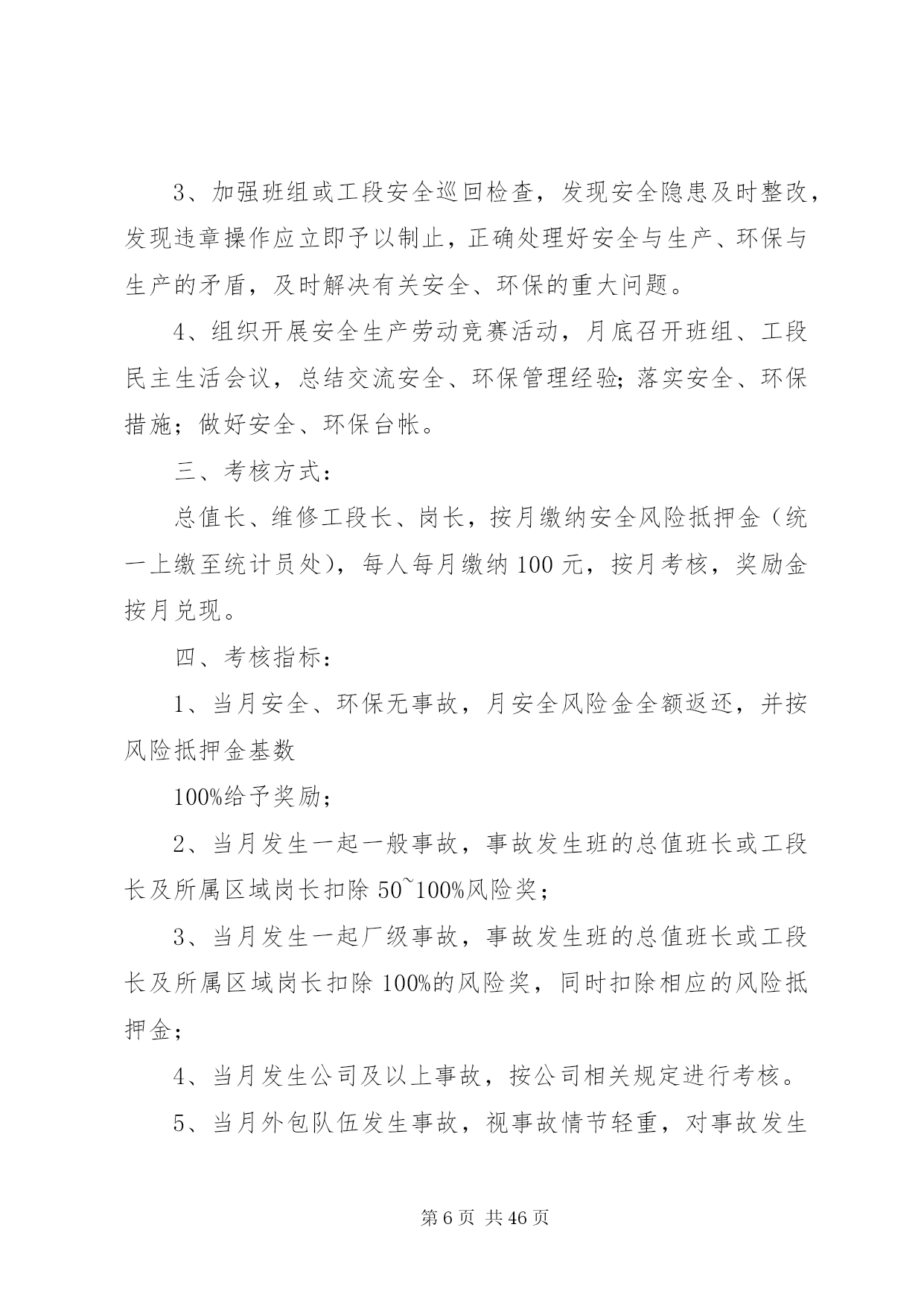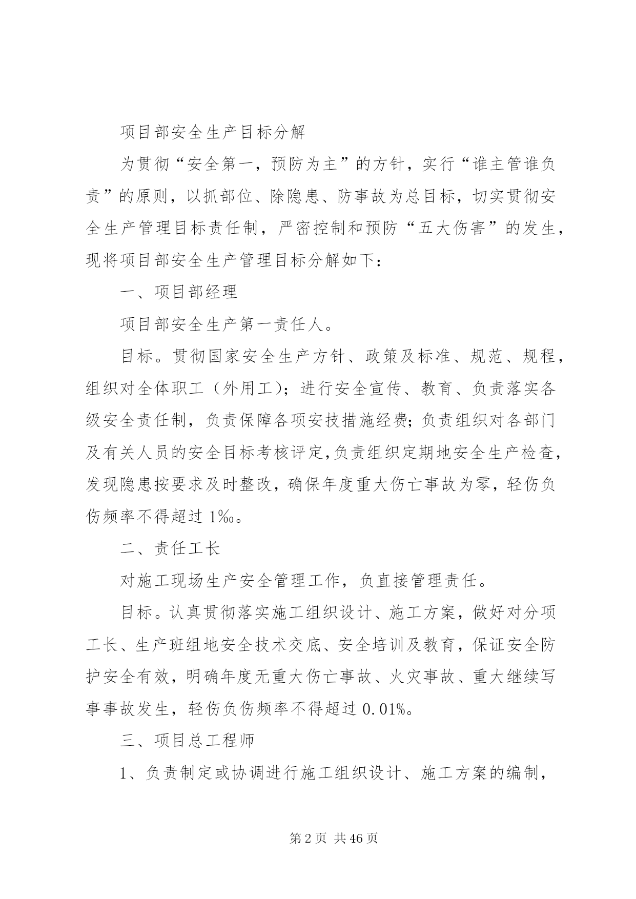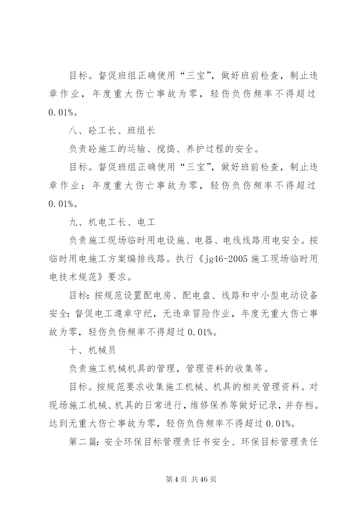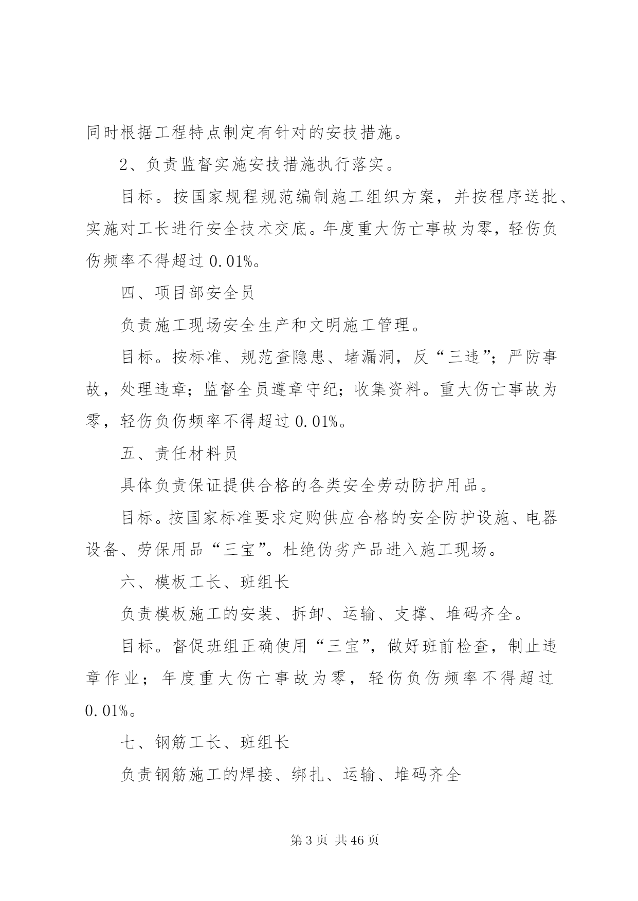 第PAGE\*Arabic\*MERGEFORMAT46页共NUMPAGES\*MERGEFORMAT46页文明安全环保管理目标一、工程概况住宅、商业、地下车库(1X、2X、3X、4X、5X、6X住在、7X、8X、9X商业及地下车库部分)施工总承包工程,位于XX省自治区XX市XX县区。项目位于XX省自治区XX市XX县区,占地面积32221.21㎡。由XX省瑞和置业有限公司投资,由XX省明旺建设项目管理有限责任公司实施监理,由北京世纪中天国际建筑设计有限公司设计。本项目由6栋住宅、4栋商业、1座地下车库及附属结构组成。总建筑面积159422.47平方米。建设单位为XX省瑞和置业有限公司,施工单位为中建城市建设发展有限公司。二、质量管理质量目标。合格工程,争创XX省建设工程“金鹿杯”。三、安全文明施工管理安全文明目标:重伤和死亡事故为零,轻伤率控制在1‰以下,项目安全标准化达标率100%,创XX市及XX省自治区建筑施工安全文明标准化工地、XX市建筑工程观摩工地环保目标:严格执行国家及地方政府环保管理要求,杜绝环保事件发生,杜绝施工现场脏、乱、差,全面落实六个百分百扬尘治理标准项目部安全生产目标分解为贯彻“安全第一,预防为主”的方针,实行“谁主管谁负责”的原则,以抓部位、除隐患、防事故为总目标,切实贯彻安全生产管理目标责任制,严密控制和预防“五大伤害”的发生,现将项目部安全生产管理目标分解如下:一、项目部经理项目部安全生产第一责任人。目标。贯彻国家安全生产方针、政策及标准、规范、规程,组织对全体职工(外用工);进行安全宣传、教育、负责落实各级安全责任制,负责保障各项安技措施经费;负责组织对各部门及有关人员的安全目标考核评定,负责组织定期地安全生产检查,发现隐患按要求及时整改,确保年度重大伤亡事故为零,轻伤负伤频率不得超过1‰。二、责任工长对施工现场生产安全管理工作,负直接管理责任。目标。认真贯彻落实施工组织设计、施工方案,做好对分项工长、生产班组地安全技术交底、安全培训及教育,保证安全防护安全有效,明确年度无重大伤亡事故、火灾事故、重大继续写事事故发生,轻伤负伤频率不得超过0.01%。三、项目总工程师1、负责制定或协调进行施工组织设计、施工方案的编制,同时根据工程特点制定有针对的安技措施。2、负责监督实施安技措施执行落实。目标。按国家规程规范编制施工组织方案,并按程序送批、实施对工长进行安全技术交底。年度重大伤亡事故为零,轻伤负伤频率不得超过0.01%。四、项目部安全员负责施工现场安全生产和文明施工管理。目标。按标准、规范查隐患、堵漏洞,反“三违”;严防事故,处理违章;监督全员遵章守纪;收集资料。重大伤亡事故为零,轻伤负伤频率不得超过0.01%。五、责任材料员具体负责保证提供合格的各类安全劳动防护用品。目标。按国家标准要求定购供应合格的安全防护设施、电器设备、劳保用品“三宝”。杜绝伪劣产品进入施工现场。六、模板工长、班组长负责模板施工的安装、拆卸、运输、支撑、堆码齐全。目标。督促班组正确使用“三宝”,做好班前检查,制止违章作业;年度重大伤亡事故为零,轻伤负伤频率不得超过0.01%。七、钢筋工长、班组长负责钢筋施工的焊接、绑扎、运输、堆码齐全目标。督促班组正确使用“三宝”,做好班前检查,制止违章作业,年度重大伤亡事故为零,轻伤负伤频率不得超过0.01%。八、砼工长、班组长负责砼施工的运输、搅捣、养护过程的安全。目标。督促班组正确使用“三宝”,做好班前检查,制止违章作业;年度重大伤亡事故为零,轻伤负伤频率不得超过0.01%。九、机电工长、电工负责施工现场临时用电设施、电器、电线线路用电安全。按临时用电施工方案编排线路。执行《jg46-2005施工现场临时用电技术规范》要求。目标:按规范设置配电房、配电盘、线路和中小型电动设备安全:督促电工遵章守纪,无违章冒险作业,年度无重大伤亡事故为零,轻伤负伤频率不得超过0.01%。十、机械员负责施工机械机具的管理,管理资料的收集等。目标。按规范要求收集施工机械、机具的相关管理资料。对现场施工机械、机具的日常进行,维修保养等做好记录,并存档。达到无重大伤亡事故为零,轻伤负伤频率不得超过0.01%。第二篇:安全环保目标管理责任书安全、环保目标管理责任书甲方:肥业公司一厂乙方:各班总值班长、维修工段长、岗长为强化安全、环保意识,加强安全管理,充分发挥总值班长、维修工段长、岗长的监督检查、控制事故的作用,避免和降低各类事故的发生,减少经济损失,本着“谁主管谁负责”的原则,即:岗长为区域安全责任人,总值班长、工段长为当班时间段及辖区安全第一责任人,特制定本责任书。一、安全目标:1、重大安全事故(火灾、爆炸、设备、生产操作)为零;2、重伤以上人身伤害事故为零;3、重大污染环境事故为零;