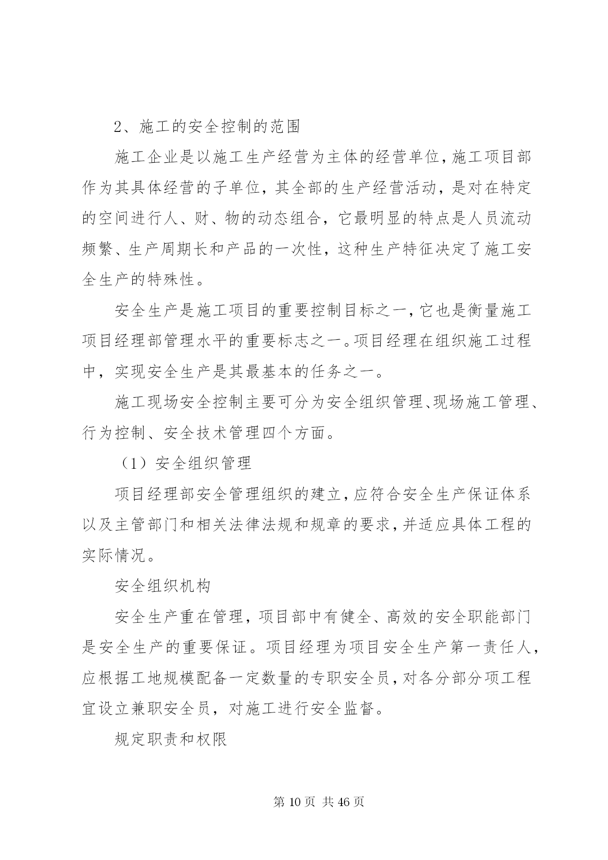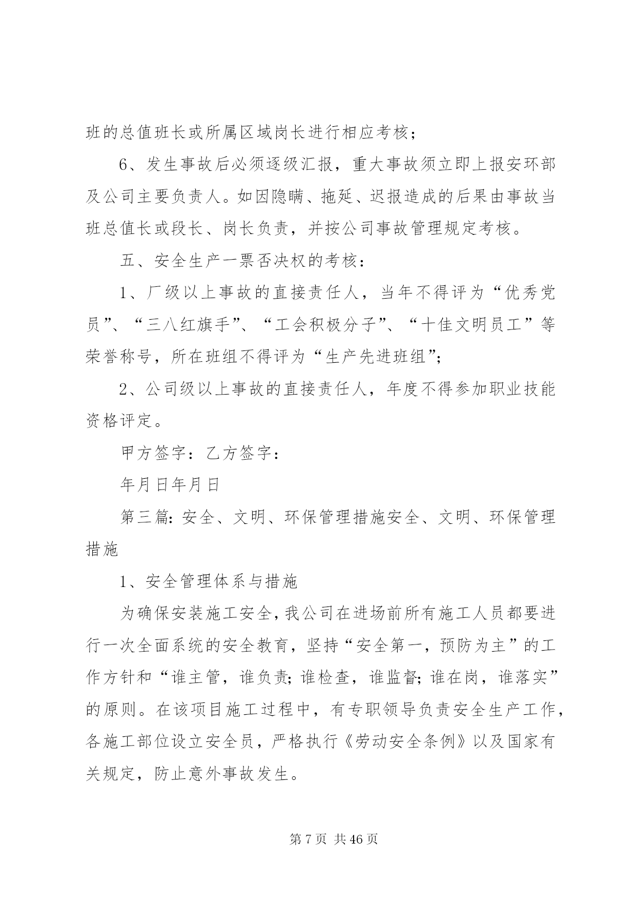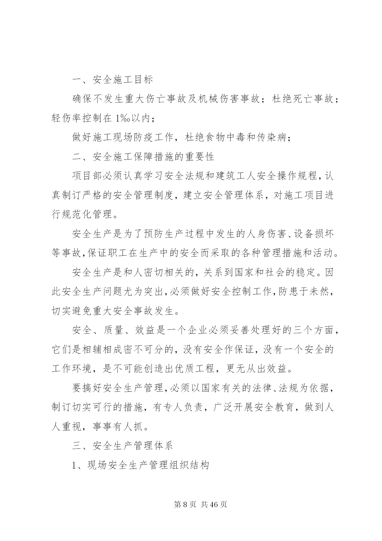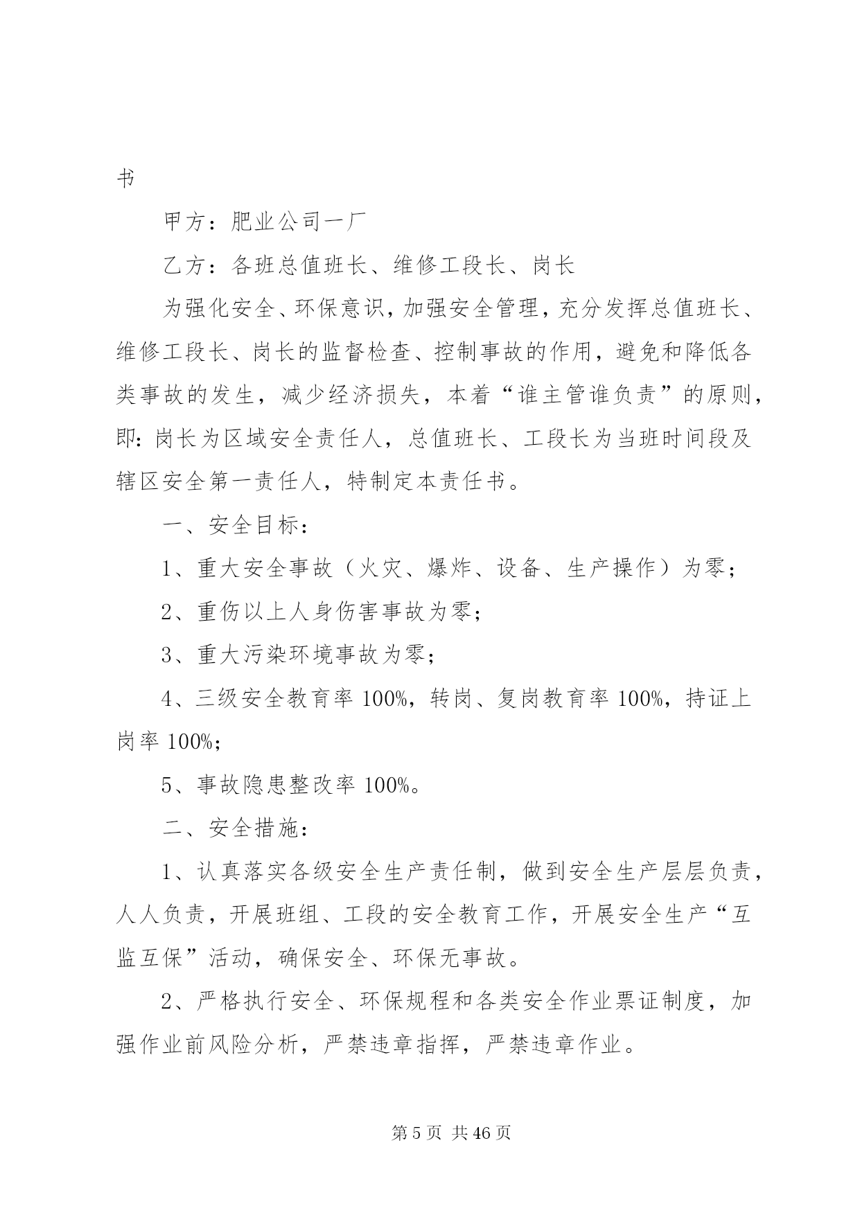 第PAGE\*Arabic\*MERGEFORMAT46页共NUMPAGES\*MERGEFORMAT46页文明安全环保管理目标一、工程概况住宅、商业、地下车库(1X、2X、3X、4X、5X、6X住在、7X、8X、9X商业及地下车库部分)施工总承包工程,位于XX省自治区XX市XX县区。项目位于XX省自治区XX市XX县区,占地面积32221.21㎡。由XX省瑞和置业有限公司投资,由XX省明旺建设项目管理有限责任公司实施监理,由北京世纪中天国际建筑设计有限公司设计。本项目由6栋住宅、4栋商业、1座地下车库及附属结构组成。总建筑面积159422.47平方米。建设单位为XX省瑞和置业有限公司,施工单位为中建城市建设发展有限公司。二、质量管理质量目标。合格工程,争创XX省建设工程“金鹿杯”。三、安全文明施工管理安全文明目标:重伤和死亡事故为零,轻伤率控制在1‰以下,项目安全标准化达标率100%,创XX市及XX省自治区建筑施工安全文明标准化工地、XX市建筑工程观摩工地环保目标:严格执行国家及地方政府环保管理要求,杜绝环保事件发生,杜绝施工现场脏、乱、差,全面落实六个百分百扬尘治理标准项目部安全生产目标分解为贯彻“安全第一,预防为主”的方针,实行“谁主管谁负责”的原则,以抓部位、除隐患、防事故为总目标,切实贯彻安全生产管理目标责任制,严密控制和预防“五大伤害”的发生,现将项目部安全生产管理目标分解如下:一、项目部经理项目部安全生产第一责任人。目标。贯彻国家安全生产方针、政策及标准、规范、规程,组织对全体职工(外用工);进行安全宣传、教育、负责落实各级安全责任制,负责保障各项安技措施经费;负责组织对各部门及有关人员的安全目标考核评定,负责组织定期地安全生产检查,发现隐患按要求及时整改,确保年度重大伤亡事故为零,轻伤负伤频率不得超过1‰。二、责任工长对施工现场生产安全管理工作,负直接管理责任。目标。认真贯彻落实施工组织设计、施工方案,做好对分项工长、生产班组地安全技术交底、安全培训及教育,保证安全防护安全有效,明确年度无重大伤亡事故、火灾事故、重大继续写事事故发生,轻伤负伤频率不得超过0.01%。三、项目总工程师1、负责制定或协调进行施工组织设计、施工方案的编制,同时根据工程特点制定有针对的安技措施。2、负责监督实施安技措施执行落实。目标。按国家规程规范编制施工组织方案,并按程序送批、实施对工长进行安全技术交底。年度重大伤亡事故为零,轻伤负伤频率不得超过0.01%。四、项目部安全员负责施工现场安全生产和文明施工管理。目标。按标准、规范查隐患、堵漏洞,反“三违”;严防事故,处理违章;监督全员遵章守纪;收集资料。重大伤亡事故为零,轻伤负伤频率不得超过0.01%。五、责任材料员具体负责保证提供合格的各类安全劳动防护用品。目标。按国家标准要求定购供应合格的安全防护设施、电器设备、劳保用品“三宝”。杜绝伪劣产品进入施工现场。六、模板工长、班组长负责模板施工的安装、拆卸、运输、支撑、堆码齐全。目标。督促班组正确使用“三宝”,做好班前检查,制止违章作业;年度重大伤亡事故为零,轻伤负伤频率不得超过0.01%。七、钢筋工长、班组长负责钢筋施工的焊接、绑扎、运输、堆码齐全目标。督促班组正确使用“三宝”,做好班前检查,制止违章作业,年度重大伤亡事故为零,轻伤负伤频率不得超过0.01%。八、砼工长、班组长负责砼施工的运输、搅捣、养护过程的安全。目标。督促班组正确使用“三宝”,做好班前检查,制止违章作业;年度重大伤亡事故为零,轻伤负伤频率不得超过0.01%。九、机电工长、电工负责施工现场临时用电设施、电器、电线线路用电安全。按临时用电施工方案编排线路。执行《jg46-2005施工现场临时用电技术规范》要求。目标:按规范设置配电房、配电盘、线路和中小型电动设备安全:督促电工遵章守纪,无违章冒险作业,年度无重大伤亡事故为零,轻伤负伤频率不得超过0.01%。十、机械员负责施工机械机具的管理,管理资料的收集等。目标。按规范要求收集施工机械、机具的相关管理资料。对现场施工机械、机具的日常进行,维修保养等做好记录,并存档。达到无重大伤亡事故为零,轻伤负伤频率不得超过0.01%。第二篇:安全环保目标管理责任书安全、环保目标管理责任书甲方:肥业公司一厂乙方:各班总值班长、维修工段长、岗长为强化安全、环保意识,加强安全管理,充分发挥总值班长、维修工段长、岗长的监督检查、控制事故的作用,避免和降低各类事故的发生,减少经济损失,本着“谁主管谁负责”的原则,即:岗长为区域安全责任人,总值班长、工段长为当班时间段及辖区安全第一责任人,特制定本责任书。一、安全目标:1、重大安全事故(火灾、爆炸、设备、生产操作)为零;2、重伤以上人身伤害事故为零;3、重大污染环境事故为零;