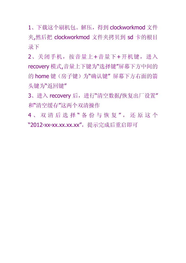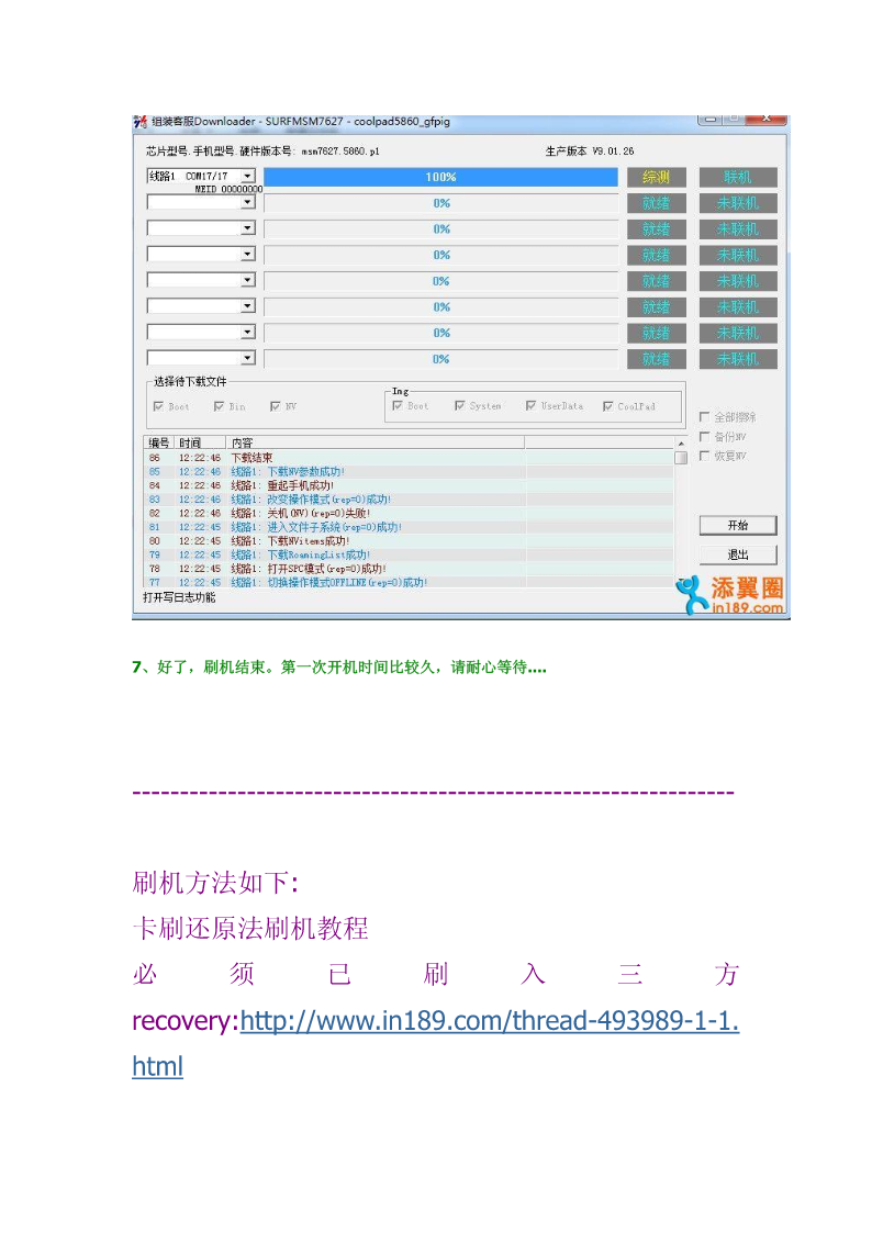 (1)视频先奉上,可以看视频,视频已经很完美了。感谢“caiyong1987”兄弟,太感谢了。视频链接在此:http://v.youku.com/v_show/id_XMzQyMTAyMTcy.html(2)这边给大家提供一个官方给的图文教程:5860_刷机图文教程.pdf(355.57KB,下载次数:55936)1、装好驱动,附上驱动下载地址:http://115.com/file/c2dn6m6i(提醒:64位系统的可能打开客户端刷机会蓝屏!)这边详细的说下如何装驱动吧,很多机油不懂。(1)进入设置-应用程序-开发,然后把USB调试模式打钩。接着把手机连接电脑,电脑自然会自动安装驱动,但是会提示有几个驱动安装失败。此时不要拔掉数据线,保持连接(2)右键我的电脑(win7是计算机),选择设备管理器,然后进入驱动中会发现4个未知驱动(本人是4个,不排除其他人有不同现象)(3)右键点击这几个未知驱动,选择更新,然后手动选择,选择我发的驱动文件夹,让它安装好了。这里提示一下,有几个未知驱动就要更新几个。比如我是4个,我就更新了4次。(4)安装驱动文件里头的“天翼宽带安装程序.exe”,安装完毕重启电脑。(5)最后,为了验证安装驱动成功。可以百度下载豌豆荚在电脑端安装后,如果驱动安装正确的话豌豆荚就可以连接手机。如果驱动安装失败的话连接手机就会失败。注意:如果没有安装豌豆荚连接成功,并且你无法验证是否驱动装对,请不要刷机。2、下载好刷机包,然后解压在桌面,进入文件夹后如下图所示3、手机关机,数据线一头连接手机,按住音量上的同时另一头连接电脑,看到boot绿色后松开。4、打开附件download_V9.01.25/组装客服Downloader.exe5、点击开始后,开始刷机,走进度条。如下图6、看到下载完成,显示综测,手机重启,点房子键(主屏键),之后有时自动重启,有时会在Recovery中,电源键选reboot。7、好了,刷机结束。第一次开机时间比较久,请耐心等待....---------------------------------------------------------------刷机方法如下:卡刷还原法刷机教程必须已刷入三方recovery:http://www.in189.com/thread-493989-1-1.html1、下载这个刷机包。解压,得到clockworkmod文件夹,然后把clockworkmod文件夹拷贝到sd卡的根目录下2、关闭手机,按音量上+音量下+开机键,进入recovery模式,音量上下键为“选择键”屏幕下方中间的的home键(房子键)为“确认键”屏幕下方右面的箭头键为“返回键”3、进入recovery后,进行“清空数据/恢复出厂设置”和“清空缓存”这两个双清操作4、双清后选择“备份与恢复”,还原这个“2012-xx-xx.xx.xx.xx”,提示完成后重启即可