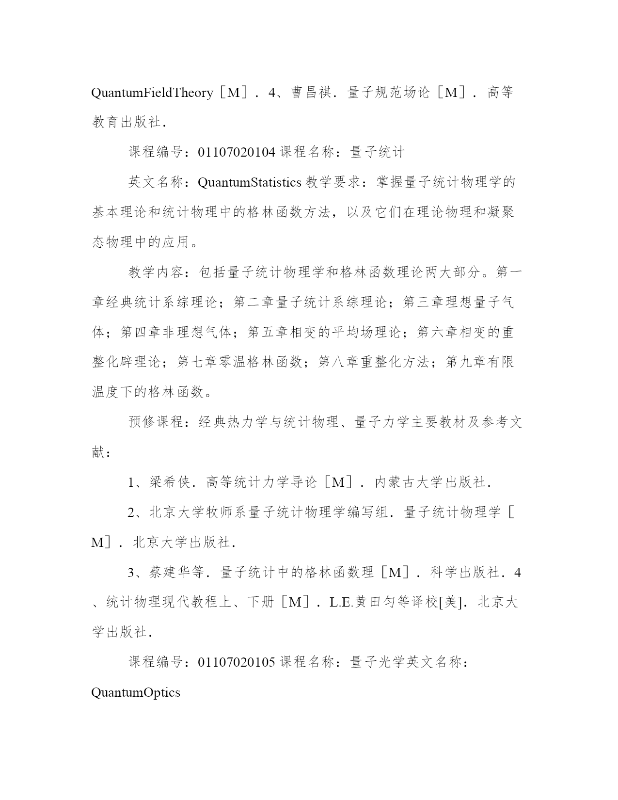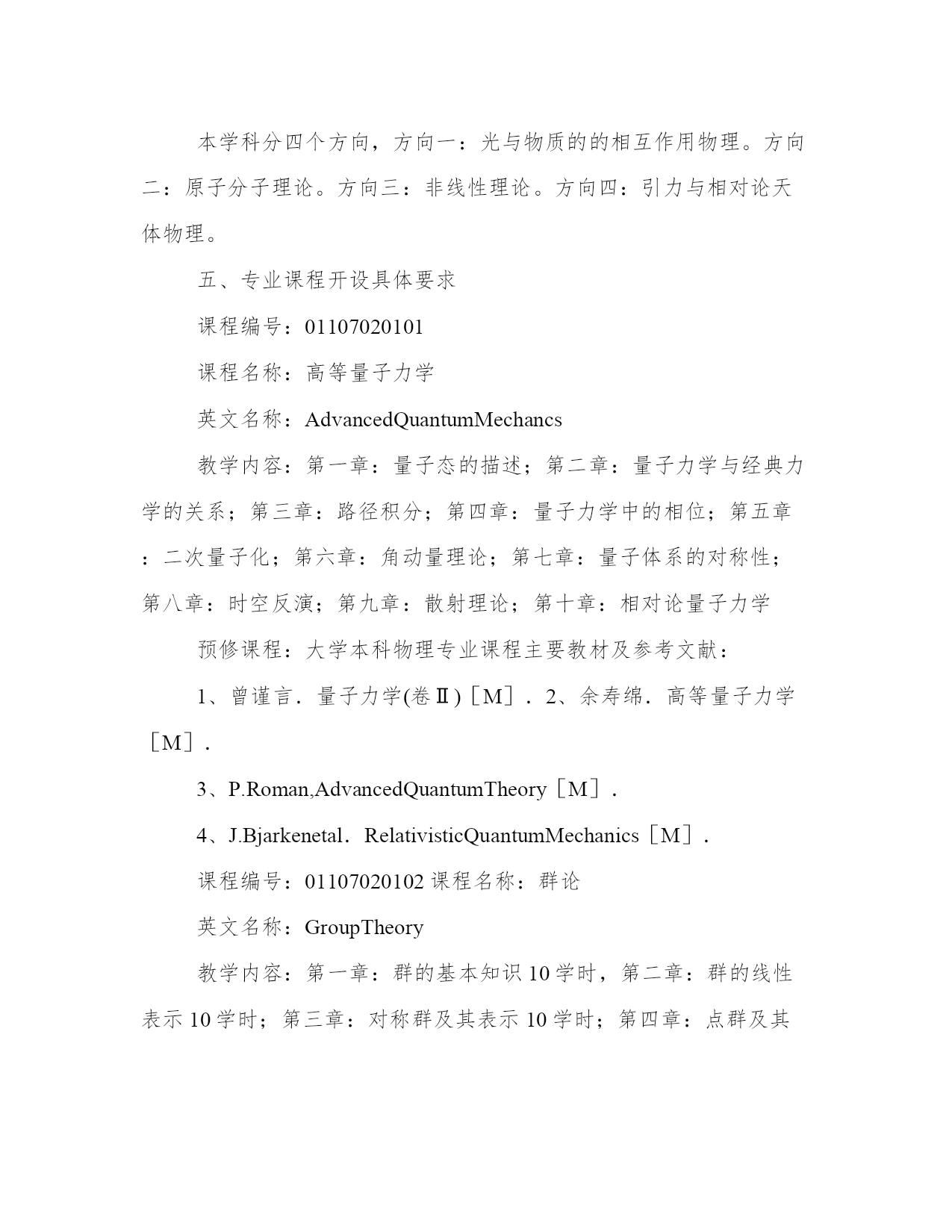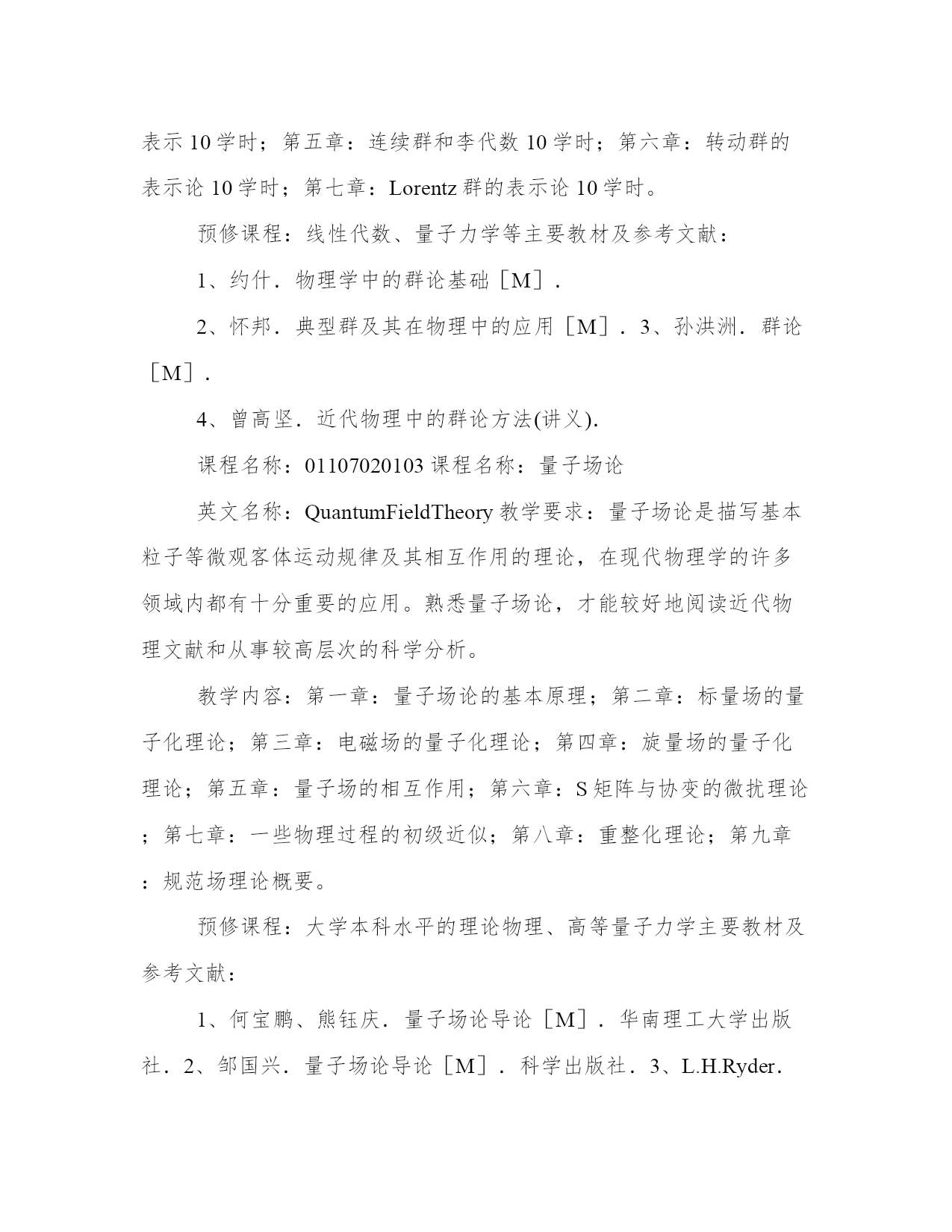 理论物理专硕分析生培养方案培养符合国家建设需要,为祖国和人民服务的,具有良好道德品质和科学素质的,具有集体主义精神,实事求是,追求真理,献身科学教育事业的,具有扎实基础知识和良好科研能力的理论物理专门人才和高等院校师资.获得本专业硕士学位的分析生应掌握理论物理学科坚实、宽厚的基础知识,较全面和深入的专业知识,熟悉本专业分析方向的发展前沿和热点.硕士论文选题时,应对国内外分析现状进行较全面的调研和分析,在此基础上,完成具有创造性的分析成果。熟练掌握一门外语,包括专业阅读和写作,以及能用外语进行简单的学术交流。二、本专业总体概况、优势与特色理论物理是分析物质结构、性质及其相互作用的基本规律的一门基础学科。本学科于1990年获得硕士学位授予权,1996年成为湖南省重点学科,1999年其中的“非线性物理”成为“211工程”重点学科,1995年起招收博士生,2000年获得博士学位授予权。该学科现已形成四个稳定的分析方向。其特色在于抓住当前和未来高技术领域中的关键问题和物理学中的基本问题开展基础分析,把基础分析与高技术问题的探索相结合,在多个学科前沿领域的交叉点寻找突破。三、本专业分析方向及简介本学科分四个方向,方向一:光与物质的的相互作用物理。方向二:原子分子理论。方向三:非线性理论。方向四:引力与相对论天体物理。五、专业课程开设具体要求课程编号:01107020101课程名称:高等量子力学英文名称:AdvancedQuantumMechancs教学内容:第一章:量子态的描述;第二章:量子力学与经典力学的关系;第三章:路径积分;第四章:量子力学中的相位;第五章:二次量子化;第六章:角动量理论;第七章:量子体系的对称性;第八章:时空反演;第九章:散射理论;第十章:相对论量子力学预修课程:大学本科物理专业课程主要教材及参考文献:1、曾谨言.量子力学(卷Ⅱ)[M].2、余寿绵.高等量子力学[M].3、P.Roman,AdvancedQuantumTheory[M].4、J.Bjarkenetal.RelativisticQuantumMechanics[M].课程编号:01107020102课程名称:群论英文名称:GroupTheory教学内容:第一章:群的基本知识10学时,第二章:群的线性表示10学时;第三章:对称群及其表示10学时;第四章:点群及其表示10学时;第五章:连续群和李代数10学时;第六章:转动群的表示论10学时;第七章:Lorentz群的表示论10学时。预修课程:线性代数、量子力学等主要教材及参考文献:1、约什.物理学中的群论基础[M].2、怀邦.典型群及其在物理中的应用[M].3、孙洪洲.群论[M].4、曾高坚.近代物理中的群论方法(讲义).课程名称:01107020103课程名称:量子场论英文名称:QuantumFieldTheory教学要求:量子场论是描写基本粒子等微观客体运动规律及其相互作用的理论,在现代物理学的许多领域内都有十分重要的应用。熟悉量子场论,才能较好地阅读近代物理文献和从事较高层次的科学分析。教学内容:第一章:量子场论的基本原理;第二章:标量场的量子化理论;第三章:电磁场的量子化理论;第四章:旋量场的量子化理论;第五章:量子场的相互作用;第六章:S矩阵与协变的微扰理论;第七章:一些物理过程的初级近似;第八章:重整化理论;第九章:规范场理论概要。预修课程:大学本科水平的理论物理、高等量子力学主要教材及参考文献:1、何宝鹏、熊钰庆.量子场论导论[M].华南理工大学出版社.2、邹国兴.量子场论导论[M].科学出版社.3、L.H.Ryder.QuantumFieldTheory[M].4、曹昌祺.量子规范场论[M].高等教育出版社.课程编号:01107020104课程名称:量子统计英文名称:QuantumStatistics教学要求:掌握量子统计物理学的基本理论和统计物理中的格林函数方法,以及它们在理论物理和凝聚态物理中的应用。教学内容:包括量子统计物理学和格林函数理论两大部分。第一章经典统计系综理论;第二章量子统计系综理论;第三章理想量子气体;第四章非理想气体;第五章相变的平均场理论;第六章相变的重整化辟理论;第七章零温格林函数;第八章重整化方法;第九章有限温度下的格林函数。预修课程:经典热力学与统计物理、量子力学主要教材及参考文献:1、梁希侠.高等统计力学导论[M].内蒙古大学出版社.2、北京大学牧师系量子统计物理学编写组.量子统计物理学[M].北京大学出版社.3、蔡建华等.量子统计中的格林函数理[M].科学出版社.4、统计物理现代教程上、下册[M].L.E.黄田匀等译校[美].北京大学出版社.课程编号:01107020105课程名称:量