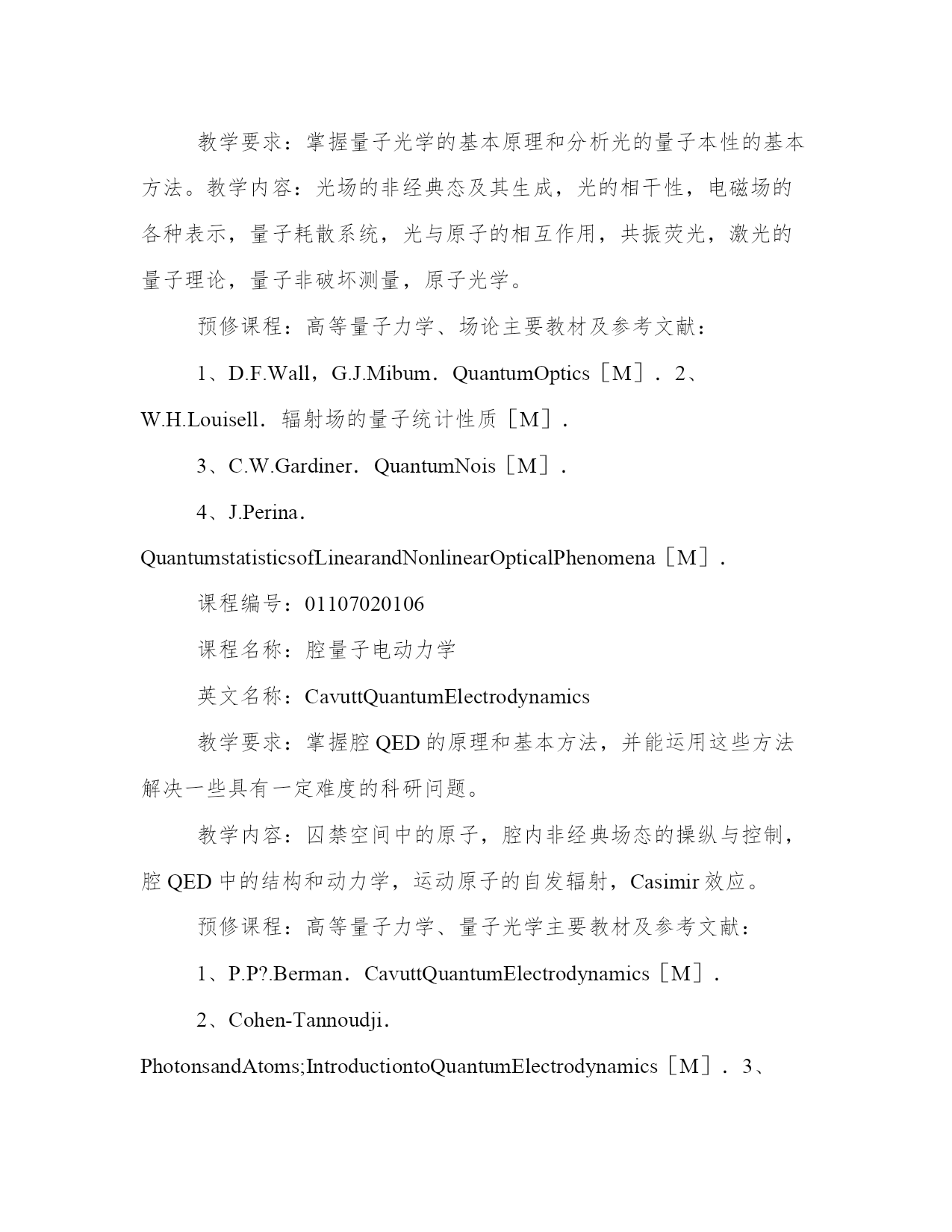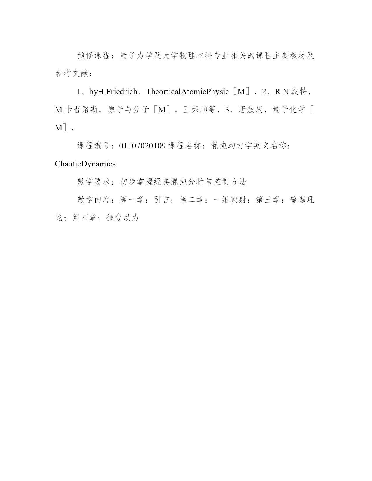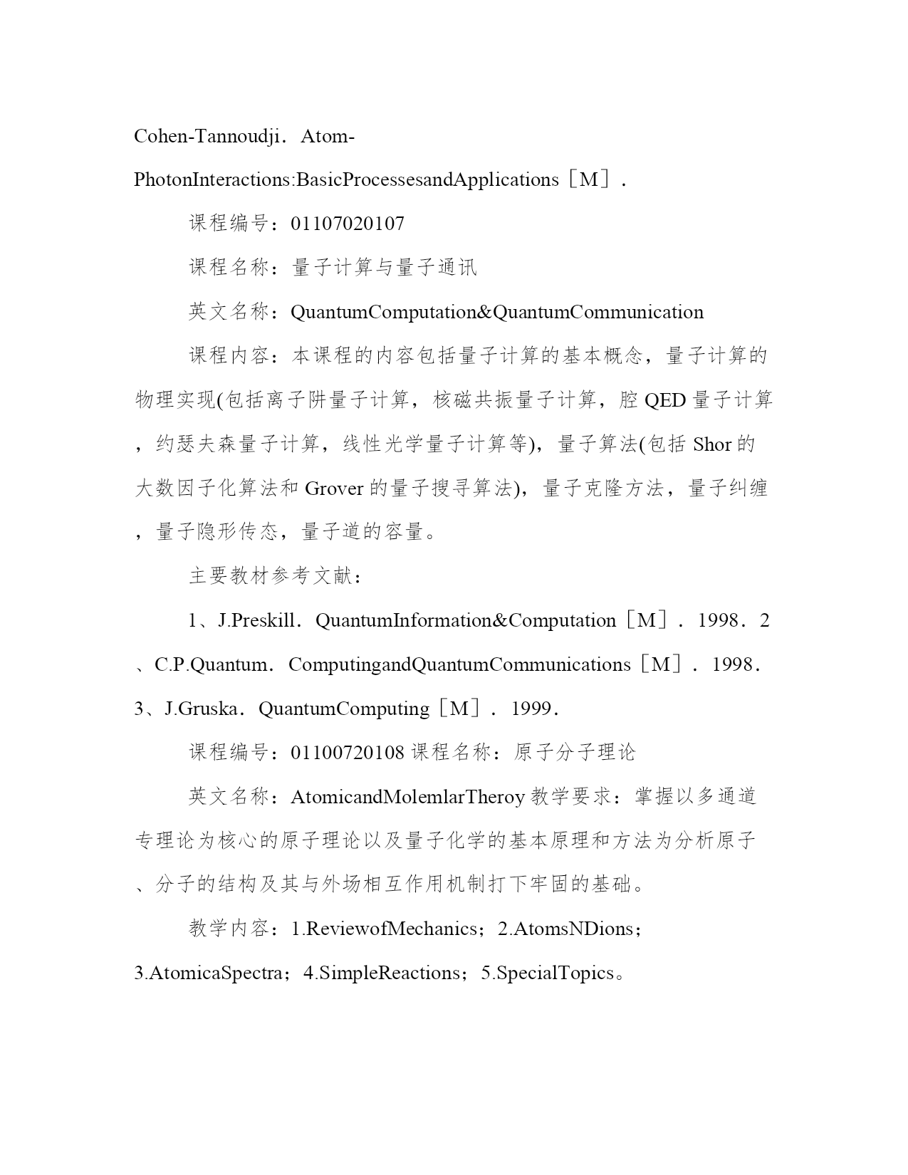 理论物理专硕分析生培养方案培养符合国家建设需要,为祖国和人民服务的,具有良好道德品质和科学素质的,具有集体主义精神,实事求是,追求真理,献身科学教育事业的,具有扎实基础知识和良好科研能力的理论物理专门人才和高等院校师资.获得本专业硕士学位的分析生应掌握理论物理学科坚实、宽厚的基础知识,较全面和深入的专业知识,熟悉本专业分析方向的发展前沿和热点.硕士论文选题时,应对国内外分析现状进行较全面的调研和分析,在此基础上,完成具有创造性的分析成果。熟练掌握一门外语,包括专业阅读和写作,以及能用外语进行简单的学术交流。二、本专业总体概况、优势与特色理论物理是分析物质结构、性质及其相互作用的基本规律的一门基础学科。本学科于1990年获得硕士学位授予权,1996年成为湖南省重点学科,1999年其中的“非线性物理”成为“211工程”重点学科,1995年起招收博士生,2000年获得博士学位授予权。该学科现已形成四个稳定的分析方向。其特色在于抓住当前和未来高技术领域中的关键问题和物理学中的基本问题开展基础分析,把基础分析与高技术问题的探索相结合,在多个学科前沿领域的交叉点寻找突破。三、本专业分析方向及简介本学科分四个方向,方向一:光与物质的的相互作用物理。方向二:原子分子理论。方向三:非线性理论。方向四:引力与相对论天体物理。五、专业课程开设具体要求课程编号:01107020101课程名称:高等量子力学英文名称:AdvancedQuantumMechancs教学内容:第一章:量子态的描述;第二章:量子力学与经典力学的关系;第三章:路径积分;第四章:量子力学中的相位;第五章:二次量子化;第六章:角动量理论;第七章:量子体系的对称性;第八章:时空反演;第九章:散射理论;第十章:相对论量子力学预修课程:大学本科物理专业课程主要教材及参考文献:1、曾谨言.量子力学(卷Ⅱ)[M].2、余寿绵.高等量子力学[M].3、P.Roman,AdvancedQuantumTheory[M].4、J.Bjarkenetal.RelativisticQuantumMechanics[M].课程编号:01107020102课程名称:群论英文名称:GroupTheory教学内容:第一章:群的基本知识10学时,第二章:群的线性表示10学时;第三章:对称群及其表示10学时;第四章:点群及其表示10学时;第五章:连续群和李代数10学时;第六章:转动群的表示论10学时;第七章:Lorentz群的表示论10学时。预修课程:线性代数、量子力学等主要教材及参考文献:1、约什.物理学中的群论基础[M].2、怀邦.典型群及其在物理中的应用[M].3、孙洪洲.群论[M].4、曾高坚.近代物理中的群论方法(讲义).课程名称:01107020103课程名称:量子场论英文名称:QuantumFieldTheory教学要求:量子场论是描写基本粒子等微观客体运动规律及其相互作用的理论,在现代物理学的许多领域内都有十分重要的应用。熟悉量子场论,才能较好地阅读近代物理文献和从事较高层次的科学分析。教学内容:第一章:量子场论的基本原理;第二章:标量场的量子化理论;第三章:电磁场的量子化理论;第四章:旋量场的量子化理论;第五章:量子场的相互作用;第六章:S矩阵与协变的微扰理论;第七章:一些物理过程的初级近似;第八章:重整化理论;第九章:规范场理论概要。预修课程:大学本科水平的理论物理、高等量子力学主要教材及参考文献:1、何宝鹏、熊钰庆.量子场论导论[M].华南理工大学出版社.2、邹国兴.量子场论导论[M].科学出版社.3、L.H.Ryder.QuantumFieldTheory[M].4、曹昌祺.量子规范场论[M].高等教育出版社.课程编号:01107020104课程名称:量子统计英文名称:QuantumStatistics教学要求:掌握量子统计物理学的基本理论和统计物理中的格林函数方法,以及它们在理论物理和凝聚态物理中的应用。教学内容:包括量子统计物理学和格林函数理论两大部分。第一章经典统计系综理论;第二章量子统计系综理论;第三章理想量子气体;第四章非理想气体;第五章相变的平均场理论;第六章相变的重整化辟理论;第七章零温格林函数;第八章重整化方法;第九章有限温度下的格林函数。预修课程:经典热力学与统计物理、量子力学主要教材及参考文献:1、梁希侠.高等统计力学导论[M].内蒙古大学出版社.2、北京大学牧师系量子统计物理学编写组.量子统计物理学[M].北京大学出版社.3、蔡建华等.量子统计中的格林函数理[M].科学出版社.4、统计物理现代教程上、下册[M].L.E.黄田匀等译校[美].北京大学出版社.课程编号:01107020105课程名称:量