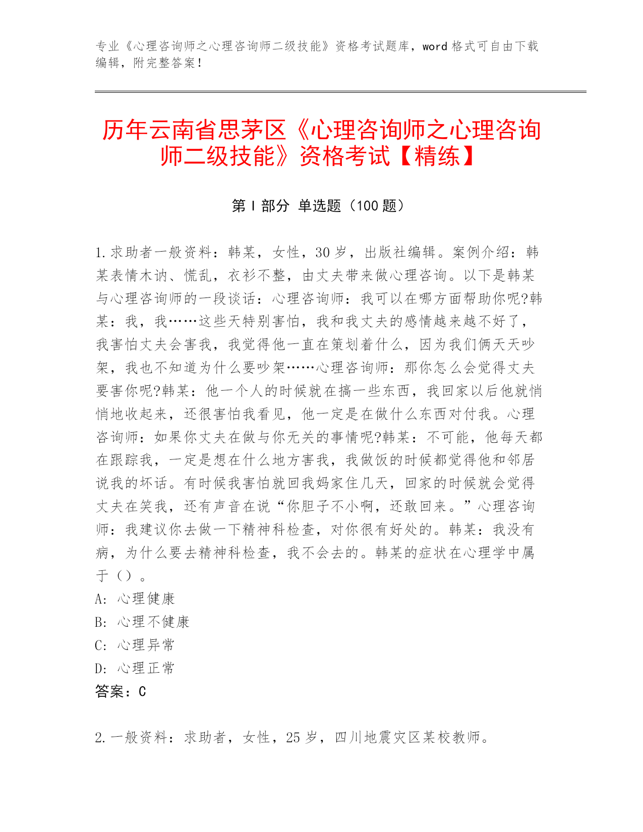 历年云南省思茅区《心理咨询师之心理咨询师二级技能》资格考试【精练】
