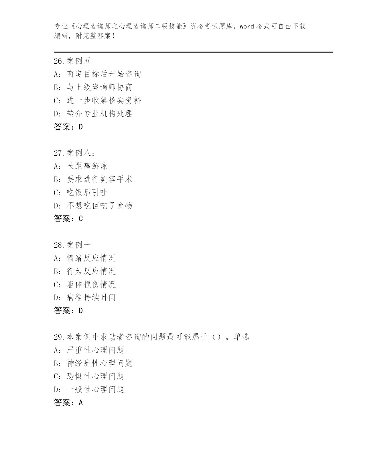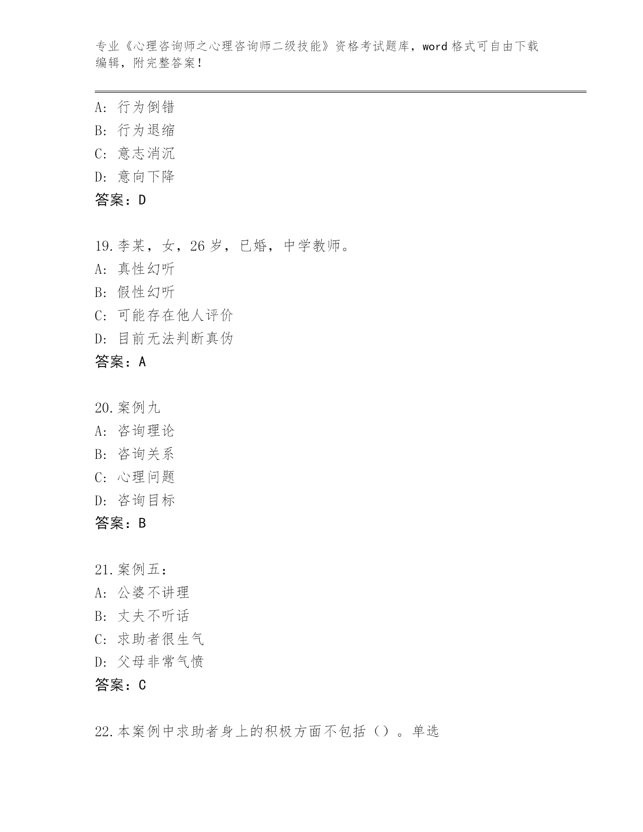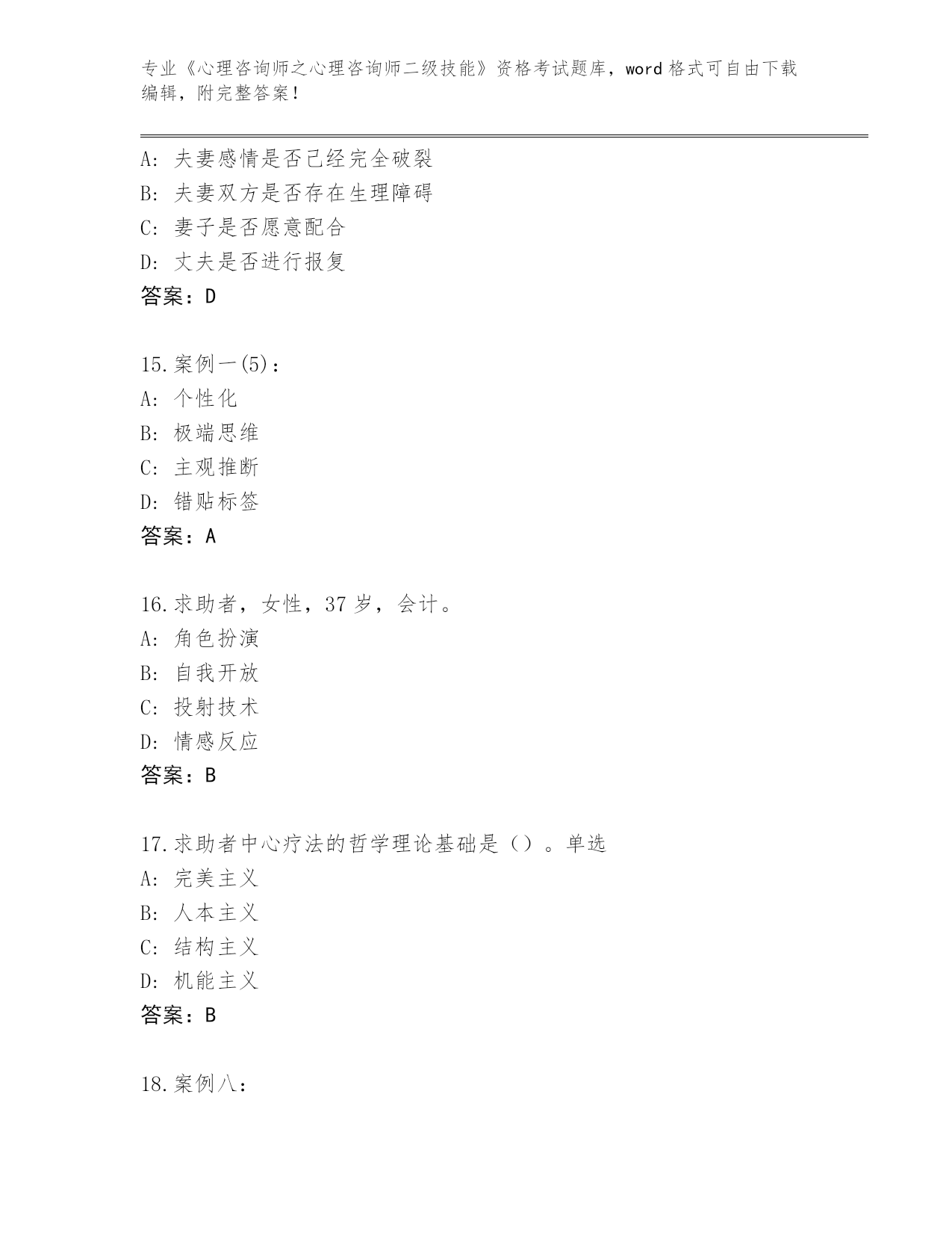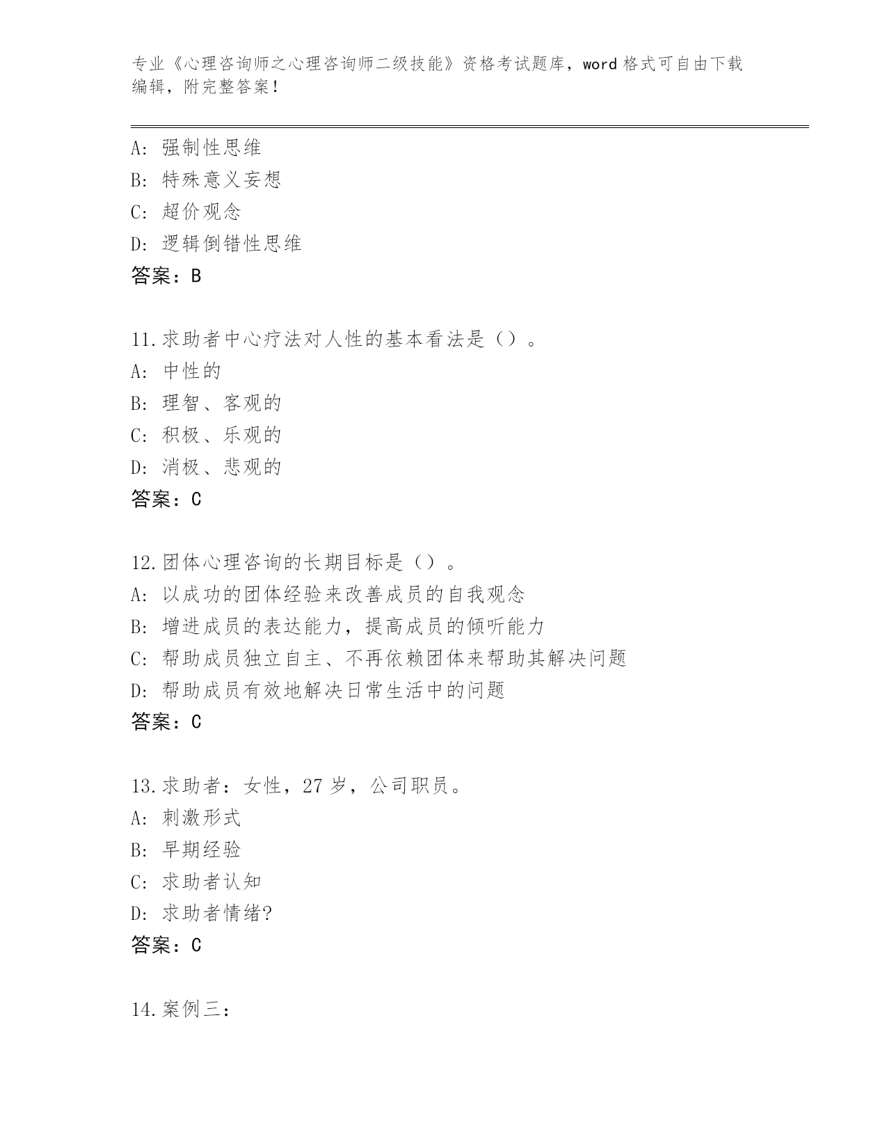 2024云南省思茅区《心理咨询师之心理咨询师二级技能》资格考试必背200题大全及答案(名师系列)