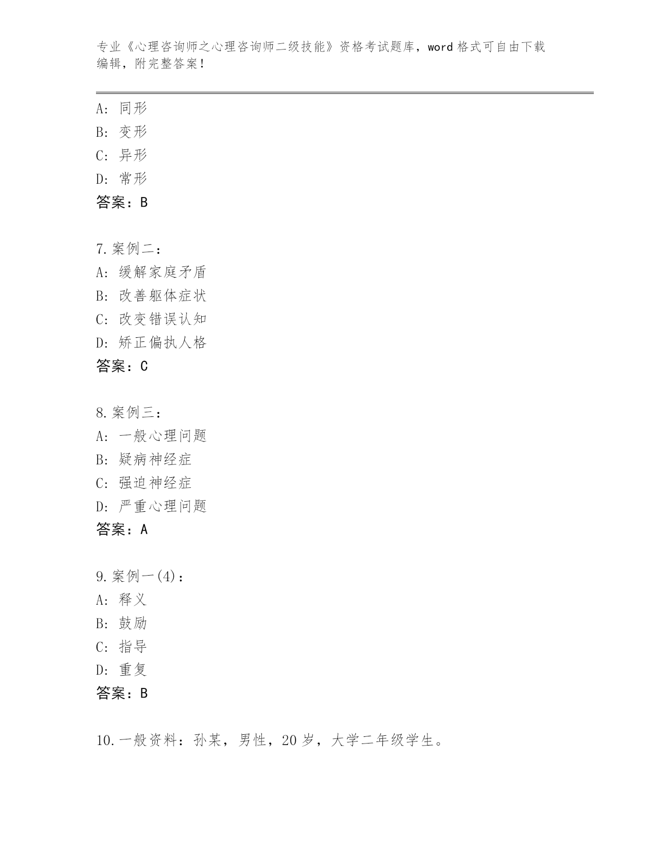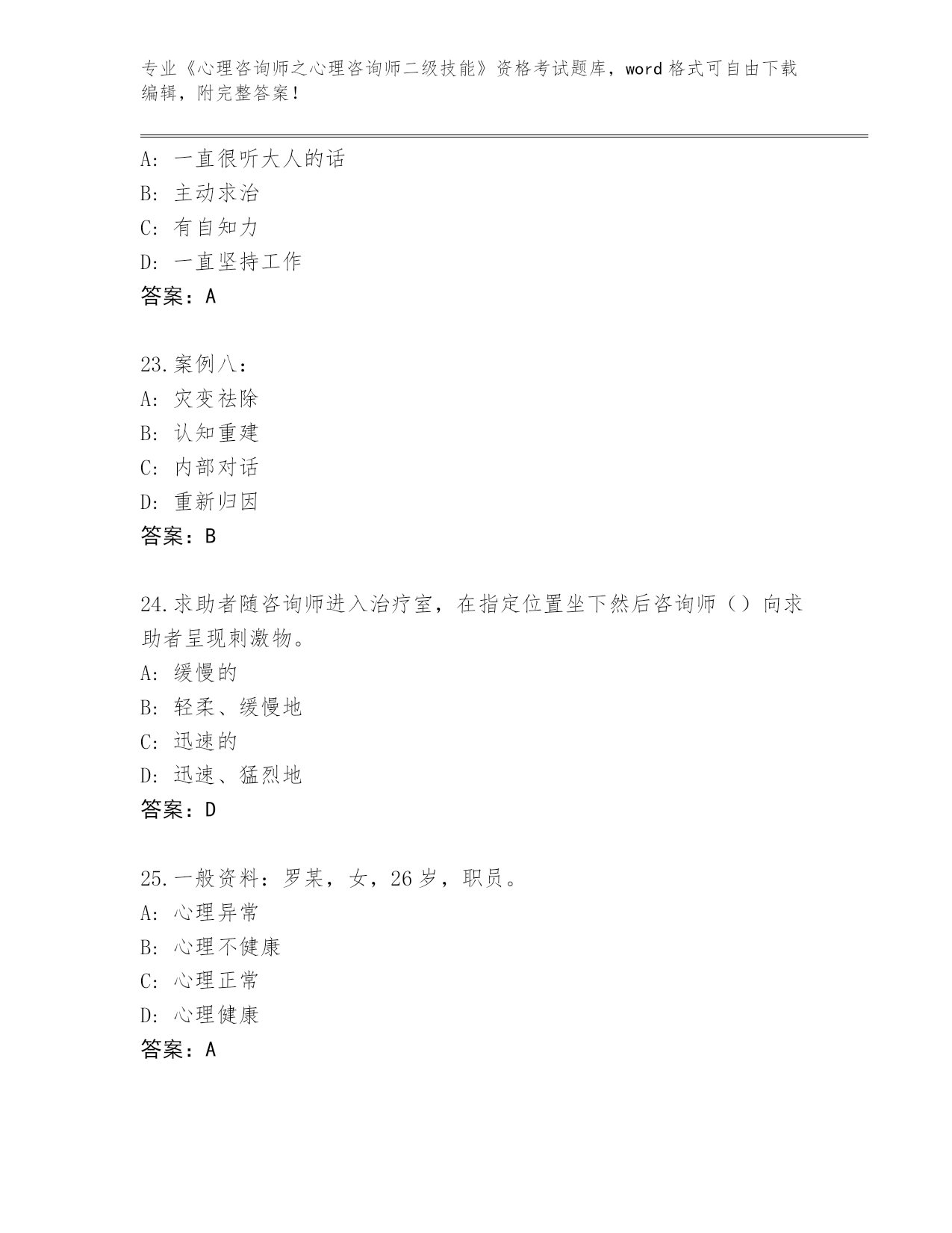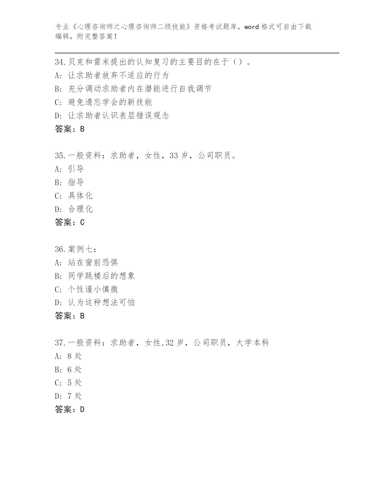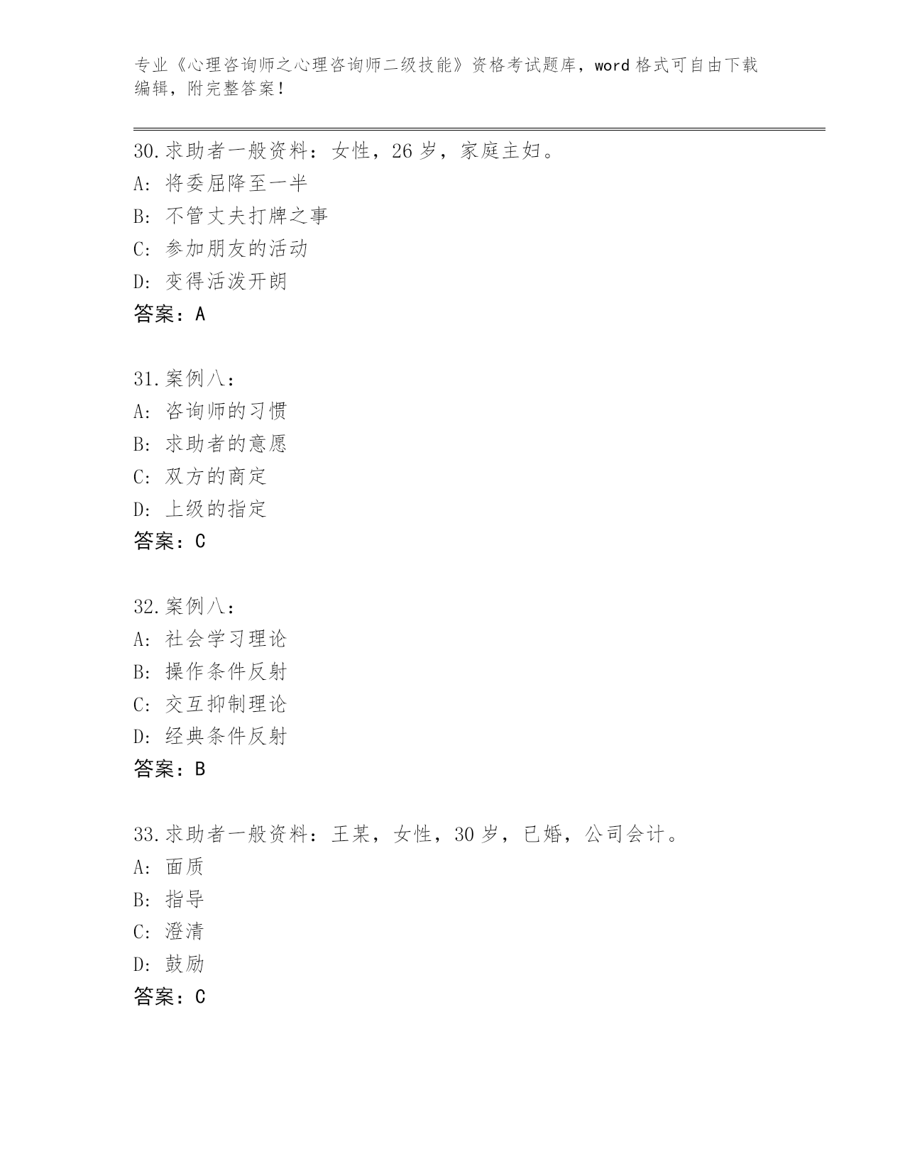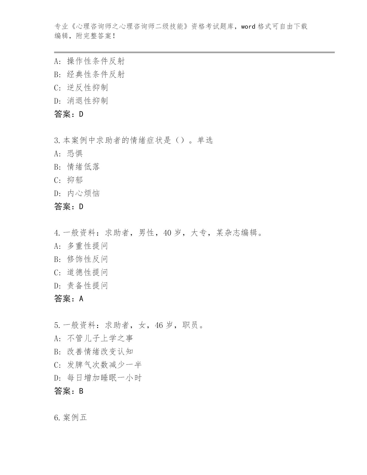 2024云南省思茅区《心理咨询师之心理咨询师二级技能》资格考试必背200题大全及答案(名师系列)
