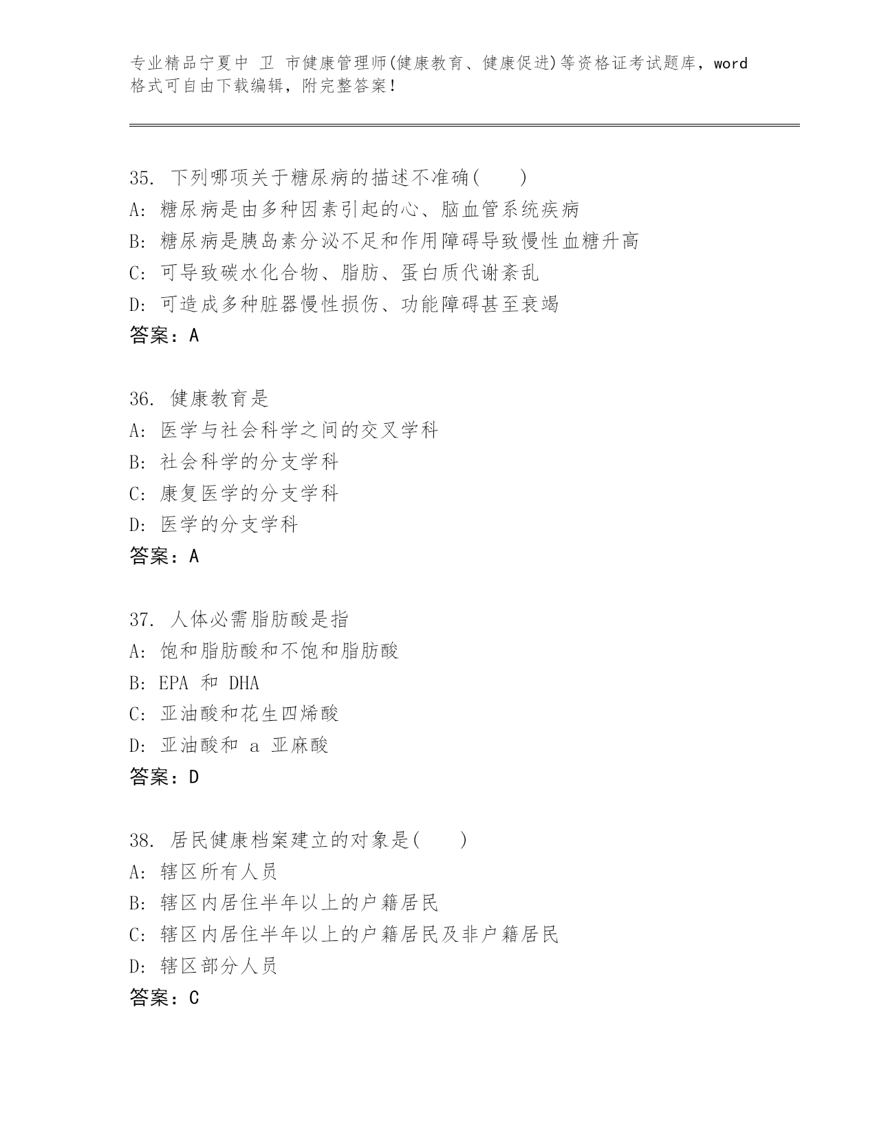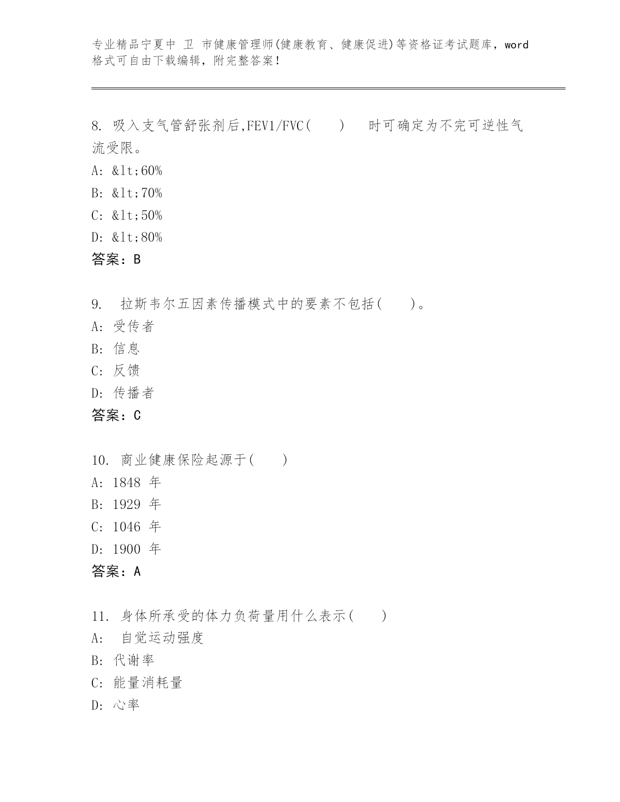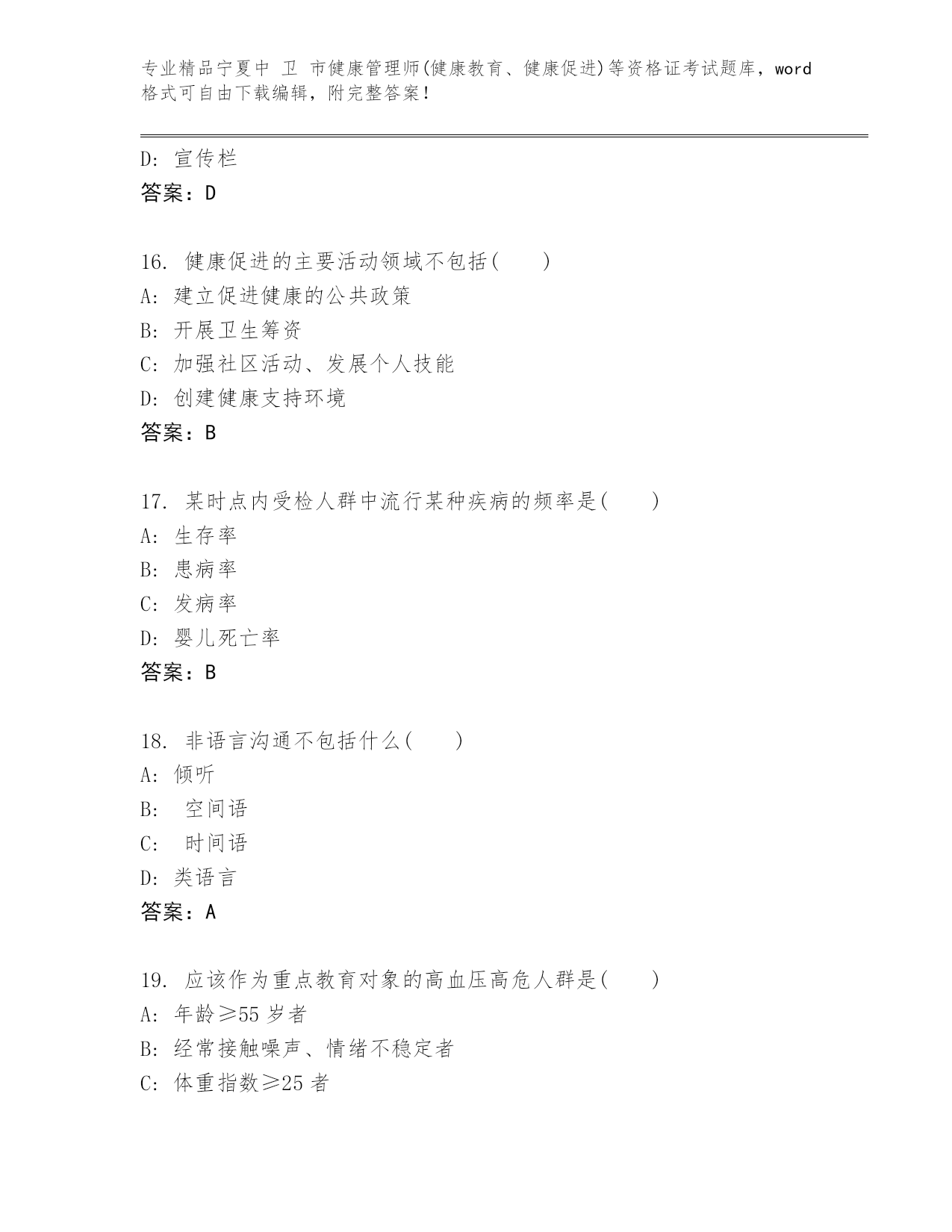 历年宁夏中 卫 市健康管理师(健康教育、健康促进)等资格证考试完整题库附答案【培优】.docx
