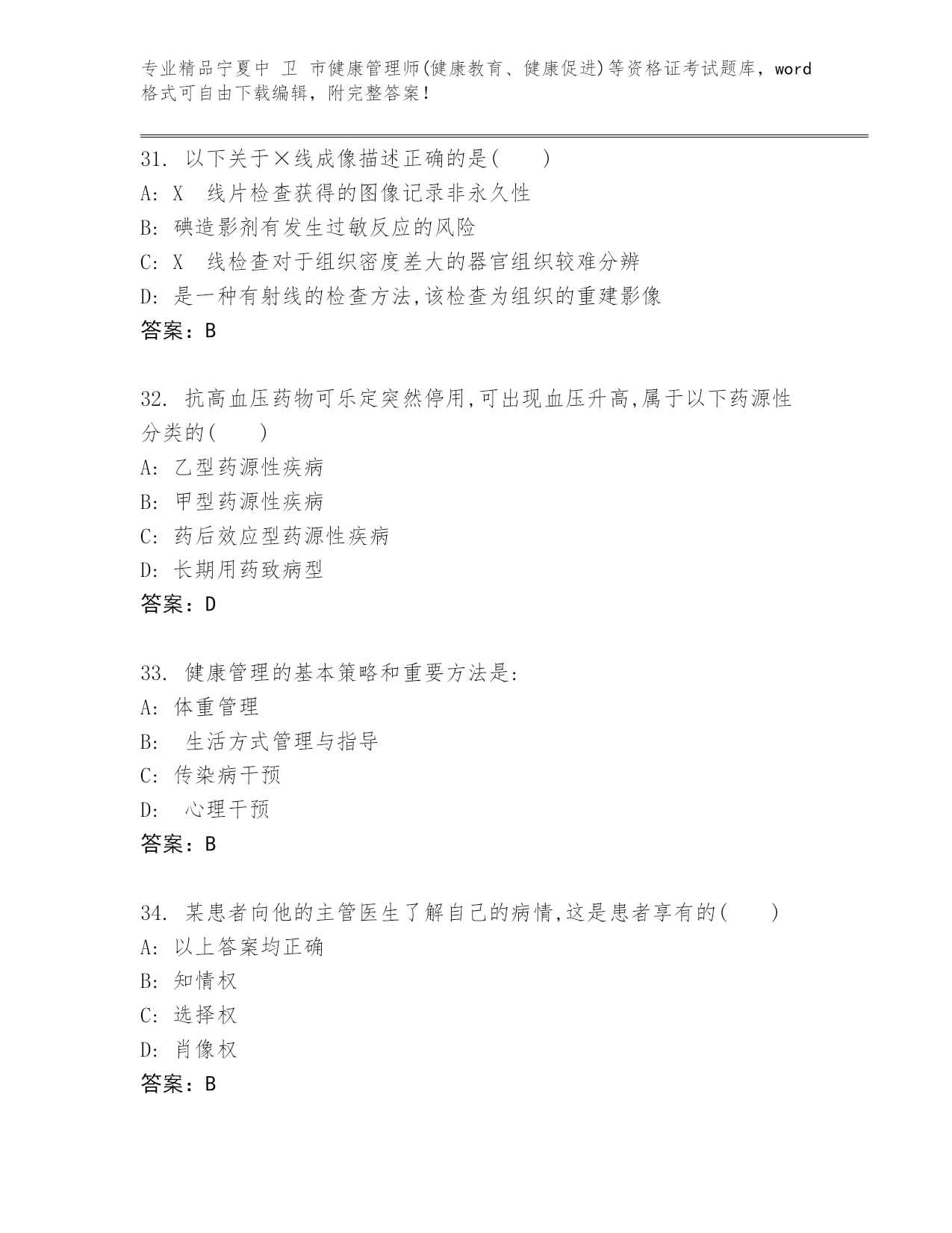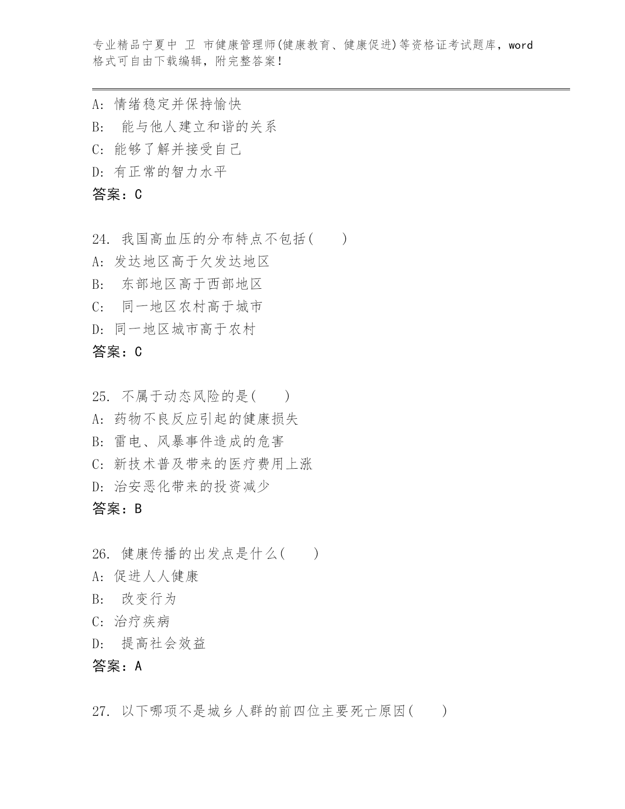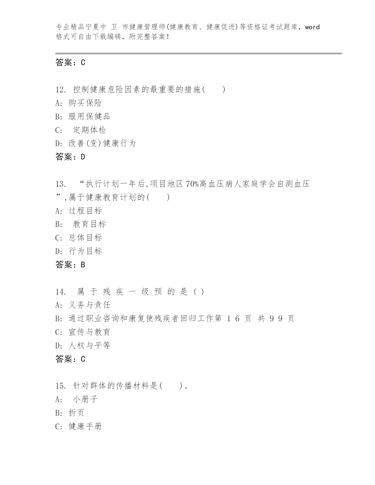 历年宁夏中 卫 市健康管理师(健康教育、健康促进)等资格证考试完整题库附答案【培优】.docx