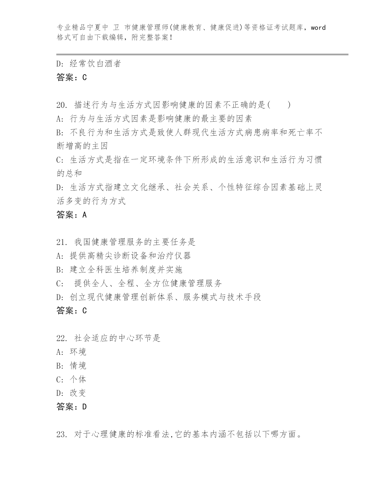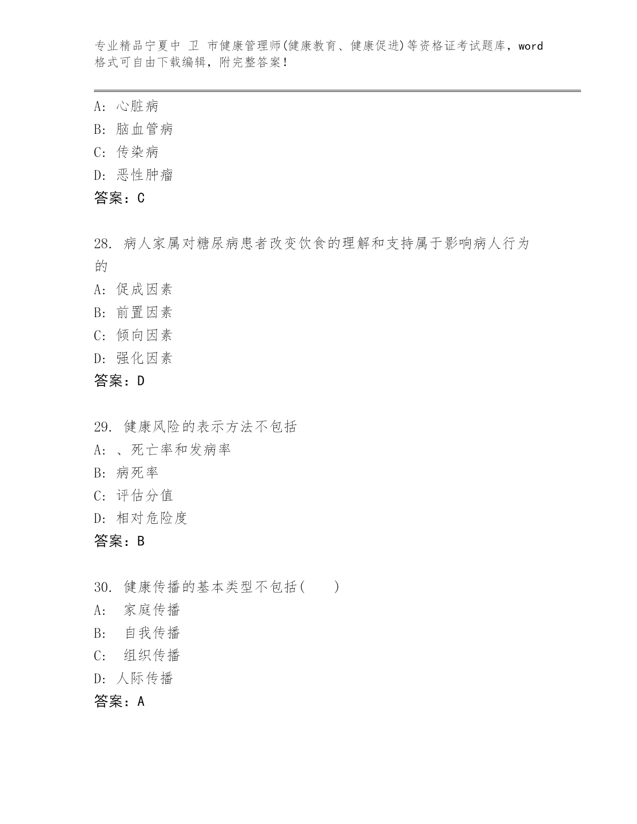 历年宁夏中卫市健康管理师(健康教育、健康促进)等资格证考试完整题库附答案【培优】.docx