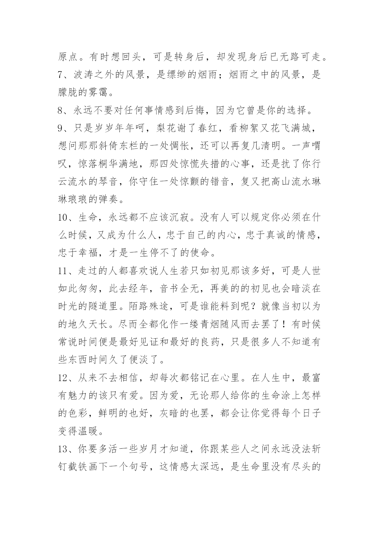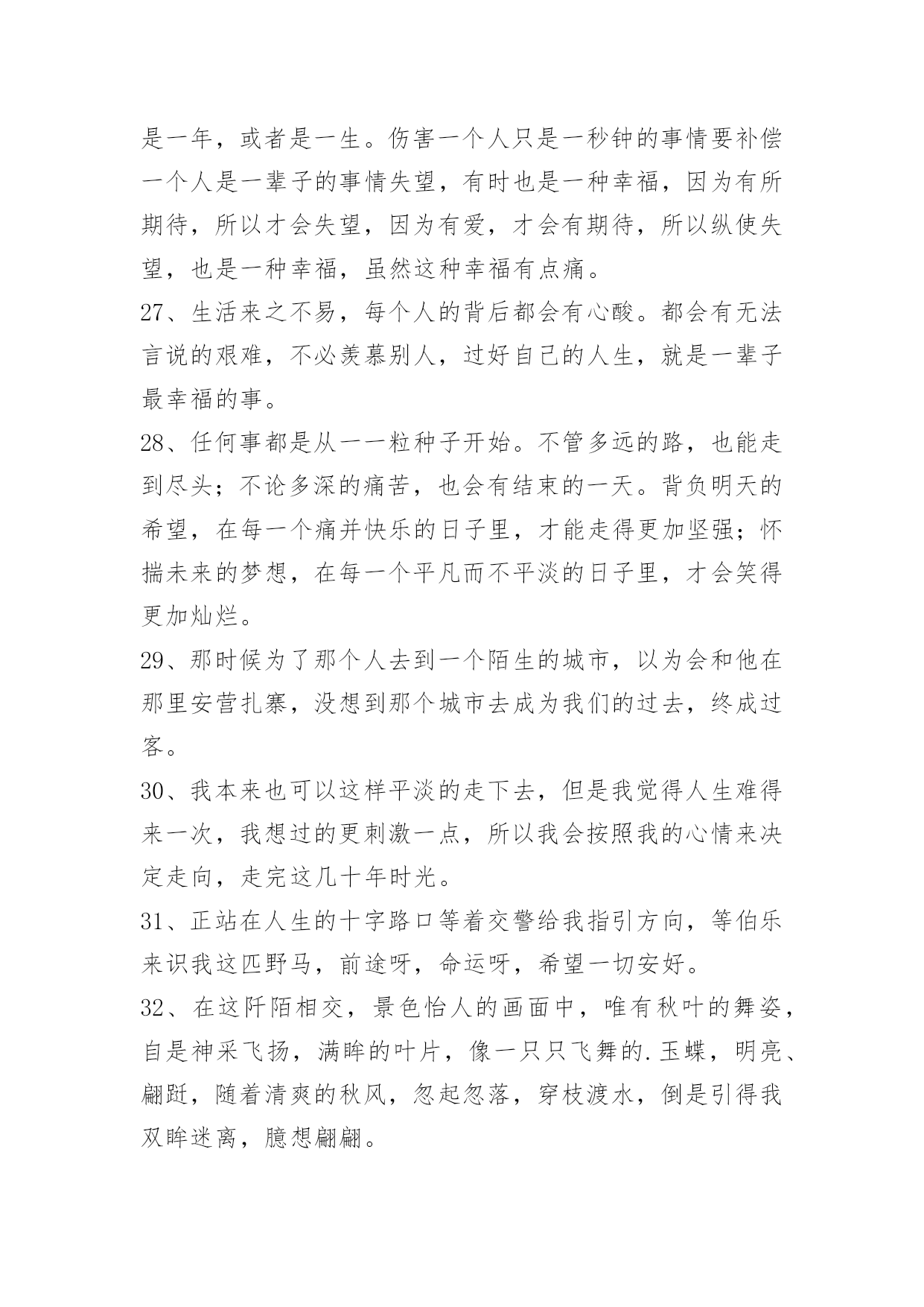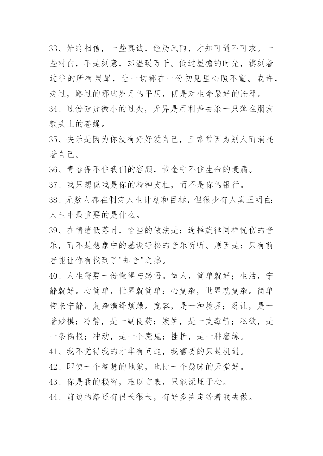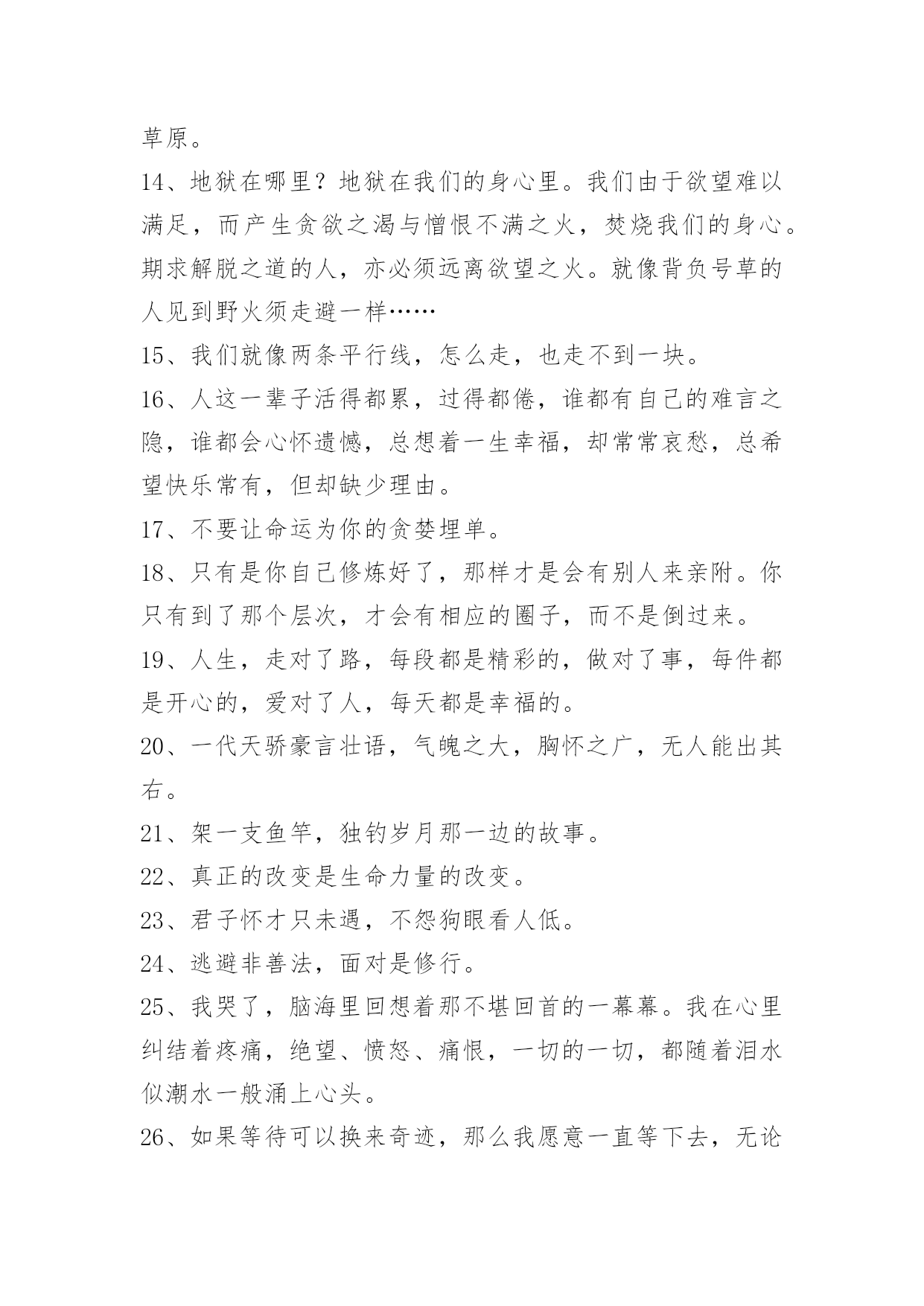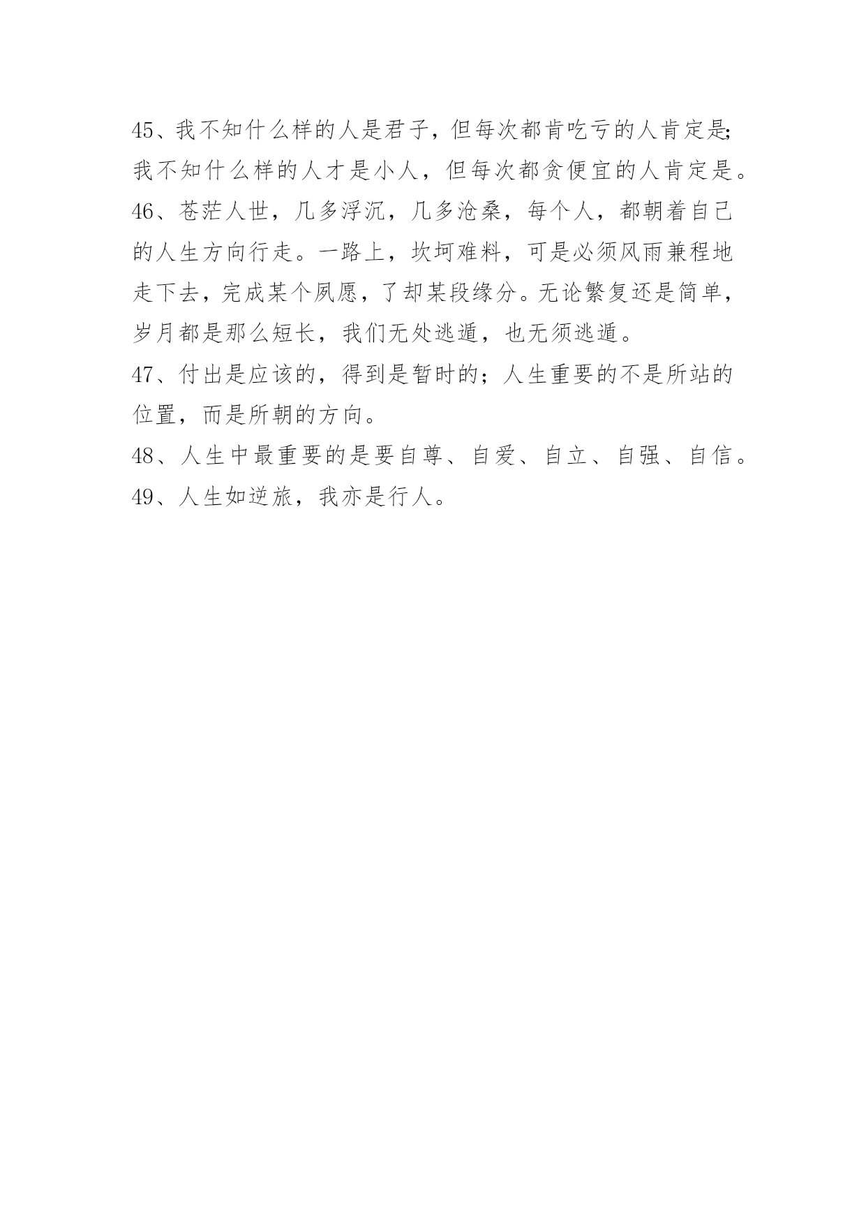 人生的语录49条2021年精选人生的语录汇编49条一生至少该有一次,为了一个人而彻底忘了自己。不求你爱我,只求在平淡的生活里,陪在你身边,就这样静静的看着你,慢慢到老。下面是小编为大家整理推荐的人生的语录49条,欢迎大家借鉴与参考,希望对大家有所帮助。1、人生,面对自己需要勇气;改善自己,需用倾听内心;经营自己,更是要有强大的内心培养自信;一切的,正如培根所言:"深窥自己的心,而后发觉一切的奇迹在你自己"。经历多了,越来越喜欢独处,独处便多一份沉思,于沉默中自我领悟超越。生活的路,简约而不简单!2、心中装满着自我的见地与想法的人,永远听不见别人的心声。3、一个人在一生中至少要生几次气,因为你不可能对别人的好运气完全无动于衷。4、如果你想成功,不妨随时思考如何把瞬间的灵感转变为自己的机会。5、我难过是正因我想要的,你能够给而你没有给。6、走过生命的某一段历程,生活的节奏磨平了尖锐的棱角,舞动的激情也渐渐的平息,忧伤的双眸开始读懂了生命。人生就像一次流浪,漂泊了才懂得安定的美好;经历了才知道最初的美好。有时想远离,走了一段之后,却发现又回到了原点。有时想回头,可是转身后,却发现身后已无路可走。7、波涛之外的风景,是缥缈的烟雨;烟雨之中的风景,是朦胧的雾霭。8、永远不要对任何事情感到后悔,因为它曾是你的选择。9、只是岁岁年年呵,梨花谢了春红,看柳絮又花飞满城,想问那那斜倚东栏的一处惆怅,还可以再复几清明。一声喟叹,惊落桐华满地,那四处惊慌失措的心事,还是扰了你行云流水的琴音,你守住一处惊颤的错音,复又把高山流水琳琳琅琅的弹奏。10、生命,永远都不应该沉寂。没有人可以规定你必须在什么时候,又成为什么人,忠于自己的内心,忠于真诚的情感,忠于幸福,才是一生停不了的使命。11、走过的人都喜欢说人生若只如初见那该多好,可是人世如此匆匆,此去经年,音书全无,再美的的初见也会暗淡在时光的隧道里。陌路殊途,可是谁能料到呢?就像当初以为的地久天长。尽而全都化作一缕青烟随风而去罢了!有时候常说时间便是最好见证和最好的良药,只是很多人不知道有些东西时间久了便淡了。12、从来不去相信,却每次都铭记在心里。在人生中,最富有魅力的该只有爱。因为爱,无论那人给你的生命涂上怎样的色彩,鲜明的也好,灰暗的也罢,都会让你觉得每个日子变得温暖。13、你要多活一些岁月才知道,你跟某些人之间永远没法斩钉截铁画下一个句号,这情感太深远,是生命里没有尽头的草原。14、地狱在哪里?地狱在我们的身心里。我们由于欲望难以满足,而产生贪欲之渴与憎恨不满之火,焚烧我们的身心。期求解脱之道的人,亦必须远离欲望之火。就像背负号草的人见到野火须走避一样……15、我们就像两条平行线,怎么走,也走不到一块。16、人这一辈子活得都累,过得都倦,谁都有自己的难言之隐,谁都会心怀遗憾,总想着一生幸福,却常常哀愁,总希望快乐常有,但却缺少理由。17、不要让命运为你的贪婪埋单。18、只有是你自己修炼好了,那样才是会有别人来亲附。你只有到了那个层次,才会有相应的圈子,而不是倒过来。19、人生,走对了路,每段都是精彩的,做对了事,每件都是开心的,爱对了人,每天都是幸福的。20、一代天骄豪言壮语,气魄之大,胸怀之广,无人能出其右。21、架一支鱼竿,独钓岁月那一边的故事。22、真正的改变是生命力量的改变。23、君子怀才只未遇,不怨狗眼看人低。24、逃避非善法,面对是修行。25、我哭了,脑海里回想着那不堪回首的一幕幕。我在心里纠结着疼痛,绝望、愤怒、痛恨,一切的一切,都随着泪水似潮水一般涌上心头。26、如果等待可以换来奇迹,那么我愿意一直等下去,无论是一年,或者是一生。伤害一个人只是一秒钟的事情要补偿一个人是一辈子的事情失望,有时也是一种幸福,因为有所期待,所以才会失望,因为有爱,才会有期待,所以纵使失望,也是一种幸福,虽然这种幸福有点痛。27、生活来之不易,每个人的背后都会有心酸。都会有无法言说的艰难,不必羡慕别人,过好自己的人生,就是一辈子最幸福的事。28、任何事都是从一一粒种子开始。不管多远的路,也能走到尽头;不论多深的痛苦,也会有结束的一天。背负明天的希望,在每一个痛并快乐的日子里,才能走得更加坚强;怀揣未来的梦想,在每一个平凡而不平淡的日子里,才会笑得更加灿烂。29、那时候为了那个人去到一个陌生的城市,以为会和他在那里安营扎寨,没想到那个城市去成为我们的过去,终成过客。30、我本来也可以这样平淡的走下去,但是我觉得人生难得来一次,我想过的更刺激一点,所以我会按照我的心情来决定走向,走完这几十年时光。31、正站在人生的十字路口等着交警给我指引方向,等伯乐来识我这匹野马,前途呀,命运呀,希望一切安好。32、在这阡陌相交,景色怡人的画面中,唯有秋叶的舞姿,自是神采飞扬,满眸的叶片,像一只只飞舞的.玉蝶,明亮、