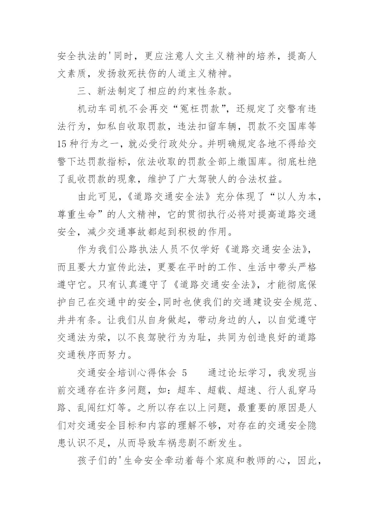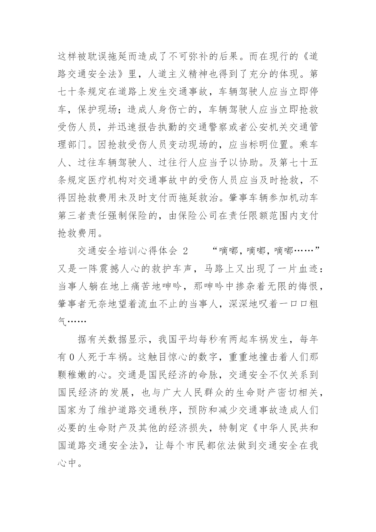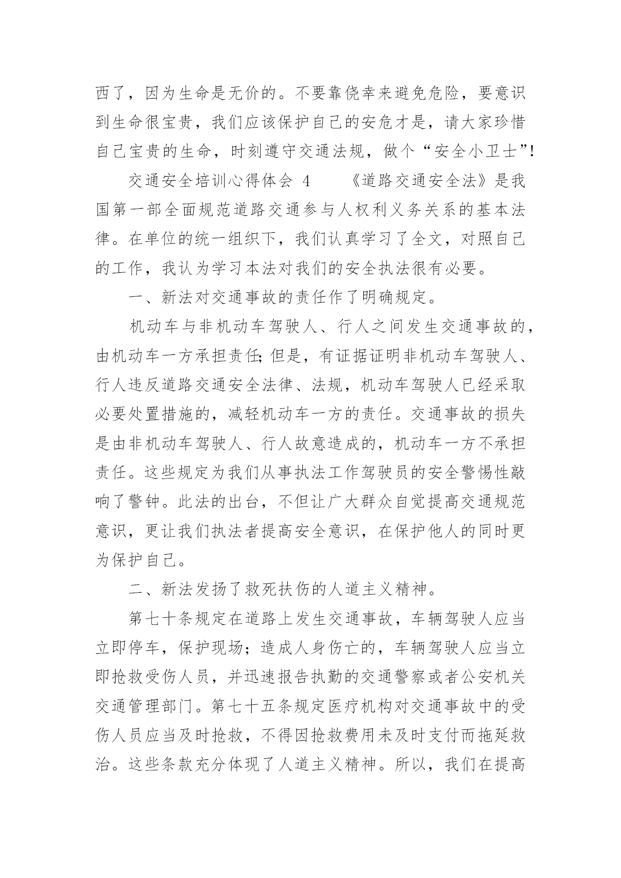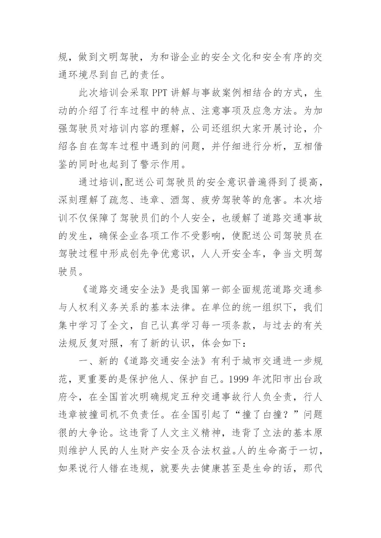 交通安全培训心得体会交通安全培训心得体会(通用22篇)当我们受到启发,对生活有了新的感悟时,心得体会是很好的记录方式,这么做可以让我们不断思考不断进步。那么心得体会该怎么写?想必这让大家都很苦恼吧,以下是小编整理的交通安全培训心得体会,仅供参考,希望能够帮助到大家。交通安全培训心得体会1为了进一步增强驾驶员安全意识及事故防范能力,营造出更加稳定、和谐的环境,日前,国网慈溪市供电公司针对210余名驾驶人员开展了全体汽车驾驶员交通安全培训,规范其行车行为,使企业安全文化得到有效提升。此次培训,该公司邀请到慈溪市浒山街道交通管理站站长符长飞就慈溪市交通安全形势、常见的交通违法行为、交通事故案例、交通违法与交通事故的关系、交通违法行为产生的原因、冬季车辆怎样维护等方面的内容,他用通俗易懂的语言,对道理行车安全进行了讲解和阐述,并着重对酒后驾车、超速驾车等几个重点问题的危害性进行了强调,提醒驾驶员要注意安全行车。在培训过程中,讲解人员采取了法规和案例相结合、主讲与现场解答相互动的方式,活跃了现场气氛,收到了很好的效果。慈溪市供电公司的参训驾驶员在培训结束后纷纷表示,在今后的工作中将安全行车放在首位,严格遵守交通法规,做到文明驾驶,为和谐企业的安全文化和安全有序的交通环境尽到自己的责任。此次培训会采取PPT讲解与事故案例相结合的方式,生动的介绍了行车过程中的特点、注意事项及应急方法。为加强驾驶员对培训内容的理解,公司还组织大家开展讨论,介绍各自在驾车过程中遇到的问题,并仔细进行分析,互相借鉴的同时也起到了警示作用。通过培训,配送公司驾驶员的安全意识普遍得到了提高,深刻理解了疏忽、违章、酒驾、疲劳驾驶等的危害。本次培训不仅保障了驾驶员们的个人安全,也缓解了道路交通事故的发生,确保企业各项工作不受影响,使配送公司驾驶员在驾驶过程中形成创先争优意识,人人开安全车,争当文明驾驶员。《道路交通安全法》是我国第一部全面规范道路交通参与人权利义务关系的基本法律。在单位的统一组织下,我们集中学习了全文,自己认真学习每一项条款,与过去的有关法规反复对照,有了新的认识,体会如下:一、新的《道路交通安全法》有利于城市交通进一步规范,更重要的是保护他人、保护自己。1999年沈阳市出台政府令,在全国首次明确规定五种交通事故行人负全责,行人违章被撞司机不负责任。在全国引起了“撞了白撞?”问题很的大争论。这违背了人文主义精神,违背了立法的基本原则维护人民的人生财产安全及合法权益。人的生命高于一切,如果说行人错在违规,就要失去健康甚至是生命的话,那代价实在太大了。那些撞到人的司机剥夺了别人健康,生存的权力岂不是错更大?即使不是故意,但是也说明了肇事司机的安全警惕性不高,应对突发能力不强,理应承担责任。现在新交通法规明确规定:机动车与非机动车驾驶人、行人之间发生交通事故的,由机动车一方承担责任;但是,有证据证明非机动车驾驶人、行人违反道路交通安全法律、法规,机动车驾驶人已经采取必要处置措施的,减轻机动车一方的责任。交通事故的损失是由非机动车驾驶人、行人故意造成的,机动车一方不承担责任。彻底否认“撞了白撞”的说法,这一点为司机的安全警惕性敲响了警钟。新交通法里,对行人的违规行为也作了相关处罚规定,在提醒驾驶者的同时,也对行人起到了一定的约束作用。所以新的《道路交通安全法》要向全国人民普及,让群众提高交通规范认识,目的除了规范城市交通以外,更重要的是为保护他人更为保护自己。二、新的《道路交通安全法》更注重提高国民交通规范认识,发扬救死扶伤的人道主义精神。在一场交通意外发生之后,受伤者献血淋漓的躺在地上,可是周围的'村民却守着出事地点,不让人破环现场,非要等交警来处理,伤者就这样不能得到及时医治,导致失血过多死亡。当时这件事情对我的震动很大,不仅为伤者无辜丧命感到惋惜和遗憾,更为村民的愚昧偏执痛心。这样的事情何止这一件呢,交通意外发生之后,得不到及时医治,原因除了上述这种情况还有很多。比如,肇事司机弃伤者逃离现场;伤者被送到医院以后因为资金问题的不到医治等等。本来可以挽救的生命,就这样被耽误拖延而造成了不可弥补的后果。而在现行的《道路交通安全法》里,人道主义精神也得到了充分的体现。第七十条规定在道路上发生交通事故,车辆驾驶人应当立即停车,保护现场;造成人身伤亡的,车辆驾驶人应当立即抢救受伤人员,并迅速报告执勤的交通警察或者公安机关交通管理部门。因抢救受伤人员变动现场的,应当标明位置。乘车人、过往车辆驾驶人、过往行人应当予以协助。及第七十五条规定医疗机构对交通事故中的受伤人员应当及时抢救,不得因抢救费用未及时支付而拖延救治。肇事车辆参加机动车第三者责任强制保险的,由保险公司在责任限额范围内支付抢救费用。交通安全培训心得体会2“嘀嘟,嘀嘟,嘀嘟……”又是一阵震撼人心的救护车声,