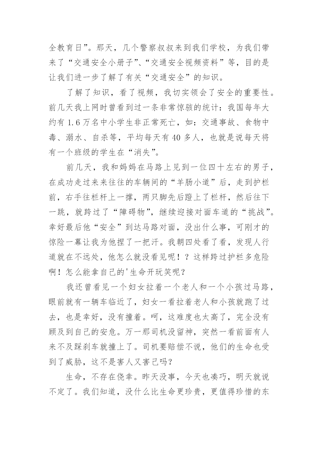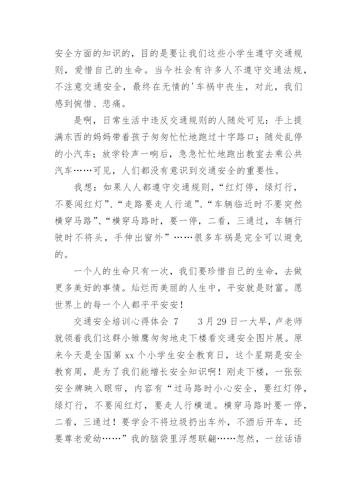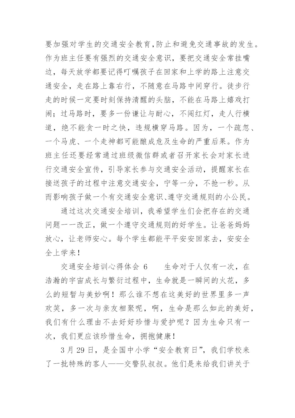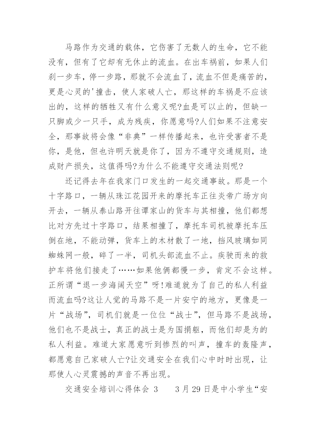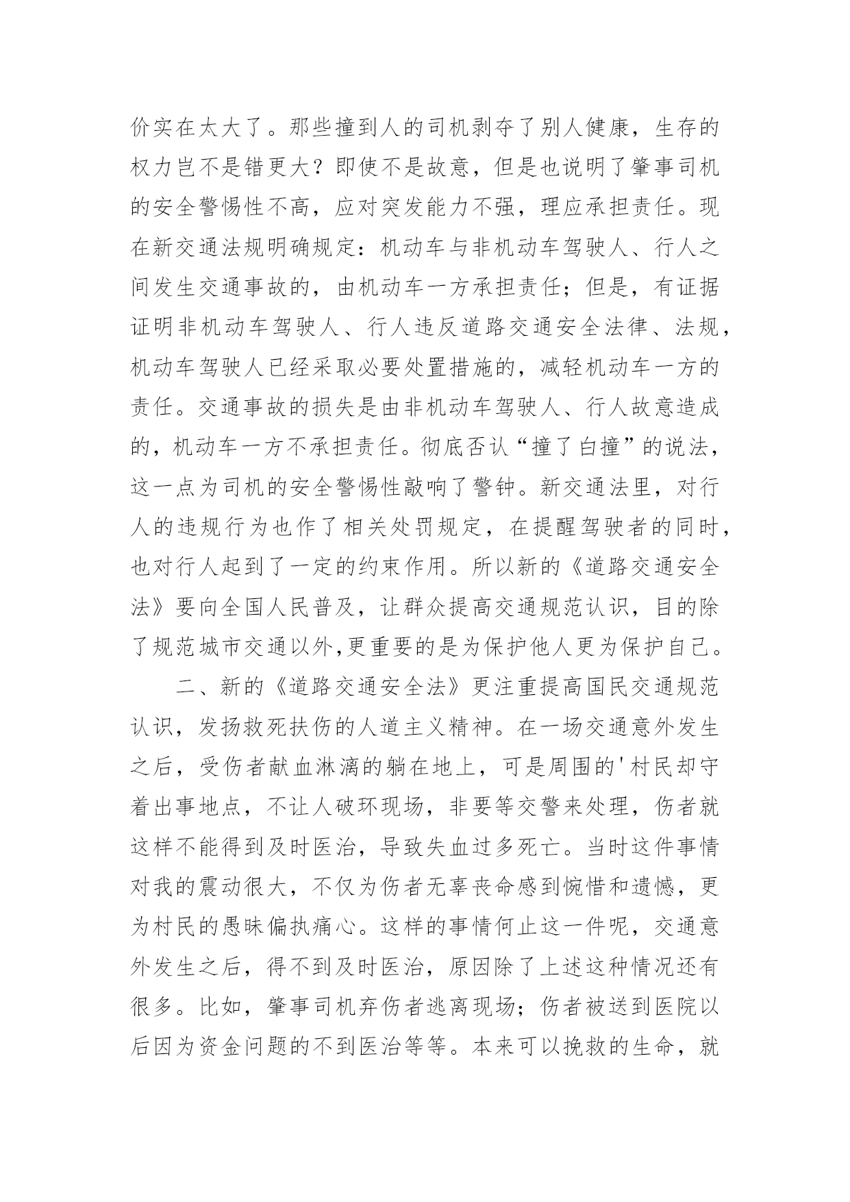 交通安全培训心得体会交通安全培训心得体会(通用22篇)当我们受到启发,对生活有了新的感悟时,心得体会是很好的记录方式,这么做可以让我们不断思考不断进步。那么心得体会该怎么写?想必这让大家都很苦恼吧,以下是小编整理的交通安全培训心得体会,仅供参考,希望能够帮助到大家。交通安全培训心得体会1为了进一步增强驾驶员安全意识及事故防范能力,营造出更加稳定、和谐的环境,日前,国网慈溪市供电公司针对210余名驾驶人员开展了全体汽车驾驶员交通安全培训,规范其行车行为,使企业安全文化得到有效提升。此次培训,该公司邀请到慈溪市浒山街道交通管理站站长符长飞就慈溪市交通安全形势、常见的交通违法行为、交通事故案例、交通违法与交通事故的关系、交通违法行为产生的原因、冬季车辆怎样维护等方面的内容,他用通俗易懂的语言,对道理行车安全进行了讲解和阐述,并着重对酒后驾车、超速驾车等几个重点问题的危害性进行了强调,提醒驾驶员要注意安全行车。在培训过程中,讲解人员采取了法规和案例相结合、主讲与现场解答相互动的方式,活跃了现场气氛,收到了很好的效果。慈溪市供电公司的参训驾驶员在培训结束后纷纷表示,在今后的工作中将安全行车放在首位,严格遵守交通法规,做到文明驾驶,为和谐企业的安全文化和安全有序的交通环境尽到自己的责任。此次培训会采取PPT讲解与事故案例相结合的方式,生动的介绍了行车过程中的特点、注意事项及应急方法。为加强驾驶员对培训内容的理解,公司还组织大家开展讨论,介绍各自在驾车过程中遇到的问题,并仔细进行分析,互相借鉴的同时也起到了警示作用。通过培训,配送公司驾驶员的安全意识普遍得到了提高,深刻理解了疏忽、违章、酒驾、疲劳驾驶等的危害。本次培训不仅保障了驾驶员们的个人安全,也缓解了道路交通事故的发生,确保企业各项工作不受影响,使配送公司驾驶员在驾驶过程中形成创先争优意识,人人开安全车,争当文明驾驶员。《道路交通安全法》是我国第一部全面规范道路交通参与人权利义务关系的基本法律。在单位的统一组织下,我们集中学习了全文,自己认真学习每一项条款,与过去的有关法规反复对照,有了新的认识,体会如下:一、新的《道路交通安全法》有利于城市交通进一步规范,更重要的是保护他人、保护自己。1999年沈阳市出台政府令,在全国首次明确规定五种交通事故行人负全责,行人违章被撞司机不负责任。在全国引起了“撞了白撞?”问题很的大争论。这违背了人文主义精神,违背了立法的基本原则维护人民的人生财产安全及合法权益。人的生命高于一切,如果说行人错在违规,就要失去健康甚至是生命的话,那代价实在太大了。那些撞到人的司机剥夺了别人健康,生存的权力岂不是错更大?即使不是故意,但是也说明了肇事司机的安全警惕性不高,应对突发能力不强,理应承担责任。现在新交通法规明确规定:机动车与非机动车驾驶人、行人之间发生交通事故的,由机动车一方承担责任;但是,有证据证明非机动车驾驶人、行人违反道路交通安全法律、法规,机动车驾驶人已经采取必要处置措施的,减轻机动车一方的责任。交通事故的损失是由非机动车驾驶人、行人故意造成的,机动车一方不承担责任。彻底否认“撞了白撞”的说法,这一点为司机的安全警惕性敲响了警钟。新交通法里,对行人的违规行为也作了相关处罚规定,在提醒驾驶者的同时,也对行人起到了一定的约束作用。所以新的《道路交通安全法》要向全国人民普及,让群众提高交通规范认识,目的除了规范城市交通以外,更重要的是为保护他人更为保护自己。二、新的《道路交通安全法》更注重提高国民交通规范认识,发扬救死扶伤的人道主义精神。在一场交通意外发生之后,受伤者献血淋漓的躺在地上,可是周围的'村民却守着出事地点,不让人破环现场,非要等交警来处理,伤者就这样不能得到及时医治,导致失血过多死亡。当时这件事情对我的震动很大,不仅为伤者无辜丧命感到惋惜和遗憾,更为村民的愚昧偏执痛心。这样的事情何止这一件呢,交通意外发生之后,得不到及时医治,原因除了上述这种情况还有很多。比如,肇事司机弃伤者逃离现场;伤者被送到医院以后因为资金问题的不到医治等等。本来可以挽救的生命,就这样被耽误拖延而造成了不可弥补的后果。而在现行的《道路交通安全法》里,人道主义精神也得到了充分的体现。第七十条规定在道路上发生交通事故,车辆驾驶人应当立即停车,保护现场;造成人身伤亡的,车辆驾驶人应当立即抢救受伤人员,并迅速报告执勤的交通警察或者公安机关交通管理部门。因抢救受伤人员变动现场的,应当标明位置。乘车人、过往车辆驾驶人、过往行人应当予以协助。及第七十五条规定医疗机构对交通事故中的受伤人员应当及时抢救,不得因抢救费用未及时支付而拖延救治。肇事车辆参加机动车第三者责任强制保险的,由保险公司在责任限额范围内支付抢救费用。交通安全培训心得体会2“嘀嘟,嘀嘟,嘀嘟……”又是一阵震撼人心的救护车声,