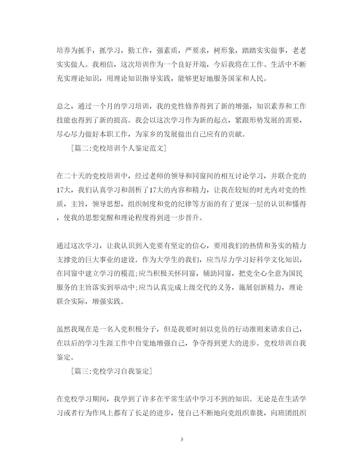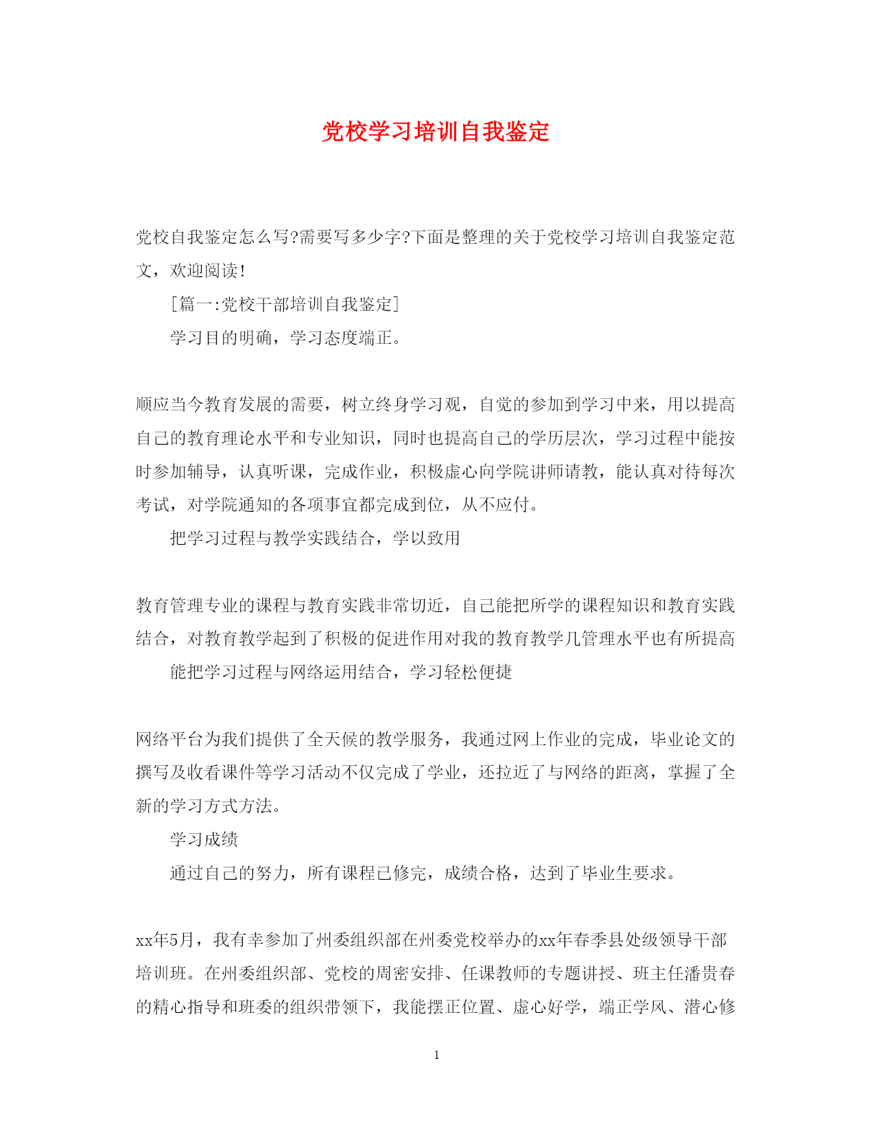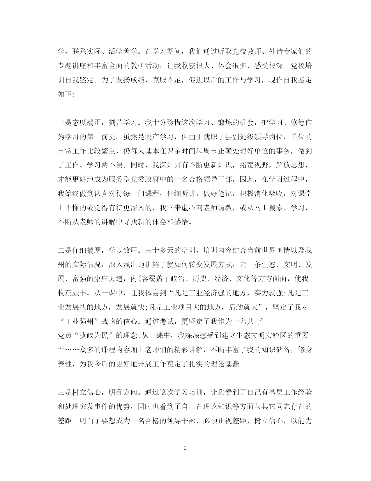 此资料由网络收集而来,如有侵权请告知上传者立即删除。资料共分享,我们负责传递知识。PAGEPAGE7党校学习培训自我鉴定党校自我鉴定怎么写?需要写多少字?下面是整理的关于党校学习培训自我鉴定范文,欢迎阅读![篇一:党校干部培训自我鉴定]学习目的明确,学习态度端正。顺应当今教育发展的需要,树立终身学习观,自觉的参加到学习中来,用以提高自己的教育理论水平和专业知识,同时也提高自己的学历层次,学习过程中能按时参加辅导,认真听课,完成作业,积极虚心向学院讲师请教,能认真对待每次考试,对学院通知的各项事宜都完成到位,从不应付。把学习过程与教学实践结合,学以致用教育管理专业的课程与教育实践非常切近,自己能把所学的课程知识和教育实践结合,对教育教学起到了积极的促进作用对我的教育教学几管理水平也有所提高能把学习过程与网络运用结合,学习轻松便捷网络平台为我们提供了全天候的教学服务,我通过网上作业的完成,毕业论文的撰写及收看课件等学习活动不仅完成了学业,还拉近了与网络的距离,掌握了全新的学习方式方法。学习成绩通过自己的努力,所有课程已修完,成绩合格,达到了毕业生要求。xx年5月,我有幸参加了州委组织部在州委党校举办的xx年春季县处级领导干部培训班。在州委组织部、党校的周密安排、任课教师的专题讲授、班主任潘贵春的精心指导和班委的组织带领下,我能摆正位置、虚心好学,端正学风、潜心修学,联系实际、活学善学。在学习期间,我们通过听取党校教师、外请专家们的专题讲座和丰富全面的教研活动,让我收获很大、体会很多、感受很深。党校培训自我鉴定。为了发扬成绩,克服不足,促进以后的工作与学习,现作自我鉴定如下:一是态度端正,刻苦学习。我十分珍惜这次学习、锻炼的机会,把学习、修德作为学习的第一前提。虽然是脱产学习,但由于就职于县副处级领导岗位,单位的日常工作比较繁重,仍每天基本在课余时间和周末正确处理好单位的事务,做到了工作、学习两不误。同时,我深知只有不断更新知识,拓宽视野,解放思想,才能更好地成为服务型党委政府中的一名合格领导干部。因此,在学习过程中,我始终做到认真对待每一门课程,仔细听讲,做好笔记,积极消化吸收,对课堂上不懂的或觉得有待更深入的,我下来虚心向老师请教,或从网上搜索、学习,不断从老师的讲解中寻找新的体会和感悟。二是仔细揣摩,学以致用。三十多天的培训,培训内容结合当前世界国情以及我州的实际情况,深入浅出地讲解了就如何转变发展方式,走一条生态、文明、发展、富强的康庄大道,内(容覆盖了政治、历史、经济、文化等方方面面,使我收获颇丰。从一课中,让我体会到“凡是工业经济强的地方,实力就强;凡是工业发展快的地方,发展就快;凡是工业项目大的地方,后劲就大”,坚定了我对“工业强州”战略的信心。通过考试,更坚定了我作为一名共-产-党员“执政为民”的理念;从一课中,我深深感受到建立生态文明实验区的重要性……众多的课程内容加上老师们的精彩讲解,不断丰富了我的知识储备,修身养性,为我今后的更好地开展工作奠定了扎实的理论基矗三是树立信心,明确方向。通过这次学习培训,让我看到了自己有基层工作经验和处理突发事件的优势,同时也看到了自己在理论知识等方面与其它同志存在的差距。明白了要想成为一名合格的领导干部,必须正视差距,树立信心,以能力培养为抓手,抓学习,勤工作,强素质,严要求,树形象,踏踏实实做事,老老实实做人。我相信,这次培训作为一个良好开端,今后我将在工作、生活中不断充实理论知识,用理论知识指导实践,能够更好地服务国家和人民。总之,通过一个月的学习培训,我的党性修养得到了新的增强,知识素养和工作技能也得到了新的提高。我会以这次学习作为新的起点,紧跟形势发展的需要,尽心尽力做好本职工作,为家乡的发展做出自己应有的贡献。[篇二:党校培训个人鉴定范文]在二十天的党校培训中,经过老师的领导和同窗间的相互讨论学习,并联合党的17大,我们认真学习和剖析了17大的内容和精力,让我在较短的时光内对党的性质,主旨,领导思想,组织制度和党的纪律等方面的有了更深一层的认识和懂得,使我的思想觉醒和理论程度得到进一步晋升。通过这次学习,让我认识到入党要有坚定的信心,要用我们的热情和务实的精力支撑党的巨大事业的建设。作为大学生的我们,应当尽力学习好科学文化知识,在同窗中建立学习的模范;应当积极关怀同窗,辅助同窗,把党全心全意为国民服务的主旨落实到举动中;应当认真完成上级交代的义务,施展创新精力,理论联合实际,增强实践。虽然我现在是一名入党积极分子,但是我要时刻以党员的行动准则来请求自己,在以后的学习生涯工作中自觉地增强自己,争夺得到更大的进步。党校培训自我鉴定。[篇三:党校学习自我鉴定]在党校学习期间,我学到了许多在平常生活中学习不到的知识