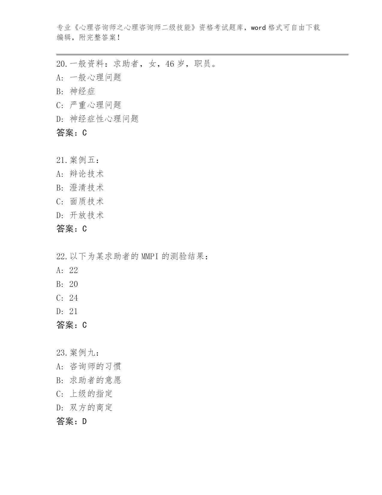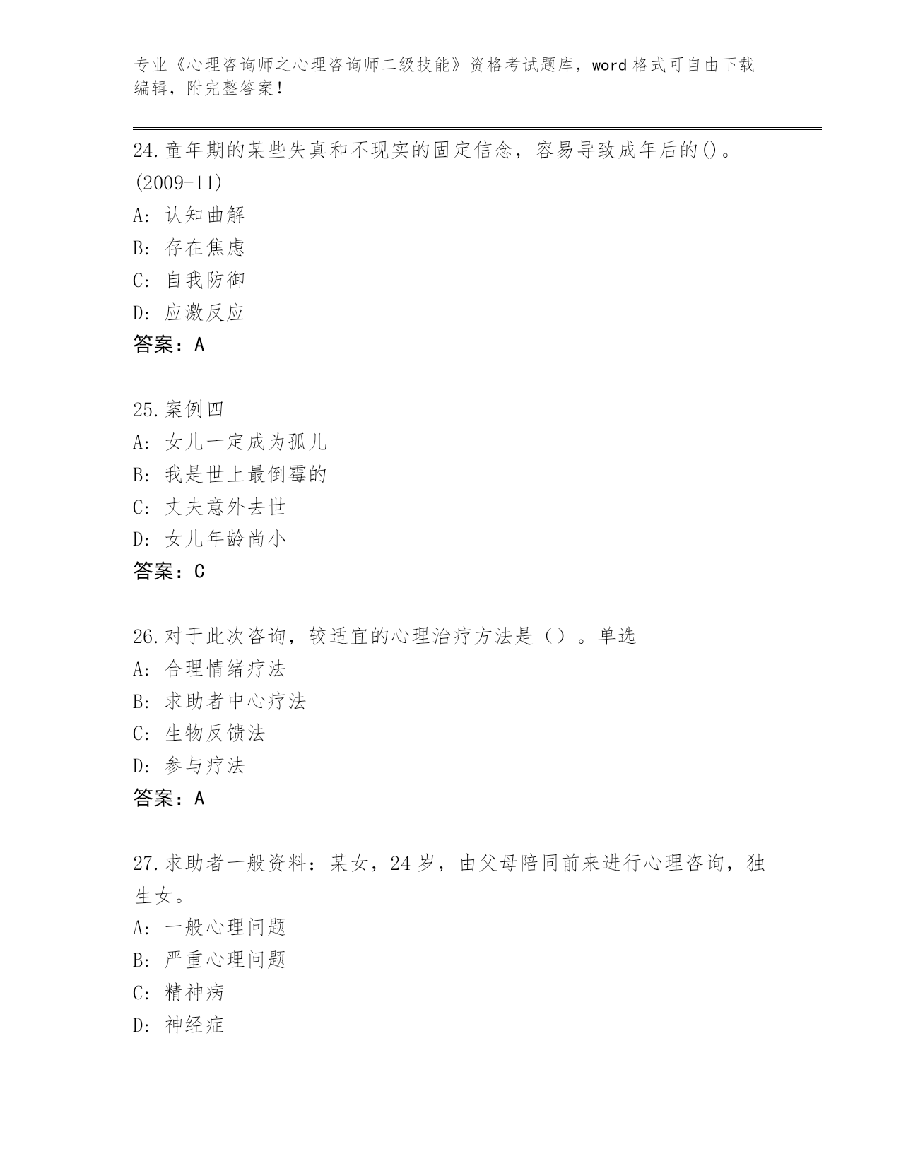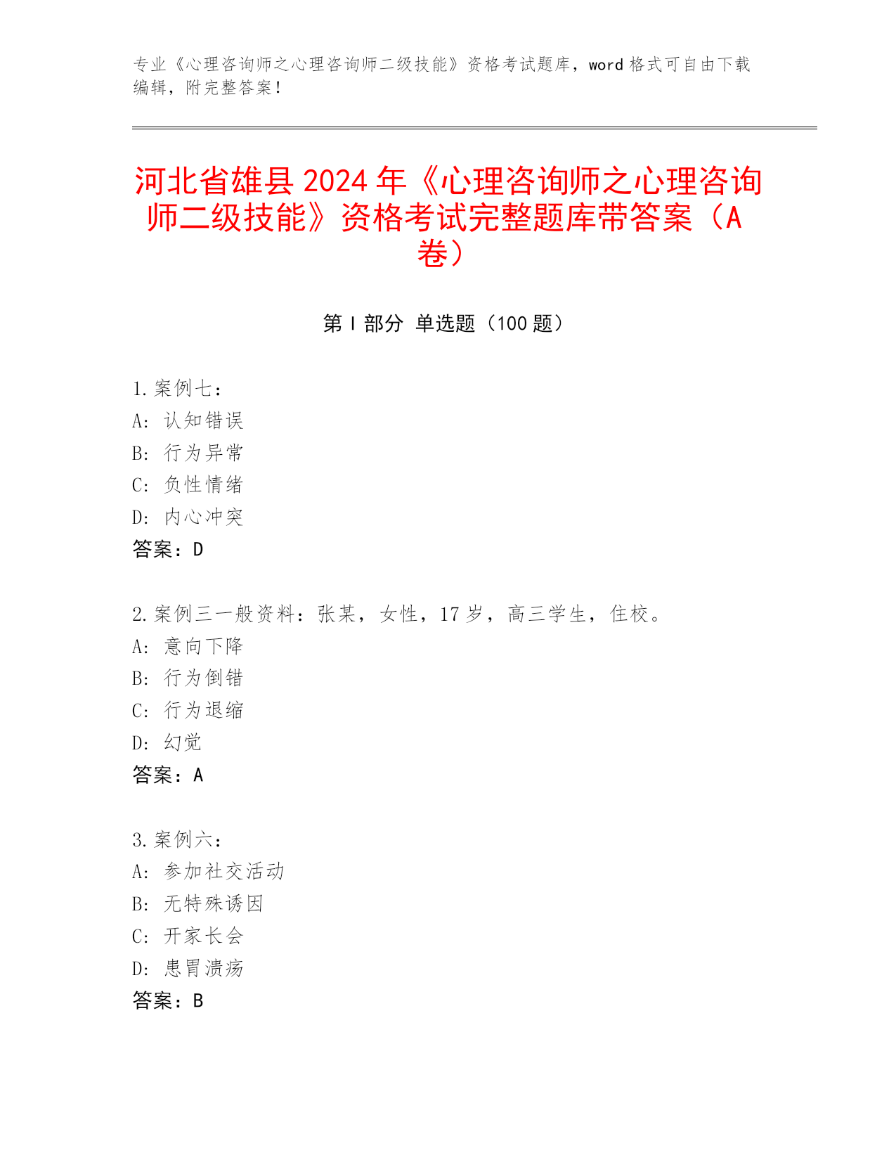 河北省雄县2024年《心理咨询师之心理咨询师二级技能》资格考试完整题库带答案(A卷)