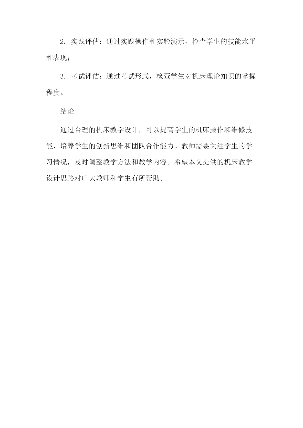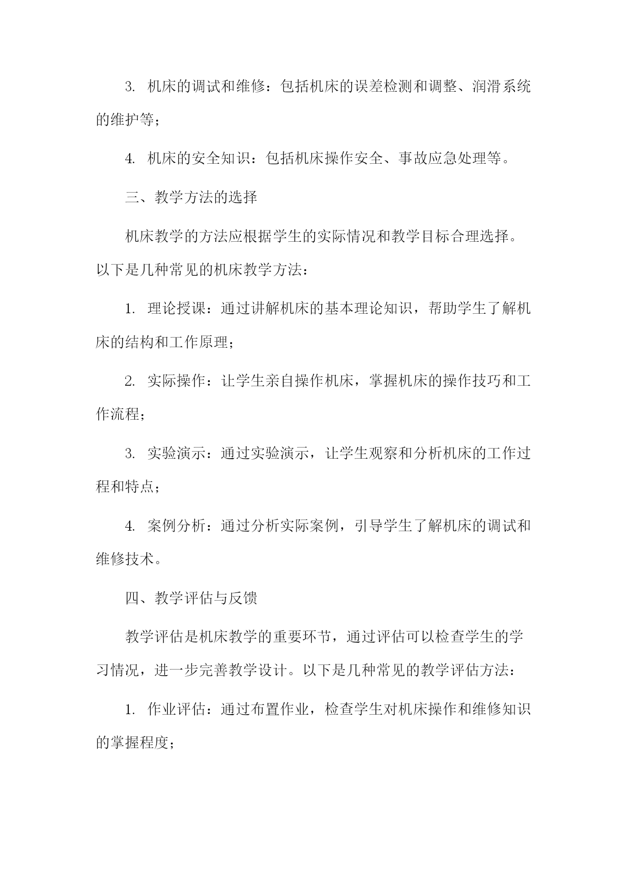 机床的教学设计引言机床作为一种高精度加工设备,在现代工业中起着重要的作用。随着制造业的发展,对机床操作和维护的需求日益增加。因此,如何设计一套有效的机床教学方案,成为了培养学生机床操作技能的关键问题。本文将探讨机床教学设计的一些关键要素和实施方法。一、教学目标的设定在开始机床教学设计之前,教师需要明确教学目标。机床教学的目标应该包括以下几个方面:1.学生掌握基本的机床操作技巧;2.学生了解机床的结构和工作原理;3.学生掌握机床的调试和维修技术;4.学生培养良好的安全意识和团队合作能力。二、教学内容的选择根据教学目标,教师需要合理选择适合的教学内容。机床教学的内容应包括以下几个方面:1.机床的基本知识:包括机床的分类、结构和工作原理等;2.机床的操作技巧:包括机床的开关操作、刀具更换、工件夹紧等;3.机床的调试和维修:包括机床的误差检测和调整、润滑系统的维护等;4.机床的安全知识:包括机床操作安全、事故应急处理等。三、教学方法的选择机床教学的方法应根据学生的实际情况和教学目标合理选择。以下是几种常见的机床教学方法:1.理论授课:通过讲解机床的基本理论知识,帮助学生了解机床的结构和工作原理;2.实际操作:让学生亲自操作机床,掌握机床的操作技巧和工作流程;3.实验演示:通过实验演示,让学生观察和分析机床的工作过程和特点;4.案例分析:通过分析实际案例,引导学生了解机床的调试和维修技术。四、教学评估与反馈教学评估是机床教学的重要环节,通过评估可以检查学生的学习情况,进一步完善教学设计。以下是几种常见的教学评估方法:1.作业评估:通过布置作业,检查学生对机床操作和维修知识的掌握程度;2.实践评估:通过实践操作和实验演示,检查学生的技能水平和表现;3.考试评估:通过考试形式,检查学生对机床理论知识的掌握程度。结论通过合理的机床教学设计,可以提高学生的机床操作和维修技能,培养学生的创新思维和团队合作能力。教师需要关注学生的学习情况,及时调整教学方法和教学内容。希望本文提供的机床教学设计思路对广大教师和学生有所帮助。