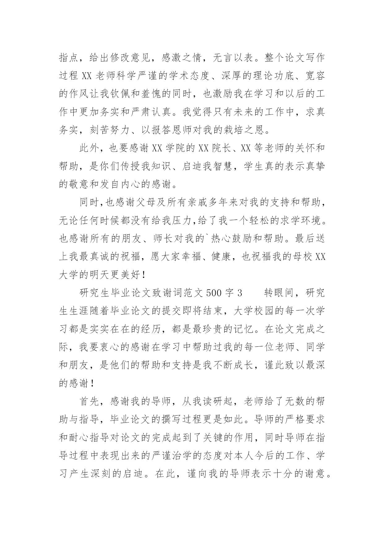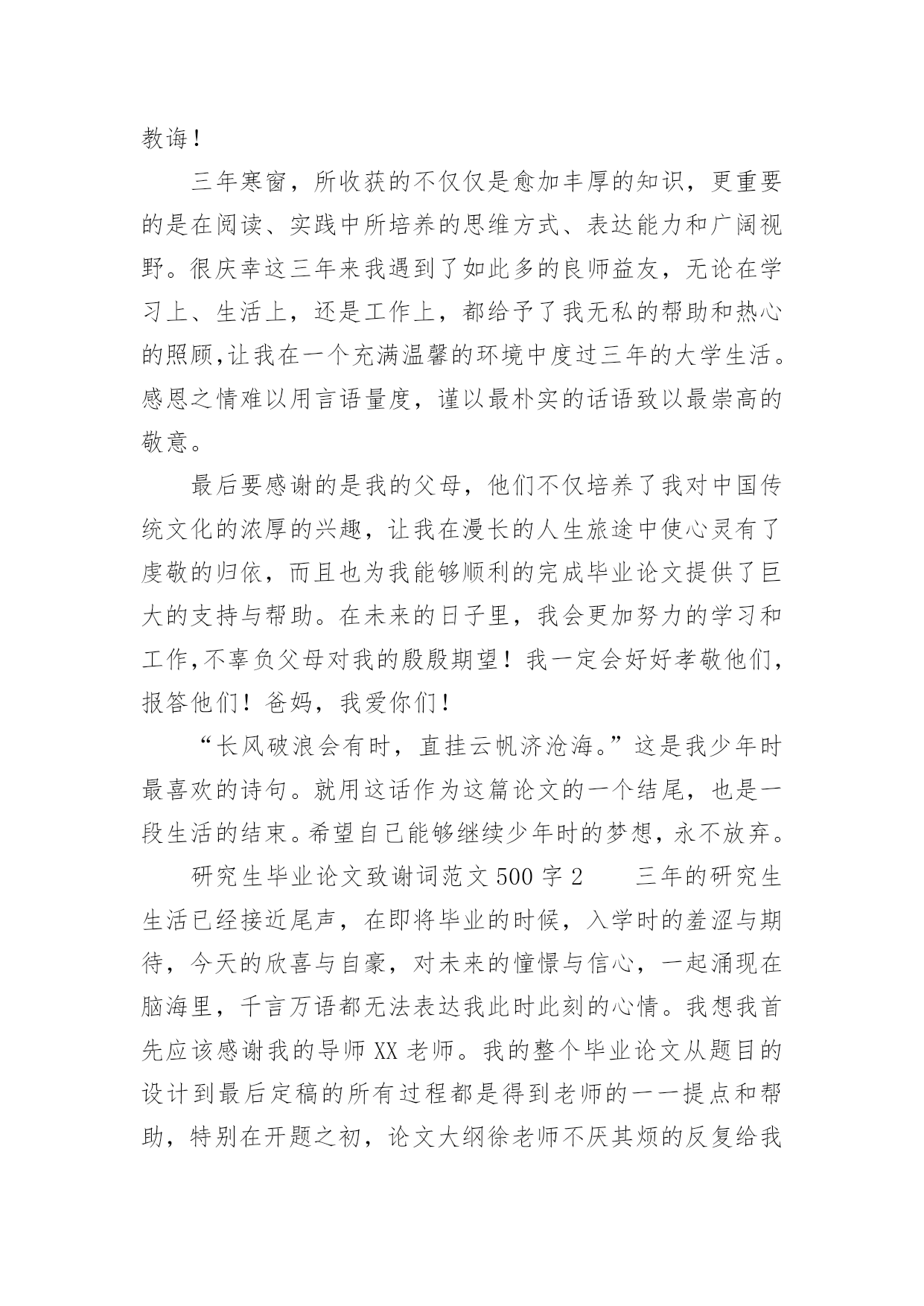 研究生毕业论文致谢词研究生毕业论文致谢词范文500字论文致谢词一般在实践报告、毕业论文的结尾处,主要作用是表示对导师等的感谢之词。下面是小编搜集整理的研究生毕业论文致谢词范文500字,欢迎阅读。研究生毕业论文致谢词范文500字1本论文在xxx导师的悉心指导下完成的。导师渊博的专业知识、严谨的治学态度,精益求精的工作作风,诲人不倦的高尚师德,严于律己、宽以待人的崇高风范,朴实无法、平易近人的人格魅力对本人影响深远。不仅使本人树立了远大的学习目标、掌握了基本的研究方法,还使本人明白了许多为人处事的道理。本次论文从选题到完成,每一步都是在导师的悉心指导下完成的,倾注了导师大量的心血。在此,谨向导师表示崇高的敬意和衷心的感谢!在写论文的过程中,遇到了很多的问题,在老师的耐心指导下,问题都得以解决。所以在此,再次对老师道一声:老师,谢谢您!时光匆匆如流水,转眼便是大学毕业时节,春梦秋云,聚散真容易。离校日期已日趋渐进,毕业论文的完成也随之进入了尾声。从开始进入课题到论文的顺利完成,一直都离不开老师、同学、朋友给我热情的帮助,在这里请接受我诚挚的谢意!在此我向xx学校xx专业的所有老师表示衷心的感谢,谢谢你们三年的辛勤栽培,谢谢你们在教学的同时更多的是传授我们做人的道理,谢谢三年里面你们孜孜不倦的教诲!三年寒窗,所收获的不仅仅是愈加丰厚的知识,更重要的是在阅读、实践中所培养的思维方式、表达能力和广阔视野。很庆幸这三年来我遇到了如此多的良师益友,无论在学习上、生活上,还是工作上,都给予了我无私的帮助和热心的照顾,让我在一个充满温馨的环境中度过三年的大学生活。感恩之情难以用言语量度,谨以最朴实的话语致以最崇高的敬意。最后要感谢的是我的父母,他们不仅培养了我对中国传统文化的浓厚的兴趣,让我在漫长的人生旅途中使心灵有了虔敬的归依,而且也为我能够顺利的完成毕业论文提供了巨大的支持与帮助。在未来的日子里,我会更加努力的学习和工作,不辜负父母对我的殷殷期望!我一定会好好孝敬他们,报答他们!爸妈,我爱你们!“长风破浪会有时,直挂云帆济沧海。”这是我少年时最喜欢的诗句。就用这话作为这篇论文的一个结尾,也是一段生活的结束。希望自己能够继续少年时的梦想,永不放弃。研究生毕业论文致谢词范文500字2三年的研究生生活已经接近尾声,在即将毕业的时候,入学时的羞涩与期待,今天的欣喜与自豪,对未来的憧憬与信心,一起涌现在脑海里,千言万语都无法表达我此时此刻的心情。我想我首先应该感谢我的导师XX老师。我的整个毕业论文从题目的设计到最后定稿的所有过程都是得到老师的一一提点和帮助,特别在开题之初,论文大纲徐老师不厌其烦的反复给我指点,给出修改意见,感激之情,无言以表。整个论文写作过程XX老师科学严谨的学术态度、深厚的理论功底、宽容的作风让我钦佩和羞愧的同时,也激励我在学习和以后的工作中更加务实和严肃认真。我觉得只有未来的工作中,求真务实,刻苦努力、以报答恩师对我的栽培之恩。此外,也要感谢XX学院的XX院长、XX等老师的关怀和帮助,是你们传授我知识、启迪我智慧,学生真的表示真挚的敬意和发自内心的感谢。同时,也感谢父母及所有亲戚多年来对我的支持和帮助,无论任何时候都没有给我压力,给了我一个轻松的求学环境。也感谢所有的朋友、师长对我的`热心鼓励和帮助。最后送上我最真诚的祝福,愿大家幸福、健康,也祝福我的母校XX大学的明天更美好!研究生毕业论文致谢词范文500字3转眼间,研究生生涯随着毕业论文的提交即将结束,大学校园的每一次学习都是实实在在的经历,都是最珍贵的记忆。在论文完成之际,我要衷心的感谢在学习中帮助过我的每一位老师、同学和朋友,是他们的帮助和支持是我不断成长,谨此致以最深的感谢!首先,感谢我的导师,从我读研起,老师给了无数的帮助与指导,毕业论文的撰写过程更是如此。导师的严格要求和耐心指导对论文的完成起到了关键的作用,同时导师在指导过程中表现出来的严谨治学的态度对本人今后的工作、学习产生深刻的启迪。在此,谨向我的导师表示十分的谢意。感谢研究生生活中遇到的所有老师,正是您们在学习上给予的指导与帮助,才使我不断克服学习中的疑惑与困难,在读研期间不断的丰富自己的知识,不断进步,与每位老师的相遇都将成为人生中一笔宝贵的财富。在此,对各位老师送上我最真挈的祝福! 感谢和我一起学习的同学,对我的陪伴和照顾,我们携手前行,共同进步,谢谢你们的出现让我觉得生命格外多彩!再华丽的辞藻也无法形容我此刻的快乐,再多的话语也无法表达对生命中每个人的感激之情,唯有在今后的生活中更加努力,做更好的自己!
