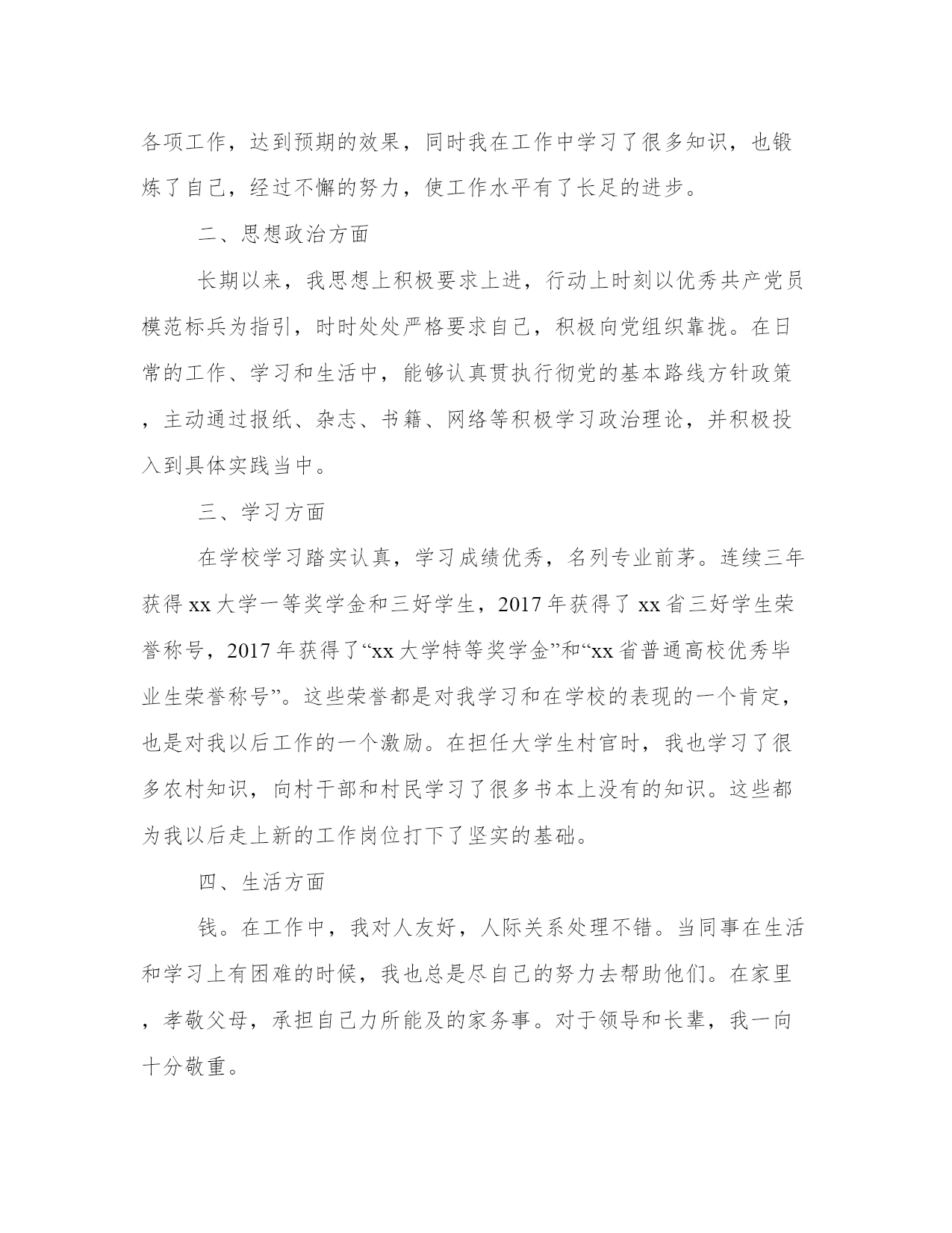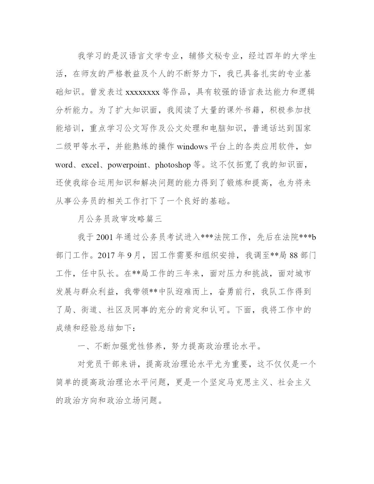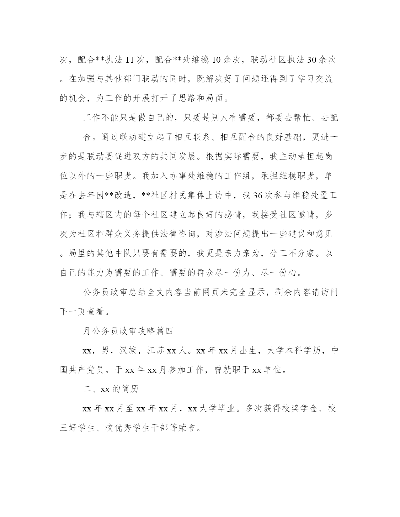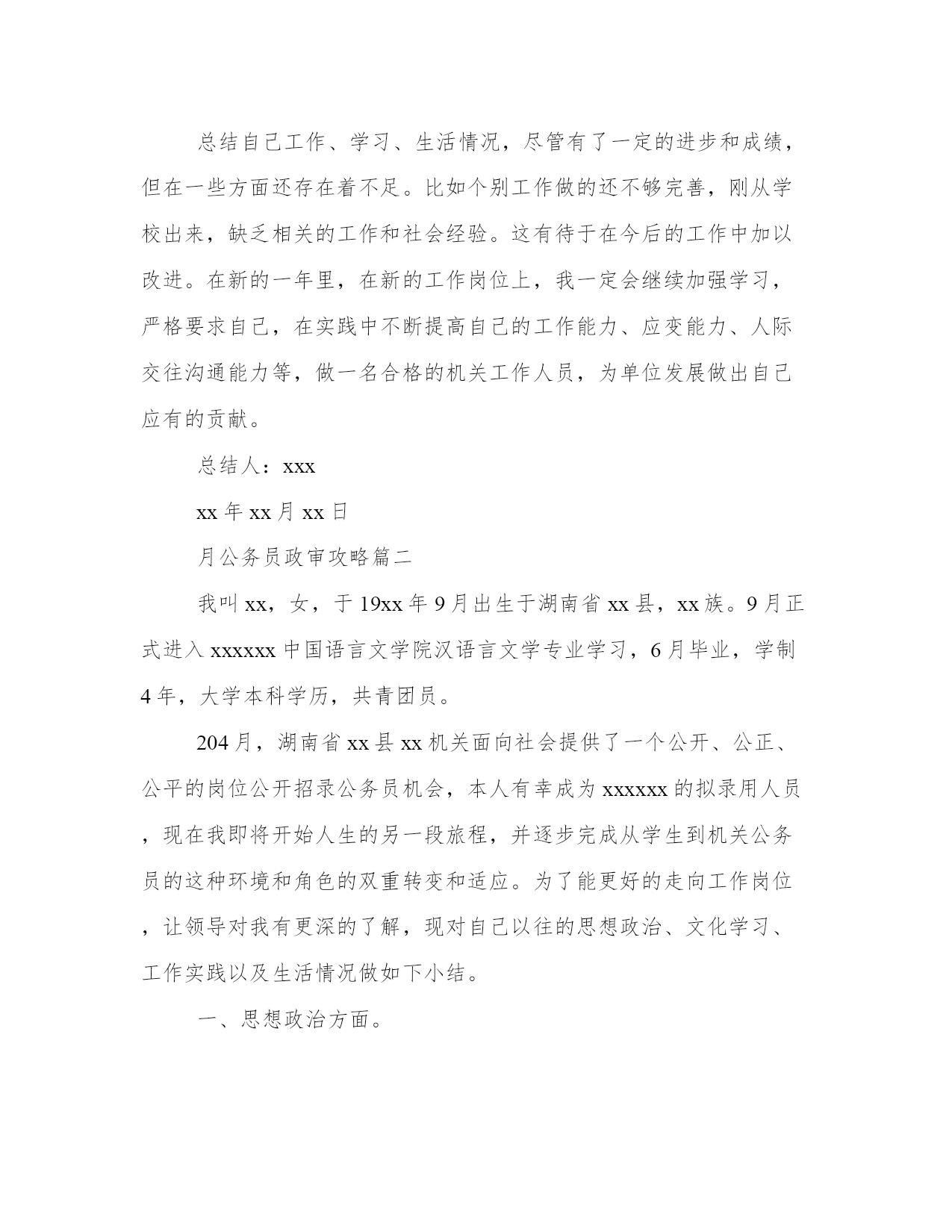 月公务员政审攻略范文(18篇)艺术是人类创造的美的形式,它能够传递情感,激发思考。如何使总结更富有启发性,引发他人对你的工作或学习的关注?接下来是一些经典总结范文的合集,希望可以帮助到正在写总结的你。月公务员政审攻略篇一我叫×××,男,于××年××月出生于×××省××市,汉族。××年××月考入××大学××学院××专业学习,于××年×月毕业,学制四年,大学本科学历,××职称、中共党员。毕业至今先后在××公司担任××等职务。2017年10月,××系统(单位)面向全社会提供了一个公开、公正、公平的岗位公开招录公务员机会,本人有幸以优异的成绩成为××系统(单位)拟录用人员,现在我即将开始人生的另一段旅程,并逐步完成从企业到机关公务员的这种环境和角色的双重转变和适应。为了能更好的走向工作岗位,让领导对我有更深的了解,现对自己以往的工作、思想、生活情况做如下小结。一、工作方面参加工作以来,我本着团结同志、顾全大局、作风严谨、虚心好学、积极向上的原则,充分发挥自己不怕麻烦,不怕吃苦、虚心请教、主动学习、自我摸索和实践相结合自身优势,在较短时间内便熟悉了本岗工作,明确了工作的程序和方向,提高了工作能力,在具体的工作中能形成一个较为清晰的工作思路,能够顺利的开展工作并熟练圆满地完成本职工作。工作质量成绩、效益和贡献普遍得到了领导和同事的好评。基本做到了事前有计划、事中有实施、事后又总结,有轻重主次地完成了领导及组织交办的各项工作,达到预期的效果,同时我在工作中学习了很多知识,也锻炼了自己,经过不懈的努力,使工作水平有了长足的进步,开创了工作的新局面,为联发及开发区的工作做出了自己应有的贡献。二、思想政治方面长期以来,我思想上积极要求上进,行动上时刻以优秀共产党员模范标兵为指引,时时处处严格要求自己,积极向党组织靠拢。在日常的工作、学习和生活中,能够认真贯执行彻党的基本路线方针政策,主动通过报纸、杂志、书籍、网络等积极学习政治理论,并积极投入到具体实践当中。工作以来,先后被评为公司优秀文明员工、优秀共产党员,2017年7月光荣地被评为系统优秀共产党员。三、生活方面在生活上,我严格要求自己,友好同事,尊敬领导和长辈,。多年来,我一直坚持自我检查和自我反省,生活上勤俭节约,不乱花一分钱。在单位和家庭,我总是友好对人,从不和同事及家人争吵打架。当同事在生活和学习上有困难的时候,我也总是尽自己的努力去帮助他们。对于领导和长辈,我一向十分敬重,因为他们传授了我知识并在我成长的历程中给了我指导和帮助。总结自己多年来的'工作、学习、生活情况,尽管有了一定的进步和成绩,但在一些方面还存在着不足。比如有创造性的工作思路还不是很多,个别工作做的还不够完善,这有待于在今后的工作中加以改进。在新的一年里,在新的工作岗位上,我一定要继续加强学习,严格要求自己,在实践中不断提高自己的工作能力、应变能力、人际交往沟通能力等,力争做一名合格的机关工作人员,为××系统(单位)的事业发展和壮大做出自己应有的贡献。总结人:××××××年××月××日我叫xxx,男,于xx年xx月出生于xx市xx县,x族。xx年xx月考入xx大学xx系xx专业学习,于xx年xx月毕业,学制四年,大学本科学历,中共党员。毕业至今在xx单位。2017年10月,xx系统面向全社会提供了一个公开、公正、公平的岗位公开招录公务员机会,本人有幸以优异的成绩成为xx单位拟录用人员,现在我即将开始人生的另一段旅程,并逐步完成从xx到机关公务员的这种环境和角色的双重转变和适应。为了能更好的走向工作岗位,让领导对我有更深的了解,现对自己以往的工作、思想、生活情况做如下小结。一、工作方面提高了工作能力,在具体的工作中能形成一个较为清晰的工作思路,能够顺利的开展工作并圆满地完成工作。基本做到了事前有计划、事中有实施、事后有总结,有轻重主次地完成了领导及组织交办的各项工作,达到预期的效果,同时我在工作中学习了很多知识,也锻炼了自己,经过不懈的努力,使工作水平有了长足的进步。二、思想政治方面长期以来,我思想上积极要求上进,行动上时刻以优秀共产党员模范标兵为指引,时时处处严格要求自己,积极向党组织靠拢。在日常的工作、学习和生活中,能够认真贯执行彻党的基本路线方针政策,主动通过报纸、杂志、书籍、网络等积极学习政治理论,并积极投入到具体实践当中。三、学习方面在学校学习踏实认真,学习成绩优秀,名列专业前茅。连续三年获得xx大学一等奖学金和三好学生,2017年获得了xx省三好学生荣誉称号,2017年获得了“xx大学特等奖学金”和“xx省普通高校优秀毕业生荣誉称号”。这些荣誉都是对我学习和在学校的表现的一个肯定,也是对我以后工作的一个激励。在担任大学生村官时,我也学习了很多农村知识,向村干部和村民学习了