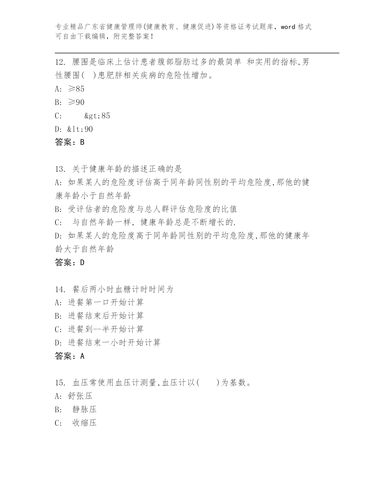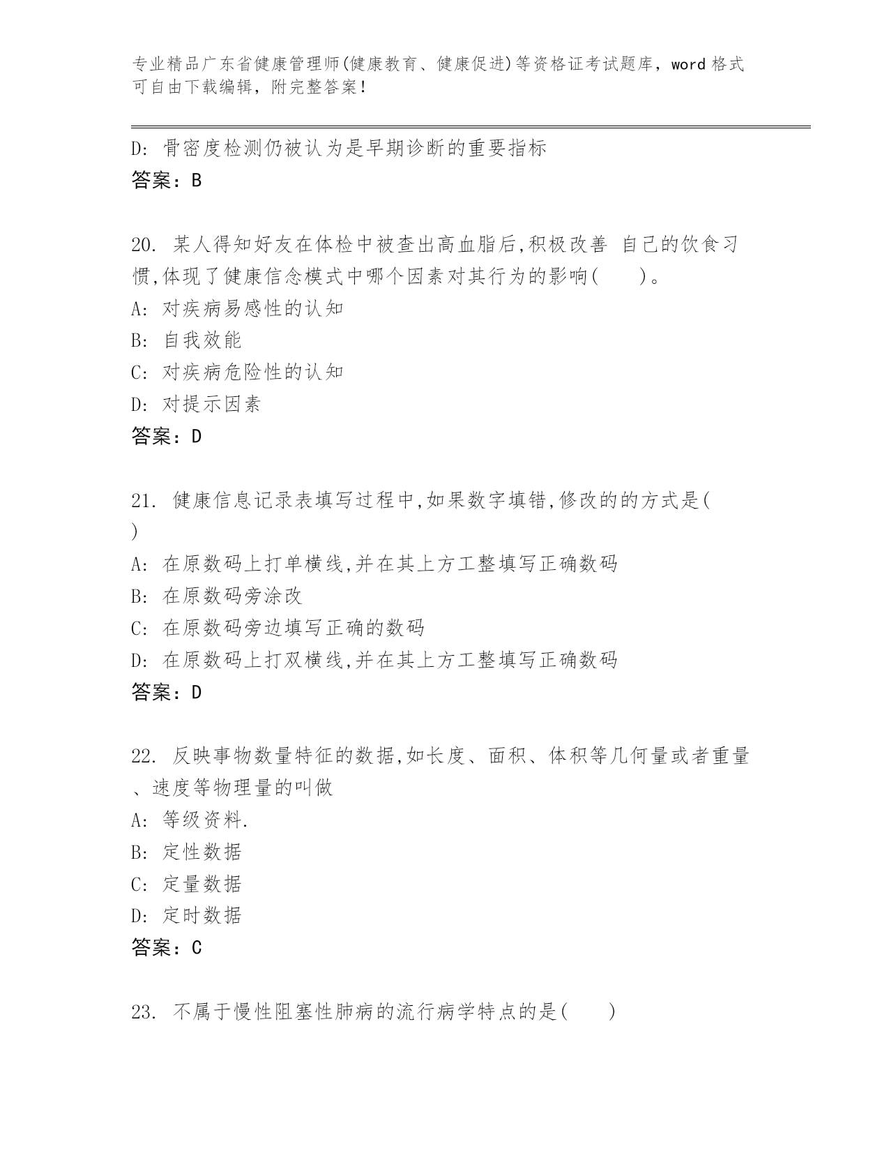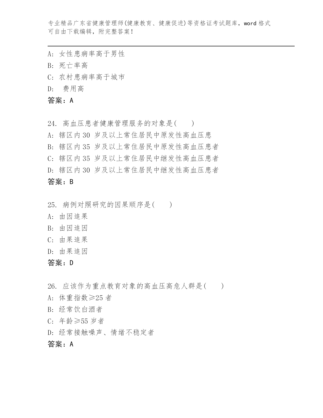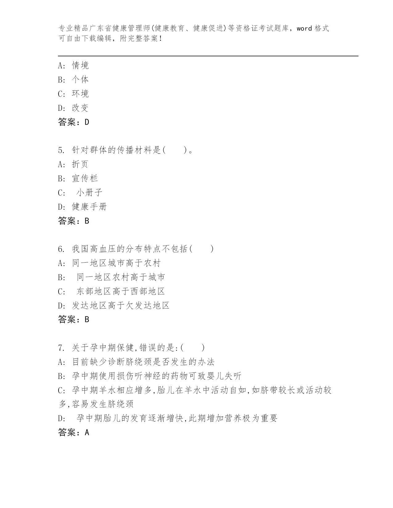 专业精品广东省健康管理师(健康教育、健康促进)等资格证考试题库,word格式可自由下载编辑,附完整答案!精品广东省健康管理师(健康教育、健康促进)等资格证考试精选题库【黄金题型】第I部分单选题(50题)1.降低烟草的价格对吸烟行为来讲是一种()A:促成因素B:强化因素C:倾向因素D:抑制因素答案:A2.关于前列腺特异性抗原(PSA)的说法不正确的是()。A:前列腺增生也会引起PSA升高B:PSA不是前列腺瘾的特异性抗原C:PSA是一种来源于男性前列腺细胞的蛋白质D:PSA水平过高,可作为前列腺癌诊断的依据答案:D3.健康管理的基本策略和重要方法是()A:传染病干预B:心理干预C:体重管理D:生活方式管理与指导答案:D4.社会适应的中心环节是A:情境B:个体C:环境D:改变答案:D5.针对群体的传播材料是()。A:折页B:宣传栏C:小册子D:健康手册答案:B6.我国高血压的分布特点不包括()A:同一地区城市高于农村B:同一地区农村高于城市C:东部地区高于西部地区D:发达地区高于欠发达地区答案:B7.关于孕中期保健,错误的是:()A:目前缺少诊断脐绕颈是否发生的办法B:孕中期使用损伤听神经的药物可致婴儿失听C:孕中期羊水相应增多,胎儿在羊水中活动自如,如脐带较长或活动较多,容易发生脐绕颈D:孕中期胎儿的发育逐渐增快,此期增加营养极为重要答案:A8.下列关于健康教育与健康促进计划评价的叙述,不正确的是()A:评价将客观实际与目标进行比较的过程B:评价通常在项目的总结阶段进行C:评价可保证计划执行的质量D:评价的方法之一是建立监测系统答案:D9.以下哪项不是城乡人群的前四位主要死亡原因()A:恶性肿瘤B:传染病C:心脏病D:脑血管病答案:B10.关于血压的说法错误的是()。A:正常人冬天血压比夏天高B:家庭血压值一般低于诊室血压值C:女性在更年期前动脉血压比同龄男性高D:血压计以大气压为基数答案:C11.检前流程设计不包括()A:检前注意事项的告知B:检前进行教育C:受检者对体检中心的了解D:对受检者体检需求的了解答案:B12.腰围是临床上估计患者腹部脂肪过多的最简单和实用的指标,男性腰围()患肥胖相关疾病的危险性增加。A:≥85B:≥90C:>85D:<90答案:B13.关于健康年龄的描述正确的是A:如果某人的危险度评估高于同年龄同性别的平均危险度,那他的健康年龄小于自然年龄B:受评估者的危险度与总人群评估危险度的比值C:与自然年龄一样,健康年龄总是不断增长的.D:如果某人的危险度高于同年龄同性别的平均危险度,那他的健康年龄大于自然年龄答案:D14.餐后两小时血糖计时时间为A:进餐第一口开始计算B:进餐结束后开始计算C:进餐到--半开始计算D:进餐结束一小时开始计算答案:A15.血压常使用血压计测量,血压计以()为基数。A:舒张压B:静脉压C:收缩压D:大气压答案:D16.不属于动态风险的是()A:新技术普及带来的医疗费用上涨B:雷电、风暴事件造成的危害C:治安恶化带来的投资减少D:药物不良反应引起的健康损失答案:B17.下列不属于中国老年人膳食指南建议的是(A:蔬果摄入充足;选发酵豆制品B:延缓肌肉衰减;维持适宜体重C:少量多餐细软:预防营养缺乏病D:主动足量饮水;积极户外活动答案:A18.健康传播的出发点是什么()A:治疗疾病B:促进人人健康C:改变行为D:提高社会效益答案:B19.关于骨质疏松症,以下错误的是A:是一种全身性、代谢性骨骼系统疾病B:高危人群是绝经后女性和40岁以上男性C:、特征是骨组织骨量低,骨骼微结构退化伴骨脆性增加D:骨密度检测仍被认为是早期诊断的重要指标答案:B20.某人得知好友在体检中被查出高血脂后,积极改善自己的饮食习惯,体现了健康信念模式中哪个因素对其行为的影响()。A:对疾病易感性的认知B:自我效能C:对疾病危险性的认知D:对提示因素答案:D21.健康信息记录表填写过程中,如果数字填错,修改的的方式是()A:在原数码上打单横线,并在其上方工整填写正确数码B:在原数码旁涂改C:在原数码旁边填写正确的数码D:在原数码上打双横线,并在其上方工整填写正确数码答案:D22.反映事物数量特征的数据,如长度、面积、体积等几何量或者重量、速度等物理量的叫做A:等级资料.B:定性数据C:定量数据D:定时数据答案:C23.不属于慢性阻塞性肺病的流行病学特点的是()A:女性患病率高于男