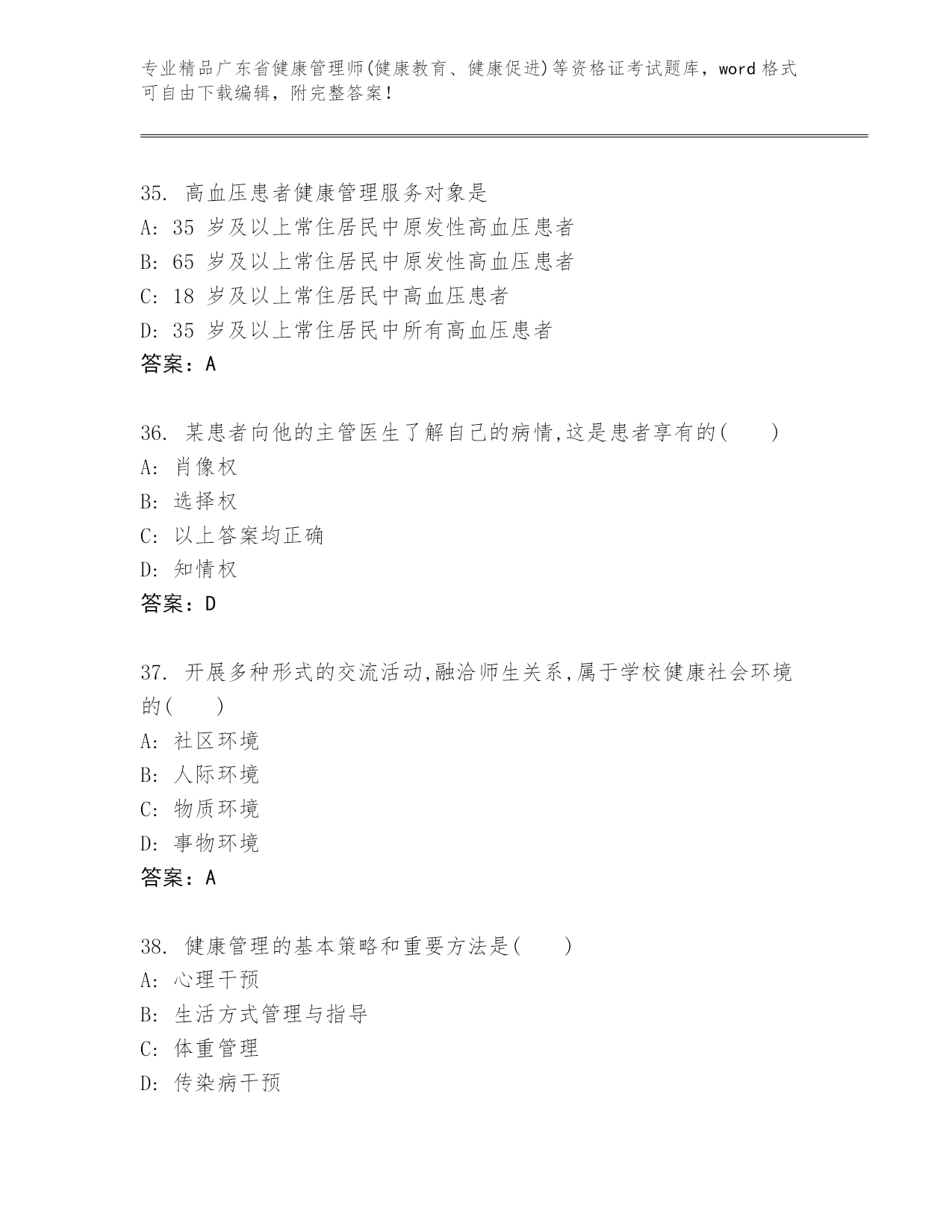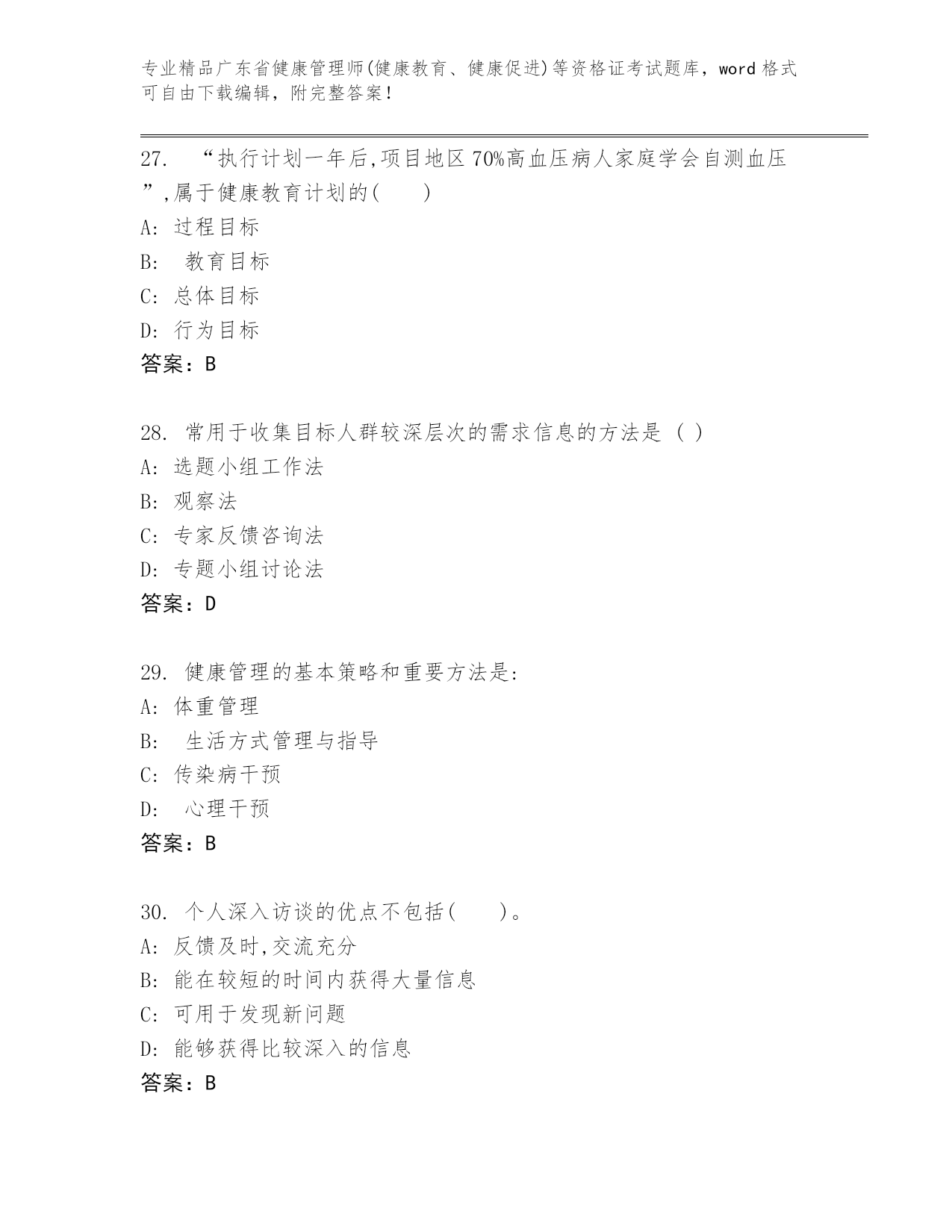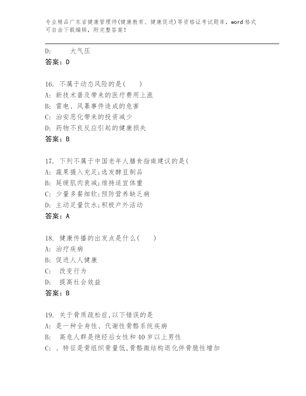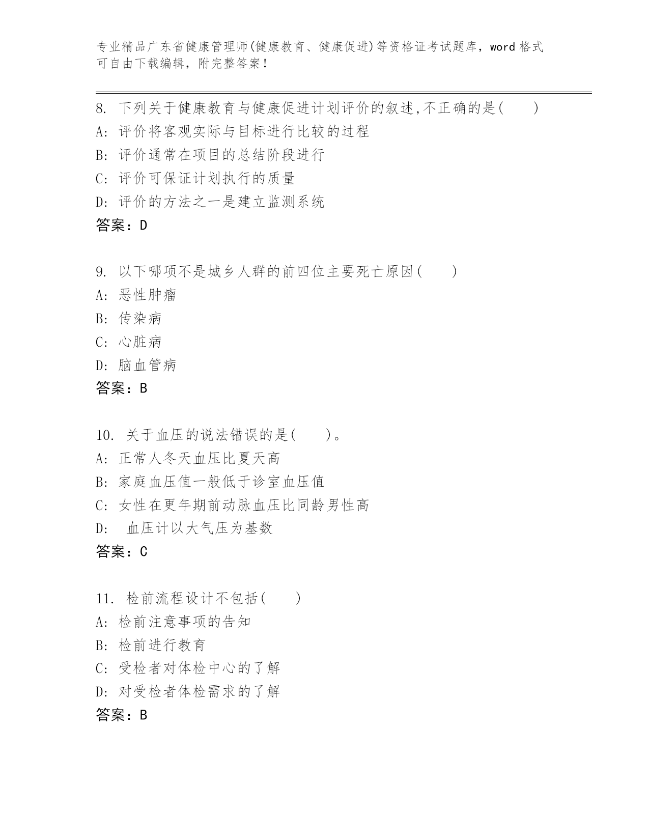 专业精品广东省健康管理师(健康教育、健康促进)等资格证考试题库,word格式可自由下载编辑,附完整答案!精品广东省健康管理师(健康教育、健康促进)等资格证考试精选题库【黄金题型】第I部分单选题(50题)1.降低烟草的价格对吸烟行为来讲是一种()A:促成因素B:强化因素C:倾向因素D:抑制因素答案:A2.关于前列腺特异性抗原(PSA)的说法不正确的是()。A:前列腺增生也会引起PSA升高B:PSA不是前列腺瘾的特异性抗原C:PSA是一种来源于男性前列腺细胞的蛋白质D:PSA水平过高,可作为前列腺癌诊断的依据答案:D3.健康管理的基本策略和重要方法是()A:传染病干预B:心理干预C:体重管理D:生活方式管理与指导答案:D4.社会适应的中心环节是A:情境B:个体C:环境D:改变答案:D5.针对群体的传播材料是()。A:折页B:宣传栏C:小册子D:健康手册答案:B6.我国高血压的分布特点不包括()A:同一地区城市高于农村B:同一地区农村高于城市C:东部地区高于西部地区D:发达地区高于欠发达地区答案:B7.关于孕中期保健,错误的是:()A:目前缺少诊断脐绕颈是否发生的办法B:孕中期使用损伤听神经的药物可致婴儿失听C:孕中期羊水相应增多,胎儿在羊水中活动自如,如脐带较长或活动较多,容易发生脐绕颈D:孕中期胎儿的发育逐渐增快,此期增加营养极为重要答案:A8.下列关于健康教育与健康促进计划评价的叙述,不正确的是()A:评价将客观实际与目标进行比较的过程B:评价通常在项目的总结阶段进行C:评价可保证计划执行的质量D:评价的方法之一是建立监测系统答案:D9.以下哪项不是城乡人群的前四位主要死亡原因()A:恶性肿瘤B:传染病C:心脏病D:脑血管病答案:B10.关于血压的说法错误的是()。A:正常人冬天血压比夏天高B:家庭血压值一般低于诊室血压值C:女性在更年期前动脉血压比同龄男性高D:血压计以大气压为基数答案:C11.检前流程设计不包括()A:检前注意事项的告知B:检前进行教育C:受检者对体检中心的了解D:对受检者体检需求的了解答案:B12.腰围是临床上估计患者腹部脂肪过多的最简单和实用的指标,男性腰围()患肥胖相关疾病的危险性增加。A:≥85B:≥90C:>85D:<90答案:B13.关于健康年龄的描述正确的是A:如果某人的危险度评估高于同年龄同性别的平均危险度,那他的健康年龄小于自然年龄B:受评估者的危险度与总人群评估危险度的比值C:与自然年龄一样,健康年龄总是不断增长的.D:如果某人的危险度高于同年龄同性别的平均危险度,那他的健康年龄大于自然年龄答案:D14.餐后两小时血糖计时时间为A:进餐第一口开始计算B:进餐结束后开始计算C:进餐到--半开始计算D:进餐结束一小时开始计算答案:A15.血压常使用血压计测量,血压计以()为基数。A:舒张压B:静脉压C:收缩压D:大气压答案:D16.不属于动态风险的是()A:新技术普及带来的医疗费用上涨B:雷电、风暴事件造成的危害C:治安恶化带来的投资减少D:药物不良反应引起的健康损失答案:B17.下列不属于中国老年人膳食指南建议的是(A:蔬果摄入充足;选发酵豆制品B:延缓肌肉衰减;维持适宜体重C:少量多餐细软:预防营养缺乏病D:主动足量饮水;积极户外活动答案:A18.健康传播的出发点是什么()A:治疗疾病B:促进人人健康C:改变行为D:提高社会效益答案:B19.关于骨质疏松症,以下错误的是A:是一种全身性、代谢性骨骼系统疾病B:高危人群是绝经后女性和40岁以上男性C:、特征是骨组织骨量低,骨骼微结构退化伴骨脆性增加D:骨密度检测仍被认为是早期诊断的重要指标答案:B20.某人得知好友在体检中被查出高血脂后,积极改善自己的饮食习惯,体现了健康信念模式中哪个因素对其行为的影响()。A:对疾病易感性的认知B:自我效能C:对疾病危险性的认知D:对提示因素答案:D21.健康信息记录表填写过程中,如果数字填错,修改的的方式是()A:在原数码上打单横线,并在其上方工整填写正确数码B:在原数码旁涂改C:在原数码旁边填写正确的数码D:在原数码上打双横线,并在其上方工整填写正确数码答案:D22.反映事物数量特征的数据,如长度、面积、体积等几何量或者重量、速度等物理量的叫做A:等级资料.B:定性数据C:定量数据D:定时数据答案:C23.不属于慢性阻塞性肺病的流行病学特点的是()A:女性患病率高于男