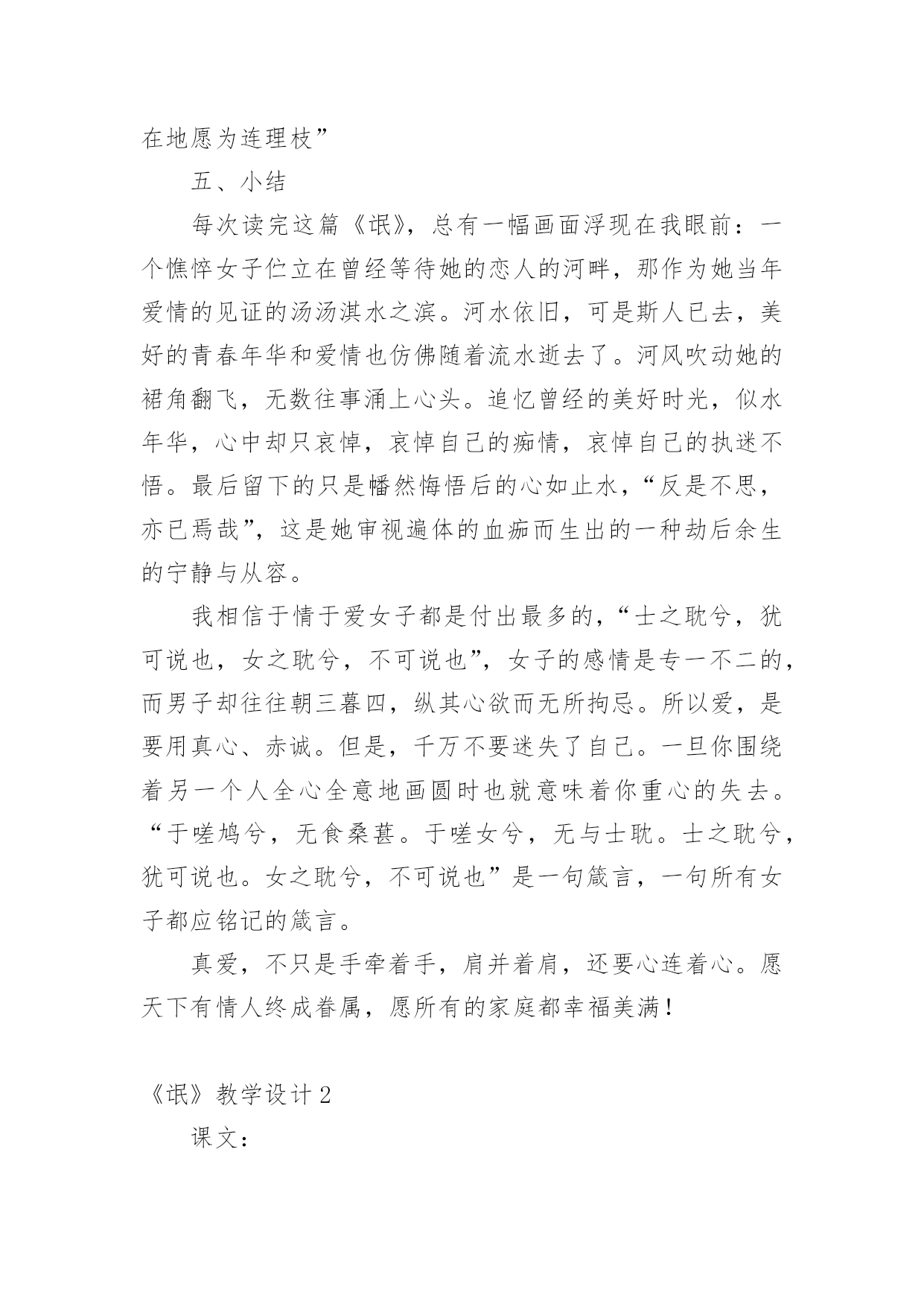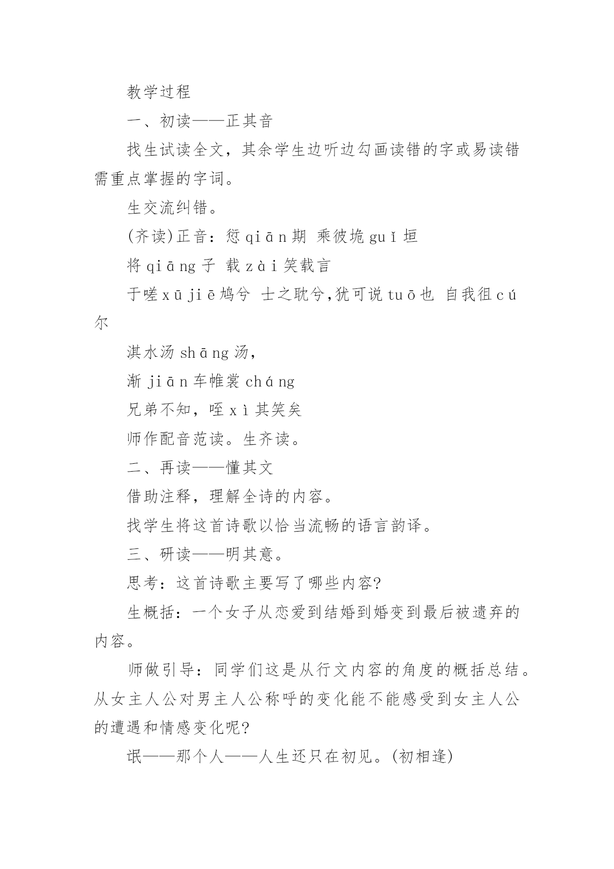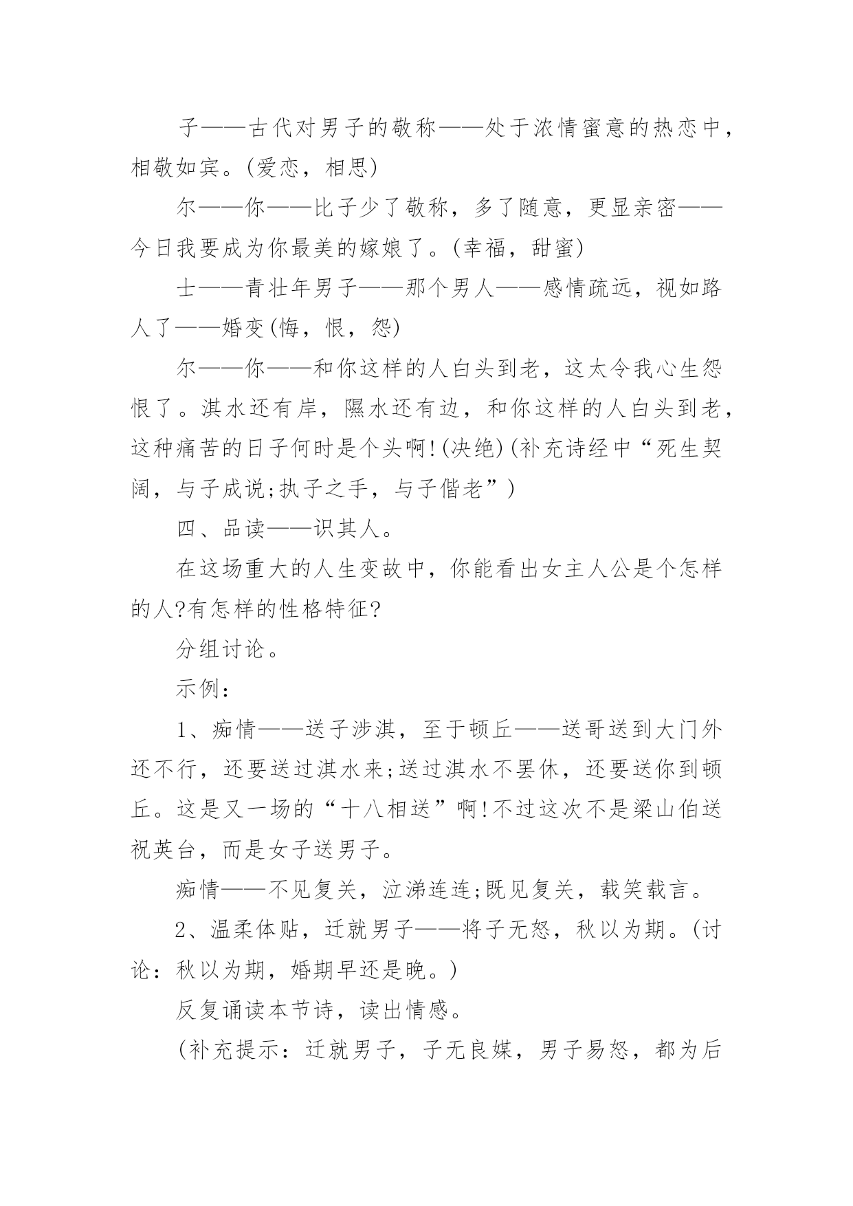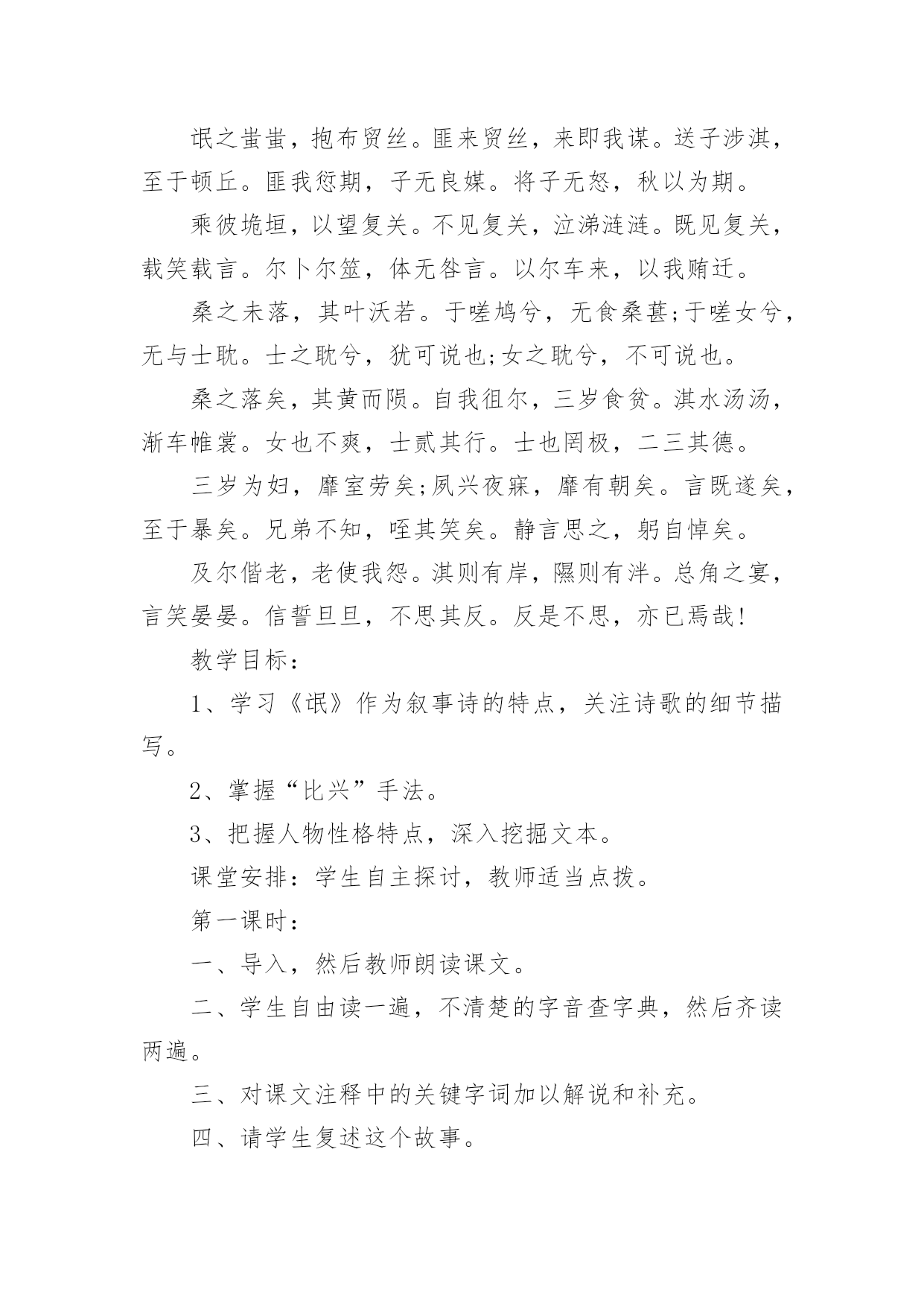 《氓》教学设计作为一位无私奉献的人民教师,就有可能用到教学设计,教学设计是一个系统化规划教学系统的过程。一份好的教学设计是什么样子的呢?下面是小编帮大家整理的《氓》教学设计,仅供参考,希望能够帮助到大家。《氓》教学设计1【教学目标】1、朗读课文,熟悉情节故事2、初步培养鉴赏作品中个性鲜明的人物形象的能力。3、深刻体会造成男女主人公爱情悲剧的根源。4、使学生了解中国古代人民对真挚爱情的向往,陶冶高尚情操,树立正确积极的爱情观。【教学重点】目标2、3【教学方法】自主合作探究【课时安排】1课时【教学设计】一、导入播放陕北民歌《老祖宗留下个人爱人》。问:同学们好听吗?……这首歌是什么类型的?……同学们现在正是青春年少,憧憬向往爱情吗?……古人云:哪个少男不钟情,哪个少女不怀春。爱情是人类特有的感情,她是一个古老而又永恒的话题,不仅陕北劳动人民唱出了爱情的甜蜜、幸福,早在两千多年前,也发生了一个爱情故事,是什么呢?二、朗读课文,熟悉故事情节思考:这首诗为我们叙述了一个怎样的爱情故事?提示:围绕情节或情感变化明确:恋爱婚变决绝三、合作交流1、这首诗为我们塑造了两个怎样的人物形象?恋爱甜蜜蜜,决绝伤不起,不要再来伤害我,初为人妇时怎样的辗转辛劳,只为维护曾经的梦想,为维护自己的爱情。可是多少年的辛劳和憧憬,换来的却是爱人的离弃。温柔似水,刚强如火。2、你认为造成男女主人公爱情悲剧的原因是什么?提示:社会、个人教师拓展到刘兰芝、祥林嫂*刘兰芝与焦母的抗争,与兄长的抗争,最后以死抗争,短暂的生命虽然结束了,但她对人格、尊严的'最求是至死不渝的,她的这种精神给我们的不是颓废、绝望,而是一种振奋和昂扬,崇高和伟大。*祥林嫂守寡不成,守家不成,守命不成,一出善良被毁灭的人间悲剧,承载着浓厚的民族时代精神与文化特征的文学名著。四、讨论如果你是氓的话,你会怎样对待诗中的女子?播放《天仙配》“树上的鸟儿成双对”“在天愿作比翼鸟,在地愿为连理枝”五、小结每次读完这篇《氓》,总有一幅画面浮现在我眼前:一个憔悴女子伫立在曾经等待她的恋人的河畔,那作为她当年爱情的见证的汤汤淇水之滨。河水依旧,可是斯人已去,美好的青春年华和爱情也仿佛随着流水逝去了。河风吹动她的裙角翻飞,无数往事涌上心头。追忆曾经的美好时光,似水年华,心中却只哀悼,哀悼自己的痴情,哀悼自己的执迷不悟。最后留下的只是幡然悔悟后的心如止水,“反是不思,亦已焉哉”,这是她审视遍体的血痂而生出的一种劫后余生的宁静与从容。我相信于情于爱女子都是付出最多的,“士之耽兮,犹可说也,女之耽兮,不可说也”,女子的感情是专一不二的,而男子却往往朝三暮四,纵其心欲而无所拘忌。所以爱,是要用真心、赤诚。但是,千万不要迷失了自己。一旦你围绕着另一个人全心全意地画圆时也就意味着你重心的失去。“于嗟鸠兮,无食桑葚。于嗟女兮,无与士耽。士之耽兮,犹可说也。女之耽兮,不可说也”是一句箴言,一句所有女子都应铭记的箴言。真爱,不只是手牵着手,肩并着肩,还要心连着心。愿天下有情人终成眷属,愿所有的家庭都幸福美满!《氓》教学设计2课文:氓之蚩蚩,抱布贸丝。匪来贸丝,来即我谋。送子涉淇,至于顿丘。匪我愆期,子无良媒。将子无怒,秋以为期。乘彼垝垣,以望复关。不见复关,泣涕涟涟。既见复关,载笑载言。尔卜尔筮,体无咎言。以尔车来,以我贿迁。桑之未落,其叶沃若。于嗟鸠兮,无食桑葚;于嗟女兮,无与士耽。士之耽兮,犹可说也;女之耽兮,不可说也。桑之落矣,其黄而陨。自我徂尔,三岁食贫。淇水汤汤,渐车帷裳。女也不爽,士贰其行。士也罔极,二三其德。三岁为妇,靡室劳矣;夙兴夜寐,靡有朝矣。言既遂矣,至于暴矣。兄弟不知,咥其笑矣。静言思之,躬自悼矣。及尔偕老,老使我怨。淇则有岸,隰则有泮。总角之宴,言笑晏晏。信誓旦旦,不思其反。反是不思,亦已焉哉!教学目标:1、学习《氓》作为叙事诗的特点,关注诗歌的细节描写。2、掌握“比兴”手法。3、把握人物性格特点,深入挖掘文本。课堂安排:学生自主探讨,教师适当点拨。第一课时:一、导入,然后教师朗读课文。二、学生自由读一遍,不清楚的字音查字典,然后齐读两遍。三、对课文注释中的关键字词加以解说和补充。四、请学生复述这个故事。五、这是一首叙事诗,诗歌总共六个章节。设问:1、能否删去诗歌第三第四节?这两节记叙很少更多的是抒情和议论。删去这两节对于故事情节的完整性并没有影响,但会使女子的形象没有那么丰满,削弱氓和女子性格特点。(第三节写了女子从切身体验中认识到了当时男女不平等的地位,告诫年轻姑娘吸取教训。第四节是女子痛斥氓的负心行为。)2、能否将诗歌的第三第四节调换到其它位置?不可。此处用了“比兴”手法①在叙事中插入比兴句,使叙事暂时中断,这样就避免了叙事的平铺直叙;②所插入的比兴句在内容上又起了暗示作用,读者能从中意识到女子的婚后