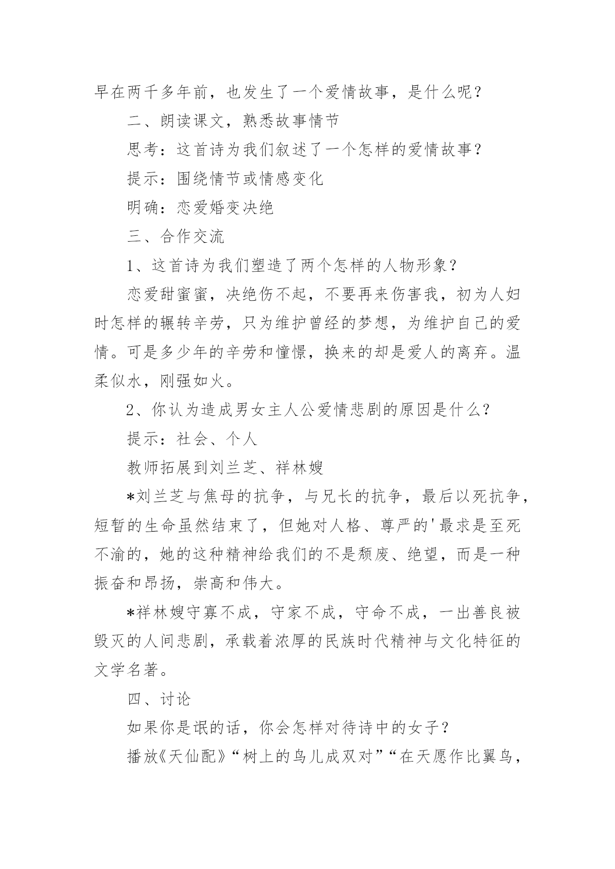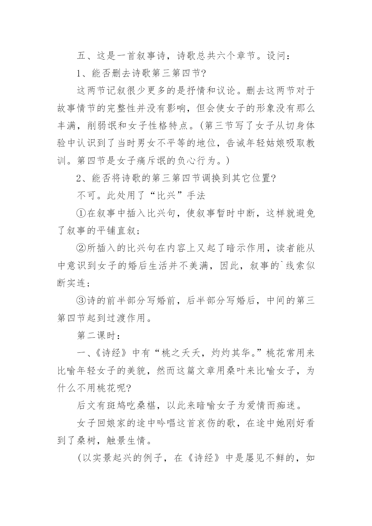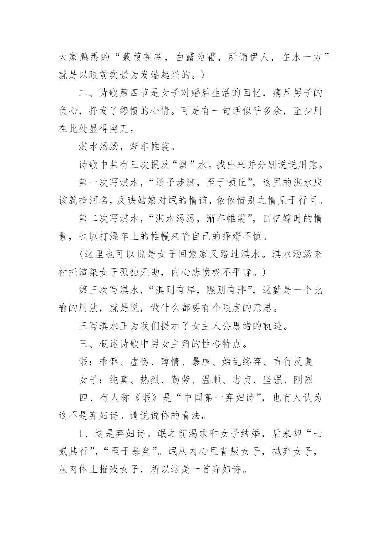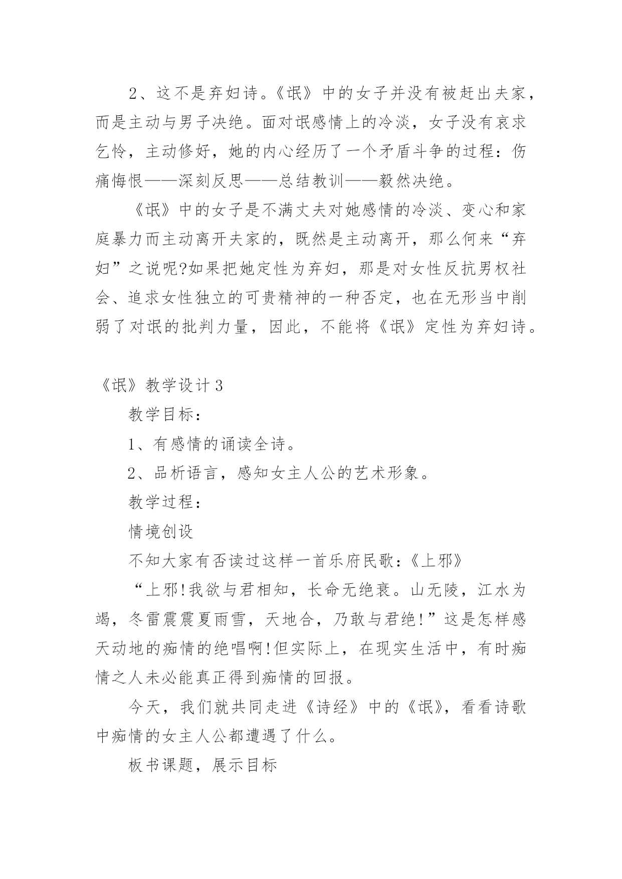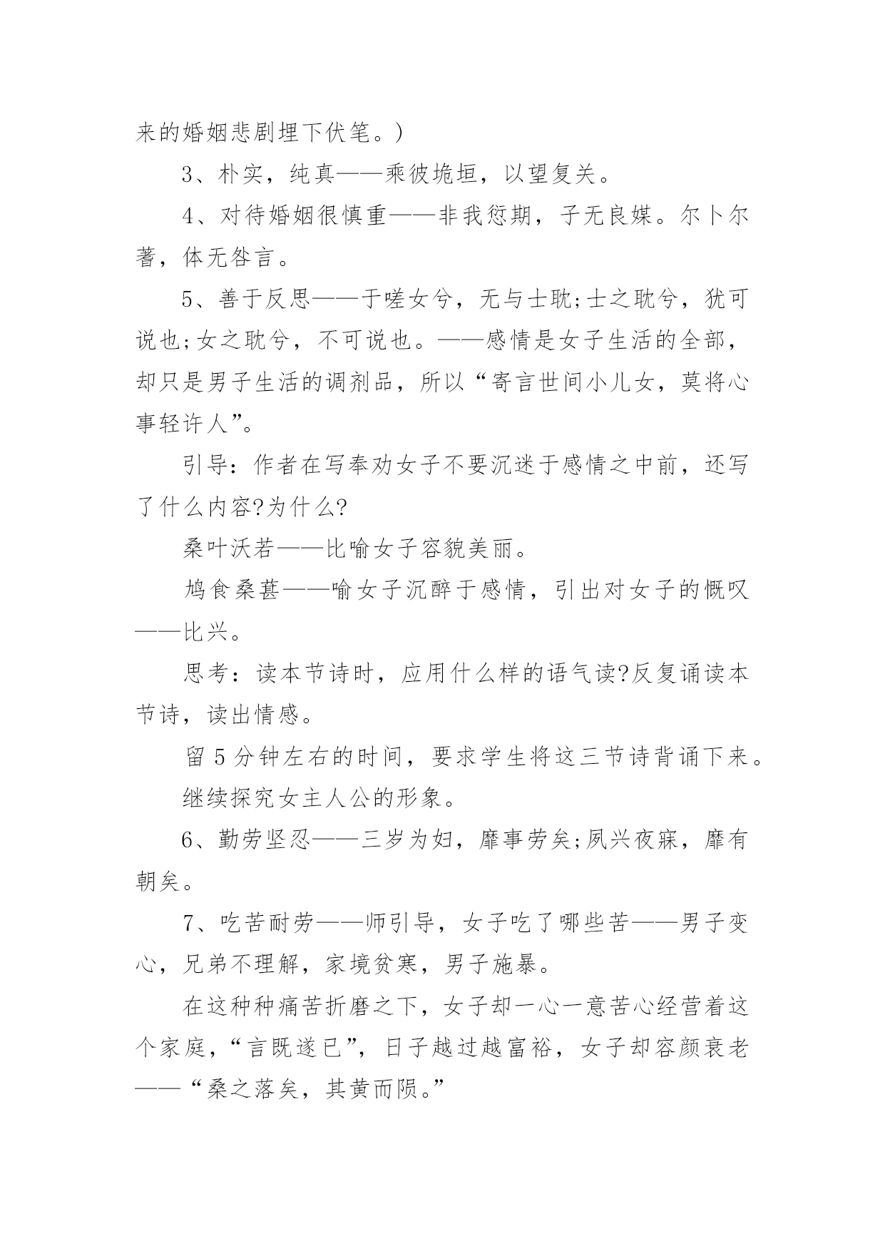 《氓》教学设计作为一位无私奉献的人民教师,就有可能用到教学设计,教学设计是一个系统化规划教学系统的过程。一份好的教学设计是什么样子的呢?下面是小编帮大家整理的《氓》教学设计,仅供参考,希望能够帮助到大家。《氓》教学设计1【教学目标】1、朗读课文,熟悉情节故事2、初步培养鉴赏作品中个性鲜明的人物形象的能力。3、深刻体会造成男女主人公爱情悲剧的根源。4、使学生了解中国古代人民对真挚爱情的向往,陶冶高尚情操,树立正确积极的爱情观。【教学重点】目标2、3【教学方法】自主合作探究【课时安排】1课时【教学设计】一、导入播放陕北民歌《老祖宗留下个人爱人》。问:同学们好听吗?……这首歌是什么类型的?……同学们现在正是青春年少,憧憬向往爱情吗?……古人云:哪个少男不钟情,哪个少女不怀春。爱情是人类特有的感情,她是一个古老而又永恒的话题,不仅陕北劳动人民唱出了爱情的甜蜜、幸福,早在两千多年前,也发生了一个爱情故事,是什么呢?二、朗读课文,熟悉故事情节思考:这首诗为我们叙述了一个怎样的爱情故事?提示:围绕情节或情感变化明确:恋爱婚变决绝三、合作交流1、这首诗为我们塑造了两个怎样的人物形象?恋爱甜蜜蜜,决绝伤不起,不要再来伤害我,初为人妇时怎样的辗转辛劳,只为维护曾经的梦想,为维护自己的爱情。可是多少年的辛劳和憧憬,换来的却是爱人的离弃。温柔似水,刚强如火。2、你认为造成男女主人公爱情悲剧的原因是什么?提示:社会、个人教师拓展到刘兰芝、祥林嫂*刘兰芝与焦母的抗争,与兄长的抗争,最后以死抗争,短暂的生命虽然结束了,但她对人格、尊严的'最求是至死不渝的,她的这种精神给我们的不是颓废、绝望,而是一种振奋和昂扬,崇高和伟大。*祥林嫂守寡不成,守家不成,守命不成,一出善良被毁灭的人间悲剧,承载着浓厚的民族时代精神与文化特征的文学名著。四、讨论如果你是氓的话,你会怎样对待诗中的女子?播放《天仙配》“树上的鸟儿成双对”“在天愿作比翼鸟,在地愿为连理枝”五、小结每次读完这篇《氓》,总有一幅画面浮现在我眼前:一个憔悴女子伫立在曾经等待她的恋人的河畔,那作为她当年爱情的见证的汤汤淇水之滨。河水依旧,可是斯人已去,美好的青春年华和爱情也仿佛随着流水逝去了。河风吹动她的裙角翻飞,无数往事涌上心头。追忆曾经的美好时光,似水年华,心中却只哀悼,哀悼自己的痴情,哀悼自己的执迷不悟。最后留下的只是幡然悔悟后的心如止水,“反是不思,亦已焉哉”,这是她审视遍体的血痂而生出的一种劫后余生的宁静与从容。我相信于情于爱女子都是付出最多的,“士之耽兮,犹可说也,女之耽兮,不可说也”,女子的感情是专一不二的,而男子却往往朝三暮四,纵其心欲而无所拘忌。所以爱,是要用真心、赤诚。但是,千万不要迷失了自己。一旦你围绕着另一个人全心全意地画圆时也就意味着你重心的失去。“于嗟鸠兮,无食桑葚。于嗟女兮,无与士耽。士之耽兮,犹可说也。女之耽兮,不可说也”是一句箴言,一句所有女子都应铭记的箴言。真爱,不只是手牵着手,肩并着肩,还要心连着心。愿天下有情人终成眷属,愿所有的家庭都幸福美满!《氓》教学设计2课文:氓之蚩蚩,抱布贸丝。匪来贸丝,来即我谋。送子涉淇,至于顿丘。匪我愆期,子无良媒。将子无怒,秋以为期。乘彼垝垣,以望复关。不见复关,泣涕涟涟。既见复关,载笑载言。尔卜尔筮,体无咎言。以尔车来,以我贿迁。桑之未落,其叶沃若。于嗟鸠兮,无食桑葚;于嗟女兮,无与士耽。士之耽兮,犹可说也;女之耽兮,不可说也。桑之落矣,其黄而陨。自我徂尔,三岁食贫。淇水汤汤,渐车帷裳。女也不爽,士贰其行。士也罔极,二三其德。三岁为妇,靡室劳矣;夙兴夜寐,靡有朝矣。言既遂矣,至于暴矣。兄弟不知,咥其笑矣。静言思之,躬自悼矣。及尔偕老,老使我怨。淇则有岸,隰则有泮。总角之宴,言笑晏晏。信誓旦旦,不思其反。反是不思,亦已焉哉!教学目标:1、学习《氓》作为叙事诗的特点,关注诗歌的细节描写。2、掌握“比兴”手法。3、把握人物性格特点,深入挖掘文本。课堂安排:学生自主探讨,教师适当点拨。第一课时:一、导入,然后教师朗读课文。二、学生自由读一遍,不清楚的字音查字典,然后齐读两遍。三、对课文注释中的关键字词加以解说和补充。四、请学生复述这个故事。五、这是一首叙事诗,诗歌总共六个章节。设问:1、能否删去诗歌第三第四节?这两节记叙很少更多的是抒情和议论。删去这两节对于故事情节的完整性并没有影响,但会使女子的形象没有那么丰满,削弱氓和女子性格特点。(第三节写了女子从切身体验中认识到了当时男女不平等的地位,告诫年轻姑娘吸取教训。第四节是女子痛斥氓的负心行为。)2、能否将诗歌的第三第四节调换到其它位置?不可。此处用了“比兴”手法①在叙事中插入比兴句,使叙事暂时中断,这样就避免了叙事的平铺直叙;②所插入的比兴句在内容上又起了暗示作用,读者能从中意识到女子的婚后