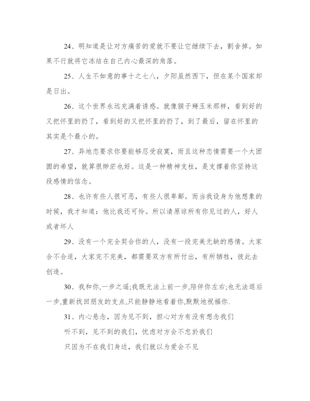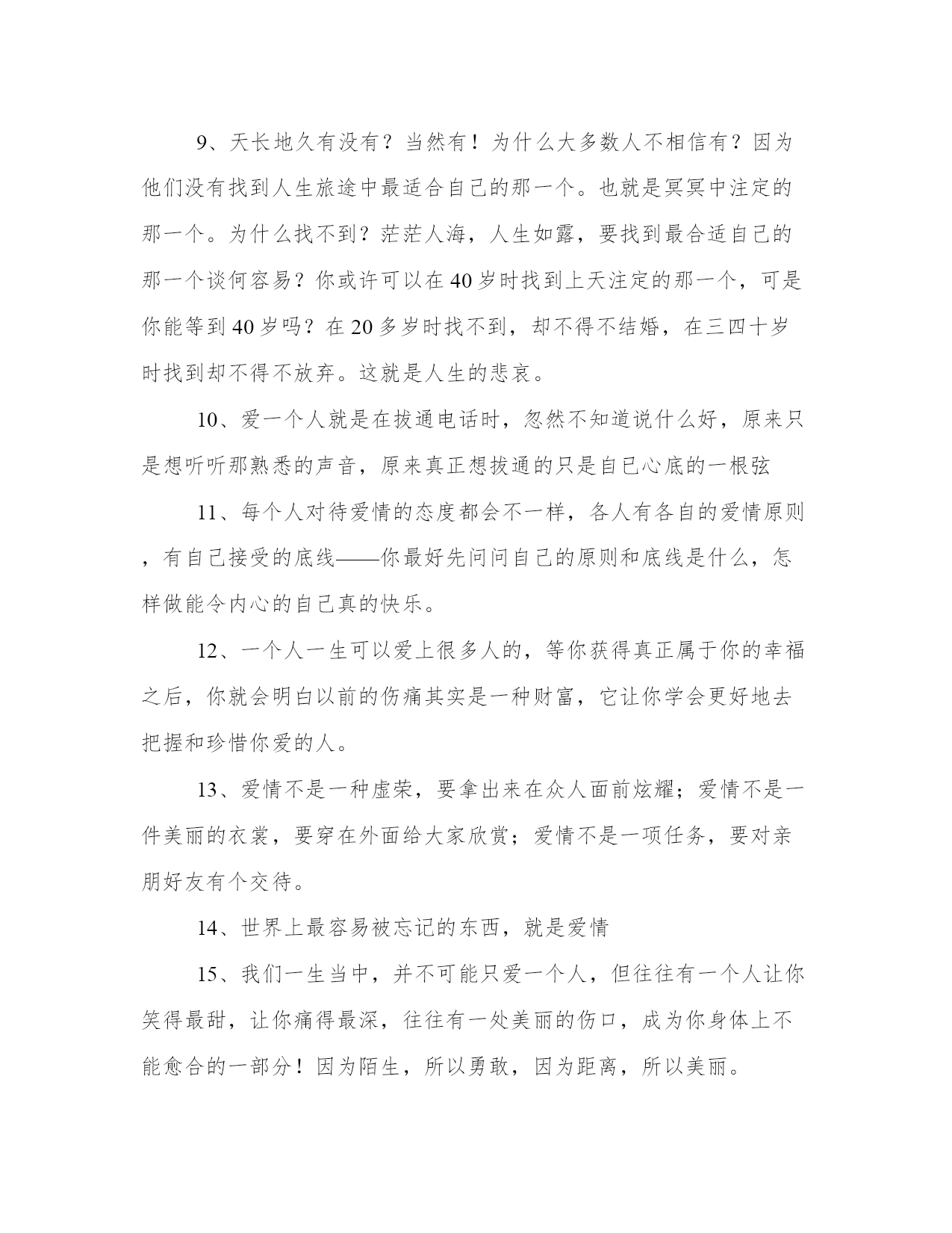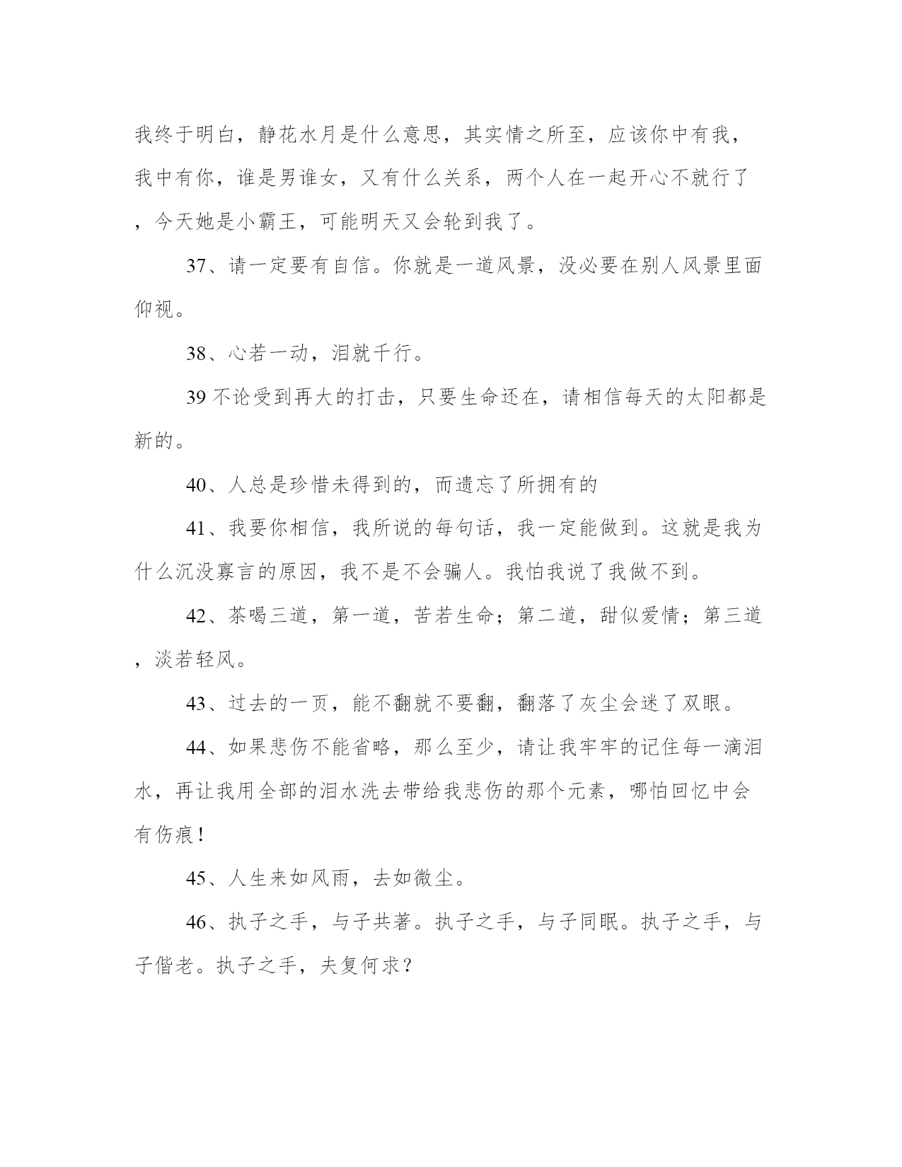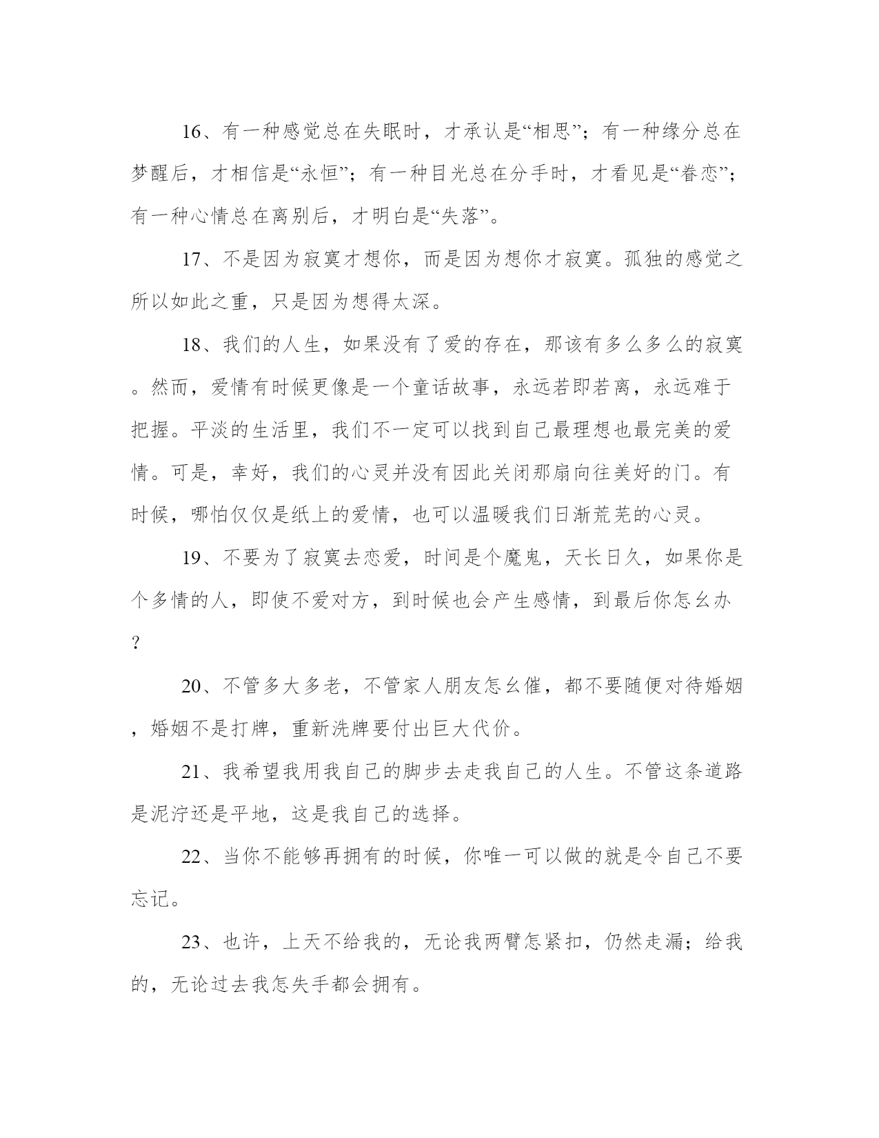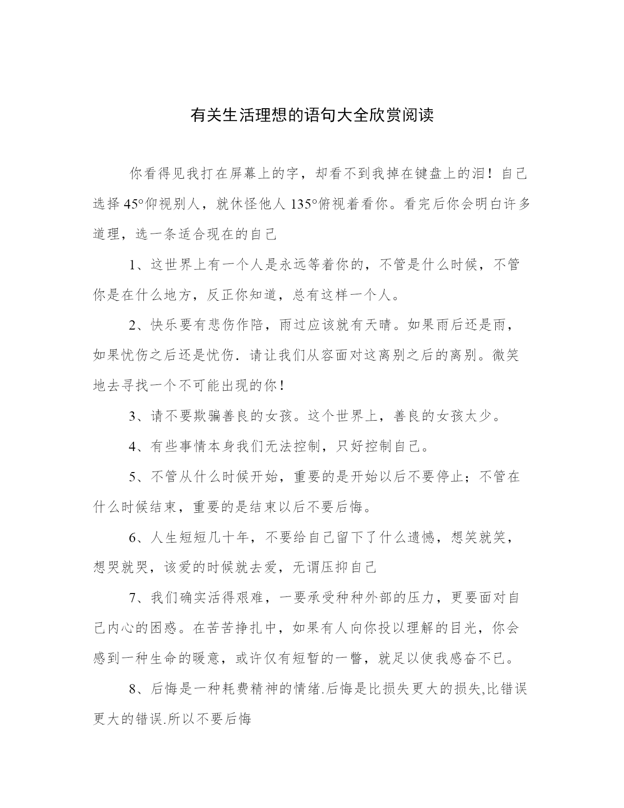 有关生活理想的语句大全欣赏阅读你看得见我打在屏幕上的字,却看不到我掉在键盘上的泪!自己选择45°仰视别人,就休怪他人135°俯视着看你。看完后你会明白许多道理,选一条适合现在的自己1、这世界上有一个人是永远等着你的,不管是什么时候,不管你是在什么地方,反正你知道,总有这样一个人。2、快乐要有悲伤作陪,雨过应该就有天晴。如果雨后还是雨,如果忧伤之后还是忧伤.请让我们从容面对这离别之后的离别。微笑地去寻找一个不可能出现的你!3、请不要欺骗善良的女孩。这个世界上,善良的女孩太少。4、有些事情本身我们无法控制,只好控制自己。5、不管从什么时候开始,重要的是开始以后不要停止;不管在什么时候结束,重要的是结束以后不要后悔。6、人生短短几十年,不要给自己留下了什么遗憾,想笑就笑,想哭就哭,该爱的时候就去爱,无谓压抑自己7、我们确实活得艰难,一要承受种种外部的压力,更要面对自己内心的困惑。在苦苦挣扎中,如果有人向你投以理解的目光,你会感到一种生命的暖意,或许仅有短暂的一瞥,就足以使我感奋不已。8、后悔是一种耗费精神的情绪.后悔是比损失更大的损失,比错误更大的错误.所以不要后悔9、天长地久有没有?当然有!为什么大多数人不相信有?因为他们没有找到人生旅途中最适合自己的那一个。也就是冥冥中注定的那一个。为什么找不到?茫茫人海,人生如露,要找到最合适自己的那一个谈何容易?你或许可以在40岁时找到上天注定的那一个,可是你能等到40岁吗?在20多岁时找不到,却不得不结婚,在三四十岁时找到却不得不放弃。这就是人生的悲哀。10、爱一个人就是在拔通电话时,忽然不知道说什么好,原来只是想听听那熟悉的声音,原来真正想拔通的只是自已心底的一根弦11、每个人对待爱情的态度都会不一样,各人有各自的爱情原则,有自己接受的底线——你最好先问问自己的原则和底线是什么,怎样做能令内心的自己真的快乐。12、一个人一生可以爱上很多人的,等你获得真正属于你的幸福之后,你就会明白以前的伤痛其实是一种财富,它让你学会更好地去把握和珍惜你爱的人。13、爱情不是一种虚荣,要拿出来在众人面前炫耀;爱情不是一件美丽的衣裳,要穿在外面给大家欣赏;爱情不是一项任务,要对亲朋好友有个交待。14、世界上最容易被忘记的东西,就是爱情15、我们一生当中,并不可能只爱一个人,但往往有一个人让你笑得最甜,让你痛得最深,往往有一处美丽的伤口,成为你身体上不能愈合的一部分!因为陌生,所以勇敢,因为距离,所以美丽。16、有一种感觉总在失眠时,才承认是“相思”;有一种缘分总在梦醒后,才相信是“永恒”;有一种目光总在分手时,才看见是“眷恋”;有一种心情总在离别后,才明白是“失落”。17、不是因为寂寞才想你,而是因为想你才寂寞。孤独的感觉之所以如此之重,只是因为想得太深。18、我们的人生,如果没有了爱的存在,那该有多么多么的寂寞。然而,爱情有时候更像是一个童话故事,永远若即若离,永远难于把握。平淡的生活里,我们不一定可以找到自己最理想也最完美的爱情。可是,幸好,我们的心灵并没有因此关闭那扇向往美好的门。有时候,哪怕仅仅是纸上的爱情,也可以温暖我们日渐荒芜的心灵。19、不要为了寂寞去恋爱,时间是个魔鬼,天长日久,如果你是个多情的人,即使不爱对方,到时候也会产生感情,到最后你怎幺办?20、不管多大多老,不管家人朋友怎幺催,都不要随便对待婚姻,婚姻不是打牌,重新洗牌要付出巨大代价。21、我希望我用我自己的脚步去走我自己的人生。不管这条道路是泥泞还是平地,这是我自己的选择。22、当你不能够再拥有的时候,你唯一可以做的就是令自己不要忘记。23、也许,上天不给我的,无论我两臂怎紧扣,仍然走漏;给我的,无论过去我怎失手都会拥有。24、明知道是让对方痛苦的爱就不要让它继续下去,割舍掉。如果不行就将它冻结在自己内心最深的角落。25、人生不如意的事十之七八,夕阳虽然西下,但在某个国家却是日出。26、这个世界永远充满着诱惑。就像猴子掰玉米那样,看到好的又把怀里的扔了,看到好的又把怀里的扔了,到了最后,留在怀里的其实是个最小的。27、异地恋要求你要能够忍受寂寞,而且这种恋情需要一个大团圆的希望,就算很缈茫也好。这是一种精神支柱,是支撑着你坚持这段感情的信念。28、也许有些人很可恶,有些人很卑鄙。而当我设身为他想象的时候,我才知道:他比我还可怜。所以请原谅所有你见过的人,好人或者坏人29、没有一个完全契合你的人,没有一段完美无缺的感情。大家合不合适,大家完不完美,都需要双方有所付出,有所牺牲,彼此去创造。30、我和你,一步之遥;我既无法上前一步,陪伴你左右;也无法退后一步,重新找回朋友的支点,只能静静地看着你,默默地祝福你.31、内心悬念,因为见不到,担心对方有没有想念我们听不到,