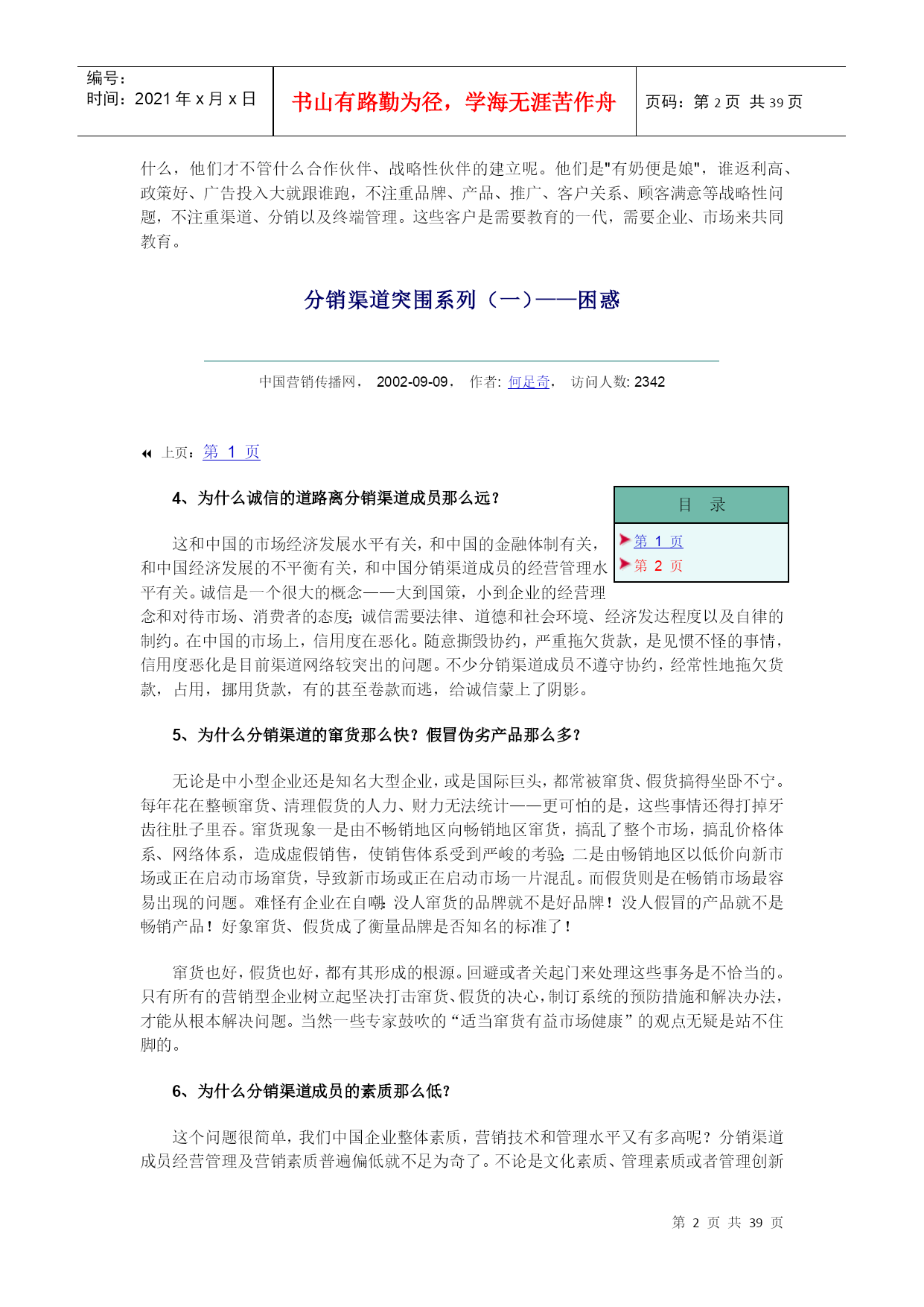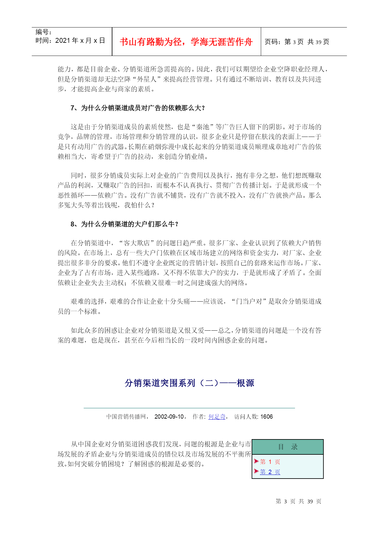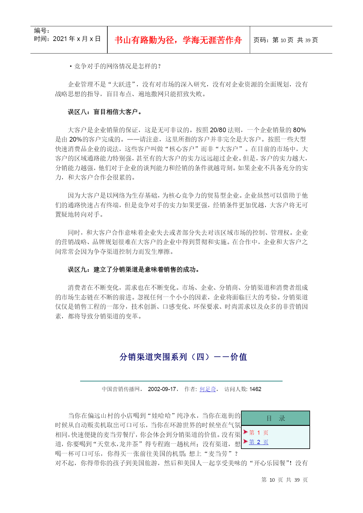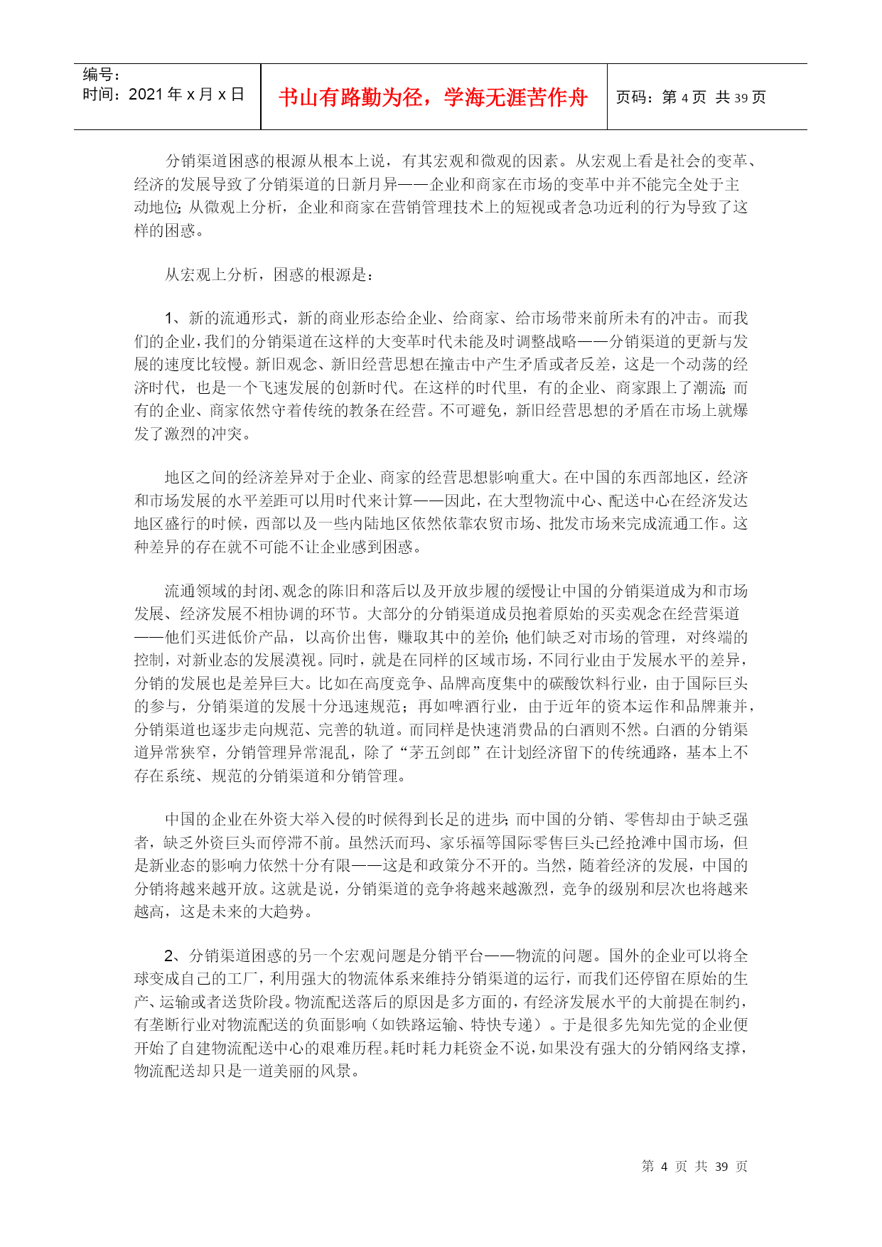 编号:时间:2021年x月x日书山有路勤为径,学海无涯苦作舟页码:第PAGE39页共NUMPAGES39页第PAGE\*MERGEFORMAT39页共NUMPAGES\*MERGEFORMAT39页HYPERLINK"xxmanarenx"xmanarenx海量免费资料尽在此分销渠道突围系列(一)——困惑中国营销传播网,2002-09-09,作者:何足奇,访问人数:2342分销渠道是企业的生命线,但是,由于企业在分销渠道上的管理缺乏战略眼光,缺乏战术规划,让分销渠道百孔千疮。分销渠道的困惑是企业决策者、营销管理者的最大问题——经常让企业的决策层食不知味,梦不安稳。分销渠道的困惑是企业和渠道成员之间的矛盾,既有不可调和的,也有可以避免的。很多企业将分销渠道成员的各种各样的要求当作洪水猛兽,把分销成员当“贼”来防,这是很奇怪的现象。我们列举出分销渠道困惑的现象:1、为什么分销渠道成员的胃口那么大?分销渠道好象永远和“得寸进尺”连在一起。在企业的眼里,分销渠道是永远吃不饱的孩子。原因何在呢?抛开分销渠道成员的私心私利,造成分销渠道成员胃口增大的重要原因是终端竞争的激烈,区域市场业态的变化。不论是大到分销成员要求赊销、铺底货,还是商场的上架费、陈列费、促销费,还有区域市场的广告费、损耗补贴、各种名目的赞助,以及年终返利、年度公关酒会、旅游奖励、各种形式的奖励、回扣等等种类繁多的分销成员要求,一方面是竞争的激烈使然,另一方面也是由于企业的管理不当、控制不力造成的。如果企业运行情况良好,再不合理、再过分的要求也能得到兑现;如果企业情况不好,那么就是正当的要求和投入都会被视为“非分之想”。总之,分销渠道成员的胃口也是企业、厂家给撑起来的。2、为什么分销渠道成员“孩子大了忘了娘”?分销渠道成员缺乏忠诚度是中国的普遍现象。“娃哈哈”的分销模式为什么成为典范?原因就在于他们建成了一个相对封闭的分销渠道——但不是任何企业具备这样的渠道掌控本领。很多企业在发展到一定阶段,都会遇到分销渠道的流失、叛变问题。于是企业就责怪渠道成员没有忠诚度。殊不知,凭什么分销渠道要忠诚企业?分销渠道成员又不是企业的员工,不拿年薪,企业是没有理由要求分销渠道成员忠诚的。但是企业可以通过服务、管理、不断提供更有利润、更具竞争力的产品来,以形成企业和分销渠道成员共同发展的局面。孩子大了,教育的方法也要相应地调整。如果一味强调辛苦,强调养育之恩,孩子迟早是要远走高飞的。3、为什么有那么多的分销渠道成员“有奶就是娘”?这是区域市场低素质、不具备战略眼光和完善经营管理思想的分销渠道成员的典型表现。这些分销渠道成员"利"字当头,唯利是图,不注重长期经营,只强调短期效应,什么赚钱卖什么,他们才不管什么合作伙伴、战略性伙伴的建立呢。他们是"有奶便是娘",谁返利高、政策好、广告投入大就跟谁跑,不注重品牌、产品、推广、客户关系、顾客满意等战略性问题,不注重渠道、分销以及终端管理。这些客户是需要教育的一代,需要企业、市场来共同教育。分销渠道突围系列(一)——困惑中国营销传播网,2002-09-09,作者:HYPERLINK"xxemktxx/cgi-bin/author.cgi?author=%BA%CE%D7%E3%C6%E6"何足奇,访问人数:2342上页:HYPERLINK"xxemktxx/article/79/7945.html"目录HYPERLINK"xxemktxx/article/79/7945.html"4、为什么诚信的道路离分销渠道成员那么远?这和中国的市场经济发展水平有关,和中国的金融体制有关,和中国经济发展的不平衡有关,和中国分销渠道成员的经营管理水平有关。诚信是一个很大的概念——大到国策,小到企业的经营理念和对待市场、消费者的态度;诚信需要法律、道德和社会环境、经济发达程度以及自律的制约。在中国的市场上,信用度在恶化。随意撕毁协约,严重拖欠货款,是见惯不怪的事情,信用度恶化是目前渠道网络较突出的问题。不少分销渠道成员不遵守协约,经常性地拖欠货款,占用,挪用货款,有的甚至卷款而逃,给诚信蒙上了阴影。5、为什么分销渠道的窜货那么快?假冒伪劣产品那么多?无论是中小型企业还是知名大型企业,或是国际巨头,都常被窜货、假货搞得坐卧不宁。每年花在整顿窜货、清理假货的人力、财力无法统计——更可怕的是,这些事情还得打掉牙齿往肚子里吞。窜货现象一是由不畅销地区向畅销地区窜货,搞乱了整个市场,搞乱价格体系、网络体系,造成虚假销售,使销售体系受到严峻的考验;二是由畅销地区以低价向新市场或正在启动市场窜货,导致新市场或正在启动市场一片混乱。而假货则是在畅销市场最容易出现的问题