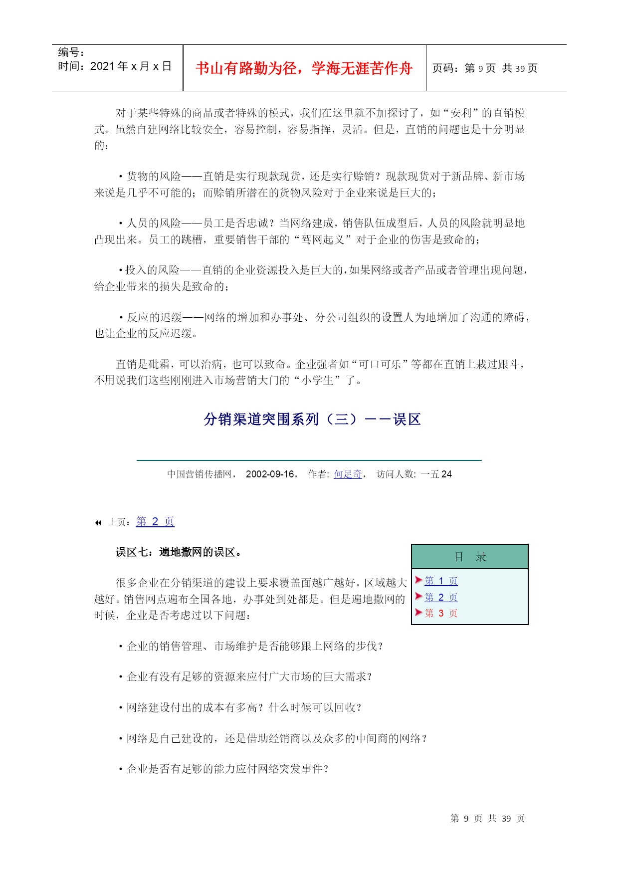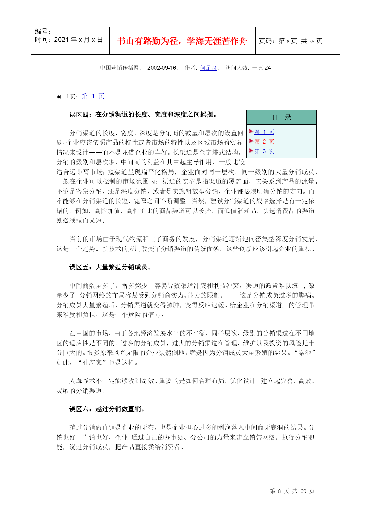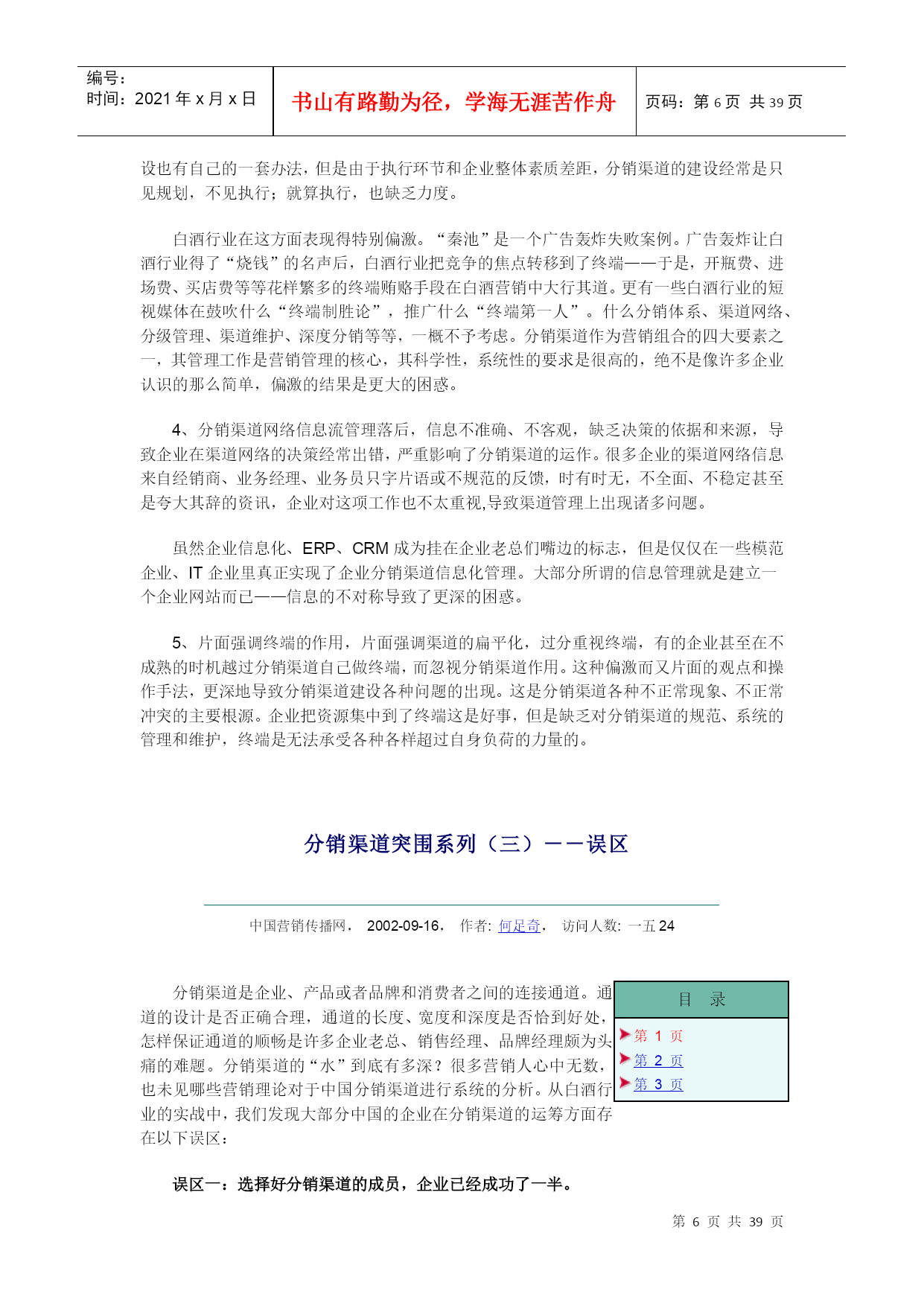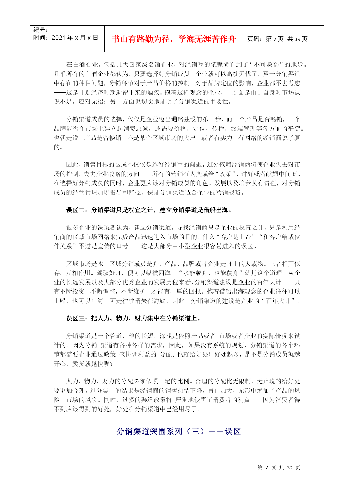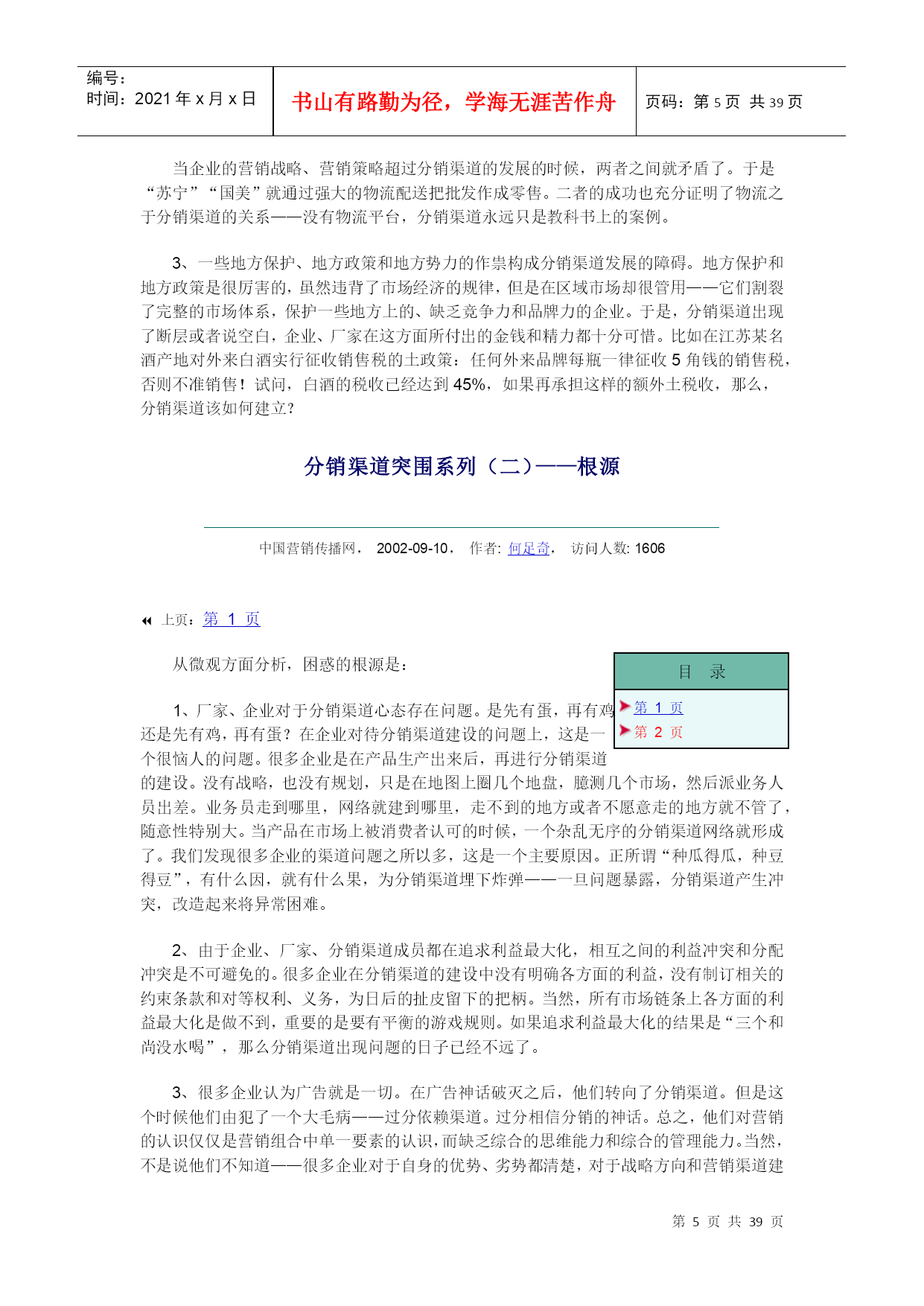 编号:时间:2021年x月x日书山有路勤为径,学海无涯苦作舟页码:第PAGE39页共NUMPAGES39页第PAGE\*MERGEFORMAT39页共NUMPAGES\*MERGEFORMAT39页HYPERLINK"xxmanarenx"xmanarenx海量免费资料尽在此分销渠道突围系列(一)——困惑中国营销传播网,2002-09-09,作者:何足奇,访问人数:2342分销渠道是企业的生命线,但是,由于企业在分销渠道上的管理缺乏战略眼光,缺乏战术规划,让分销渠道百孔千疮。分销渠道的困惑是企业决策者、营销管理者的最大问题——经常让企业的决策层食不知味,梦不安稳。分销渠道的困惑是企业和渠道成员之间的矛盾,既有不可调和的,也有可以避免的。很多企业将分销渠道成员的各种各样的要求当作洪水猛兽,把分销成员当“贼”来防,这是很奇怪的现象。我们列举出分销渠道困惑的现象:1、为什么分销渠道成员的胃口那么大?分销渠道好象永远和“得寸进尺”连在一起。在企业的眼里,分销渠道是永远吃不饱的孩子。原因何在呢?抛开分销渠道成员的私心私利,造成分销渠道成员胃口增大的重要原因是终端竞争的激烈,区域市场业态的变化。不论是大到分销成员要求赊销、铺底货,还是商场的上架费、陈列费、促销费,还有区域市场的广告费、损耗补贴、各种名目的赞助,以及年终返利、年度公关酒会、旅游奖励、各种形式的奖励、回扣等等种类繁多的分销成员要求,一方面是竞争的激烈使然,另一方面也是由于企业的管理不当、控制不力造成的。如果企业运行情况良好,再不合理、再过分的要求也能得到兑现;如果企业情况不好,那么就是正当的要求和投入都会被视为“非分之想”。总之,分销渠道成员的胃口也是企业、厂家给撑起来的。2、为什么分销渠道成员“孩子大了忘了娘”?分销渠道成员缺乏忠诚度是中国的普遍现象。“娃哈哈”的分销模式为什么成为典范?原因就在于他们建成了一个相对封闭的分销渠道——但不是任何企业具备这样的渠道掌控本领。很多企业在发展到一定阶段,都会遇到分销渠道的流失、叛变问题。于是企业就责怪渠道成员没有忠诚度。殊不知,凭什么分销渠道要忠诚企业?分销渠道成员又不是企业的员工,不拿年薪,企业是没有理由要求分销渠道成员忠诚的。但是企业可以通过服务、管理、不断提供更有利润、更具竞争力的产品来,以形成企业和分销渠道成员共同发展的局面。孩子大了,教育的方法也要相应地调整。如果一味强调辛苦,强调养育之恩,孩子迟早是要远走高飞的。3、为什么有那么多的分销渠道成员“有奶就是娘”?这是区域市场低素质、不具备战略眼光和完善经营管理思想的分销渠道成员的典型表现。这些分销渠道成员"利"字当头,唯利是图,不注重长期经营,只强调短期效应,什么赚钱卖什么,他们才不管什么合作伙伴、战略性伙伴的建立呢。他们是"有奶便是娘",谁返利高、政策好、广告投入大就跟谁跑,不注重品牌、产品、推广、客户关系、顾客满意等战略性问题,不注重渠道、分销以及终端管理。这些客户是需要教育的一代,需要企业、市场来共同教育。分销渠道突围系列(一)——困惑中国营销传播网,2002-09-09,作者:HYPERLINK"xxemktxx/cgi-bin/author.cgi?author=%BA%CE%D7%E3%C6%E6"何足奇,访问人数:2342上页:HYPERLINK"xxemktxx/article/79/7945.html"目录HYPERLINK"xxemktxx/article/79/7945.html"4、为什么诚信的道路离分销渠道成员那么远?这和中国的市场经济发展水平有关,和中国的金融体制有关,和中国经济发展的不平衡有关,和中国分销渠道成员的经营管理水平有关。诚信是一个很大的概念——大到国策,小到企业的经营理念和对待市场、消费者的态度;诚信需要法律、道德和社会环境、经济发达程度以及自律的制约。在中国的市场上,信用度在恶化。随意撕毁协约,严重拖欠货款,是见惯不怪的事情,信用度恶化是目前渠道网络较突出的问题。不少分销渠道成员不遵守协约,经常性地拖欠货款,占用,挪用货款,有的甚至卷款而逃,给诚信蒙上了阴影。5、为什么分销渠道的窜货那么快?假冒伪劣产品那么多?无论是中小型企业还是知名大型企业,或是国际巨头,都常被窜货、假货搞得坐卧不宁。每年花在整顿窜货、清理假货的人力、财力无法统计——更可怕的是,这些事情还得打掉牙齿往肚子里吞。窜货现象一是由不畅销地区向畅销地区窜货,搞乱了整个市场,搞乱价格体系、网络体系,造成虚假销售,使销售体系受到严峻的考验;二是由畅销地区以低价向新市场或正在启动市场窜货,导致新市场或正在启动市场一片混乱。而假货则是在畅销市场最容易出现的问题