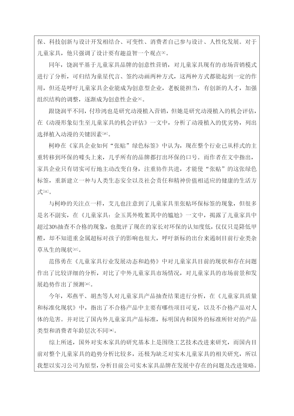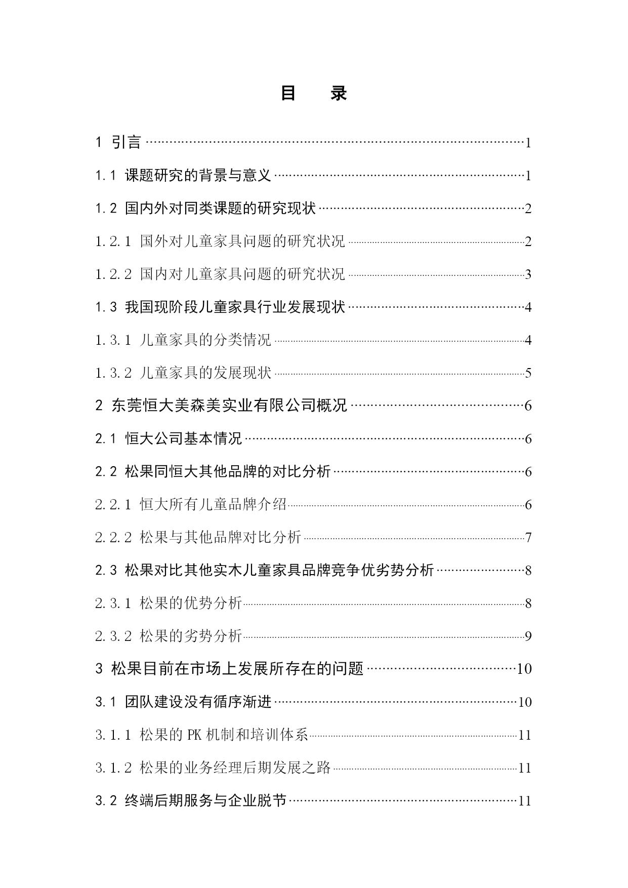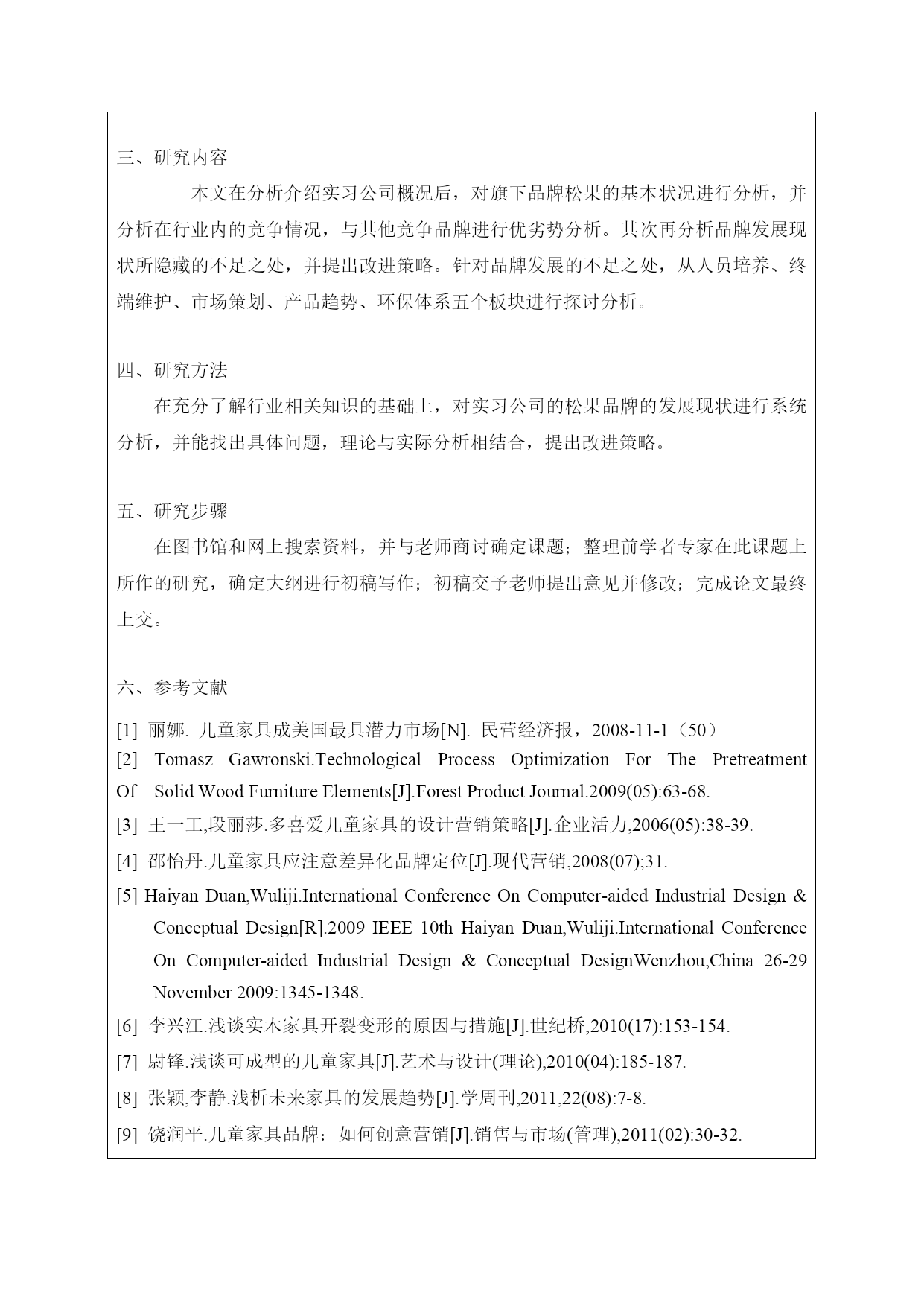 武汉纺织大学毕业设计(论文)开题报告课题名称恒大松果实木儿童家具发展现状与问题研究院系名称管理学院专业班级学生姓名课题研究的意义随着人们生活水平的不断提高,不仅对物质生活的质量要求越来越高,对子女的投入也越来越大,父母们尊重孩子们的个人空间,愿意给孩子打造单独的心灵庇所。因此,自20世纪90年代末,儿童家具经过短短几年的成长期便逐渐成了市场的香饽饽,现在儿童家具市场份额已超过10%。特别是近几年来,儿童家具不断细分,板式、板木、实木等几种不同的品种,竞争愈演愈烈。除了一些成人家具大公司想完善产品线而试水儿童家具外,更多的是专业做儿童家具的公司,市场上各种儿童品牌让人眼花缭乱,口碑和实力能让人称道的的确屈指可数,但在只有行业品牌却没有商业品牌的情况下,行业缺乏标准是一种普遍情况,实木儿童家具发展还要晚,这种局势更加严重。更糟的是,实木产品设计的抄袭现象非常严重,以至于同质化的倾向越来越严重,整个行业产品设计似乎已进入瓶颈。但也可以说,现在市场一片空白,因为整个行业正是由于没有标准和规范,所以也不太成熟,若能让自己的标准成为整个行业的标准,就能突破重围,一跃而上。综上所述,研究家具企业的发展方向及策略相当重要,儿童家具的发展不只一个方向,每一个方向都有着很大的市场潜力和商机,一旦找到突破口和引爆点,将会成为整个家具市场中明星。但在发展的过程中,都会面临一些大大小小的问题,在本文中,我想结合自己所学知识,运用市场营销、战略管理、人力资源管理等知识,以自己实习公司的所属品牌为研究对象,跟其他的几个竞争品牌对比,对品牌的发展方向和不足以及改进策略作出分析和研究。所属领域的研究成果从总体上看,虽然在欧美发达国家,由于生活观念不同等原因,专门做儿童家具的企业较少,品牌也不多,行业规模甚至没有国内大,但在近年,国外一些国家的儿童家具受到关注和重视,获得较快发展。美国家具行业最有潜力的市场是儿童家具市场,特别是儿童卧室家具市场。有关市场调查机构的报告显示,美国的儿童家具市场规模接近50亿美元,而且还在不断扩大。又据美国《KidsToday》杂志调查显示,近年来美国婴儿出生率的升高及社会对儿童拥有独立生活空间的鼓励,使儿童家具的需求量有望在2007-2012年上升至少23%,并使美国儿童家具市场规模在2012年达到63亿美元[1]。2009年,托马斯研究了实木家具的预处理工艺流程优化,认为很有必要进行合理的工艺参数的定量分析,开发一套基于最优化的方法和专家知识的算法,研究目的是为了发展一个可以最优化处理流程的数学模型和电脑程序,为了在家具工厂里对工艺流程的一个选定的碎片进行最优化处理,利用C语言编程来进行技术上的分析[2]。王一工在2006年,以恒大旗下儿童品牌多喜爱为原型,从设计和营销的角度着手,分析了其巩固地位的原因,以决策者为主导,所以设计偏成人化,考虑孩子感受,所以卖场游乐化,二者有力结合起来,既迎合了话事人,又能让小孩在环境下容易和大人意见一致[3]。2008年,邵怡丹在《儿童家具应注重差异化品牌定位》一文中,就儿童家居产品同质化发表了自己的见解,其中指明,儿童家具品牌不仅连设计相差无几,就连宣传口号和广告语都极为相似,这样不仅把市场做得越来越差,消费者也不容易选出诚心如意的产品了,在最后提出了只有差异化,例如设计多样化和定位精品化,才能脱颖而出[4]。2009年,段海燕在《益智儿童家具的创意设计》中指出,益智将会成为儿童家具新的趋势,并定义了什么是有益的智能儿童家具,分析了创造性的元素和一些新方法,尤其是功能性模块,旨在为家具设计师和企业提供一些新的方法和思路[5]。2010年,李兴江以实木儿童家具开裂变形的原因与措施为出发点,从木材的特性到后期的加工制造环节,一一剖析,最后总结出变形的原因,同时给出了对使用实木儿童家具的建议[6]。同年,尉锋以可成长性儿童家具为出发点,针对目前儿童家具市场存在的问题,详细阐述了可成长性儿童家具的必要性、含义和特点,并提出了了儿童家具的设计原则,为国内儿童家具设计提供一些有益的参考[7]。2011年,张颖在《浅析未来家具的发展趋势》一文中,通过分析人们日常生活和人文地理及消费需求等方面,提出了家具发展的六个趋势:设计多样化、材料绿色环保、科技创新与设计开发相结合、可变性、消费者自己参与设计、人性化发展。对于儿童家具,他只强调了设计要有趣益智一个观点[8]。同年,饶润平基于儿童家具品牌的创意性营销,对儿童家具现有的市场营销模式进行了分析,可归结为童星代言、签约动画两种方式,这两种方式都能起到一定的作用,但还是呼吁儿童家具企业能成为创意型企业,老板能担当,有创新的人才,加强组织结构的调整,逐渐成为创意性企业[9]。跟饶润平不同,付珍鸿也是研究动漫植入营销,但她是研究动漫植入的