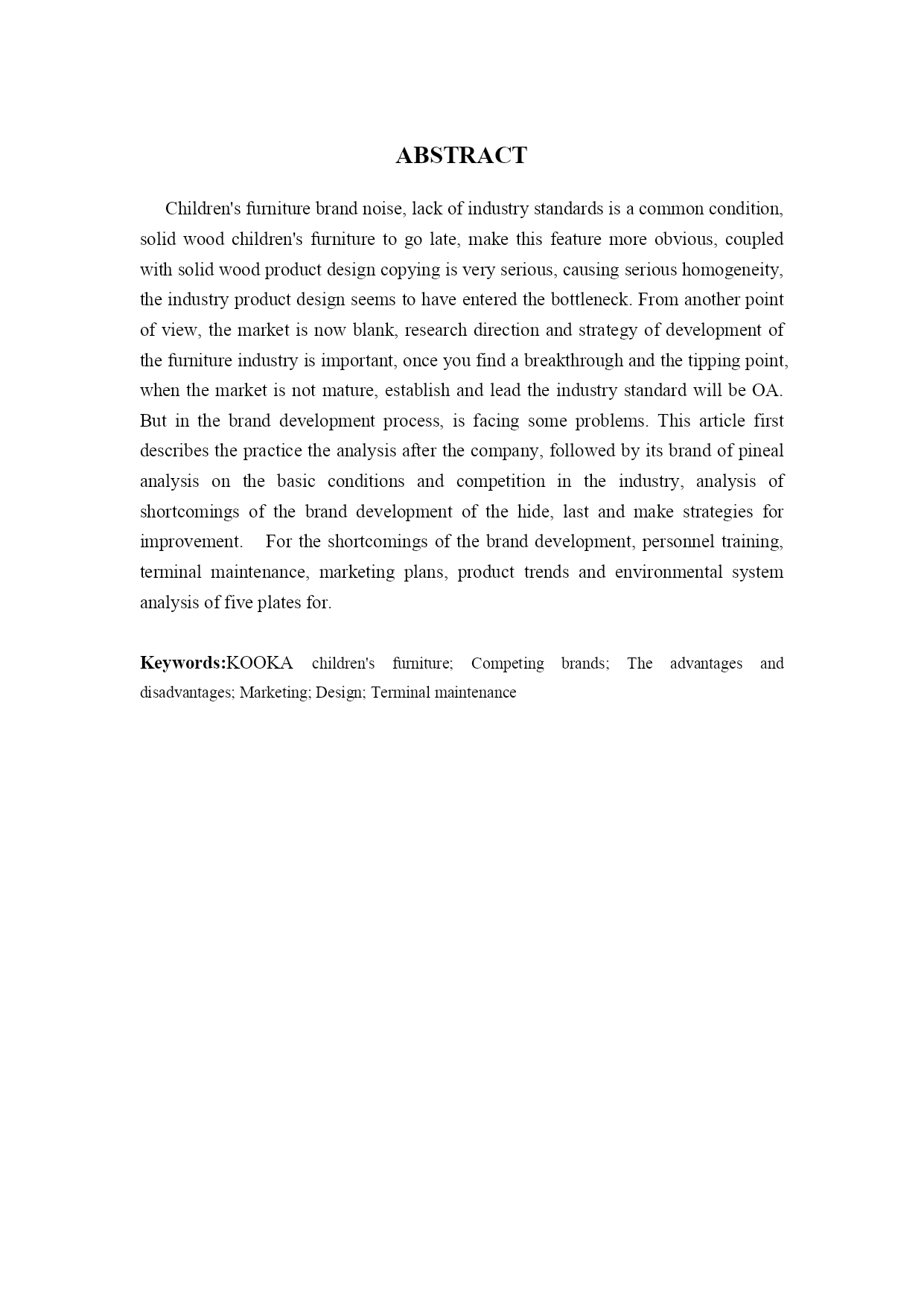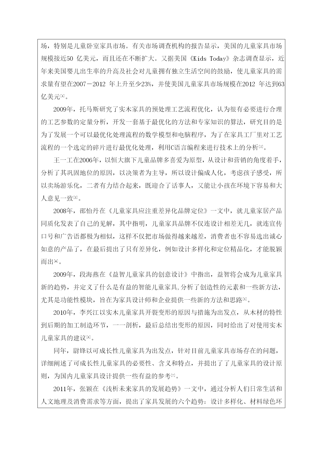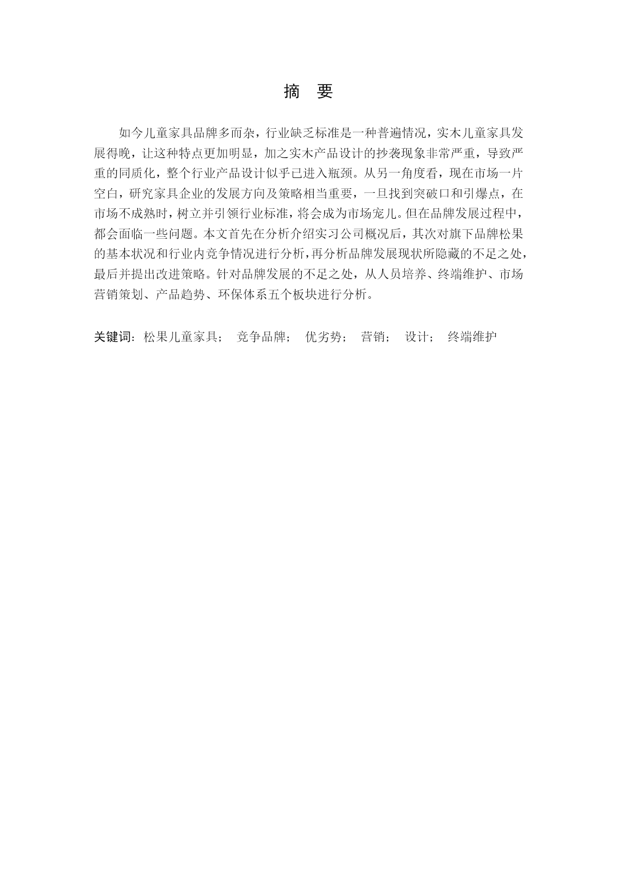 武汉纺织大学毕业设计(论文)开题报告课题名称恒大松果实木儿童家具发展现状与问题研究院系名称管理学院专业班级学生姓名课题研究的意义随着人们生活水平的不断提高,不仅对物质生活的质量要求越来越高,对子女的投入也越来越大,父母们尊重孩子们的个人空间,愿意给孩子打造单独的心灵庇所。因此,自20世纪90年代末,儿童家具经过短短几年的成长期便逐渐成了市场的香饽饽,现在儿童家具市场份额已超过10%。特别是近几年来,儿童家具不断细分,板式、板木、实木等几种不同的品种,竞争愈演愈烈。除了一些成人家具大公司想完善产品线而试水儿童家具外,更多的是专业做儿童家具的公司,市场上各种儿童品牌让人眼花缭乱,口碑和实力能让人称道的的确屈指可数,但在只有行业品牌却没有商业品牌的情况下,行业缺乏标准是一种普遍情况,实木儿童家具发展还要晚,这种局势更加严重。更糟的是,实木产品设计的抄袭现象非常严重,以至于同质化的倾向越来越严重,整个行业产品设计似乎已进入瓶颈。但也可以说,现在市场一片空白,因为整个行业正是由于没有标准和规范,所以也不太成熟,若能让自己的标准成为整个行业的标准,就能突破重围,一跃而上。综上所述,研究家具企业的发展方向及策略相当重要,儿童家具的发展不只一个方向,每一个方向都有着很大的市场潜力和商机,一旦找到突破口和引爆点,将会成为整个家具市场中明星。但在发展的过程中,都会面临一些大大小小的问题,在本文中,我想结合自己所学知识,运用市场营销、战略管理、人力资源管理等知识,以自己实习公司的所属品牌为研究对象,跟其他的几个竞争品牌对比,对品牌的发展方向和不足以及改进策略作出分析和研究。所属领域的研究成果从总体上看,虽然在欧美发达国家,由于生活观念不同等原因,专门做儿童家具的企业较少,品牌也不多,行业规模甚至没有国内大,但在近年,国外一些国家的儿童家具受到关注和重视,获得较快发展。美国家具行业最有潜力的市场是儿童家具市场,特别是儿童卧室家具市场。有关市场调查机构的报告显示,美国的儿童家具市场规模接近50亿美元,而且还在不断扩大。又据美国《KidsToday》杂志调查显示,近年来美国婴儿出生率的升高及社会对儿童拥有独立生活空间的鼓励,使儿童家具的需求量有望在2007-2012年上升至少23%,并使美国儿童家具市场规模在2012年达到63亿美元[1]。2009年,托马斯研究了实木家具的预处理工艺流程优化,认为很有必要进行合理的工艺参数的定量分析,开发一套基于最优化的方法和专家知识的算法,研究目的是为了发展一个可以最优化处理流程的数学模型和电脑程序,为了在家具工厂里对工艺流程的一个选定的碎片进行最优化处理,利用C语言编程来进行技术上的分析[2]。王一工在2006年,以恒大旗下儿童品牌多喜爱为原型,从设计和营销的角度着手,分析了其巩固地位的原因,以决策者为主导,所以设计偏成人化,考虑孩子感受,所以卖场游乐化,二者有力结合起来,既迎合了话事人,又能让小孩在环境下容易和大人意见一致[3]。2008年,邵怡丹在《儿童家具应注重差异化品牌定位》一文中,就儿童家居产品同质化发表了自己的见解,其中指明,儿童家具品牌不仅连设计相差无几,就连宣传口号和广告语都极为相似,这样不仅把市场做得越来越差,消费者也不容易选出诚心如意的产品了,在最后提出了只有差异化,例如设计多样化和定位精品化,才能脱颖而出[4]。2009年,段海燕在《益智儿童家具的创意设计》中指出,益智将会成为儿童家具新的趋势,并定义了什么是有益的智能儿童家具,分析了创造性的元素和一些新方法,尤其是功能性模块,旨在为家具设计师和企业提供一些新的方法和思路[5]。2010年,李兴江以实木儿童家具开裂变形的原因与措施为出发点,从木材的特性到后期的加工制造环节,一一剖析,最后总结出变形的原因,同时给出了对使用实木儿童家具的建议[6]。同年,尉锋以可成长性儿童家具为出发点,针对目前儿童家具市场存在的问题,详细阐述了可成长性儿童家具的必要性、含义和特点,并提出了了儿童家具的设计原则,为国内儿童家具设计提供一些有益的参考[7]。2011年,张颖在《浅析未来家具的发展趋势》一文中,通过分析人们日常生活和人文地理及消费需求等方面,提出了家具发展的六个趋势:设计多样化、材料绿色环保、科技创新与设计开发相结合、可变性、消费者自己参与设计、人性化发展。对于儿童家具,他只强调了设计要有趣益智一个观点[8]。同年,饶润平基于儿童家具品牌的创意性营销,对儿童家具现有的市场营销模式进行了分析,可归结为童星代言、签约动画两种方式,这两种方式都能起到一定的作用,但还是呼吁儿童家具企业能成为创意型企业,老板能担当,有创新的人才,加强组织结构的调整,逐渐成为创意性企业[9]。跟饶润平不同,付珍鸿也是研究动漫植入营销,但她是研究动漫植入的