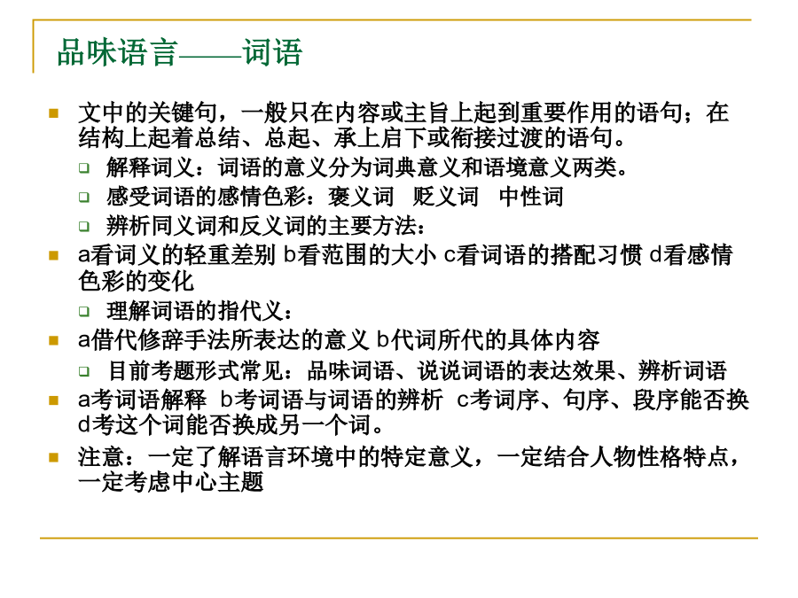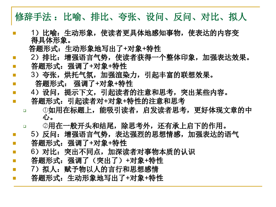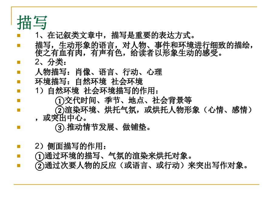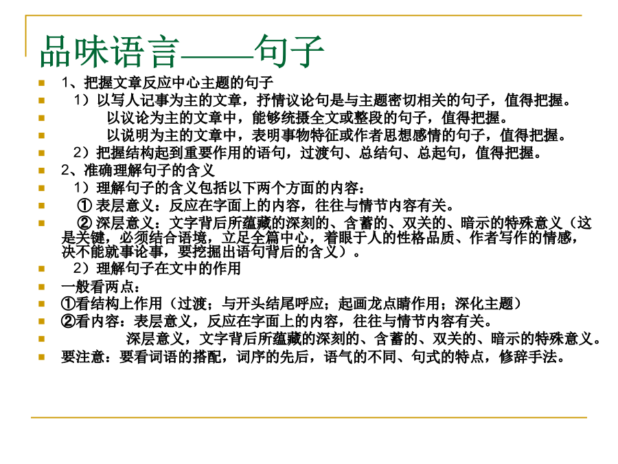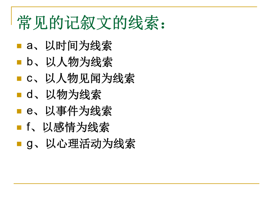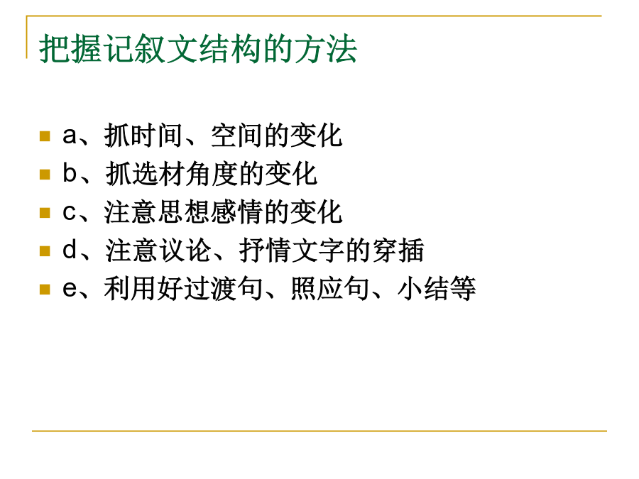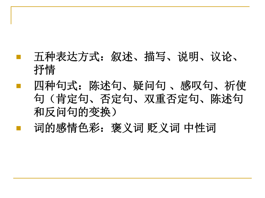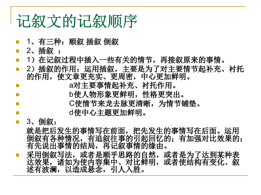 中考记叙文阅读解题点击五种表达方式:叙述、描写、说明、议论、抒情四种句式:陈述句、疑问句、感叹句、祈使句(肯定句、否定句、双重否定句、陈述句和反问句的变换)词的感情色彩:褒义词贬义词中性词修辞手法:比喻、排比、夸张、设问、反问、对比、拟人标点品味语言——词语品味语言——句子描写常见的记叙文的线索:把握记叙文结构的方法记叙文的记叙顺序记叙文的首段在文中常见作用记叙文的尾段在文中常见作用记叙文标题作用