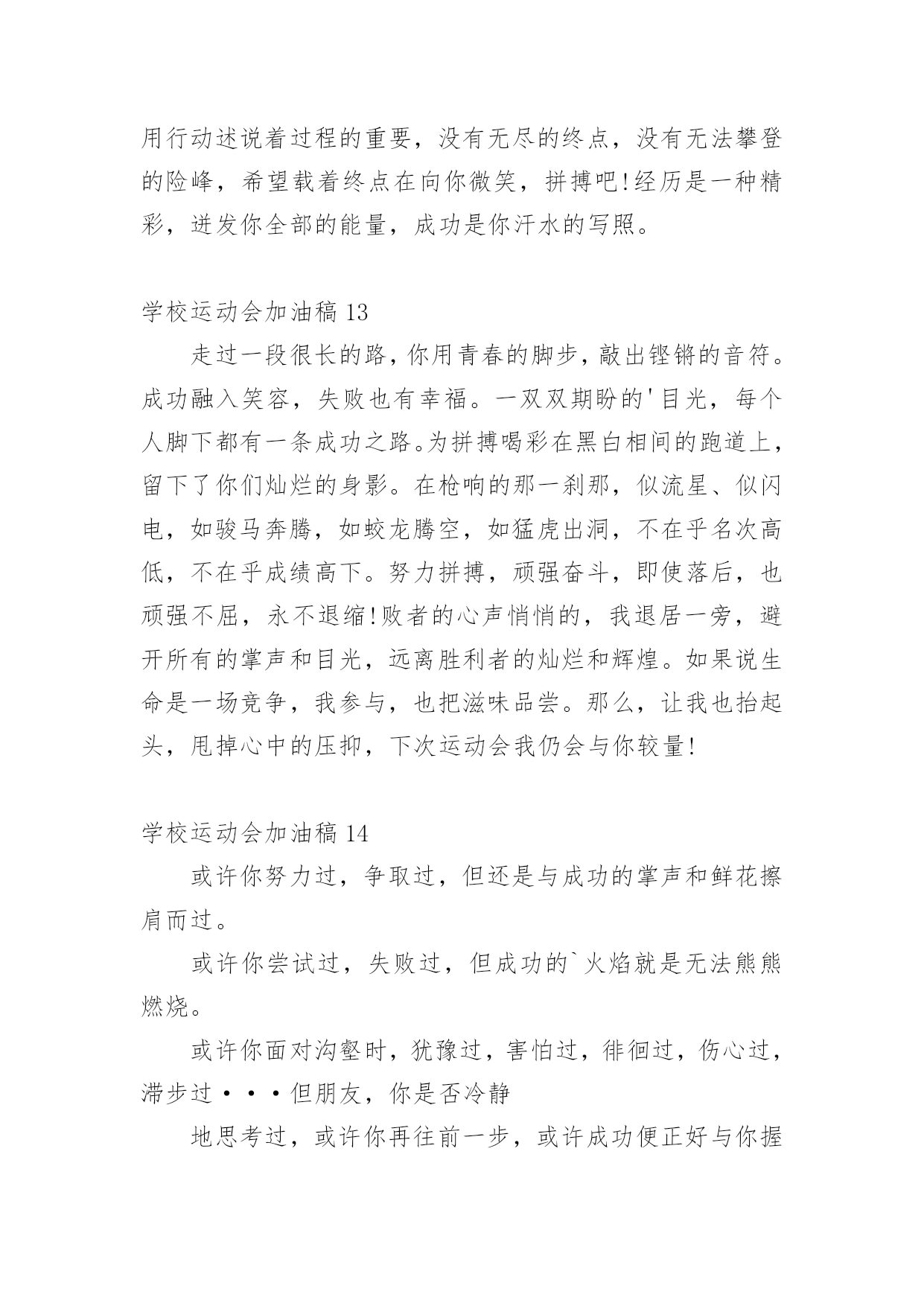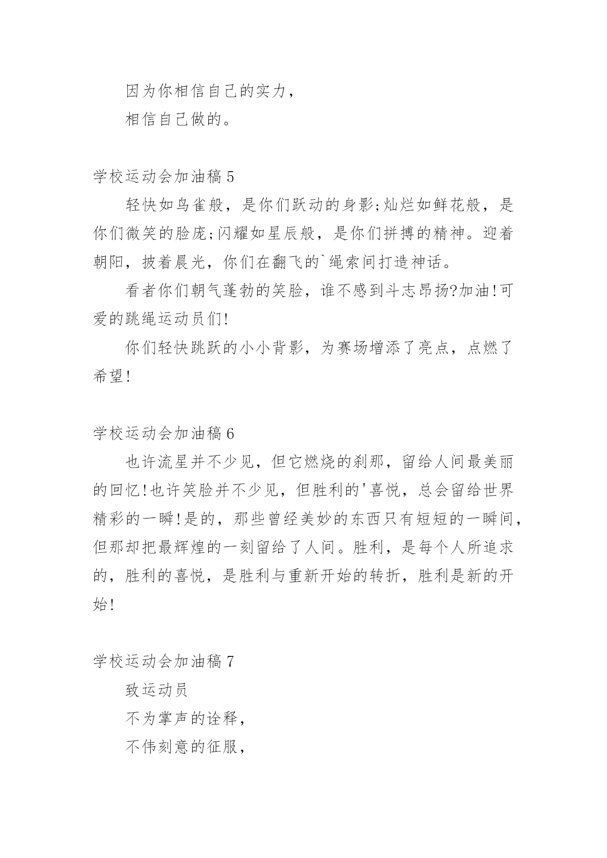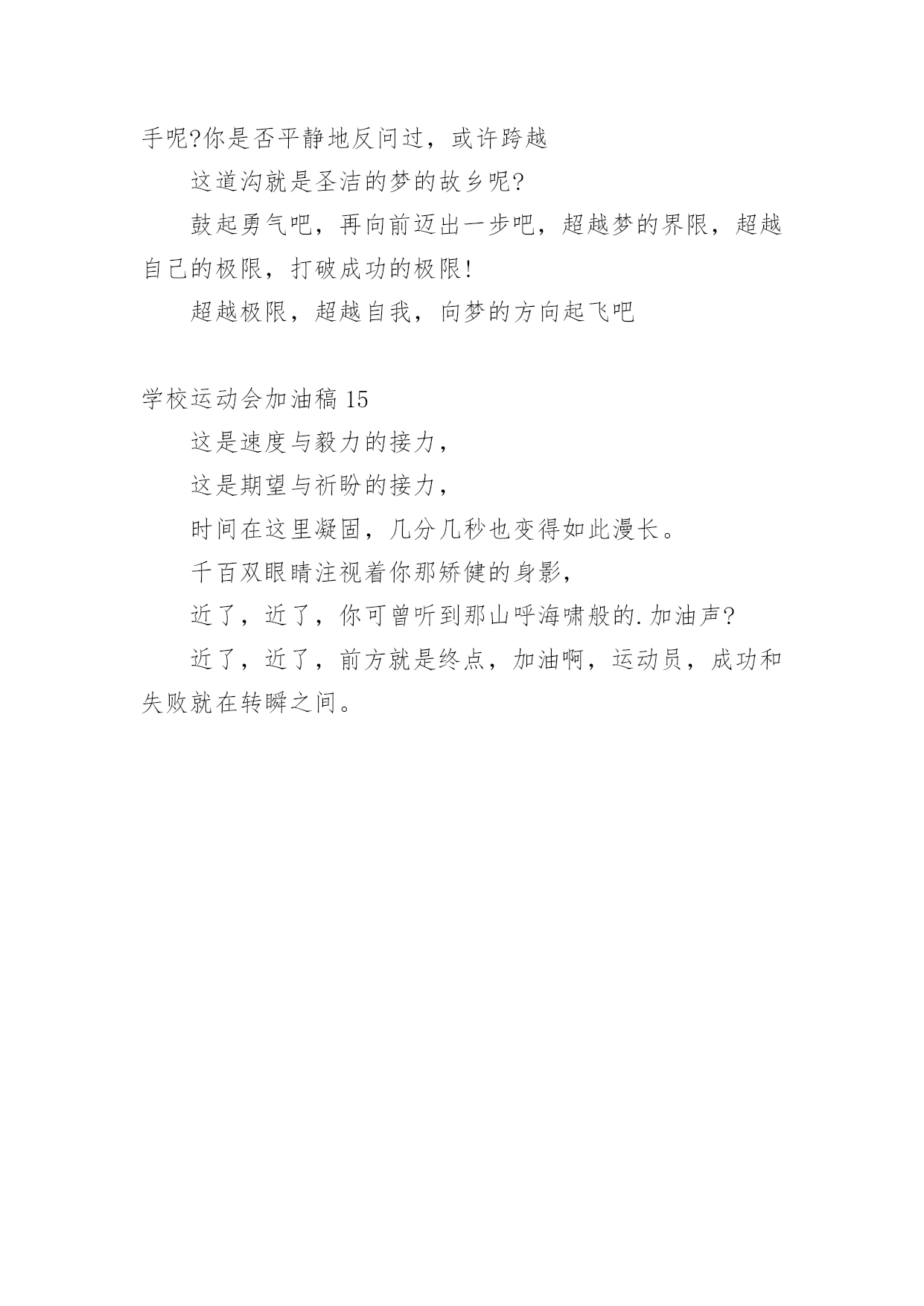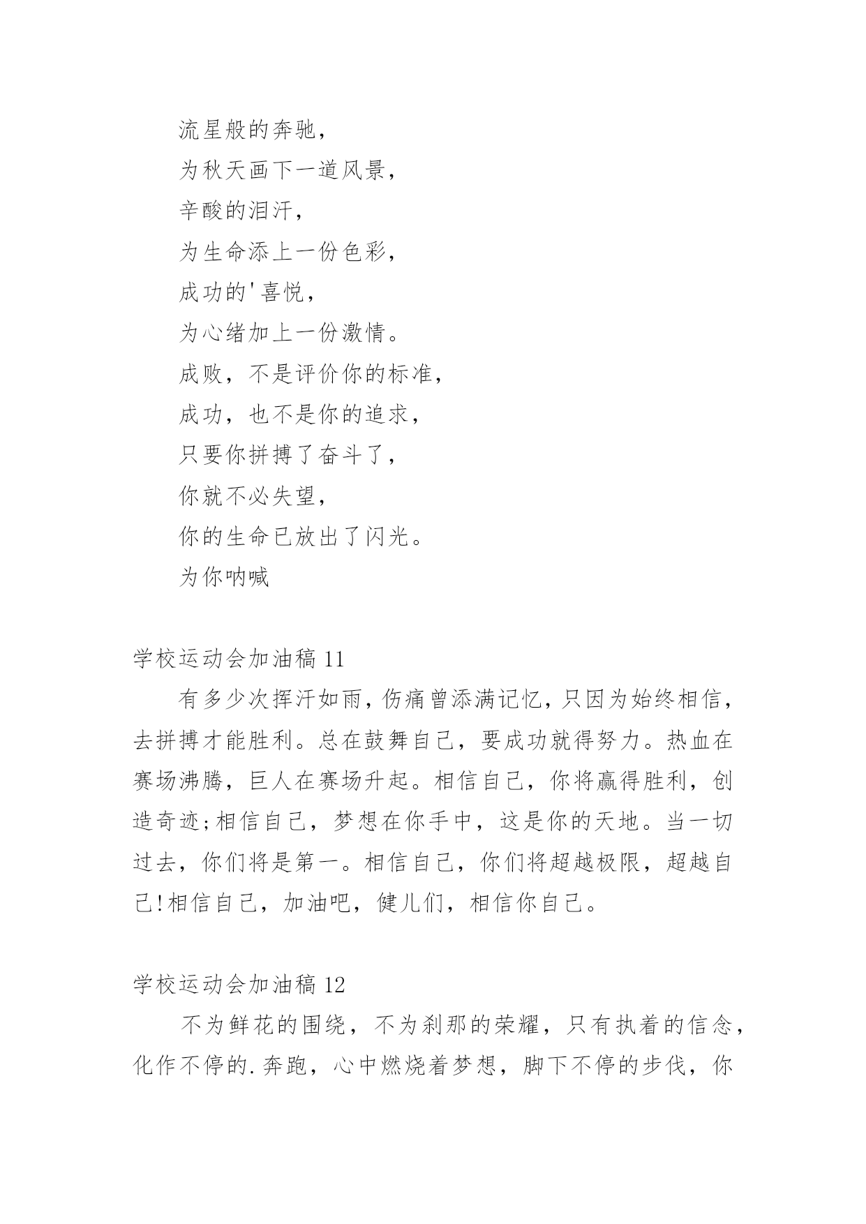 学校运动会加油稿学校运动会加油稿集锦15篇在社会发展不断提速的今天,能够利用到加油稿的场合越来越多,借助加油稿可以表达对对方的鼓励和支持。相信很多朋友都对写加油稿感到非常苦恼吧,下面是小编收集整理的学校运动会加油稿,欢迎大家借鉴与参考,希望对大家有所帮助。学校运动会加油稿1一张张兴奋不已的面容,一颗颗紧张而激动的心。一阵阵震耳的掌声,一声声助威的呐喊。运动场上,处处激荡着青春的旋律。青春是那有力的一跳,青春是摔倒后爬起,忍痛跑完的全程。青春是领奖台上灿烂的笑容,青春是失败后,站起再努力的勇气,青春是明天更大的成功。迎接挑战创造精彩初升的朝阳给予我们新的希望,在充满火样的'热情中,我们迎接一个新的挑战。生命原是一幅未动笔的画卷,但有志者却能描绘出绚丽多姿的动人画卷,我们应当充满希望的迎接挑战,成功的精彩毕竟需要自己的双手去获得,加油吧!为了创造不平凡的精彩,去傲视任何一个挑战,因为我们,是的。学校运动会加油稿2学校乃至国家应该思考的是如何把这种运动精神深化到每一个人的心底,让每个人都真心喜欢运动。让民众能真正体会到运动带给我们的快乐,以及运动带给我们的好处包括工作上的、生活上的、家庭上的、心灵上的、精神上的、身体上的。当然政府可以引导某项运动风潮,但必须加强教育以及思想引导,否则运动就得靠政府一直不停的'表演而不能深入民众。要知道运动的根基在于民众的自觉性而不是官方的作秀。所以,举办运动会的目的就是通过举办运动会让民众能够深刻认识到运动的精神或运动的本质,让民众能真正感受到运动带给他们的快乐以及在工作、生活、家庭和心灵上的提升和充实,让民众热爱运动并自觉运动。学校运动会加油稿3有多少次挥汗如雨,伤痛曾添满记忆,只因为始终相信,去拼搏才能胜利。总在鼓舞自己,要成功就得努力。热血在赛场沸腾,巨人在赛场升起。相信自己,你将赢得胜利,创造奇迹;相信自己,梦想在你手中,这是你的天地。当一切过去,你们将是第一。相信自己,你们将超越极限,超越自己!相信自己,加油吧,健儿们,相信你自己。我们自信飞扬,青春的气息如同出生的朝阳,蓬勃的力量如同阳光的挥洒。此时此刻,跑道便是我们精彩的舞台,声声加油便是我们最高的'奖项!论何成功,谈何荣辱,心中的信念只有一个:拼搏!学校运动会加油稿4相信自己做的,无所谓成功与失败,只在乎那过程的挥汗如雨,每一次都是新的起点,每一次都是努力的体验。耳边想起震天的'呐喊助威声,那是对你拼搏的肯定,每一声都充满热情,每一声都充满激情。任何时刻都不会放弃,那属于自己的每一次机会,因为你相信自己的实力,相信自己做的。学校运动会加油稿5轻快如鸟雀般,是你们跃动的身影;灿烂如鲜花般,是你们微笑的脸庞;闪耀如星辰般,是你们拼搏的精神。迎着朝阳,披着晨光,你们在翻飞的`绳索间打造神话。看者你们朝气蓬勃的笑脸,谁不感到斗志昂扬?加油!可爱的跳绳运动员们!你们轻快跳跃的小小背影,为赛场增添了亮点,点燃了希望!学校运动会加油稿6也许流星并不少见,但它燃烧的刹那,留给人间最美丽的回忆!也许笑脸并不少见,但胜利的'喜悦,总会留给世界精彩的一瞬!是的,那些曾经美妙的东西只有短短的一瞬间,但那却把最辉煌的一刻留给了人间。胜利,是每个人所追求的,胜利的喜悦,是胜利与重新开始的转折,胜利是新的开始!学校运动会加油稿7致运动员不为掌声的诠释,不伟刻意的征服,只有辛勤的汗水化作追求的`脚步。心中坚定的信念,脚下沉稳的步伐,你用行动诉说着一个不变的真理。没有比脚更长的路,没有比人更高的山,希望在终点向你招手。努力吧!用你坚韧不拔的意志,去迎接终点的掌声,学校运动会加油稿8信念——致运动员信念是激情,信念是动力,信念是我们期盼的眼神,信念是绿茵场上短促的呼吸,你在跑道上挥洒汗水,我们在这里为你呐喊助威,朋友,努力拼搏吧!我们能赢是的`,我们能行,我们能赢,心中重复了无数次,是的,我们,能赢。因为我们富有生命的热情,必胜的信心;未来的挑战,必胜的坚定。向着辽阔大地大呼:我们一定赢!学校运动会加油稿9枪声响了,你们一马当先向前冲,没有昔日的.汗水,怎见今天的胜利?相信自己,鼓励自己,超越自己。为太阳的光辉在添上永恒的一笔!要的就是坚持到底,不是华丽。冲吧!向着那未来,进行到底。学校运动会加油稿10我是运动员我是运动员,在骄阳下展现自我,在奋斗中争取辉煌。我是运动员,不在乎成功与否,不怕汗水直流,因为,你看有同学们为我加油!致运动员流星般的奔驰,为秋天画下一道风景,辛酸的泪汗,为生命添上一份色彩,成功的'喜悦,为心绪加上一份激情。成败,不是评价你的标准,成功,也不是你的追求,只要你拼搏了奋斗了,你就不必失望,你的生命已放出了闪光。为你呐喊学校运动会加油稿11有多少次挥汗如雨,伤痛曾添满记忆,只因为始终相信,去拼搏才能胜利。总在鼓舞自己,要成功就得努力。热血在赛场