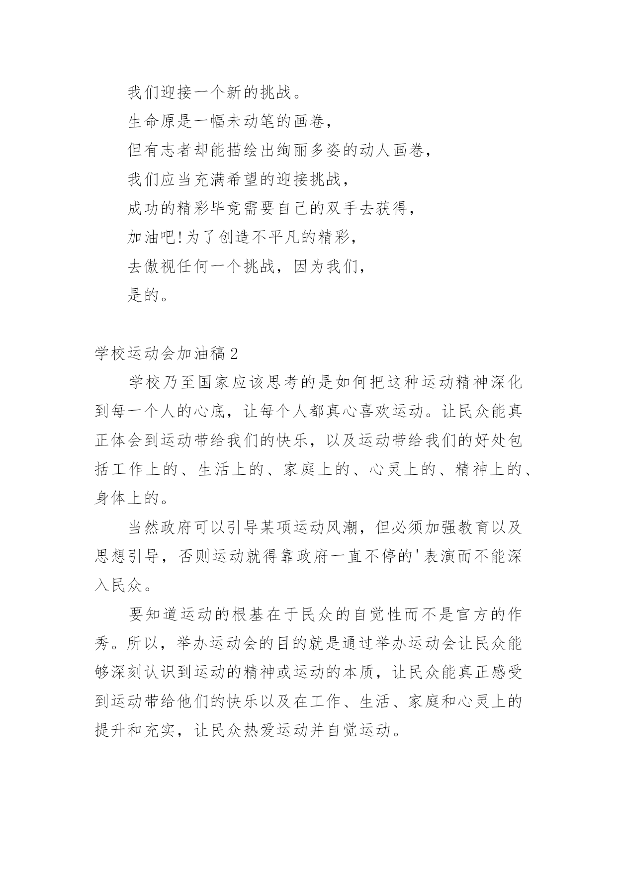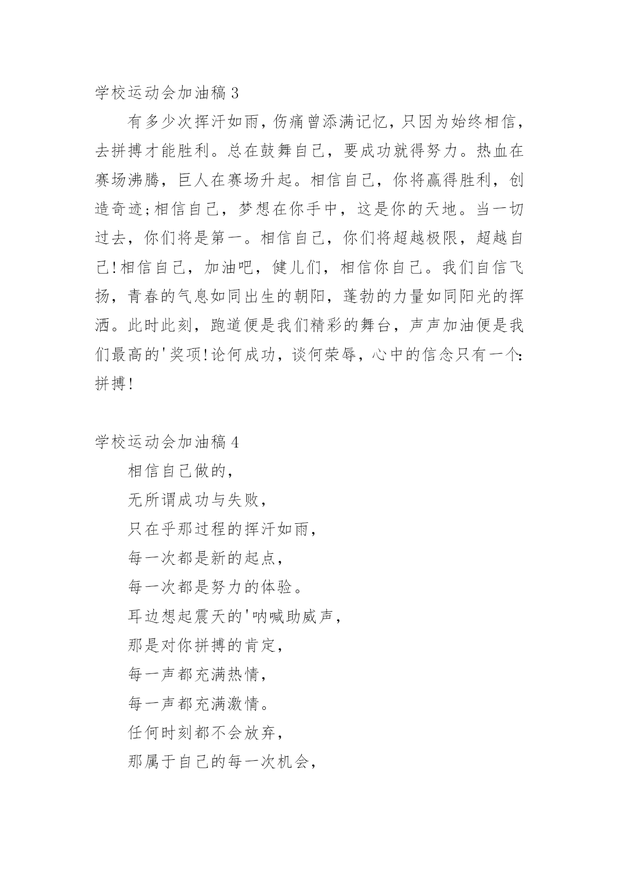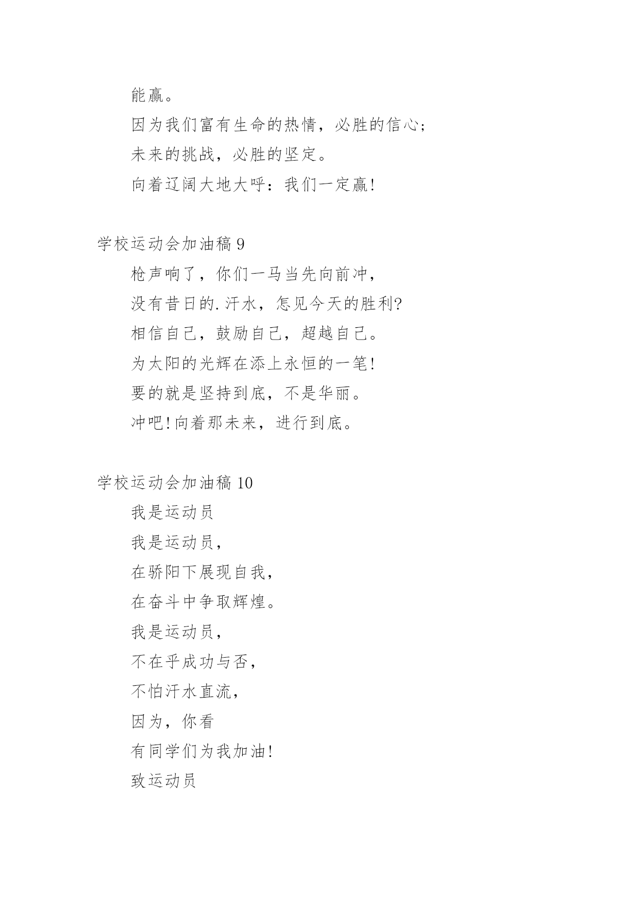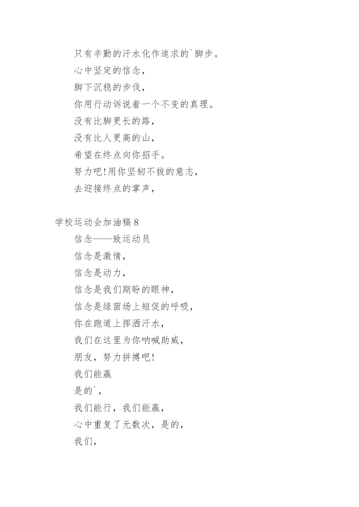 学校运动会加油稿学校运动会加油稿集锦15篇在社会发展不断提速的今天,能够利用到加油稿的场合越来越多,借助加油稿可以表达对对方的鼓励和支持。相信很多朋友都对写加油稿感到非常苦恼吧,下面是小编收集整理的学校运动会加油稿,欢迎大家借鉴与参考,希望对大家有所帮助。学校运动会加油稿1一张张兴奋不已的面容,一颗颗紧张而激动的心。一阵阵震耳的掌声,一声声助威的呐喊。运动场上,处处激荡着青春的旋律。青春是那有力的一跳,青春是摔倒后爬起,忍痛跑完的全程。青春是领奖台上灿烂的笑容,青春是失败后,站起再努力的勇气,青春是明天更大的成功。迎接挑战创造精彩初升的朝阳给予我们新的希望,在充满火样的'热情中,我们迎接一个新的挑战。生命原是一幅未动笔的画卷,但有志者却能描绘出绚丽多姿的动人画卷,我们应当充满希望的迎接挑战,成功的精彩毕竟需要自己的双手去获得,加油吧!为了创造不平凡的精彩,去傲视任何一个挑战,因为我们,是的。学校运动会加油稿2学校乃至国家应该思考的是如何把这种运动精神深化到每一个人的心底,让每个人都真心喜欢运动。让民众能真正体会到运动带给我们的快乐,以及运动带给我们的好处包括工作上的、生活上的、家庭上的、心灵上的、精神上的、身体上的。当然政府可以引导某项运动风潮,但必须加强教育以及思想引导,否则运动就得靠政府一直不停的'表演而不能深入民众。要知道运动的根基在于民众的自觉性而不是官方的作秀。所以,举办运动会的目的就是通过举办运动会让民众能够深刻认识到运动的精神或运动的本质,让民众能真正感受到运动带给他们的快乐以及在工作、生活、家庭和心灵上的提升和充实,让民众热爱运动并自觉运动。学校运动会加油稿3有多少次挥汗如雨,伤痛曾添满记忆,只因为始终相信,去拼搏才能胜利。总在鼓舞自己,要成功就得努力。热血在赛场沸腾,巨人在赛场升起。相信自己,你将赢得胜利,创造奇迹;相信自己,梦想在你手中,这是你的天地。当一切过去,你们将是第一。相信自己,你们将超越极限,超越自己!相信自己,加油吧,健儿们,相信你自己。我们自信飞扬,青春的气息如同出生的朝阳,蓬勃的力量如同阳光的挥洒。此时此刻,跑道便是我们精彩的舞台,声声加油便是我们最高的'奖项!论何成功,谈何荣辱,心中的信念只有一个:拼搏!学校运动会加油稿4相信自己做的,无所谓成功与失败,只在乎那过程的挥汗如雨,每一次都是新的起点,每一次都是努力的体验。耳边想起震天的'呐喊助威声,那是对你拼搏的肯定,每一声都充满热情,每一声都充满激情。任何时刻都不会放弃,那属于自己的每一次机会,因为你相信自己的实力,相信自己做的。学校运动会加油稿5轻快如鸟雀般,是你们跃动的身影;灿烂如鲜花般,是你们微笑的脸庞;闪耀如星辰般,是你们拼搏的精神。迎着朝阳,披着晨光,你们在翻飞的`绳索间打造神话。看者你们朝气蓬勃的笑脸,谁不感到斗志昂扬?加油!可爱的跳绳运动员们!你们轻快跳跃的小小背影,为赛场增添了亮点,点燃了希望!学校运动会加油稿6也许流星并不少见,但它燃烧的刹那,留给人间最美丽的回忆!也许笑脸并不少见,但胜利的'喜悦,总会留给世界精彩的一瞬!是的,那些曾经美妙的东西只有短短的一瞬间,但那却把最辉煌的一刻留给了人间。胜利,是每个人所追求的,胜利的喜悦,是胜利与重新开始的转折,胜利是新的开始!学校运动会加油稿7致运动员不为掌声的诠释,不伟刻意的征服,只有辛勤的汗水化作追求的`脚步。心中坚定的信念,脚下沉稳的步伐,你用行动诉说着一个不变的真理。没有比脚更长的路,没有比人更高的山,希望在终点向你招手。努力吧!用你坚韧不拔的意志,去迎接终点的掌声,学校运动会加油稿8信念——致运动员信念是激情,信念是动力,信念是我们期盼的眼神,信念是绿茵场上短促的呼吸,你在跑道上挥洒汗水,我们在这里为你呐喊助威,朋友,努力拼搏吧!我们能赢是的`,我们能行,我们能赢,心中重复了无数次,是的,我们,能赢。因为我们富有生命的热情,必胜的信心;未来的挑战,必胜的坚定。向着辽阔大地大呼:我们一定赢!学校运动会加油稿9枪声响了,你们一马当先向前冲,没有昔日的.汗水,怎见今天的胜利?相信自己,鼓励自己,超越自己。为太阳的光辉在添上永恒的一笔!要的就是坚持到底,不是华丽。冲吧!向着那未来,进行到底。学校运动会加油稿10我是运动员我是运动员,在骄阳下展现自我,在奋斗中争取辉煌。我是运动员,不在乎成功与否,不怕汗水直流,因为,你看有同学们为我加油!致运动员流星般的奔驰,为秋天画下一道风景,辛酸的泪汗,为生命添上一份色彩,成功的'喜悦,为心绪加上一份激情。成败,不是评价你的标准,成功,也不是你的追求,只要你拼搏了奋斗了,你就不必失望,你的生命已放出了闪光。为你呐喊学校运动会加油稿11有多少次挥汗如雨,伤痛曾添满记忆,只因为始终相信,去拼搏才能胜利。总在鼓舞自己,要成功就得努力。热血在赛场