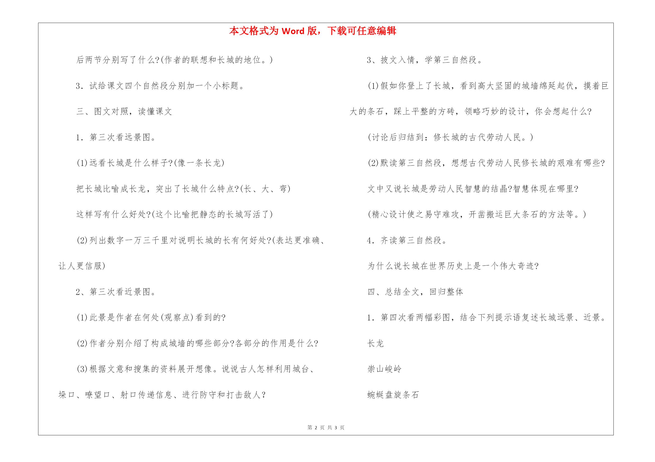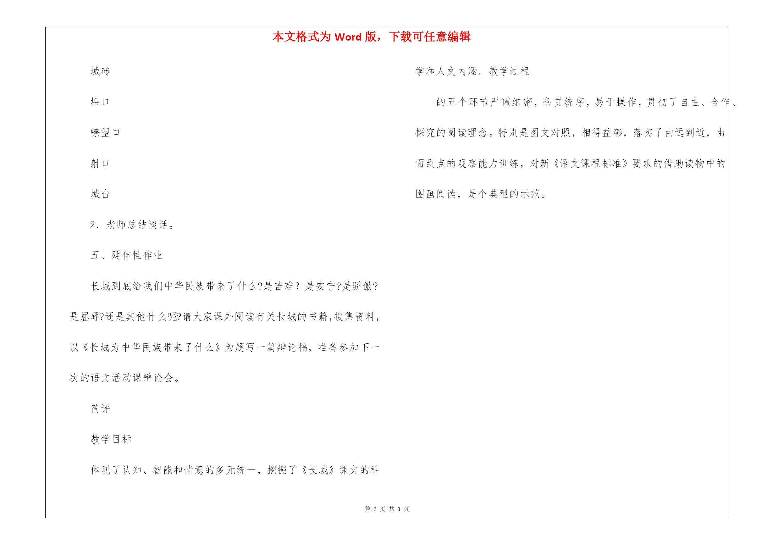 本文格式为Word版,下载可任意编辑第PAGE\*MERGEFORMAT3页共NUMPAGES\*MERGEFORMAT3页《长城》教学设计《长城》教学设计教学目标1.认知目标:掌握本课生字、生词,了解长城的概貌、构造、历史等。2.智能目标:①指导学生图文对照,学习由远及近、由整体到部分的观察方法,培养观察能力和良好的观察习惯。②读懂课文,理解每段话的意思及段与段之间的联系。3.情感目标:通过读文讨论,激发学生的民族自豪感和爱国主义情感。教学过程一、激情导人,观察插图,了解图意1.谈话导入,激发兴趣。在月球上用肉眼看地球,能看见的建筑物只有一座,那就是我国的长城。(板书课题)2.观察长城彩图,了解图意,学会观察方法(幻灯片打出与课本一样的两幅彩图)。(1)师:这两幅图都有长城,我们应该先观察哪一幅?为什么?(2)看远景图时应重点观察什么?(抓住观察重点:长城)你觉得长城看上去有何特点?(长、大、弯)再看近景图:你能看出长城有何特点?(高大、坚固)二、初读课文,整体感知1.自由朗读全文,说说刚才两幅彩图分别与文中哪些段落相对应。(第一幅与第一自然段,第二幅与第二自然段。)2.生讨论:课文三、四自然段为何没有图片与之对应?(不是作者所见之景,无法画出。)后两节分别写了什么?(作者的联想和长城的地位。)3.试给课文四个自然段分别加一个小标题。三、图文对照,读懂课文1.第三次看远景图。(1)远看长城是什么样子?(像一条长龙)把长城比喻成长龙,突出了长城什么特点?(长、大、弯)这样写有什么好处?(这个比喻把静态的长城写活了)(2)列出数字一万三千里对说明长城的长有何好处?(表达更准确、让人更信服)2、第三次看近景图。(1)此景是作者在何处(观察点)看到的?(2)作者分别介绍了构成城墙的哪些部分?各部分的作用是什么?(3)根据文意和搜集的资料展开想像。说说古人怎样利用城台、垛口、嘹望口、射口传递信息、进行防守和打击敌人?3、披文入情,学第三自然段。(1)假如你登上了长城,看到高大坚固的城墙绵延起伏,摸着巨大的条石,踩上平整的方砖,领略巧妙的设计,你会想起什么?(讨论后归结到:修长城的古代劳动人民。)(2)默读第三自然段,想想古代劳动人民修长城的艰难有哪些?文中又说长城是劳动人民智慧的结晶?智慧体现在哪里?(精心设计使之易守难攻,开凿搬运巨大条石的方法等。)4.齐读第三自然段。为什么说长城在世界历史上是一个伟大奇迹?四、总结全文,回归整体1.第四次看两幅彩图,结合下列提示语复述长城远景、近景。长龙崇山峻岭蜿蜒盘旋条石城砖垛口嘹望口射口城台2.老师总结谈话。五、延伸性作业长城到底给我们中华民族带来了什么?是苦难?是安宁?是骄傲?是屈辱?还是其他什么呢?请大家课外阅读有关长城的书籍,搜集资料,以《长城为中华民族带来了什么》为题写一篇辩论稿,准备参加下一次的语文活动课辩论会。简评教学目标体现了认知、智能和情意的多元统一,挖掘了《长城》课文的科学和人文内涵。教学过程的五个环节严谨细密,条贯统序,易于操作,贯彻了自主、合作、探究的阅读理念。特别是图文对照,相得益彰,落实了由远到近,由面到点的观察能力训练,对新《语文课程标准》要求的借助读物中的图画阅读,是个典型的示范。