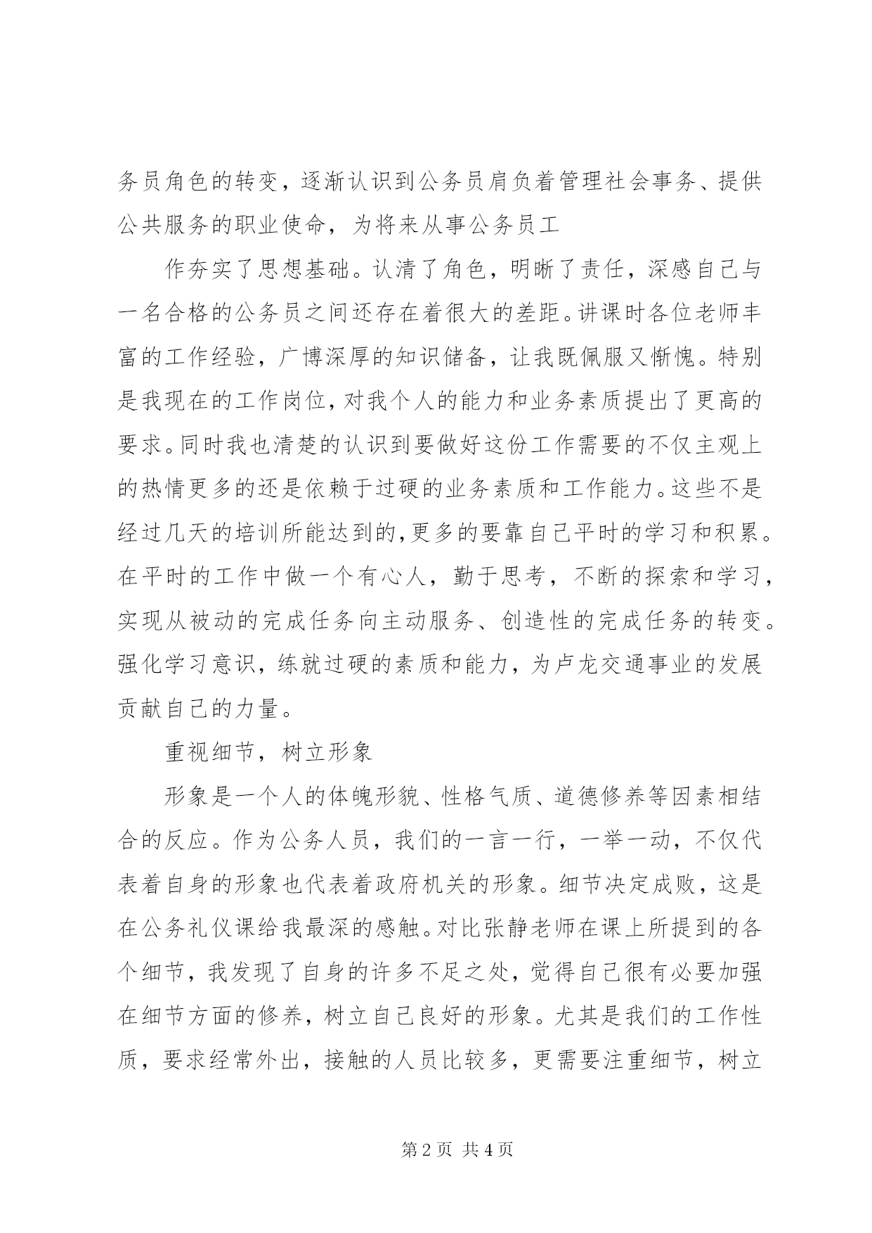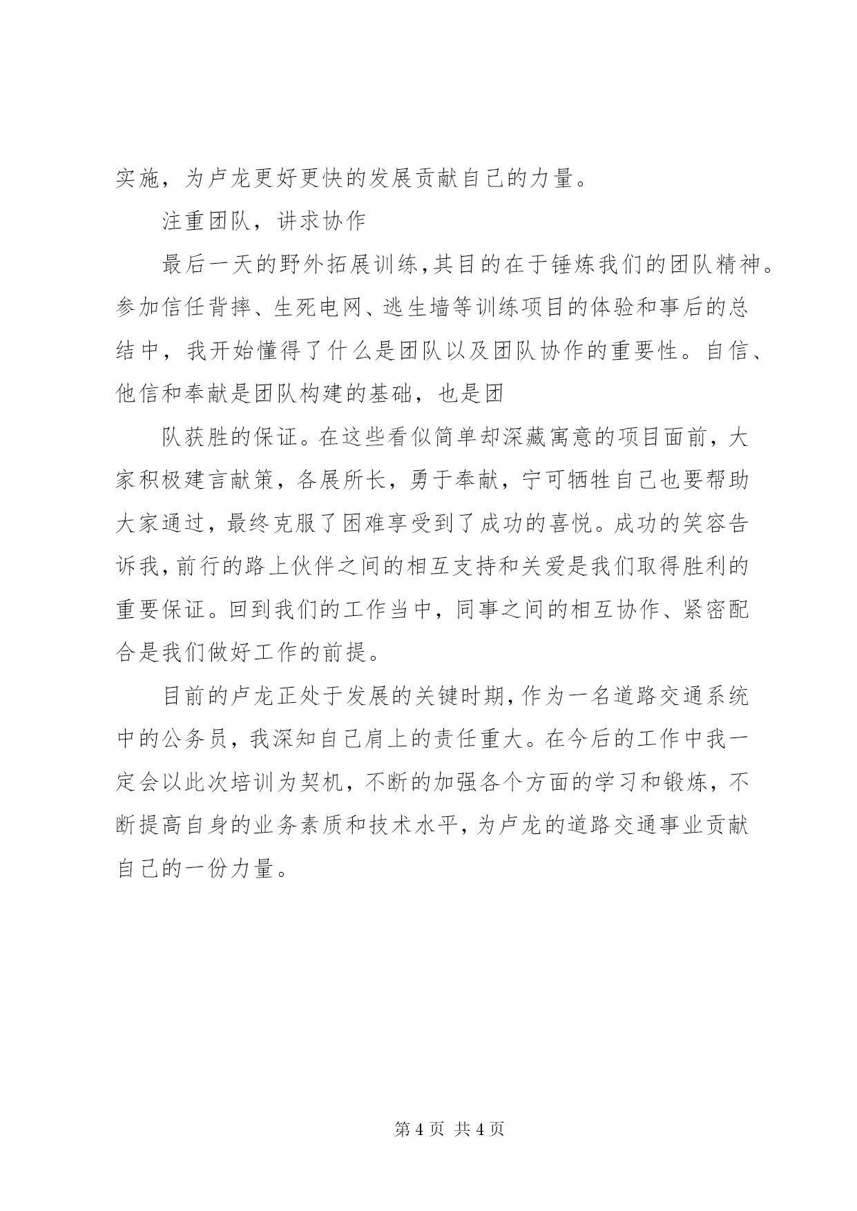 第PAGE\*Arabic\*MERGEFORMAT4页共NUMPAGES\*MERGEFORMAT4页初任公务员培训心得体会公务员初任培训心得体会为了促使新任公务员能尽快进入角色,真正融入到工作当中。县委组织部XX县区人力资源与社会保障局于2011年5月9日——2011年5月15日举办了为期一周的XX县区2010年四级联考录用公务员初任培训班,来自县直各单位和各乡镇的新任公务员齐聚XX县区委党校参加了这次培训。通过这一周组织严密,内容丰富的集中培训学习,我比较系统的了解了做为一名公务员所应具有的一些必备的技能和素质。在这次培训过程中,县委组织部和人社局以当前基层工作中常见的情况和初任公务员在工作中可能会遇到的一些问题为切入点,精心安排了一系列涵盖面全,内容实用的课程。请党校的多位专家,和检察院、县政府办、组织部等多位领导为我们授课。主要包括“十二五规划”的主题和主线的解读、公务员法、如何做好保密工作、依法行政、公务礼仪、公文写作、信访工作辅导、XX县区情介绍和预防职务犯罪讲座等九讲内容,从公务员应具备的基本技能、公务员的形象、团队精神和纪律约束等方面都进行了深入细致的讲解。回顾一周的培训,着实感到受益匪浅,现将自己的一些体会总结如下:转换角色,加强学习通过这一周的学习我顺利实现了由一名铁路职工到一名公务员角色的转变,逐渐认识到公务员肩负着管理社会事务、提供公共服务的职业使命,为将来从事公务员工作夯实了思想基础。认清了角色,明晰了责任,深感自己与一名合格的公务员之间还存在着很大的差距。讲课时各位老师丰富的工作经验,广博深厚的知识储备,让我既佩服又惭愧。特别是我现在的工作岗位,对我个人的能力和业务素质提出了更高的要求。同时我也清楚的认识到要做好这份工作需要的不仅主观上的热情更多的还是依赖于过硬的业务素质和工作能力。这些不是经过几天的培训所能达到的,更多的要靠自己平时的学习和积累。在平时的工作中做一个有心人,勤于思考,不断的探索和学习,实现从被动的完成任务向主动服务、创造性的完成任务的转变。强化学习意识,练就过硬的素质和能力,为卢龙交通事业的发展贡献自己的力量。重视细节,树立形象形象是一个人的体魄形貌、性格气质、道德修养等因素相结合的反应。作为公务人员,我们的一言一行,一举一动,不仅代表着自身的形象也代表着政府机关的形象。细节决定成败,这是在公务礼仪课给我最深的感触。对比张静老师在课上所提到的各个细节,我发现了自身的许多不足之处,觉得自己很有必要加强在细节方面的修养,树立自己良好的形象。尤其是我们的工作性质,要求经常外出,接触的人员比较多,更需要注重细节,树立在群众中的良好形象。既要做到外修其行,德才兼备,又要努力做到内修其心,谨言慎行。着衣得体,注重礼仪始终以一种昂扬向上的精神面貌去面对公众,时刻注意保持在公众中的印象,增强服务意识和责任意识,在和谐的氛围中做好各项工作。抓住机遇,迎接挑战通过政府办彭副主任对XX县区情和发展规划的详细介绍,使我了解了卢龙悠久的历史,看到了美好的发展前景。中国甘薯之乡、中国石门核桃之乡、中国孤竹文化之乡、中国诗词之乡、中国酿酒葡萄生产基地、中国孤竹文化研究中心等无数的美誉奠定了卢龙未来发展的基础。龙城工业区、下寨绿色化工园、印庄新型建材工业园、葡萄酒产业聚集区、秦皇岛西部工业区等工业区和龙河湾、山水边城桃林口、柳河山谷旅游金三角的规划让我看到了卢龙的希望。这些工业区、旅游区涵盖了我县几乎所有的乡镇,绝大多数村庄,这对我们的交通系统是个巨大的考验,如何能保障各个工业区、旅游区的交通顺畅,保证运输不会成为工业区的短板,旅游区不会因为道路影响旅客愉悦的心情,这就是未来几年我们交通人的奋斗目标。对我一名没有从事过公路工作的新人,这即是机遇又是挑战,只有抓住这次机遇,才能够更好的锻炼自己,充实自己,提升自己。不断的提升技术水平,丰富理论知识,积攒实践经验,才能够修通路,修好路,保障规划的实施,为卢龙更好更快的发展贡献自己的力量。注重团队,讲求协作最后一天的野外拓展训练,其目的在于锤炼我们的团队精神。参加信任背摔、生死电网、逃生墙等训练项目的体验和事后的总结中,我开始懂得了什么是团队以及团队协作的重要性。自信、他信和奉献是团队构建的基础,也是团队获胜的保证。在这些看似简单却深藏寓意的项目面前,大家积极建言献策,各展所长,勇于奉献,宁可牺牲自己也要帮助大家通过,最终克服了困难享受到了成功的喜悦。成功的笑容告诉我,前行的路上伙伴之间的相互支持和关爱是我们取得胜利的重要保证。回到我们的工作当中,同事之间的相互协作、紧密配合是我们做好工作的前提。目前的卢龙正处于发展的关键时期,作为一名道路交通系统中的公务员,我深知自己肩上的责任重大。在今后的工作中我一定会以此次培训为契机,不断的加强各个方面