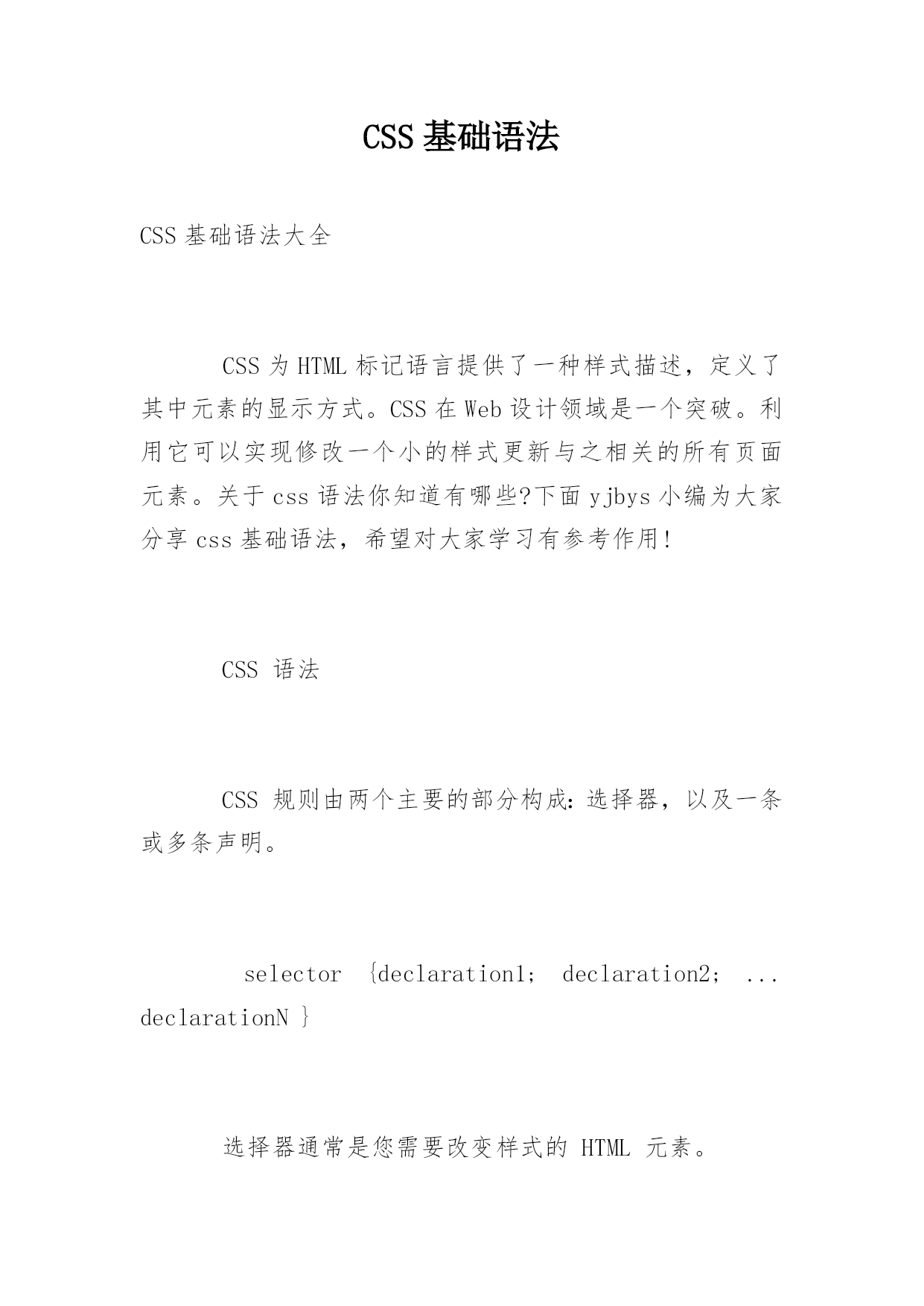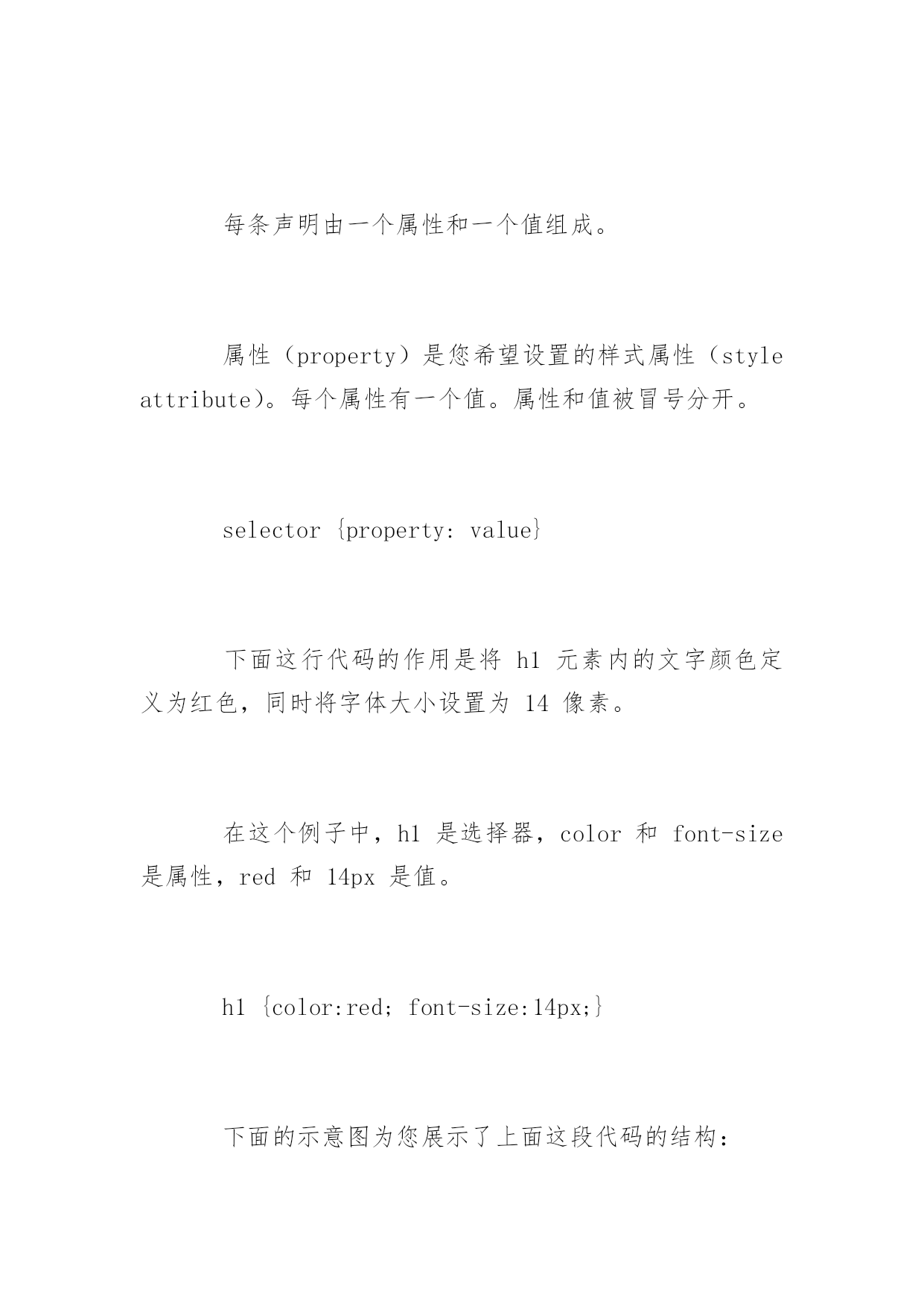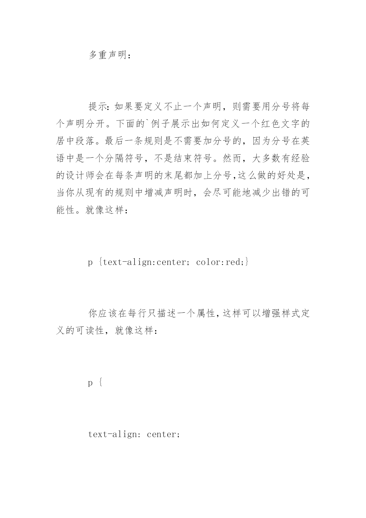 CSS基础语法CSS基础语法大全CSS为HTML标记语言提供了一种样式描述,定义了其中元素的显示方式。CSS在Web设计领域是一个突破。利用它可以实现修改一个小的样式更新与之相关的所有页面元素。关于css语法你知道有哪些?下面yjbys小编为大家分享css基础语法,希望对大家学习有参考作用!CSS语法CSS规则由两个主要的部分构成:选择器,以及一条或多条声明。selector{declaration1;declaration2;...declarationN}选择器通常是您需要改变样式的HTML元素。每条声明由一个属性和一个值组成。属性(property)是您希望设置的样式属性(styleattribute)。每个属性有一个值。属性和值被冒号分开。selector{property:value}下面这行代码的作用是将h1元素内的文字颜色定义为红色,同时将字体大小设置为14像素。在这个例子中,h1是选择器,color和font-size是属性,red和14px是值。h1{color:red;font-size:14px;}下面的示意图为您展示了上面这段代码的结构:提示:请使用花括号来包围声明。值的不同写法和单位除了英文单词red,我们还可以使用十六进制的颜色值#ff0000:p{color:#ff0000;}为了节约字节,我们可以使用CSS的缩写形式:p{color:#f00;}我们还可以通过两种方法使用RGB值:p{color:rgb(255,0,0);}p{color:rgb(100%,0%,0%);}请注意,当使用RGB百分比时,即使当值为0时也要写百分比符号。但是在其他的情况下就不需要这么做了。比如说,当尺寸为0像素时,0之后不需要使用px单位,因为0就是0,无论单位是什么。记得写引号提示:如果值为若干单词,则要给值加引号:p{font-family:"sansserif";}多重声明:提示:如果要定义不止一个声明,则需要用分号将每个声明分开。下面的`例子展示出如何定义一个红色文字的居中段落。最后一条规则是不需要加分号的,因为分号在英语中是一个分隔符号,不是结束符号。然而,大多数有经验的设计师会在每条声明的末尾都加上分号,这么做的好处是,当你从现有的规则中增减声明时,会尽可能地减少出错的可能性。就像这样:p{text-align:center;color:red;}你应该在每行只描述一个属性,这样可以增强样式定义的可读性,就像这样:p{text-align:center;color:black;font-family:arial;}空格和大小写大多数样式表包含不止一条规则,而大多数规则包含不止一个声明。多重声明和空格的使用使得样式表更容易被编辑:body{color:#000;background:#fff;margin:0;padding:0;font-family:Georgia,Palatino,serif;}是否包含空格不会影响CSS在浏览器的工作效果,同样,与XHTML不同,CSS对大小写不敏感。不过存在一个例外:如果涉及到与HTML文档一起工作的话,class和id名称对大小写是敏感的。