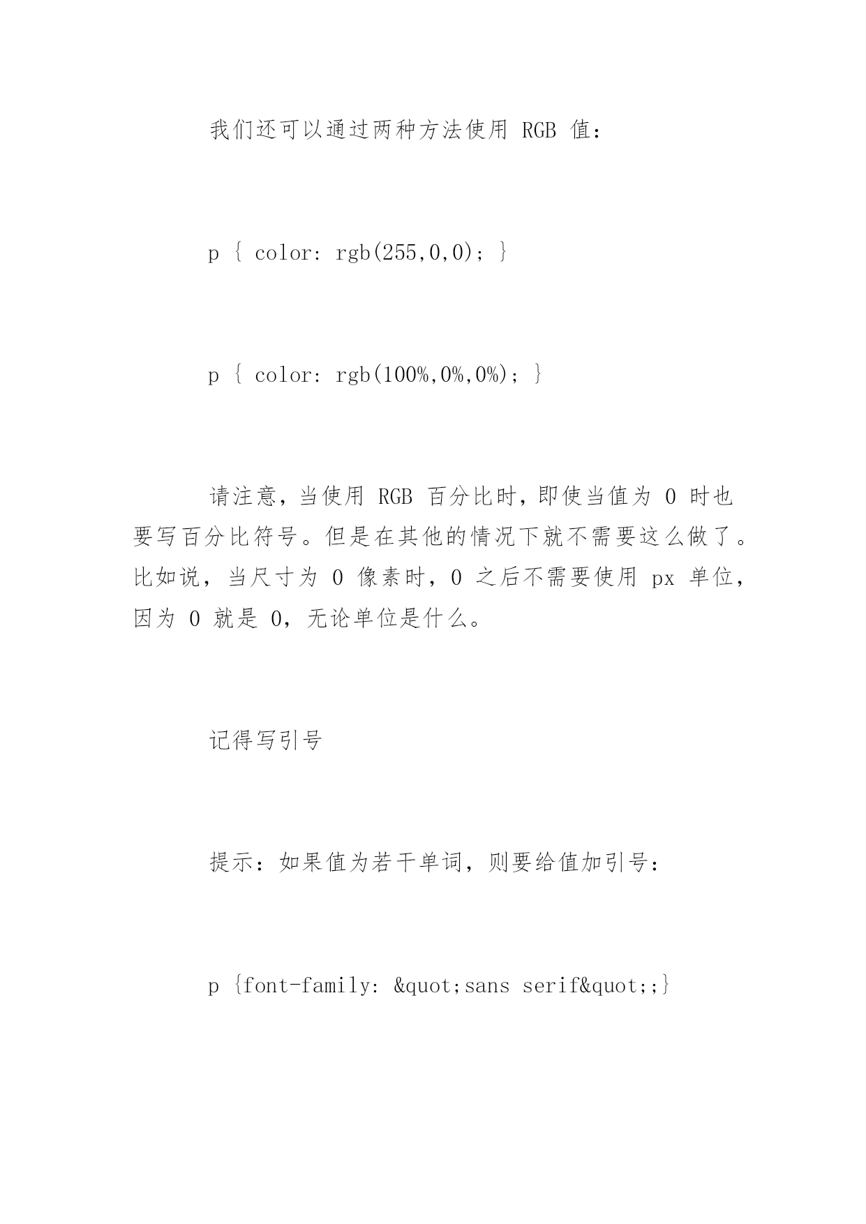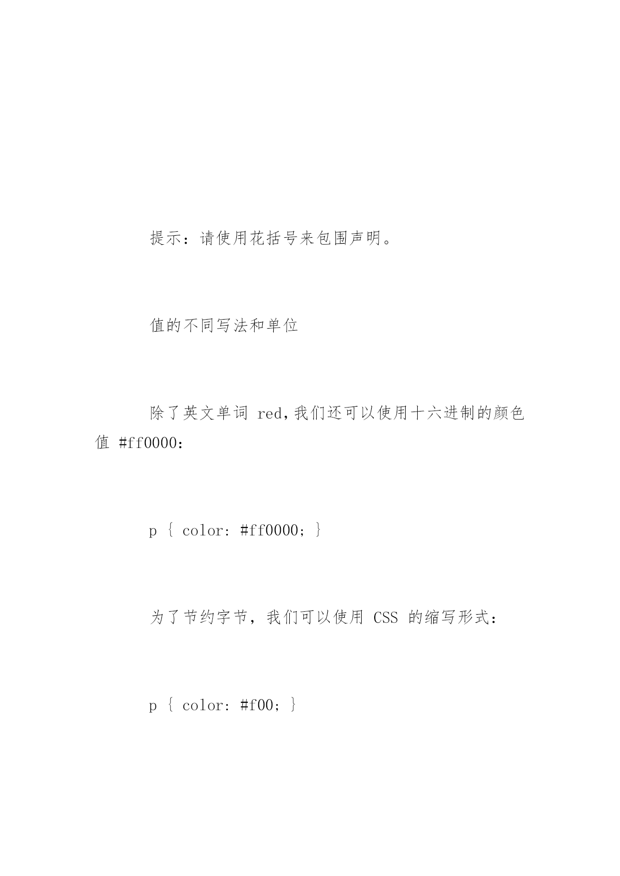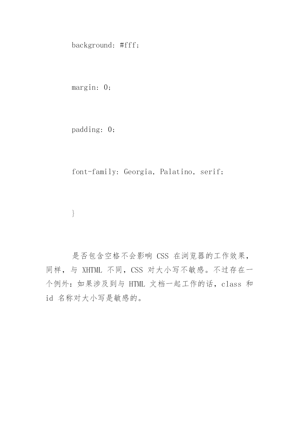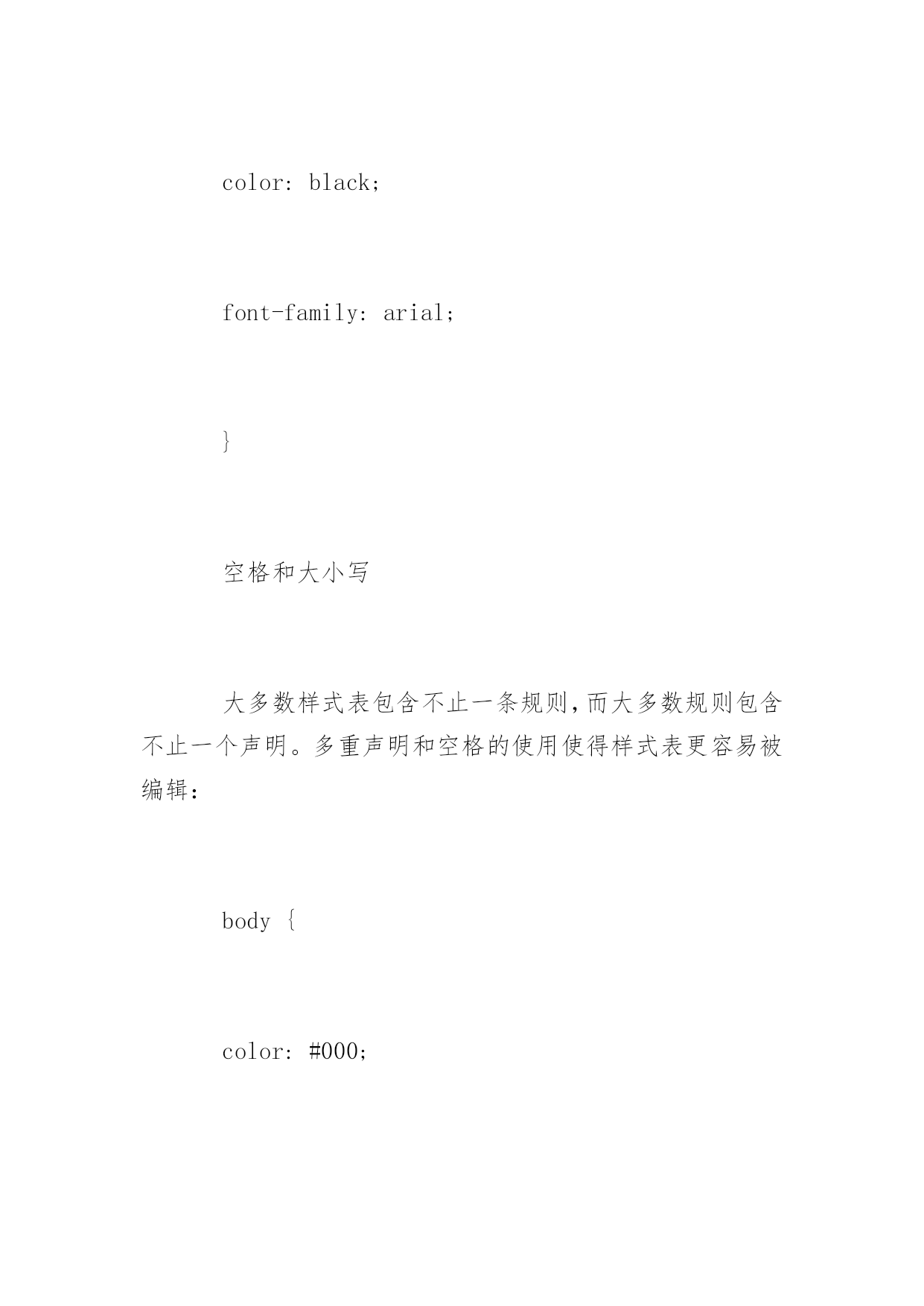 CSS基础语法CSS基础语法大全CSS为HTML标记语言提供了一种样式描述,定义了其中元素的显示方式。CSS在Web设计领域是一个突破。利用它可以实现修改一个小的样式更新与之相关的所有页面元素。关于css语法你知道有哪些?下面yjbys小编为大家分享css基础语法,希望对大家学习有参考作用!CSS语法CSS规则由两个主要的部分构成:选择器,以及一条或多条声明。selector{declaration1;declaration2;...declarationN}选择器通常是您需要改变样式的HTML元素。每条声明由一个属性和一个值组成。属性(property)是您希望设置的样式属性(styleattribute)。每个属性有一个值。属性和值被冒号分开。selector{property:value}下面这行代码的作用是将h1元素内的文字颜色定义为红色,同时将字体大小设置为14像素。在这个例子中,h1是选择器,color和font-size是属性,red和14px是值。h1{color:red;font-size:14px;}下面的示意图为您展示了上面这段代码的结构:提示:请使用花括号来包围声明。值的不同写法和单位除了英文单词red,我们还可以使用十六进制的颜色值#ff0000:p{color:#ff0000;}为了节约字节,我们可以使用CSS的缩写形式:p{color:#f00;}我们还可以通过两种方法使用RGB值:p{color:rgb(255,0,0);}p{color:rgb(100%,0%,0%);}请注意,当使用RGB百分比时,即使当值为0时也要写百分比符号。但是在其他的情况下就不需要这么做了。比如说,当尺寸为0像素时,0之后不需要使用px单位,因为0就是0,无论单位是什么。记得写引号提示:如果值为若干单词,则要给值加引号:p{font-family:"sansserif";}多重声明:提示:如果要定义不止一个声明,则需要用分号将每个声明分开。下面的`例子展示出如何定义一个红色文字的居中段落。最后一条规则是不需要加分号的,因为分号在英语中是一个分隔符号,不是结束符号。然而,大多数有经验的设计师会在每条声明的末尾都加上分号,这么做的好处是,当你从现有的规则中增减声明时,会尽可能地减少出错的可能性。就像这样:p{text-align:center;color:red;}你应该在每行只描述一个属性,这样可以增强样式定义的可读性,就像这样:p{text-align:center;color:black;font-family:arial;}空格和大小写大多数样式表包含不止一条规则,而大多数规则包含不止一个声明。多重声明和空格的使用使得样式表更容易被编辑:body{color:#000;background:#fff;margin:0;padding:0;font-family:Georgia,Palatino,serif;}是否包含空格不会影响CSS在浏览器的工作效果,同样,与XHTML不同,CSS对大小写不敏感。不过存在一个例外:如果涉及到与HTML文档一起工作的话,class和id名称对大小写是敏感的。