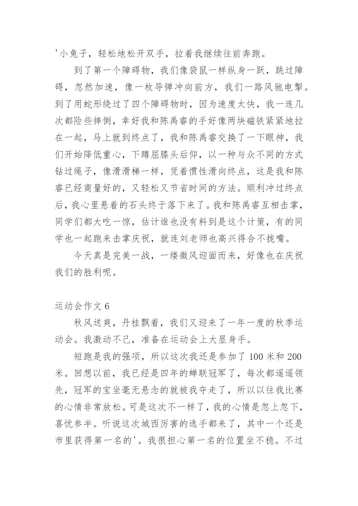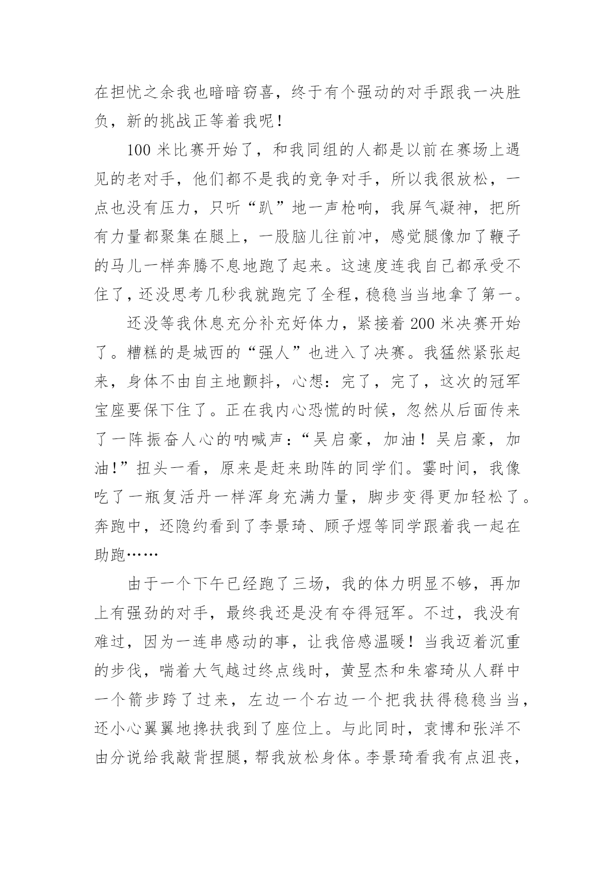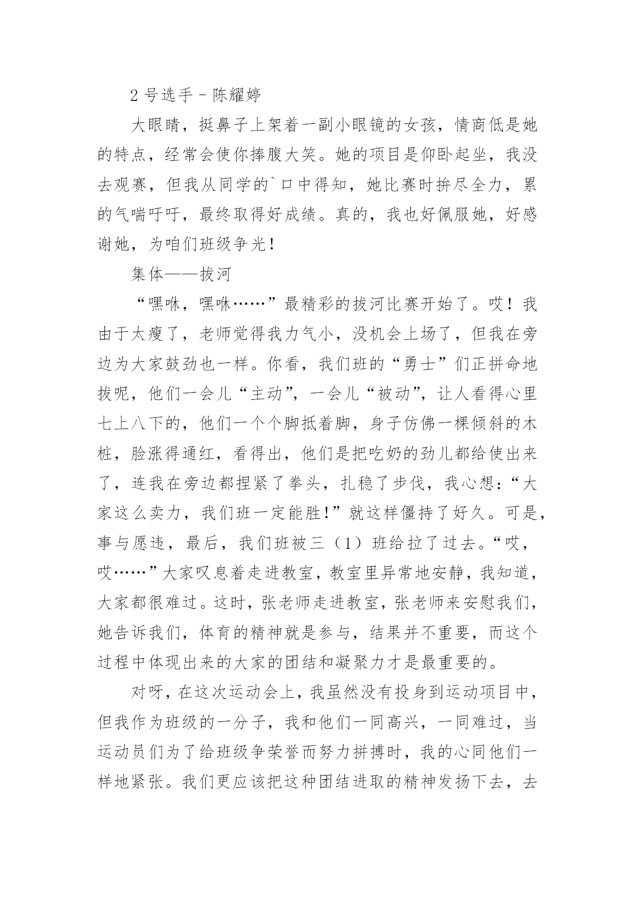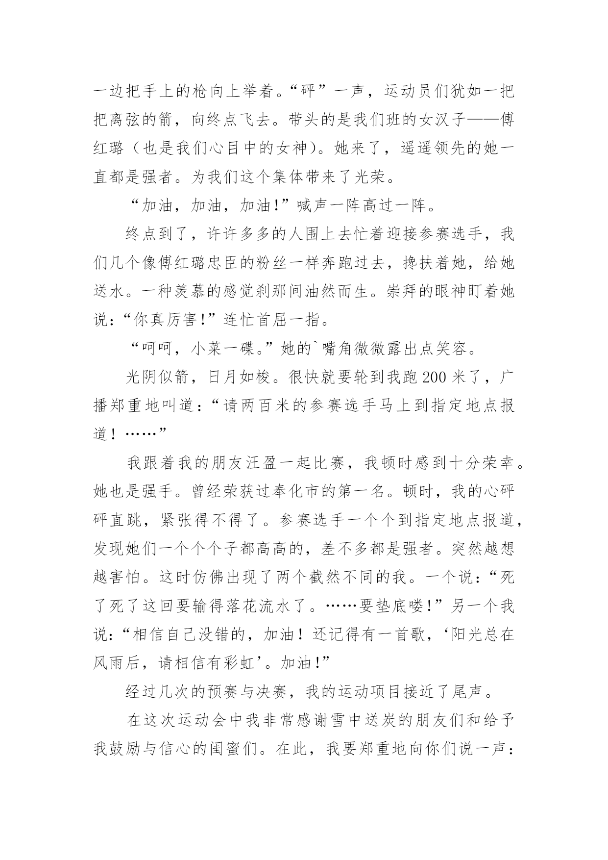 运动会作文在学习、工作或生活中,说到作文,大家肯定都不陌生吧,借助作文人们可以反映客观事物、表达思想感情、传递知识信息。如何写一篇有思想、有文采的作文呢?以下是小编收集整理的运动会作文,欢迎大家借鉴与参考,希望对大家有所帮助。运动会作文1今天,天气特别好,阳光暖暖的,就是这样的一个好日子,我们学校的秋季运动会开始了。同学们在阳光下跳着、跑着,啦啦队的同学们在为所有的选手加油呢!相信,这次运动会将会是一次别开生面的盛会。我作为本次运动会的一名小记者,走遍赛场的每一个角落,今天,我就给你介绍一些选手和项目吧!1号选手-徐双红徐双红,1米25左右,有黑黑的皮肤、大大的眼睛、扁扁的嘴巴、再配上那大大的鼻子,呵……看起来有点幼稚。他参加的项目是200米赛跑,平时笨拙的他,竟像猴子一样上蹿下跳!“我的天哪!”我尖叫起来,快到终点了,有几个人要超过他了,他使出浑身力气,终于甩掉他们了,拿到了季军。事后,我对他说:“行呀,看不出你还这么有天赋。”他就“装酷”地笑了起来。“傻瓜,嘚瑟!”我在心里骂了一声。不过,他为我们班级争得了荣誉,我还是挺佩服他的。2号选手–陈耀婷大眼睛,挺鼻子上架着一副小眼镜的女孩,情商低是她的特点,经常会使你捧腹大笑。她的项目是仰卧起坐,我没去观赛,但我从同学的`口中得知,她比赛时拚尽全力,累的气喘吁吁,最终取得好成绩。真的,我也好佩服她,好感谢她,为咱们班级争光!集体——拔河“嘿咻,嘿咻……”最精彩的拔河比赛开始了。哎!我由于太瘦了,老师觉得我力气小,没机会上场了,但我在旁边为大家鼓劲也一样。你看,我们班的“勇士”们正拼命地拔呢,他们一会儿“主动”,一会儿“被动”,让人看得心里七上八下的,他们一个个脚抵着脚,身子仿佛一棵倾斜的木桩,脸涨得通红,看得出,他们是把吃奶的劲儿都给使出来了,连我在旁边都捏紧了拳头,扎稳了步伐,我心想:“大家这么卖力,我们班一定能胜!”就这样僵持了好久。可是,事与愿违,最后,我们班被三(1)班给拉了过去。“哎,哎……”大家叹息着走进教室,教室里异常地安静,我知道,大家都很难过。这时,张老师走进教室,张老师来安慰我们,她告诉我们,体育的精神就是参与,结果并不重要,而这个过程中体现出来的大家的团结和凝聚力才是最重要的。对呀,在这次运动会上,我虽然没有投身到运动项目中,但我作为班级的一分子,我和他们一同高兴,一同难过,当运动员们为了给班级争荣誉而努力拼搏时,我的心同他们一样地紧张。我们更应该把这种团结进取的精神发扬下去,去帮助需要帮助的同学,大家团结奋进,让我们的班级变得更加优秀!运动会作文2"加油,加油!"一阵阵助威声此起彼伏响遍了整个操场。咦,这是在干什么呢?哦,原来是我们学校在开运动会呢。400米长跑马上就要开始了。各班选出来的体育健儿依次站在起跑线上。只听见"砰"一声枪响,运动员立即后脚猛地一蹬,摆开手臂,迈开步子,使出浑身解数向前跑去。"加油,加油!"由弱转强的`加油声震耳欲聋,只见我们班的运动员像只飞奔在赛场上的小鹿。运动员们的距离一会儿拉近,一会儿又扯远,你追我赶不相上下。临近终点,他们个个咬紧牙关,像离弦的箭一般奋力向前冲刺。"胜利了!"我们班的运动员以最快的速度取得了400米长跑的第一名,真是大快人心啊!运动会作文3秋高气爽,金桂飘香。在这个美好的气氛里迎来了第xxx届运动会。这是我们进入初中以来,迎接的第一个如此紧张、精彩的比赛。紧张而又激烈的比赛正式开始了。首先,开始的是100米短跑比赛。瞧,一个个生龙活虎的运动员们站在起跑线上,做着准备活动。“各就各位,预备——”裁判员丁老师对着同学们叫着,一边把手上的枪向上举着。“砰”一声,运动员们犹如一把把离弦的箭,向终点飞去。带头的是我们班的女汉子——傅红璐(也是我们心目中的女神)。她来了,遥遥领先的她一直都是强者。为我们这个集体带来了光荣。“加油,加油,加油!”喊声一阵高过一阵。终点到了,许许多多的人围上去忙着迎接参赛选手,我们几个像傅红璐忠臣的粉丝一样奔跑过去,搀扶着她,给她送水。一种羡慕的感觉刹那间油然而生。崇拜的眼神盯着她说:“你真厉害!”连忙首屈一指。“呵呵,小菜一碟。”她的`嘴角微微露出点笑容。光阴似箭,日月如梭。很快就要轮到我跑200米了,广播郑重地叫道:“请两百米的参赛选手马上到指定地点报道!……”我跟着我的朋友汪盈一起比赛,我顿时感到十分荣幸。她也是强手。曾经荣获过奉化市的第一名。顿时,我的心砰砰直跳,紧张得不得了。参赛选手一个个到指定地点报道,发现她们一个个个子都高高的,差不多都是强者。突然越想越害怕。这时仿佛出现了两个截然不同的我。一个说:“死了死了这回要输得落花流水了。……要垫底喽!”另一个我说:“相信自己没错的,加油!还记得有一首歌,‘阳光总在风雨后,请相信有彩虹’。加油!”经过几次的预赛与决赛,我的运动项目