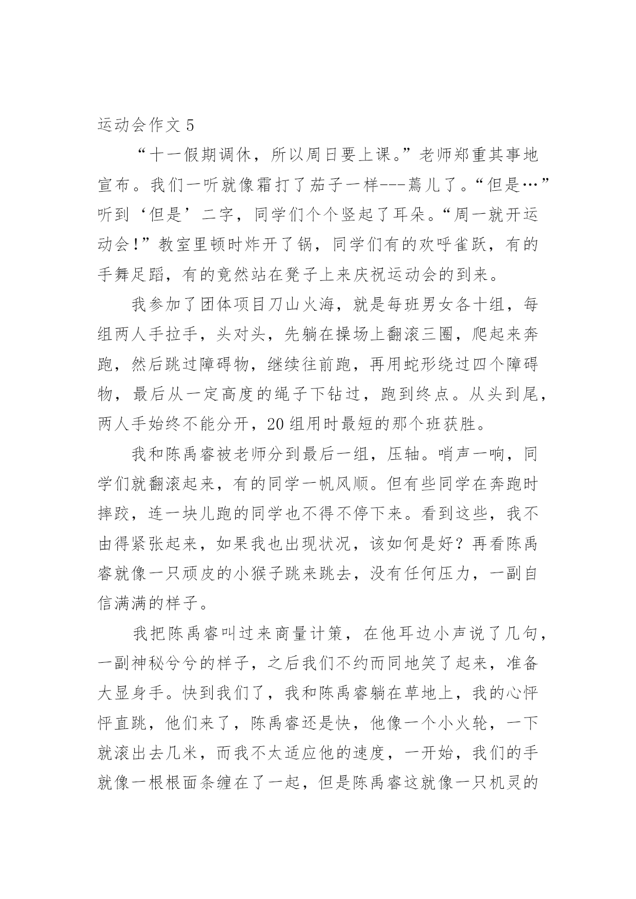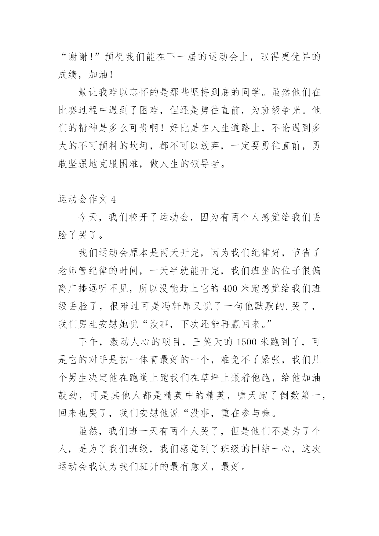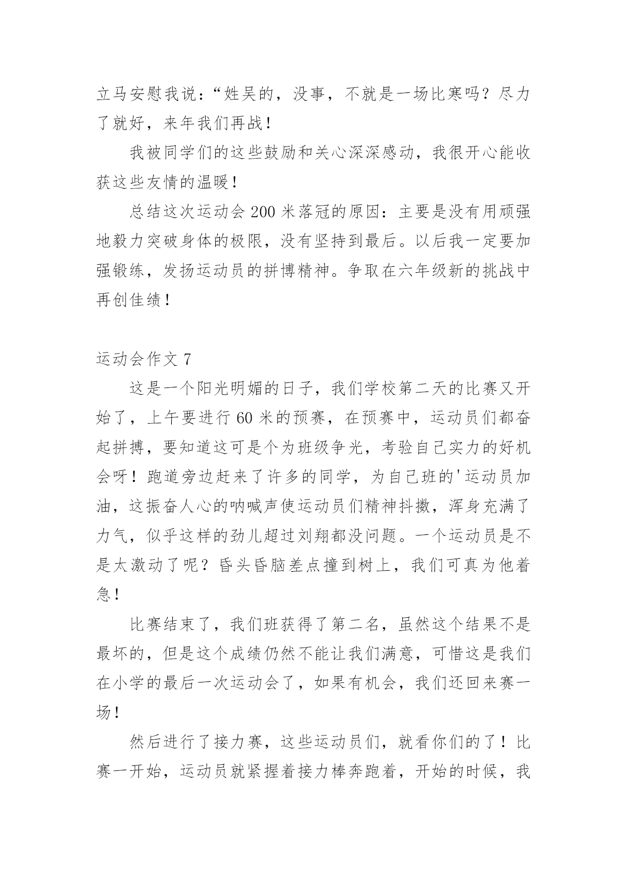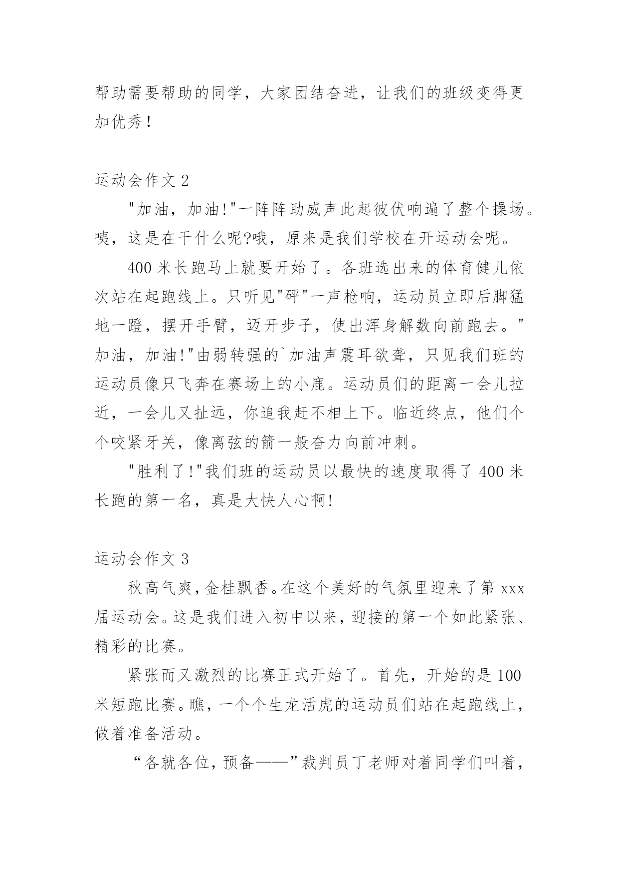 运动会作文在学习、工作或生活中,说到作文,大家肯定都不陌生吧,借助作文人们可以反映客观事物、表达思想感情、传递知识信息。如何写一篇有思想、有文采的作文呢?以下是小编收集整理的运动会作文,欢迎大家借鉴与参考,希望对大家有所帮助。运动会作文1今天,天气特别好,阳光暖暖的,就是这样的一个好日子,我们学校的秋季运动会开始了。同学们在阳光下跳着、跑着,啦啦队的同学们在为所有的选手加油呢!相信,这次运动会将会是一次别开生面的盛会。我作为本次运动会的一名小记者,走遍赛场的每一个角落,今天,我就给你介绍一些选手和项目吧!1号选手-徐双红徐双红,1米25左右,有黑黑的皮肤、大大的眼睛、扁扁的嘴巴、再配上那大大的鼻子,呵……看起来有点幼稚。他参加的项目是200米赛跑,平时笨拙的他,竟像猴子一样上蹿下跳!“我的天哪!”我尖叫起来,快到终点了,有几个人要超过他了,他使出浑身力气,终于甩掉他们了,拿到了季军。事后,我对他说:“行呀,看不出你还这么有天赋。”他就“装酷”地笑了起来。“傻瓜,嘚瑟!”我在心里骂了一声。不过,他为我们班级争得了荣誉,我还是挺佩服他的。2号选手–陈耀婷大眼睛,挺鼻子上架着一副小眼镜的女孩,情商低是她的特点,经常会使你捧腹大笑。她的项目是仰卧起坐,我没去观赛,但我从同学的`口中得知,她比赛时拚尽全力,累的气喘吁吁,最终取得好成绩。真的,我也好佩服她,好感谢她,为咱们班级争光!集体——拔河“嘿咻,嘿咻……”最精彩的拔河比赛开始了。哎!我由于太瘦了,老师觉得我力气小,没机会上场了,但我在旁边为大家鼓劲也一样。你看,我们班的“勇士”们正拼命地拔呢,他们一会儿“主动”,一会儿“被动”,让人看得心里七上八下的,他们一个个脚抵着脚,身子仿佛一棵倾斜的木桩,脸涨得通红,看得出,他们是把吃奶的劲儿都给使出来了,连我在旁边都捏紧了拳头,扎稳了步伐,我心想:“大家这么卖力,我们班一定能胜!”就这样僵持了好久。可是,事与愿违,最后,我们班被三(1)班给拉了过去。“哎,哎……”大家叹息着走进教室,教室里异常地安静,我知道,大家都很难过。这时,张老师走进教室,张老师来安慰我们,她告诉我们,体育的精神就是参与,结果并不重要,而这个过程中体现出来的大家的团结和凝聚力才是最重要的。对呀,在这次运动会上,我虽然没有投身到运动项目中,但我作为班级的一分子,我和他们一同高兴,一同难过,当运动员们为了给班级争荣誉而努力拼搏时,我的心同他们一样地紧张。我们更应该把这种团结进取的精神发扬下去,去帮助需要帮助的同学,大家团结奋进,让我们的班级变得更加优秀!运动会作文2"加油,加油!"一阵阵助威声此起彼伏响遍了整个操场。咦,这是在干什么呢?哦,原来是我们学校在开运动会呢。400米长跑马上就要开始了。各班选出来的体育健儿依次站在起跑线上。只听见"砰"一声枪响,运动员立即后脚猛地一蹬,摆开手臂,迈开步子,使出浑身解数向前跑去。"加油,加油!"由弱转强的`加油声震耳欲聋,只见我们班的运动员像只飞奔在赛场上的小鹿。运动员们的距离一会儿拉近,一会儿又扯远,你追我赶不相上下。临近终点,他们个个咬紧牙关,像离弦的箭一般奋力向前冲刺。"胜利了!"我们班的运动员以最快的速度取得了400米长跑的第一名,真是大快人心啊!运动会作文3秋高气爽,金桂飘香。在这个美好的气氛里迎来了第xxx届运动会。这是我们进入初中以来,迎接的第一个如此紧张、精彩的比赛。紧张而又激烈的比赛正式开始了。首先,开始的是100米短跑比赛。瞧,一个个生龙活虎的运动员们站在起跑线上,做着准备活动。“各就各位,预备——”裁判员丁老师对着同学们叫着,一边把手上的枪向上举着。“砰”一声,运动员们犹如一把把离弦的箭,向终点飞去。带头的是我们班的女汉子——傅红璐(也是我们心目中的女神)。她来了,遥遥领先的她一直都是强者。为我们这个集体带来了光荣。“加油,加油,加油!”喊声一阵高过一阵。终点到了,许许多多的人围上去忙着迎接参赛选手,我们几个像傅红璐忠臣的粉丝一样奔跑过去,搀扶着她,给她送水。一种羡慕的感觉刹那间油然而生。崇拜的眼神盯着她说:“你真厉害!”连忙首屈一指。“呵呵,小菜一碟。”她的`嘴角微微露出点笑容。光阴似箭,日月如梭。很快就要轮到我跑200米了,广播郑重地叫道:“请两百米的参赛选手马上到指定地点报道!……”我跟着我的朋友汪盈一起比赛,我顿时感到十分荣幸。她也是强手。曾经荣获过奉化市的第一名。顿时,我的心砰砰直跳,紧张得不得了。参赛选手一个个到指定地点报道,发现她们一个个个子都高高的,差不多都是强者。突然越想越害怕。这时仿佛出现了两个截然不同的我。一个说:“死了死了这回要输得落花流水了。……要垫底喽!”另一个我说:“相信自己没错的,加油!还记得有一首歌,‘阳光总在风雨后,请相信有彩虹’。加油!”经过几次的预赛与决赛,我的运动项目