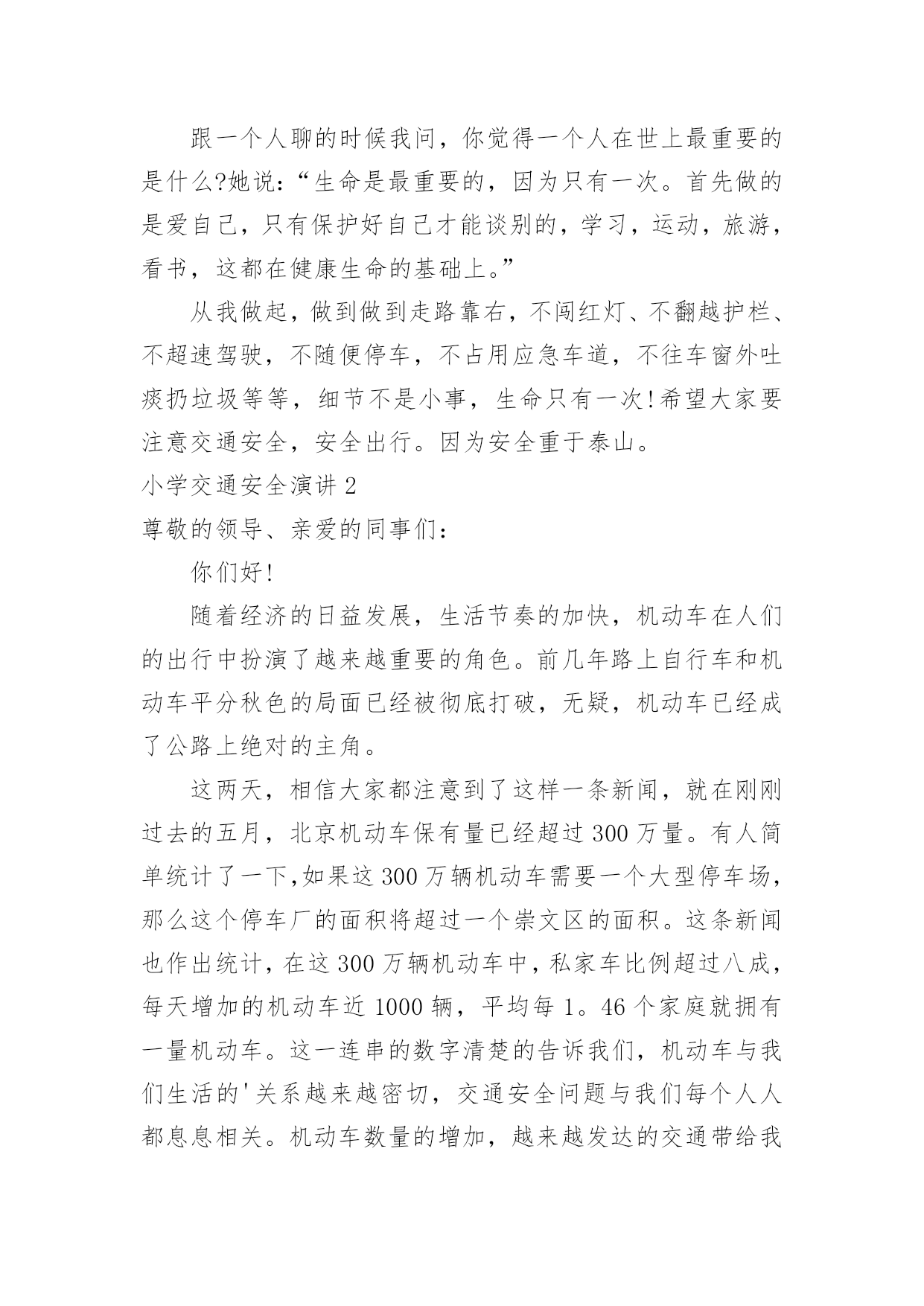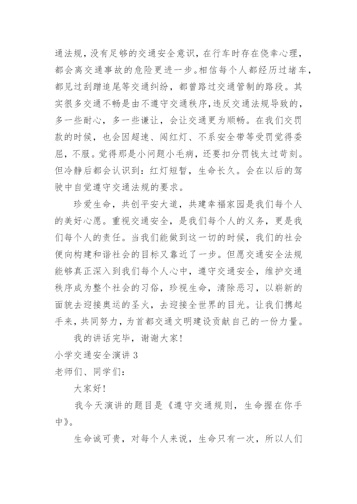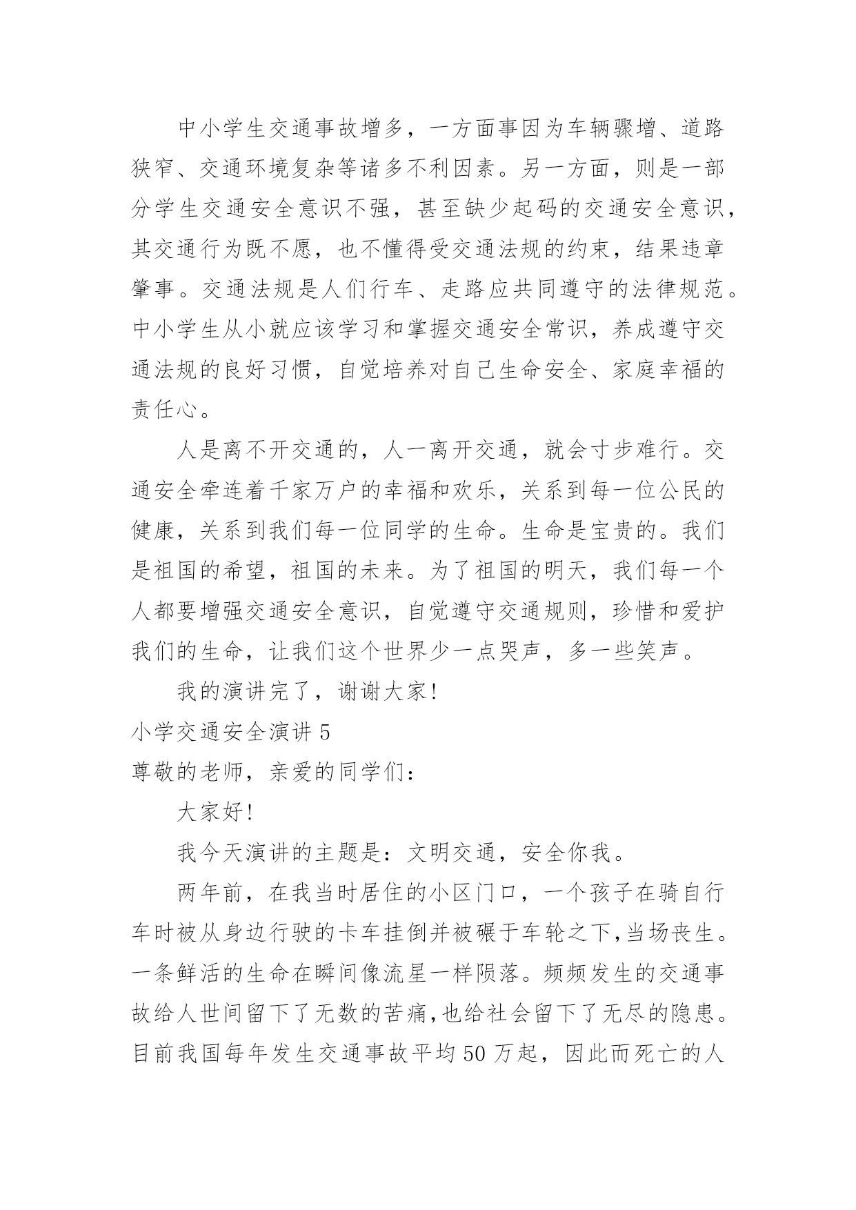 小学交通安全演讲小学交通安全演讲小学交通安全演讲1尊敬的老师,亲爱的同学们:大家好!交通安全教育,对一个学校,一个家庭,对我们每一个人本来说都是不能缺少的,教育是形式,安全是目的,学校以各种方式教育孩子,安全很重要,教育形式也是多种多样,我们看到很多横幅上写着:珍爱生命,安全出行。礼让是美德,安全是幸福。安全来自警惕,事故出于麻痹。一停二看三通过,麻痹大意是灾祸。我们不能仅仅当成标语,而是将内容牢记在心,交通安全是我们时时刻刻需要警示的。每次跟同学们外出,我都以身作则,绝不闯红灯,并且适时地告诉他们,一定记得交通规则不是限制你的自由,而是让我们的出行更畅通,假如人人都按照自己的.意愿闯红灯,翻栏杆,逆向行驶,存在严重的隐患,行驶的车辆不能做到及时刹车,一出事故就后悔来不及。昨天中午,路口上一个骑电动车的突然拐弯,就在那时车已经到了跟前,只听咣当一声,电动车到地上,人也严重受伤,急救车迅速赶到,这就是血的教训,过路口不看车,并且想走哪走哪,视道理交通规则为儿戏,付出的代价也是相当沉重。跟一个人聊的时候我问,你觉得一个人在世上最重要的是什么?她说:“生命是最重要的,因为只有一次。首先做的是爱自己,只有保护好自己才能谈别的,学习,运动,旅游,看书,这都在健康生命的基础上。”从我做起,做到做到走路靠右,不闯红灯、不翻越护栏、不超速驾驶,不随便停车,不占用应急车道,不往车窗外吐痰扔垃圾等等,细节不是小事,生命只有一次!希望大家要注意交通安全,安全出行。因为安全重于泰山。小学交通安全演讲2尊敬的领导、亲爱的同事们:你们好!随着经济的日益发展,生活节奏的加快,机动车在人们的出行中扮演了越来越重要的角色。前几年路上自行车和机动车平分秋色的局面已经被彻底打破,无疑,机动车已经成了公路上绝对的主角。这两天,相信大家都注意到了这样一条新闻,就在刚刚过去的五月,北京机动车保有量已经超过300万量。有人简单统计了一下,如果这300万辆机动车需要一个大型停车场,那么这个停车厂的面积将超过一个崇文区的面积。这条新闻也作出统计,在这300万辆机动车中,私家车比例超过八成,每天增加的机动车近1000辆,平均每1。46个家庭就拥有一量机动车。这一连串的数字清楚的告诉我们,机动车与我们生活的'关系越来越密切,交通安全问题与我们每个人人都息息相关。机动车数量的增加,越来越发达的交通带给我们每个人方便与快捷的同时,触目惊心的交通事故却成为不和谐的音符,不时地敲响警钟,提醒我们出行时要时刻注意交通安全问题。首先我十分庆幸自己没有亲眼目睹过惨烈的交通事故。但作为一个刚刚拿到驾驶证的新司机来说,在交通法规培训时看的录像还历历在目。我永远也忘不了那个坐在篮球里用手走路的小女孩,忘不了那个还未出生就失去双亲的孩子……更多的由交通事故造成的人间悲剧让人不忍再提起。每一次交通事故都让人扼腕痛惜,不知有多少美满幸福的家庭在交通事故中终结,幸福的往事成为永远的回忆。每次看到交通事故的新闻报导,都会让我想起这样一个故事:几个学者与一个老者同船共渡。学者们问老者是否懂得什么是哲学,老者连连摇头。学者们纷纷叹息:那你已经失去了一半的生命。这时一个巨浪打来,小船被掀翻了,老者问:”你们会不会游泳啊?”学者们异口同声地说不会。老者叹口气说:”那你们就失去了全部的生命。”虽然这只是一个故事,但其中蕴含的哲理却耐人寻味。灾难对每个人来说,不分贫富贵贱,不论性别年龄。工人、学生、农民、知识分子……无论咿呀学语,还是耄耋老人,无论家徒四壁,还是学富五车,如果缺少应有的警惕,不懂起码的安全常识,那么,危险一旦降临,本可能逃离的厄运,却都会在意料之外、客观之中发生了。同样道理,交通安全问题也摆在我们每个人面前,并不会因为身份,贫富,年龄等的差异而有不同。不认真学习交通法规,没有足够的交通安全意识,在行车时存在侥幸心理,都会离交通事故的危险更进一步。相信每个人都经历过堵车,都见过刮蹭追尾等交通纠纷,都曾路过交通管制的路段。其实很多交通不畅是由不遵守交通秩序,违反交通法规导致的,多一些耐心,多一些谦让,会让交通更为顺畅。在我们交罚款的时候,也会因超速、闯红灯、不系安全带等受罚觉得委屈,不服。觉得那是小问题小毛病,还要扣分罚钱太过苛刻。但冷静后都会认识到:红灯短暂,生命长久。会在以后的驾驶中自觉遵守交通法规的要求。珍爱生命,共创平安大道,共建幸福家园是我们每个人的美好心愿。重视交通安全,是我们每个人的义务,更是我们每个人的责任。当我们能做到这一切的时候,我们的社会便向构建和谐社会的目标又靠近了一步。但愿交通安全法规能够真正深入到我们每个人心中,遵守交通安全,维护交通秩序成为整个社会的习俗,珍视生命,清除恶习,以崭新的面貌去迎接奥运的圣火,去迎接全世界的目光。让我们携起手来,共同努力,为首都交通文明建设贡献自己