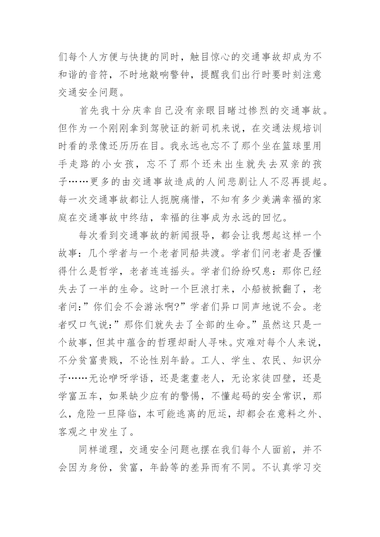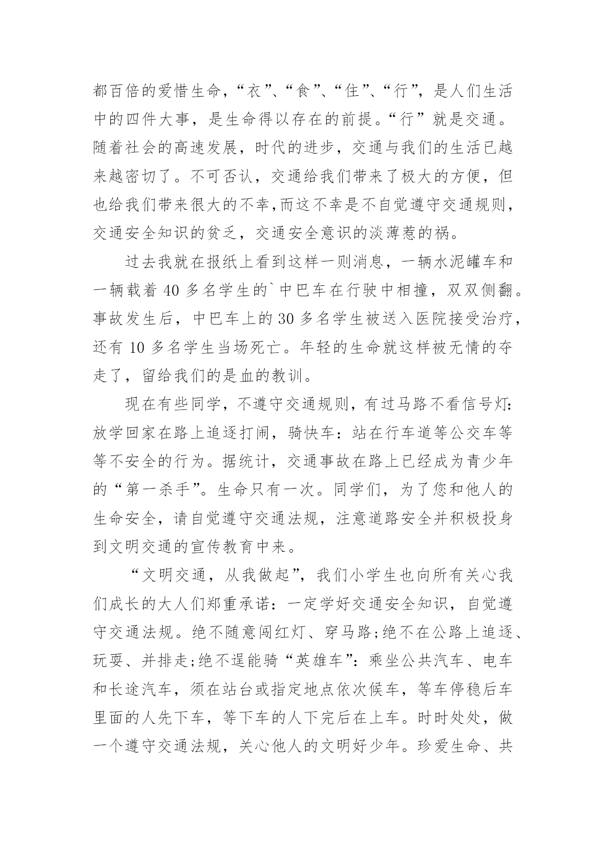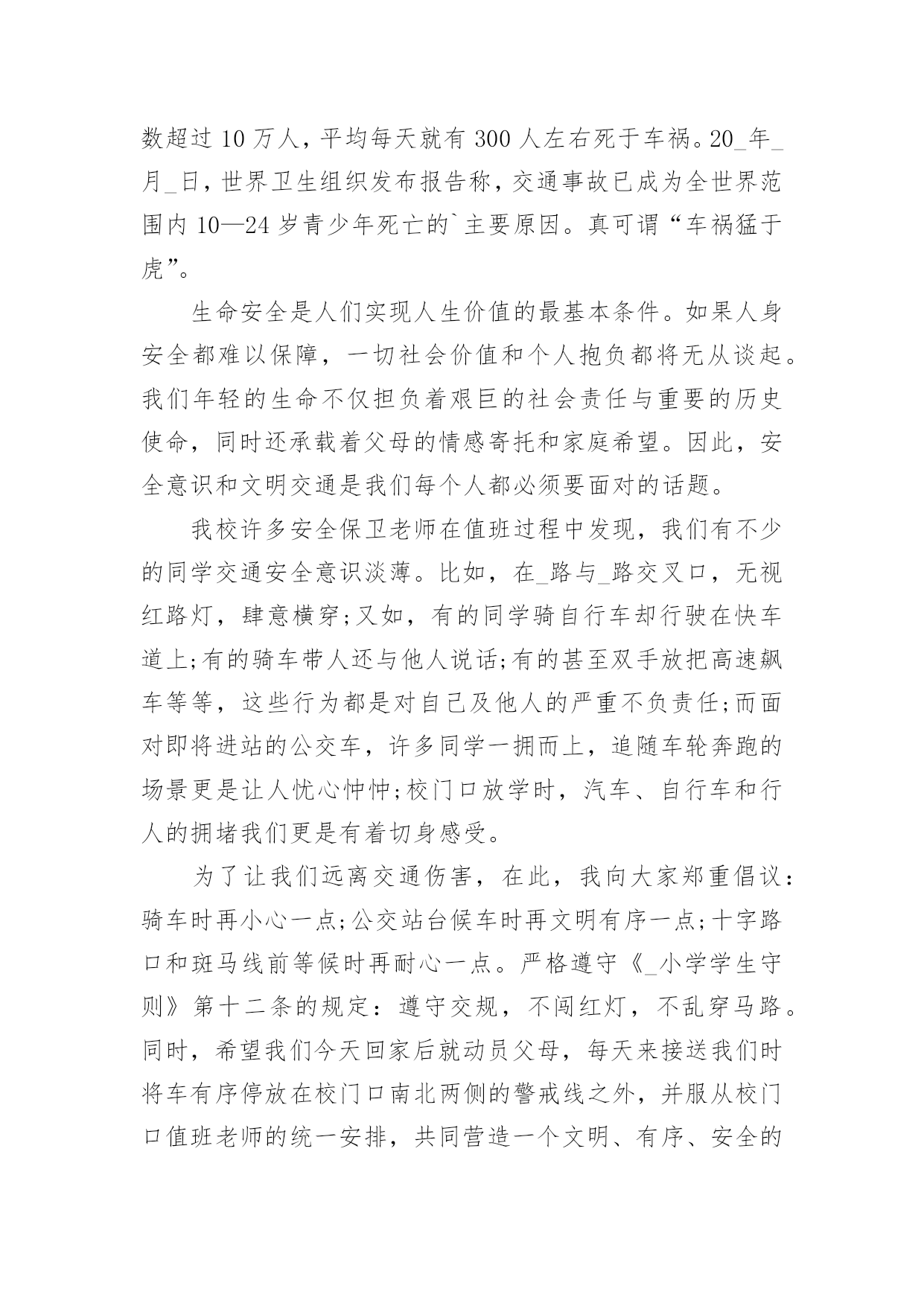 小学交通安全演讲小学交通安全演讲小学交通安全演讲1尊敬的老师,亲爱的同学们:大家好!交通安全教育,对一个学校,一个家庭,对我们每一个人本来说都是不能缺少的,教育是形式,安全是目的,学校以各种方式教育孩子,安全很重要,教育形式也是多种多样,我们看到很多横幅上写着:珍爱生命,安全出行。礼让是美德,安全是幸福。安全来自警惕,事故出于麻痹。一停二看三通过,麻痹大意是灾祸。我们不能仅仅当成标语,而是将内容牢记在心,交通安全是我们时时刻刻需要警示的。每次跟同学们外出,我都以身作则,绝不闯红灯,并且适时地告诉他们,一定记得交通规则不是限制你的自由,而是让我们的出行更畅通,假如人人都按照自己的.意愿闯红灯,翻栏杆,逆向行驶,存在严重的隐患,行驶的车辆不能做到及时刹车,一出事故就后悔来不及。昨天中午,路口上一个骑电动车的突然拐弯,就在那时车已经到了跟前,只听咣当一声,电动车到地上,人也严重受伤,急救车迅速赶到,这就是血的教训,过路口不看车,并且想走哪走哪,视道理交通规则为儿戏,付出的代价也是相当沉重。跟一个人聊的时候我问,你觉得一个人在世上最重要的是什么?她说:“生命是最重要的,因为只有一次。首先做的是爱自己,只有保护好自己才能谈别的,学习,运动,旅游,看书,这都在健康生命的基础上。”从我做起,做到做到走路靠右,不闯红灯、不翻越护栏、不超速驾驶,不随便停车,不占用应急车道,不往车窗外吐痰扔垃圾等等,细节不是小事,生命只有一次!希望大家要注意交通安全,安全出行。因为安全重于泰山。小学交通安全演讲2尊敬的领导、亲爱的同事们:你们好!随着经济的日益发展,生活节奏的加快,机动车在人们的出行中扮演了越来越重要的角色。前几年路上自行车和机动车平分秋色的局面已经被彻底打破,无疑,机动车已经成了公路上绝对的主角。这两天,相信大家都注意到了这样一条新闻,就在刚刚过去的五月,北京机动车保有量已经超过300万量。有人简单统计了一下,如果这300万辆机动车需要一个大型停车场,那么这个停车厂的面积将超过一个崇文区的面积。这条新闻也作出统计,在这300万辆机动车中,私家车比例超过八成,每天增加的机动车近1000辆,平均每1。46个家庭就拥有一量机动车。这一连串的数字清楚的告诉我们,机动车与我们生活的'关系越来越密切,交通安全问题与我们每个人人都息息相关。机动车数量的增加,越来越发达的交通带给我们每个人方便与快捷的同时,触目惊心的交通事故却成为不和谐的音符,不时地敲响警钟,提醒我们出行时要时刻注意交通安全问题。首先我十分庆幸自己没有亲眼目睹过惨烈的交通事故。但作为一个刚刚拿到驾驶证的新司机来说,在交通法规培训时看的录像还历历在目。我永远也忘不了那个坐在篮球里用手走路的小女孩,忘不了那个还未出生就失去双亲的孩子……更多的由交通事故造成的人间悲剧让人不忍再提起。每一次交通事故都让人扼腕痛惜,不知有多少美满幸福的家庭在交通事故中终结,幸福的往事成为永远的回忆。每次看到交通事故的新闻报导,都会让我想起这样一个故事:几个学者与一个老者同船共渡。学者们问老者是否懂得什么是哲学,老者连连摇头。学者们纷纷叹息:那你已经失去了一半的生命。这时一个巨浪打来,小船被掀翻了,老者问:”你们会不会游泳啊?”学者们异口同声地说不会。老者叹口气说:”那你们就失去了全部的生命。”虽然这只是一个故事,但其中蕴含的哲理却耐人寻味。灾难对每个人来说,不分贫富贵贱,不论性别年龄。工人、学生、农民、知识分子……无论咿呀学语,还是耄耋老人,无论家徒四壁,还是学富五车,如果缺少应有的警惕,不懂起码的安全常识,那么,危险一旦降临,本可能逃离的厄运,却都会在意料之外、客观之中发生了。同样道理,交通安全问题也摆在我们每个人面前,并不会因为身份,贫富,年龄等的差异而有不同。不认真学习交通法规,没有足够的交通安全意识,在行车时存在侥幸心理,都会离交通事故的危险更进一步。相信每个人都经历过堵车,都见过刮蹭追尾等交通纠纷,都曾路过交通管制的路段。其实很多交通不畅是由不遵守交通秩序,违反交通法规导致的,多一些耐心,多一些谦让,会让交通更为顺畅。在我们交罚款的时候,也会因超速、闯红灯、不系安全带等受罚觉得委屈,不服。觉得那是小问题小毛病,还要扣分罚钱太过苛刻。但冷静后都会认识到:红灯短暂,生命长久。会在以后的驾驶中自觉遵守交通法规的要求。珍爱生命,共创平安大道,共建幸福家园是我们每个人的美好心愿。重视交通安全,是我们每个人的义务,更是我们每个人的责任。当我们能做到这一切的时候,我们的社会便向构建和谐社会的目标又靠近了一步。但愿交通安全法规能够真正深入到我们每个人心中,遵守交通安全,维护交通秩序成为整个社会的习俗,珍视生命,清除恶习,以崭新的面貌去迎接奥运的圣火,去迎接全世界的目光。让我们携起手来,共同努力,为首都交通文明建设贡献自己