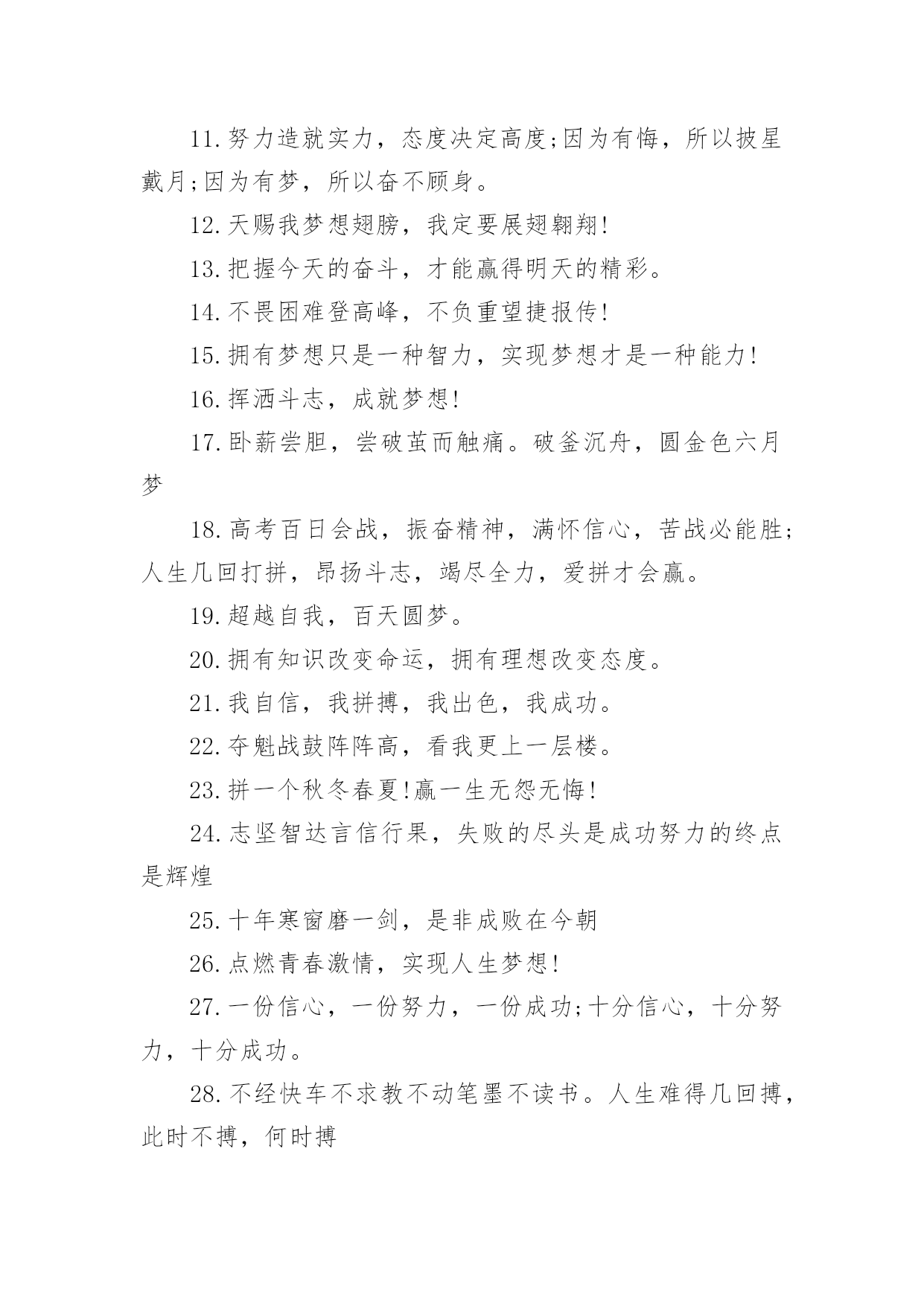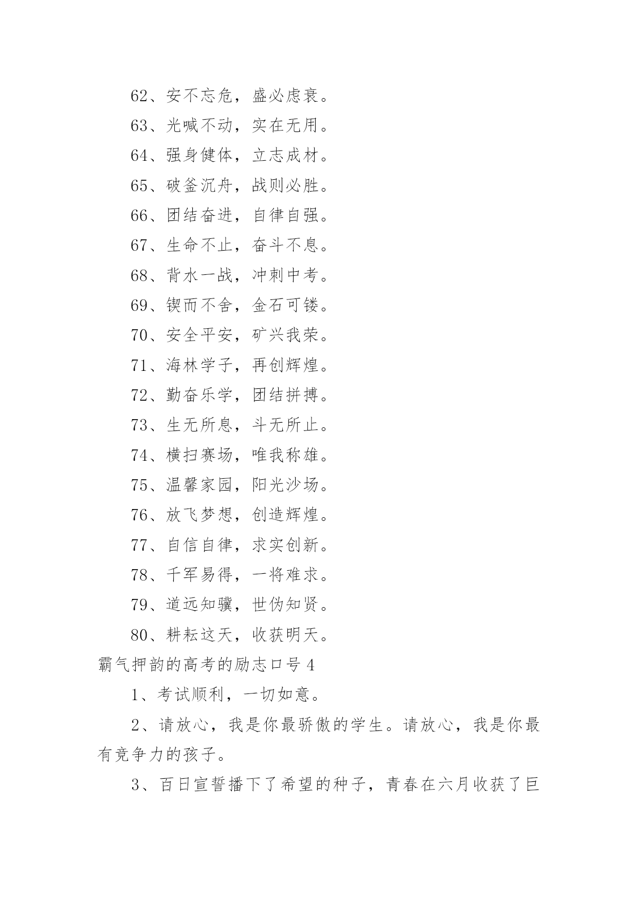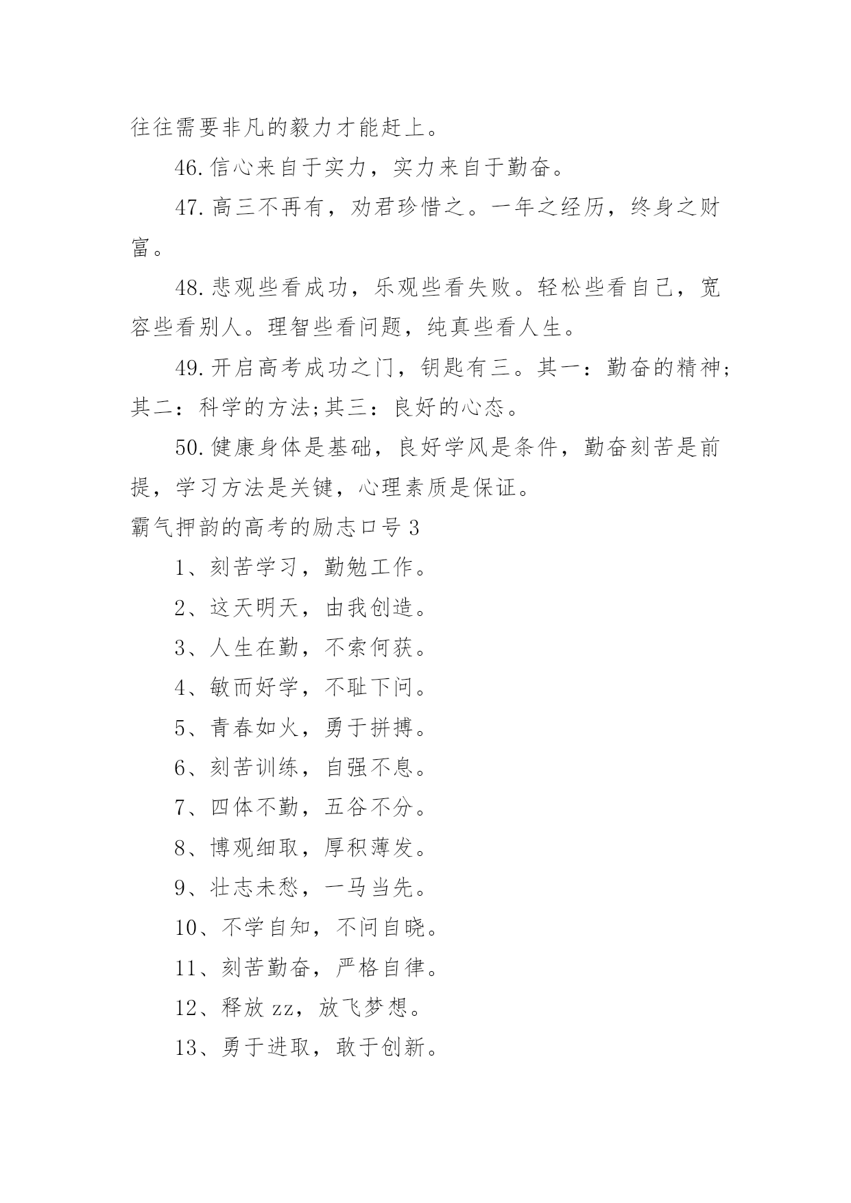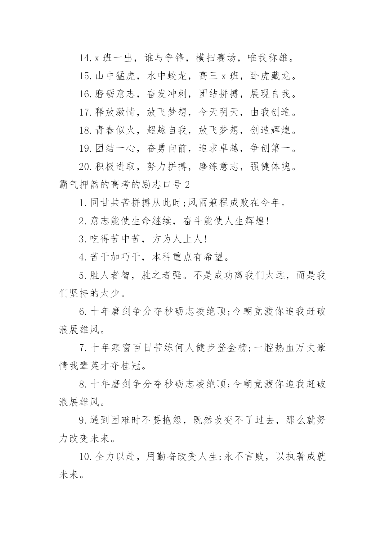 霸气押韵的高考的励志口号霸气押韵的高考的励志口号无论是身处学校还是步入社会,大家对口号都再熟悉不过了吧,口号在句式上,除了简短,容易记忆之外,还要容易念,容易传。口号的类型有很多,你都知道吗?以下是小编精心整理的霸气押韵的高考的励志口号,仅供参考,大家一起来看看吧。霸气押韵的高考的励志口号11.激情澎湃,高考不败,斗志昂扬,属我。2.不苦不累,高三无味,不拼不搏,等于白活。3.鹰隼试翼,风尘翕张,面对理想,直面阳光。4.高三某班、青春无限、超越梦想、勇于争先!5.雄关漫道,谁与争勇,烈火熊炉,我自称雄。6.冷静沉着,审慎思考,艰难困苦,玉汝于成。7.文者称雄,武者称霸,高三x班,雄霸天下。8.扬帆起航,劈波斩浪,x班一出,谁与争锋。9.龙腾虎跃,雷霆万钧,无与伦比,万众一心。10.齐心协力,争创佳绩,勇夺三军,所向披靡。11.英明神武,勇冠江山,高三x班。12.亲密五班,合作无间,力挫群雄,舍我其谁。13.龙腾虎跃,雷霆万钧,无与伦比,万众一心。14.x班一出,谁与争锋,横扫赛场,唯我称雄。15.山中猛虎,水中蛟龙,高三x班,卧虎藏龙。16.磨砺意志,奋发冲刺,团结拼搏,展现自我。17.释放激情,放飞梦想,今天明天,由我创造。18.青春似火,超越自我,放飞梦想,创造辉煌。19.团结一心,奋勇向前,追求卓越,争创第一。20.积极进取,努力拼搏,磨练意志,强健体魄。霸气押韵的高考的励志口号21.同甘共苦拼搏从此时;风雨兼程成败在今年。2.意志能使生命继续,奋斗能使人生辉煌!3.吃得苦中苦,方为人上人!4.苦干加巧干,本科重点有希望。5.胜人者智,胜之者强。不是成功离我们太远,而是我们坚持的太少。6.十年磨剑争分夺秒砺志凌绝顶;今朝竞渡你追我赶破浪展雄风。7.十年寒窗百日苦练何人健步登金榜;一腔热血万丈豪情我辈英才夺桂冠。8.十年磨剑争分夺秒砺志凌绝顶;今朝竞渡你追我赶破浪展雄风。9.遇到困难时不要抱怨,既然改变不了过去,那么就努力改变未来。10.全力以赴,用勤奋改变人生;永不言败,以执著成就未来。11.努力造就实力,态度决定高度;因为有悔,所以披星戴月;因为有梦,所以奋不顾身。12.天赐我梦想翅膀,我定要展翅翱翔!13.把握今天的奋斗,才能赢得明天的精彩。14.不畏困难登高峰,不负重望捷报传!15.拥有梦想只是一种智力,实现梦想才是一种能力!16.挥洒斗志,成就梦想!17.卧薪尝胆,尝破茧而触痛。破釜沉舟,圆金色六月梦18.高考百日会战,振奋精神,满怀信心,苦战必能胜;人生几回打拼,昂扬斗志,竭尽全力,爱拼才会赢。19.超越自我,百天圆梦。20.拥有知识改变命运,拥有理想改变态度。21.我自信,我拼搏,我出色,我成功。22.夺魁战鼓阵阵高,看我更上一层楼。23.拼一个秋冬春夏!赢一生无怨无悔!24.志坚智达言信行果,失败的尽头是成功努力的终点是辉煌25.十年寒窗磨一剑,是非成败在今朝26.点燃青春激情,实现人生梦想!27.一份信心,一份努力,一份成功;十分信心,十分努力,十分成功。28.不经快车不求教不动笔墨不读书。人生难得几回搏,此时不搏,何时搏29.贵有恒,何须三更起五更眠;最无益,莫过一日曝十日寒!30.积一时之跬步,臻千里之遥程。31.旌旗摇,号令催,百日炼真钢;仰天长笑,金戈利刃展雄风,所向无敌!32.血可流,头可破,斗志更昂扬;逐鹿考场,战鼓号角扬军威,百战百胜!33.拼搏改变命运,励志照亮人生。34.摒弃侥幸之念,必取百炼成钢;厚积分秒之功,始得一鸣惊人。35.抓住机遇,确保霸主地位;与狼共舞,彰显英雄本色!36.释放激情,放飞梦想,今天明天,由我创造。37.十年寒窗志气长,一心苦待潜龙云腾日。三载二高情难忘,只愿笑在凤凰花开时。38.重任在肩,埋头苦干。39.吃苦受累,视死如归!40.不做口头的巨人,要做行动的标兵。41.十年磨剑今日出,剑风所想何人阻。42.你想是怎样的`人,你就是怎样的人;你想成为怎样的人,你就会离这个目标不会太远。43.精神成人,知识成才,态度成全。44.苦心人,天不负,卧薪尝胆,三千越甲可吞吴;有志者,事竟成,破釜沉舟,百二秦关终属楚。45.圣人与常人之间往往只相差一小步,而这一小步却往往需要非凡的毅力才能赶上。46.信心来自于实力,实力来自于勤奋。47.高三不再有,劝君珍惜之。一年之经历,终身之财富。48.悲观些看成功,乐观些看失败。轻松些看自己,宽容些看别人。理智些看问题,纯真些看人生。49.开启高考成功之门,钥匙有三。其一:勤奋的精神;其二:科学的方法;其三:良好的心态。50.健康身体是基础,良好学风是条件,勤奋刻苦是前提,学习方法是关键,心理素质是保证。霸气押韵的高考的励志口号31、刻苦学习,勤勉工作。2、这天明天,由我创造。3、人生在勤,不索何获。4、敏而好学,不耻下问。5、青