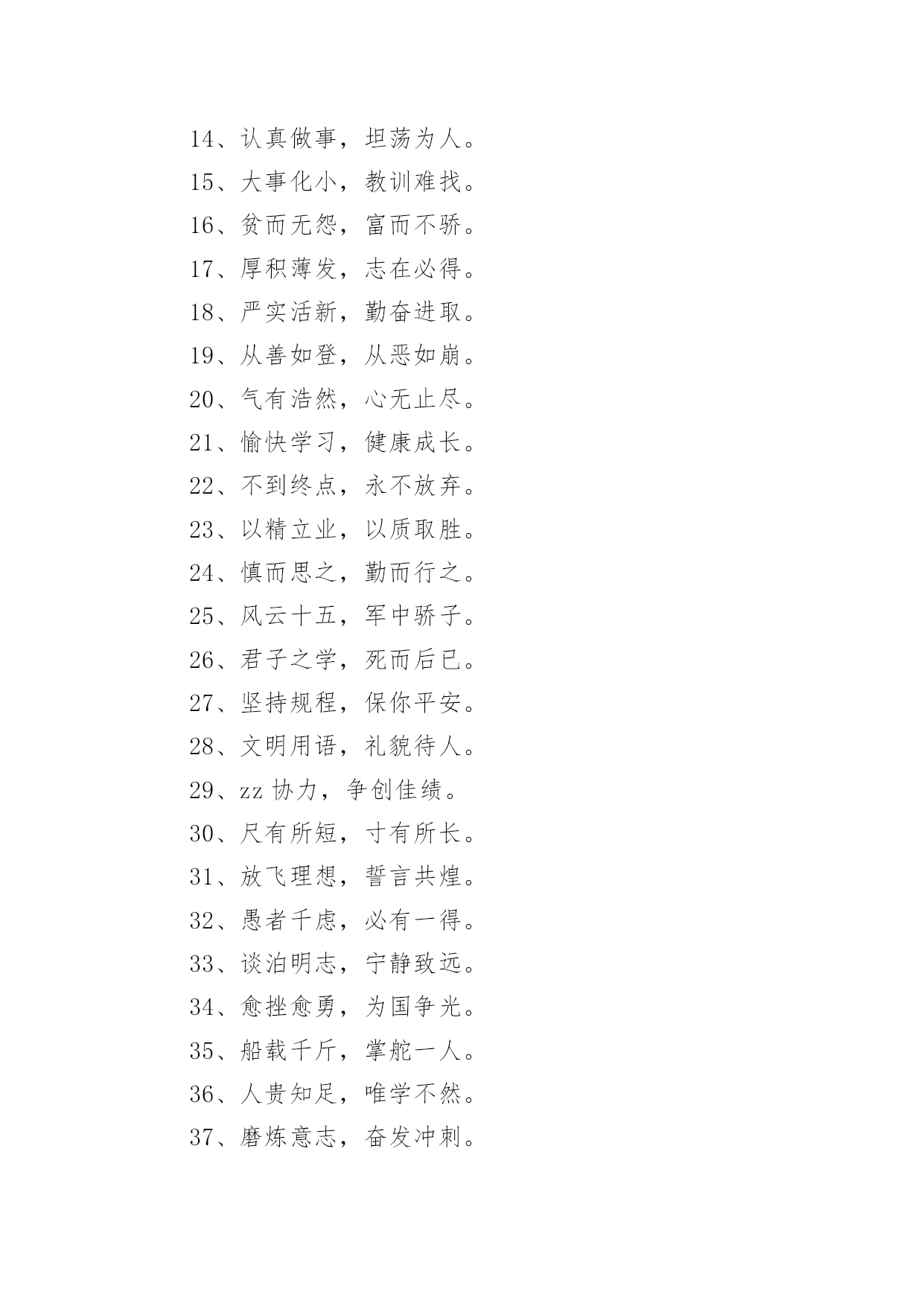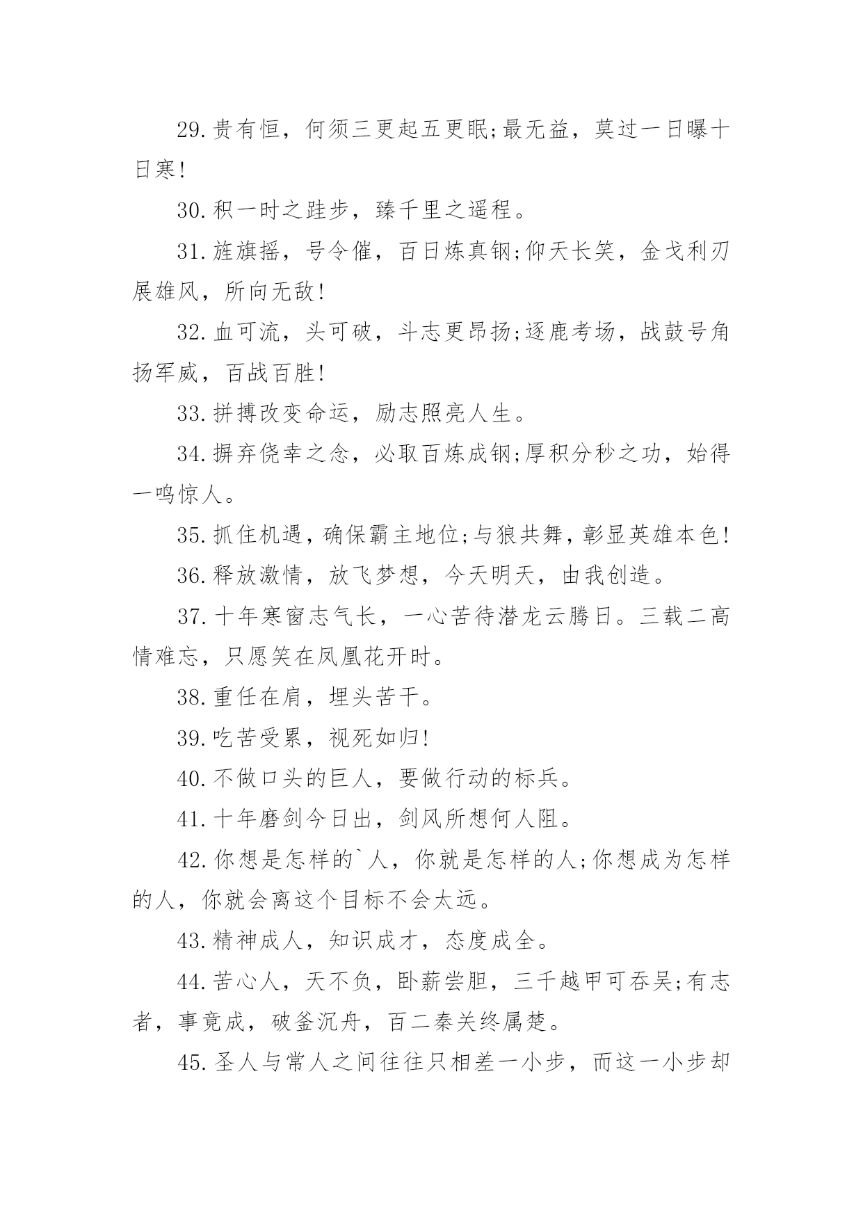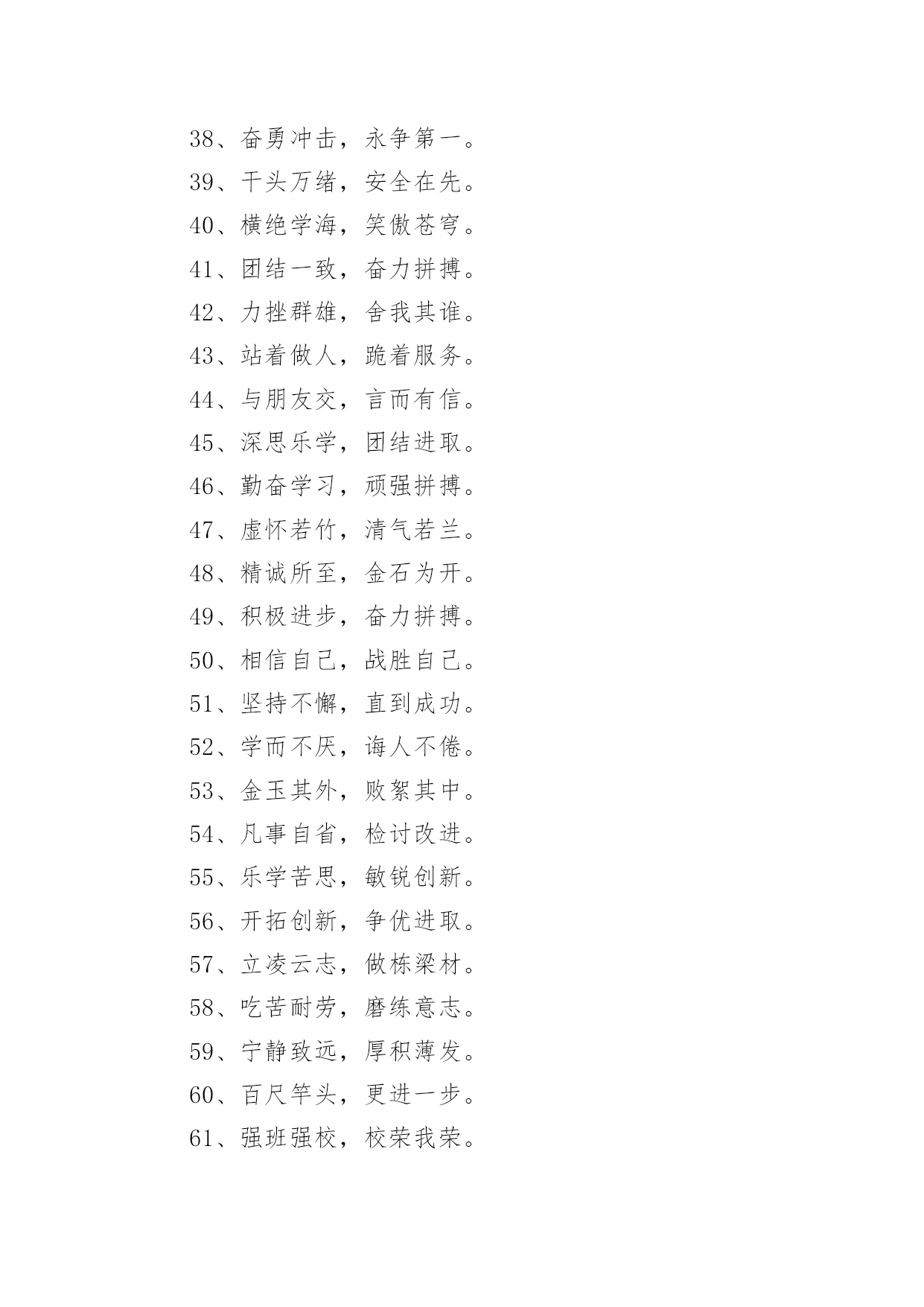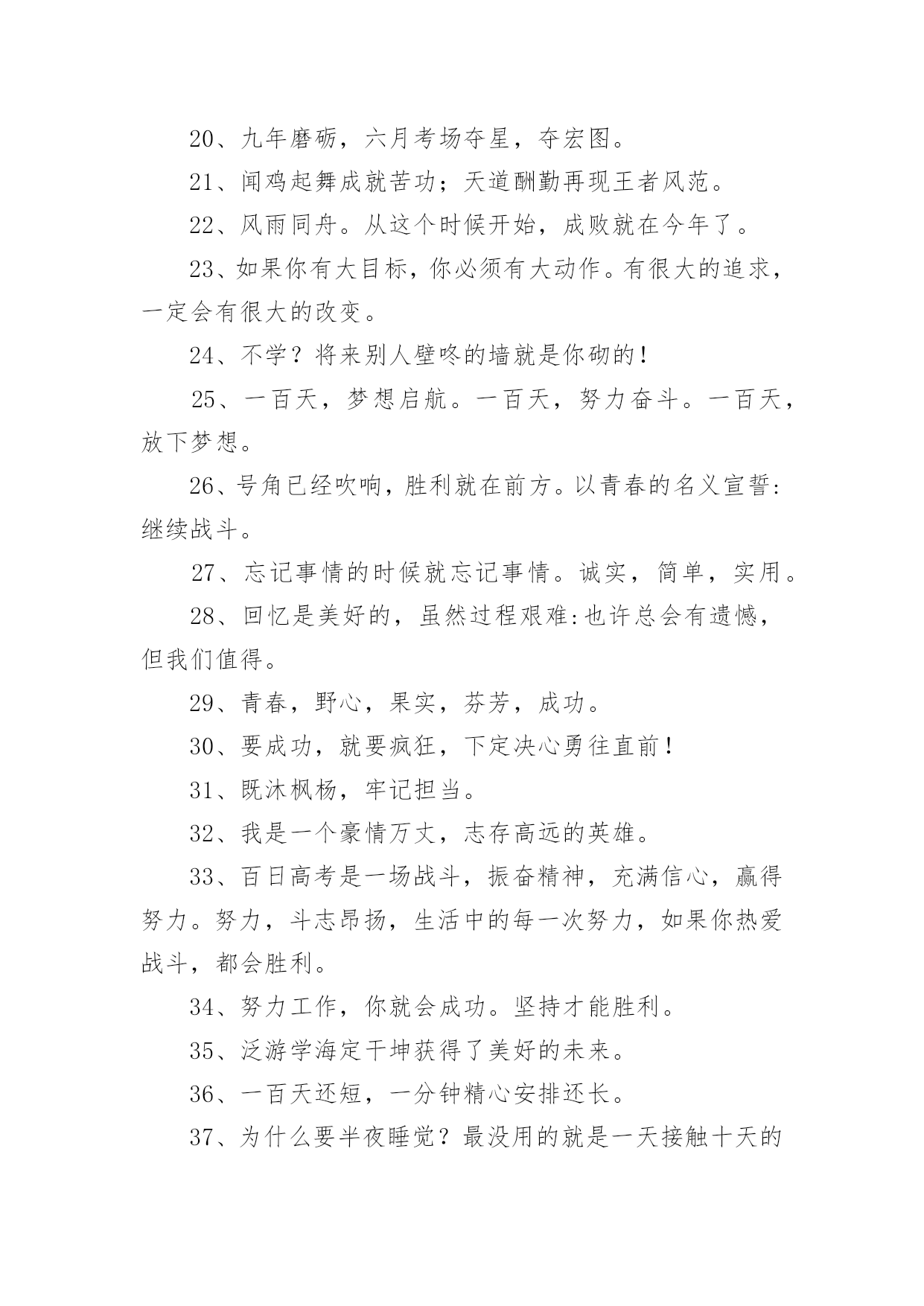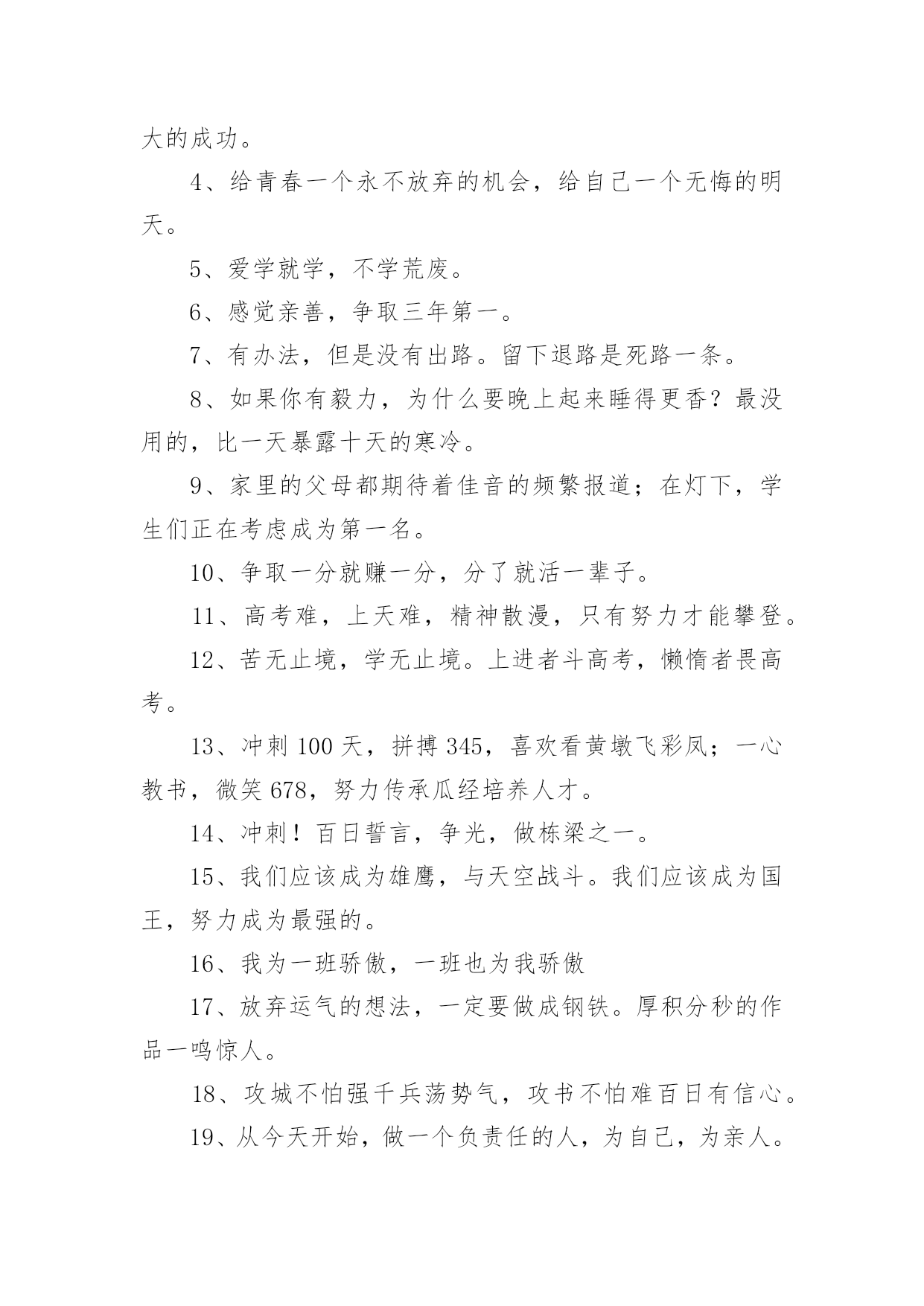 霸气押韵的高考的励志口号霸气押韵的高考的励志口号无论是身处学校还是步入社会,大家对口号都再熟悉不过了吧,口号在句式上,除了简短,容易记忆之外,还要容易念,容易传。口号的类型有很多,你都知道吗?以下是小编精心整理的霸气押韵的高考的励志口号,仅供参考,大家一起来看看吧。霸气押韵的高考的励志口号11.激情澎湃,高考不败,斗志昂扬,属我。2.不苦不累,高三无味,不拼不搏,等于白活。3.鹰隼试翼,风尘翕张,面对理想,直面阳光。4.高三某班、青春无限、超越梦想、勇于争先!5.雄关漫道,谁与争勇,烈火熊炉,我自称雄。6.冷静沉着,审慎思考,艰难困苦,玉汝于成。7.文者称雄,武者称霸,高三x班,雄霸天下。8.扬帆起航,劈波斩浪,x班一出,谁与争锋。9.龙腾虎跃,雷霆万钧,无与伦比,万众一心。10.齐心协力,争创佳绩,勇夺三军,所向披靡。11.英明神武,勇冠江山,高三x班。12.亲密五班,合作无间,力挫群雄,舍我其谁。13.龙腾虎跃,雷霆万钧,无与伦比,万众一心。14.x班一出,谁与争锋,横扫赛场,唯我称雄。15.山中猛虎,水中蛟龙,高三x班,卧虎藏龙。16.磨砺意志,奋发冲刺,团结拼搏,展现自我。17.释放激情,放飞梦想,今天明天,由我创造。18.青春似火,超越自我,放飞梦想,创造辉煌。19.团结一心,奋勇向前,追求卓越,争创第一。20.积极进取,努力拼搏,磨练意志,强健体魄。霸气押韵的高考的励志口号21.同甘共苦拼搏从此时;风雨兼程成败在今年。2.意志能使生命继续,奋斗能使人生辉煌!3.吃得苦中苦,方为人上人!4.苦干加巧干,本科重点有希望。5.胜人者智,胜之者强。不是成功离我们太远,而是我们坚持的太少。6.十年磨剑争分夺秒砺志凌绝顶;今朝竞渡你追我赶破浪展雄风。7.十年寒窗百日苦练何人健步登金榜;一腔热血万丈豪情我辈英才夺桂冠。8.十年磨剑争分夺秒砺志凌绝顶;今朝竞渡你追我赶破浪展雄风。9.遇到困难时不要抱怨,既然改变不了过去,那么就努力改变未来。10.全力以赴,用勤奋改变人生;永不言败,以执著成就未来。11.努力造就实力,态度决定高度;因为有悔,所以披星戴月;因为有梦,所以奋不顾身。12.天赐我梦想翅膀,我定要展翅翱翔!13.把握今天的奋斗,才能赢得明天的精彩。14.不畏困难登高峰,不负重望捷报传!15.拥有梦想只是一种智力,实现梦想才是一种能力!16.挥洒斗志,成就梦想!17.卧薪尝胆,尝破茧而触痛。破釜沉舟,圆金色六月梦18.高考百日会战,振奋精神,满怀信心,苦战必能胜;人生几回打拼,昂扬斗志,竭尽全力,爱拼才会赢。19.超越自我,百天圆梦。20.拥有知识改变命运,拥有理想改变态度。21.我自信,我拼搏,我出色,我成功。22.夺魁战鼓阵阵高,看我更上一层楼。23.拼一个秋冬春夏!赢一生无怨无悔!24.志坚智达言信行果,失败的尽头是成功努力的终点是辉煌25.十年寒窗磨一剑,是非成败在今朝26.点燃青春激情,实现人生梦想!27.一份信心,一份努力,一份成功;十分信心,十分努力,十分成功。28.不经快车不求教不动笔墨不读书。人生难得几回搏,此时不搏,何时搏29.贵有恒,何须三更起五更眠;最无益,莫过一日曝十日寒!30.积一时之跬步,臻千里之遥程。31.旌旗摇,号令催,百日炼真钢;仰天长笑,金戈利刃展雄风,所向无敌!32.血可流,头可破,斗志更昂扬;逐鹿考场,战鼓号角扬军威,百战百胜!33.拼搏改变命运,励志照亮人生。34.摒弃侥幸之念,必取百炼成钢;厚积分秒之功,始得一鸣惊人。35.抓住机遇,确保霸主地位;与狼共舞,彰显英雄本色!36.释放激情,放飞梦想,今天明天,由我创造。37.十年寒窗志气长,一心苦待潜龙云腾日。三载二高情难忘,只愿笑在凤凰花开时。38.重任在肩,埋头苦干。39.吃苦受累,视死如归!40.不做口头的巨人,要做行动的标兵。41.十年磨剑今日出,剑风所想何人阻。42.你想是怎样的`人,你就是怎样的人;你想成为怎样的人,你就会离这个目标不会太远。43.精神成人,知识成才,态度成全。44.苦心人,天不负,卧薪尝胆,三千越甲可吞吴;有志者,事竟成,破釜沉舟,百二秦关终属楚。45.圣人与常人之间往往只相差一小步,而这一小步却往往需要非凡的毅力才能赶上。46.信心来自于实力,实力来自于勤奋。47.高三不再有,劝君珍惜之。一年之经历,终身之财富。48.悲观些看成功,乐观些看失败。轻松些看自己,宽容些看别人。理智些看问题,纯真些看人生。49.开启高考成功之门,钥匙有三。其一:勤奋的精神;其二:科学的方法;其三:良好的心态。50.健康身体是基础,良好学风是条件,勤奋刻苦是前提,学习方法是关键,心理素质是保证。霸气押韵的高考的励志口号31、刻苦学习,勤勉工作。2、这天明天,由我创造。3、人生在勤,不索何获。4、敏而好学,不耻下问。5、青