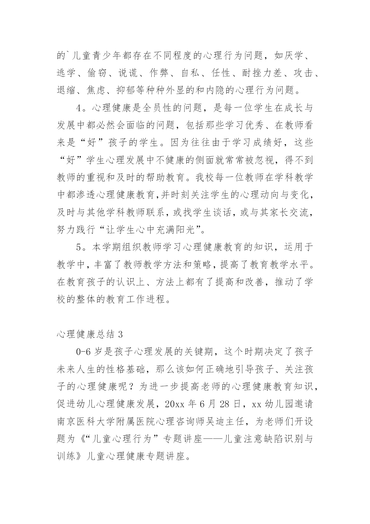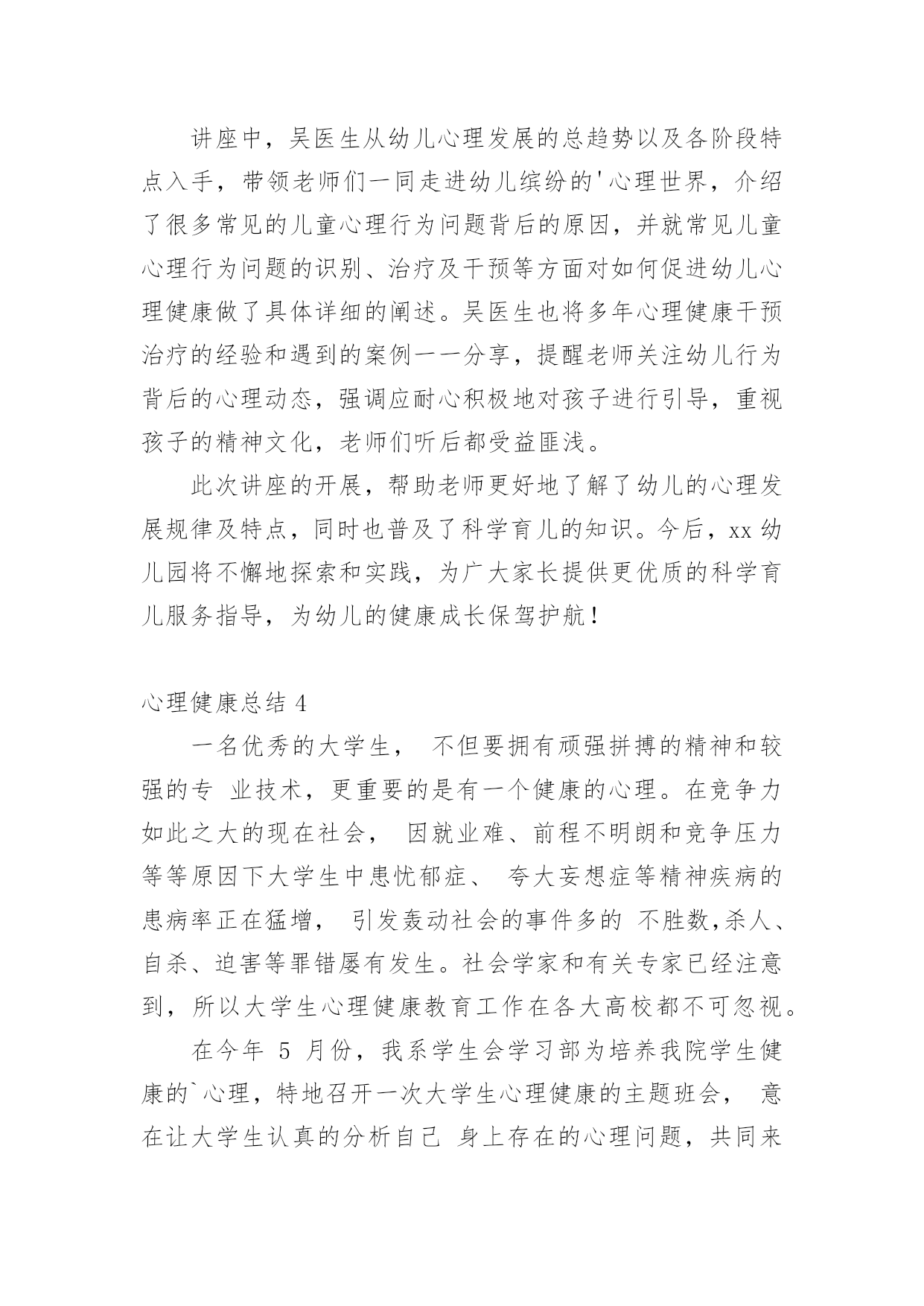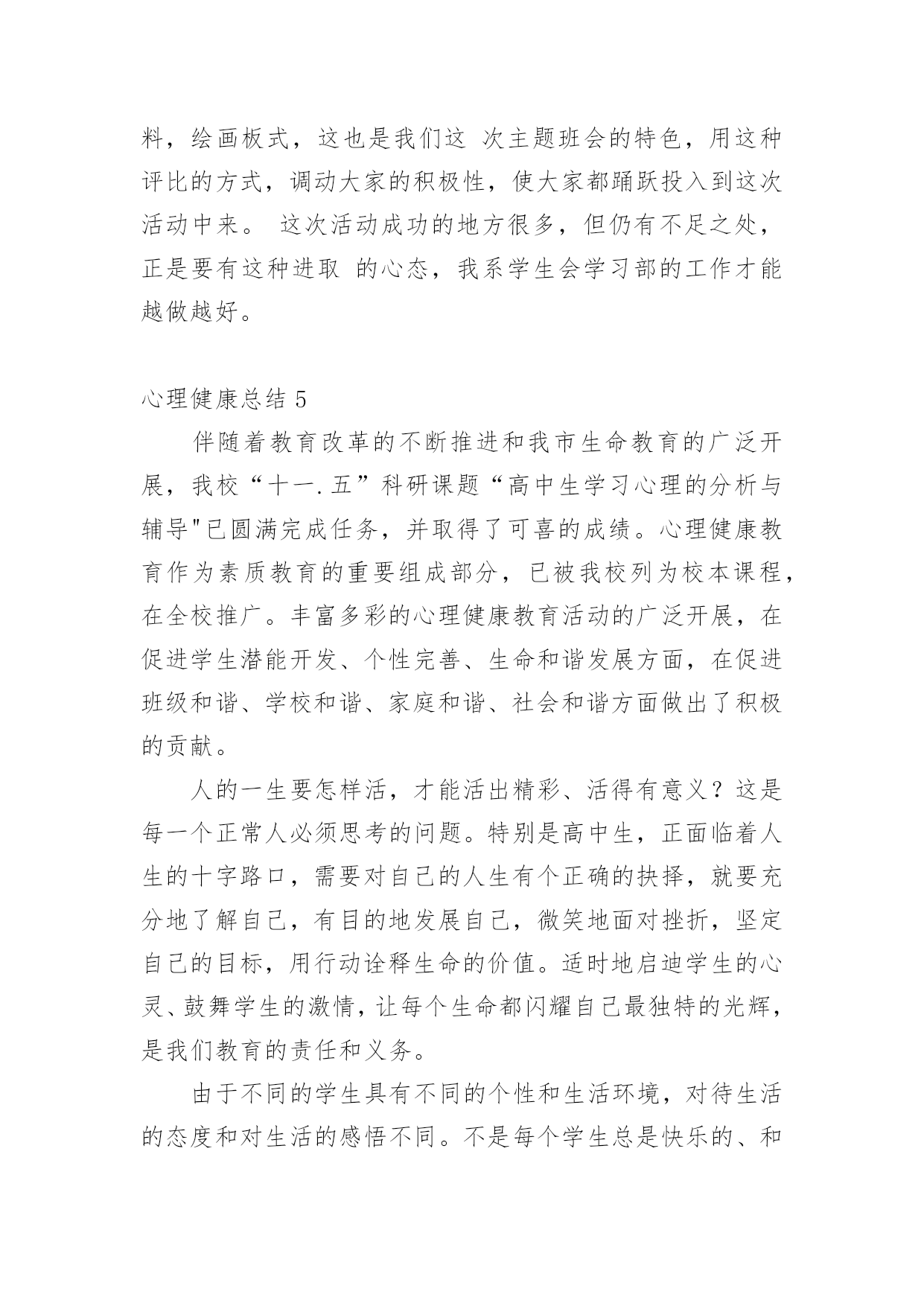 心理健康总结心理健康总结通用(15篇)总结在一个时期、一个年度、一个阶段对学习和工作生活等情况加以回顾和分析的一种书面材料,它能够使头脑更加清醒,目标更加明确,为此要我们写一份总结。但是却发现不知道该写些什么,下面是小编精心整理的心理健康总结,仅供参考,欢迎大家阅读。心理健康总结1又是一个浪漫的冬天。不经意间,进入大学已经快半年了。我人生之初从来不知道形式,在“混熟”后变得和谐,也担任过班级心理委员。这份工作刚开始的时候,我很迷茫,不知道该怎么办。后来经过学校培训,我受益匪浅,学到了很多心理学方面的知识,也深深体会到了心理委员工作的重要性,于是我逐渐开始了解这份工作,并开始接受它,最后喜欢上了它。这学期,我尝试着主动与同学交流,倾听他们的困惑,分享他们的快乐,分担他们的烦恼。为此,我做了以下工作:一是加强自身心理素质锻炼,提高工作能力(1)作为心理委员,你必须有强烈的责任感,按时参加学校和学院举办的心理委员培训讲座和活动,及时了解学校在这方面的措施和政策,并通过活动与其他班级的心理委员交流经验。(2)业余时间主动去图书馆查阅相关书籍,学习一些心理学知识,提高自身素养,提高为学生服务的水平。第二,积极开展班级心理活动,培养学生乐观阳光的心态(1)x月x日:刚进大学,彼此还是陌生人。为了促进学生尽快相互了解和融入班级,在心理委员会的倡导和各班委的积极组织下,我们班策划了“我们在校园”的集体活动,并在校园内开展了一系列互动环节。(2)xxDay:为了尽快了解学生的.思想心理状况,便于以后有针对性的心理活动,在心理委员会的组织和策划下,全班积极参与,我们班成功开展了“大学生心理健康调查”。(3)X月X月:为了丰富学生课余时间,带动个别积极性不高、性格腼腆的学生融入集体,我们班各班委在辅导员的关怀下,组织了“班级篮球友谊赛”、“班级羽毛球友谊赛”等心理活动。(4)根据自己的时间和同学的时间,有针对性地与同学交谈交流,改善同学关系,成为他们亲密信任的倾听者,取得良好的效果。总的来说,上学期的心理工作还是比较顺利的,但是我也发现自己在工作中有一些不足和缺陷,需要改进和提高。(1)没有和每个同学充分沟通,可能忽略了一些需要我帮助的同学。(2)主动找我谈话的同学不多,但大多是我自己主动找他们谈话,说明我的信任感不够高。(3)我们班组织的心理活动不够,参与面不够广。有些学生不太活跃。(4)我自己的水平还是比较有限的。有些同学的问题我无法给出合理的答案,我也没有足够的处理经验。针对以上问题,我打算在下学期的心理工作中做以下几点:(1)为了增强大家对我的信任,我会一直坚持保密原则。(2)为了方便学生和我之间的交流,我会统计每个人的邮箱地址、QQ号、手机号,建立一个完整的无障碍交流渠道。(3)每周通过一组邮件向每个学生提供心理知识、笑话和一些音乐,以减轻他们的心理压力。(4)继续主动联系学生,与学生交流,与其他班委一起举办更多精彩的心理活动。(5)建立信息反馈系统。告诉每个学生与学生心理咨询的联系方式和地址,收到学生的信息后及时回复,鼓励大家对我的工作提出有价值的建议。以上是我成为班级心理委员以来的工作总结。虽然在策划、组织、协调上遇到了很多困难,也投入了很多精力,但是发现自己的贡献是有意义的,成就感很大。现在我已经爱上了这份工作,总结了经验教训,在以后的工作中会更加积极的为同学服务,和大家一起快乐的成长。心理健康总结2一学期紧张而愉快的学习生活即将结束,在此,我将本校心理健康工作做下总结,以便今后更好的开展工作。1。本学期认真落实了关于以“绿色文化教育的实践与研究”为主体工作宗旨的学校心理健康教育的精神,努力培养学生“自知、自尊、自制、自信、自强”的心理素质,让每一位学生都拥有健康的心灵,并真正成为身心健康的新一代。使学生不断正确认识自我,增强自我调控,承受挫折,适应环境的能力;培养学生健全的人格和良好的个性心理品质。对少数有心理困扰或心理障碍的学生,给予科学有效的心理咨询和辅导,使他们尽快摆脱障碍,调节自我提高心理健康水平,增强发展自我的能力。2。心理健康教育是素质教育的重要内容之一,旨在培养和提高学生的心理素质,帮助学生学会如何恰当地应付现实生活中所面临的各种压力,如何进行情绪调节等,使学生更有效、积极地适应社会、适应自身的发展变化,促进儿童青少年心理健康的发展。我校每位班主任老师都进行校级心理健康辅导培训,担任各班心理辅导员,利用思想品德课,针对本班学生实际,有目的的开展集体心理疏导活动,以促进心理素质提高,预防问题发生。3。随着社会的飞速发展,人们的文化观念、生活方式、思维意识都发生着剧烈变化。当代学生的心理负荷能力遇到了前所未有的考验。有资料表明,在我国约有五分之一左右的`儿童青少年都存在不同程度的心理行为问题,如厌学、逃学、偷窃、说谎