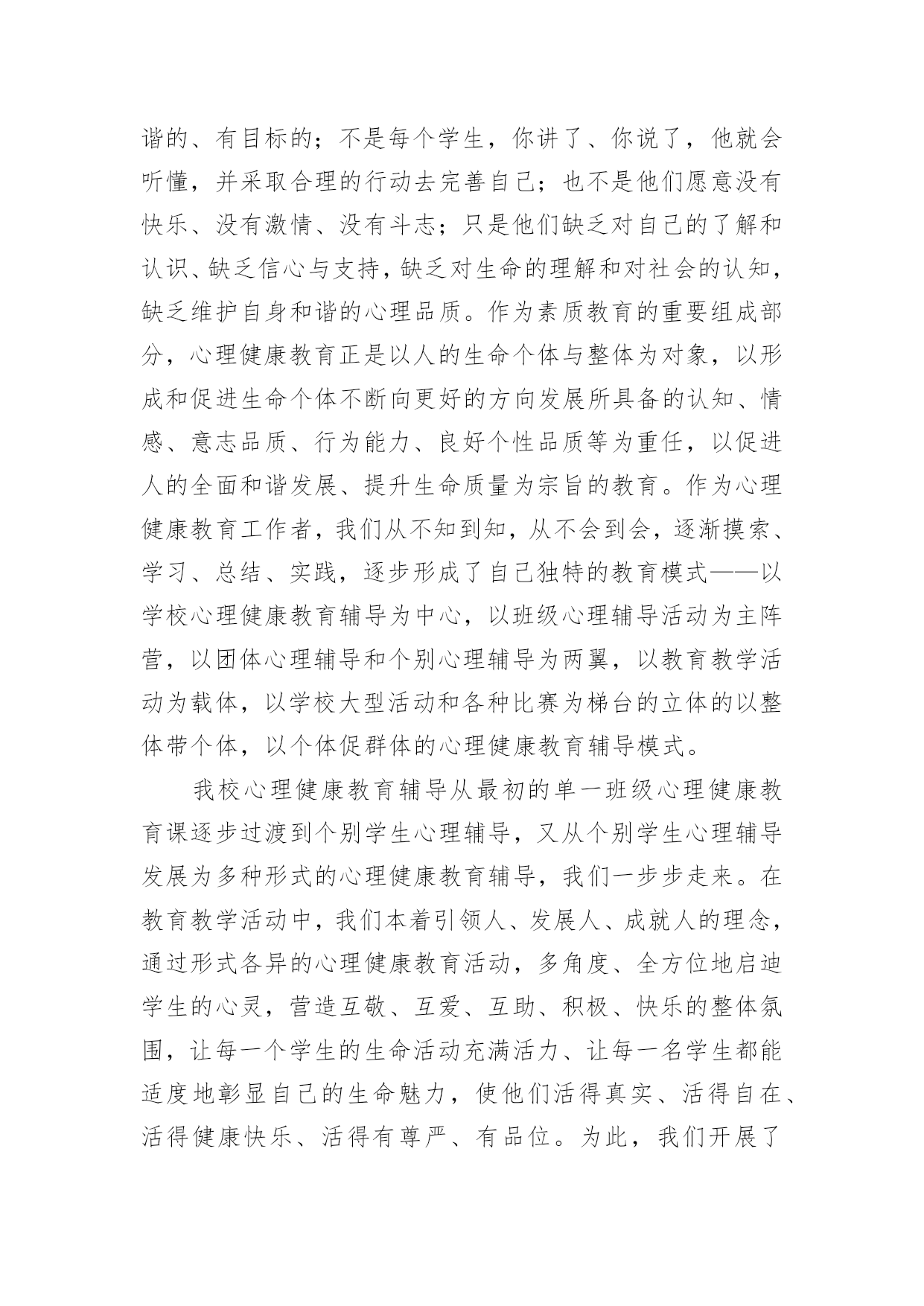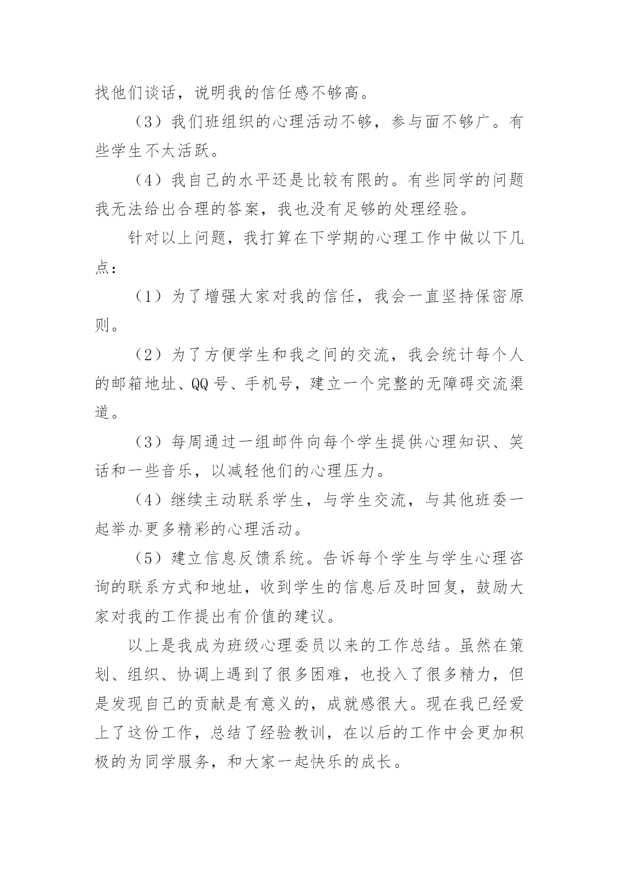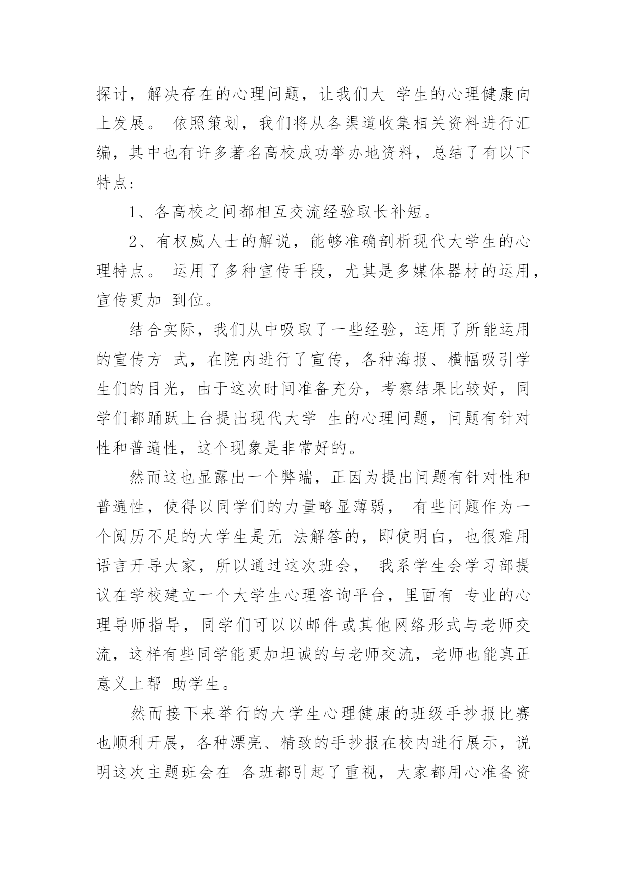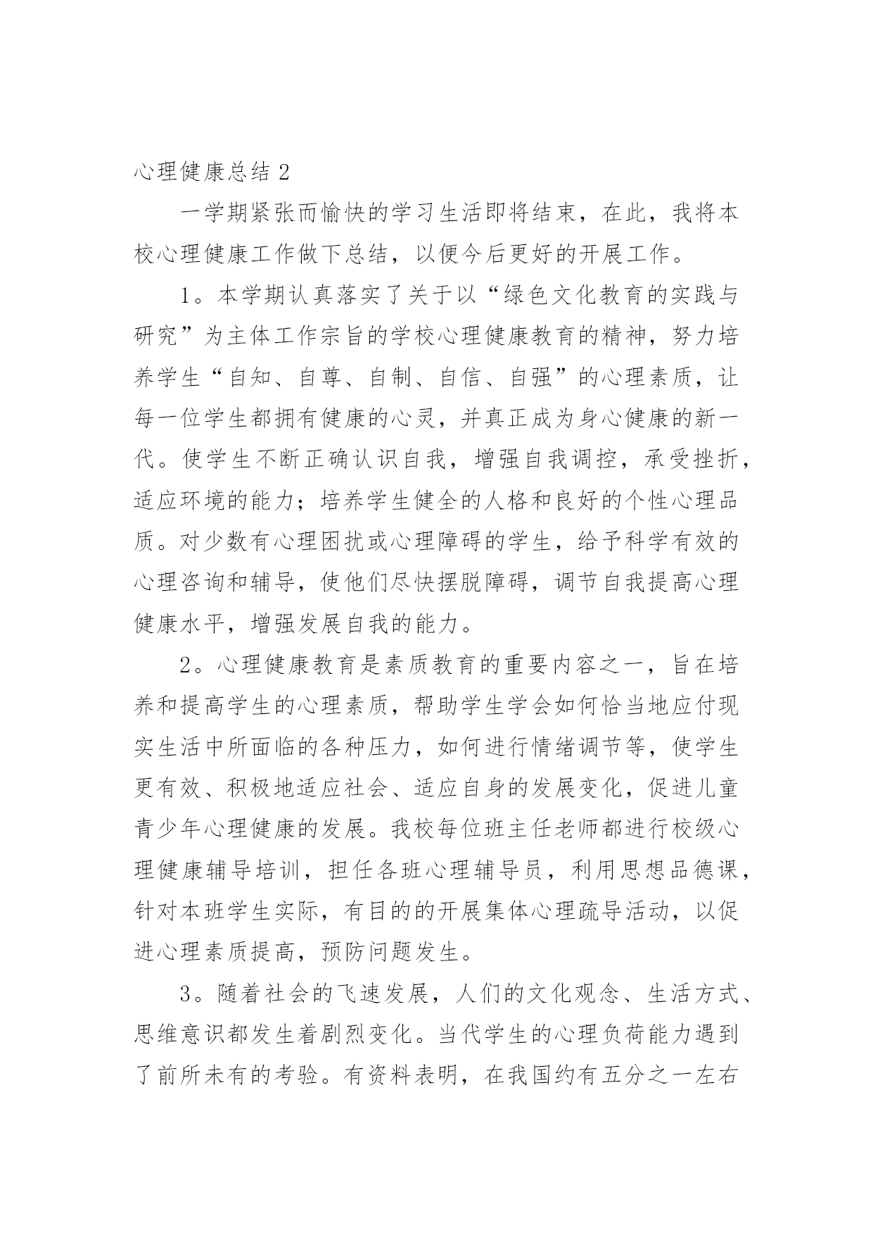 心理健康总结心理健康总结通用(15篇)总结在一个时期、一个年度、一个阶段对学习和工作生活等情况加以回顾和分析的一种书面材料,它能够使头脑更加清醒,目标更加明确,为此要我们写一份总结。但是却发现不知道该写些什么,下面是小编精心整理的心理健康总结,仅供参考,欢迎大家阅读。心理健康总结1又是一个浪漫的冬天。不经意间,进入大学已经快半年了。我人生之初从来不知道形式,在“混熟”后变得和谐,也担任过班级心理委员。这份工作刚开始的时候,我很迷茫,不知道该怎么办。后来经过学校培训,我受益匪浅,学到了很多心理学方面的知识,也深深体会到了心理委员工作的重要性,于是我逐渐开始了解这份工作,并开始接受它,最后喜欢上了它。这学期,我尝试着主动与同学交流,倾听他们的困惑,分享他们的快乐,分担他们的烦恼。为此,我做了以下工作:一是加强自身心理素质锻炼,提高工作能力(1)作为心理委员,你必须有强烈的责任感,按时参加学校和学院举办的心理委员培训讲座和活动,及时了解学校在这方面的措施和政策,并通过活动与其他班级的心理委员交流经验。(2)业余时间主动去图书馆查阅相关书籍,学习一些心理学知识,提高自身素养,提高为学生服务的水平。第二,积极开展班级心理活动,培养学生乐观阳光的心态(1)x月x日:刚进大学,彼此还是陌生人。为了促进学生尽快相互了解和融入班级,在心理委员会的倡导和各班委的积极组织下,我们班策划了“我们在校园”的集体活动,并在校园内开展了一系列互动环节。(2)xxDay:为了尽快了解学生的.思想心理状况,便于以后有针对性的心理活动,在心理委员会的组织和策划下,全班积极参与,我们班成功开展了“大学生心理健康调查”。(3)X月X月:为了丰富学生课余时间,带动个别积极性不高、性格腼腆的学生融入集体,我们班各班委在辅导员的关怀下,组织了“班级篮球友谊赛”、“班级羽毛球友谊赛”等心理活动。(4)根据自己的时间和同学的时间,有针对性地与同学交谈交流,改善同学关系,成为他们亲密信任的倾听者,取得良好的效果。总的来说,上学期的心理工作还是比较顺利的,但是我也发现自己在工作中有一些不足和缺陷,需要改进和提高。(1)没有和每个同学充分沟通,可能忽略了一些需要我帮助的同学。(2)主动找我谈话的同学不多,但大多是我自己主动找他们谈话,说明我的信任感不够高。(3)我们班组织的心理活动不够,参与面不够广。有些学生不太活跃。(4)我自己的水平还是比较有限的。有些同学的问题我无法给出合理的答案,我也没有足够的处理经验。针对以上问题,我打算在下学期的心理工作中做以下几点:(1)为了增强大家对我的信任,我会一直坚持保密原则。(2)为了方便学生和我之间的交流,我会统计每个人的邮箱地址、QQ号、手机号,建立一个完整的无障碍交流渠道。(3)每周通过一组邮件向每个学生提供心理知识、笑话和一些音乐,以减轻他们的心理压力。(4)继续主动联系学生,与学生交流,与其他班委一起举办更多精彩的心理活动。(5)建立信息反馈系统。告诉每个学生与学生心理咨询的联系方式和地址,收到学生的信息后及时回复,鼓励大家对我的工作提出有价值的建议。以上是我成为班级心理委员以来的工作总结。虽然在策划、组织、协调上遇到了很多困难,也投入了很多精力,但是发现自己的贡献是有意义的,成就感很大。现在我已经爱上了这份工作,总结了经验教训,在以后的工作中会更加积极的为同学服务,和大家一起快乐的成长。心理健康总结2一学期紧张而愉快的学习生活即将结束,在此,我将本校心理健康工作做下总结,以便今后更好的开展工作。1。本学期认真落实了关于以“绿色文化教育的实践与研究”为主体工作宗旨的学校心理健康教育的精神,努力培养学生“自知、自尊、自制、自信、自强”的心理素质,让每一位学生都拥有健康的心灵,并真正成为身心健康的新一代。使学生不断正确认识自我,增强自我调控,承受挫折,适应环境的能力;培养学生健全的人格和良好的个性心理品质。对少数有心理困扰或心理障碍的学生,给予科学有效的心理咨询和辅导,使他们尽快摆脱障碍,调节自我提高心理健康水平,增强发展自我的能力。2。心理健康教育是素质教育的重要内容之一,旨在培养和提高学生的心理素质,帮助学生学会如何恰当地应付现实生活中所面临的各种压力,如何进行情绪调节等,使学生更有效、积极地适应社会、适应自身的发展变化,促进儿童青少年心理健康的发展。我校每位班主任老师都进行校级心理健康辅导培训,担任各班心理辅导员,利用思想品德课,针对本班学生实际,有目的的开展集体心理疏导活动,以促进心理素质提高,预防问题发生。3。随着社会的飞速发展,人们的文化观念、生活方式、思维意识都发生着剧烈变化。当代学生的心理负荷能力遇到了前所未有的考验。有资料表明,在我国约有五分之一左右的`儿童青少年都存在不同程度的心理行为问题,如厌学、逃学、偷窃、说谎
