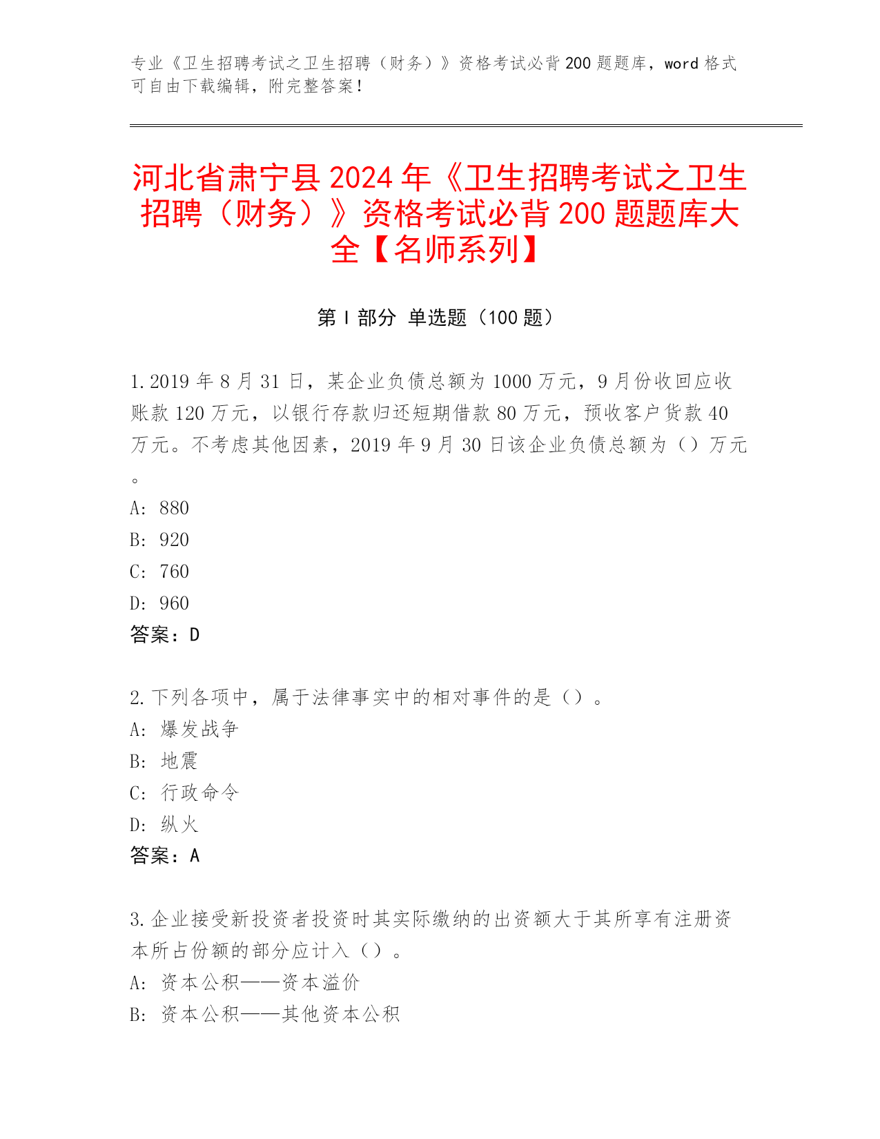 河北省肃宁县2024年《卫生招聘考试之卫生招聘(财务)》资格考试必背200题题库大全【名师系列】