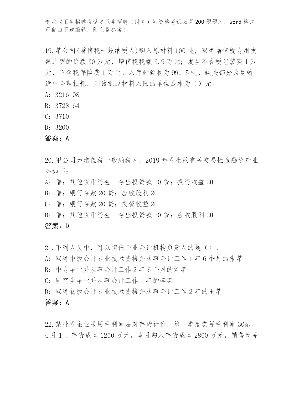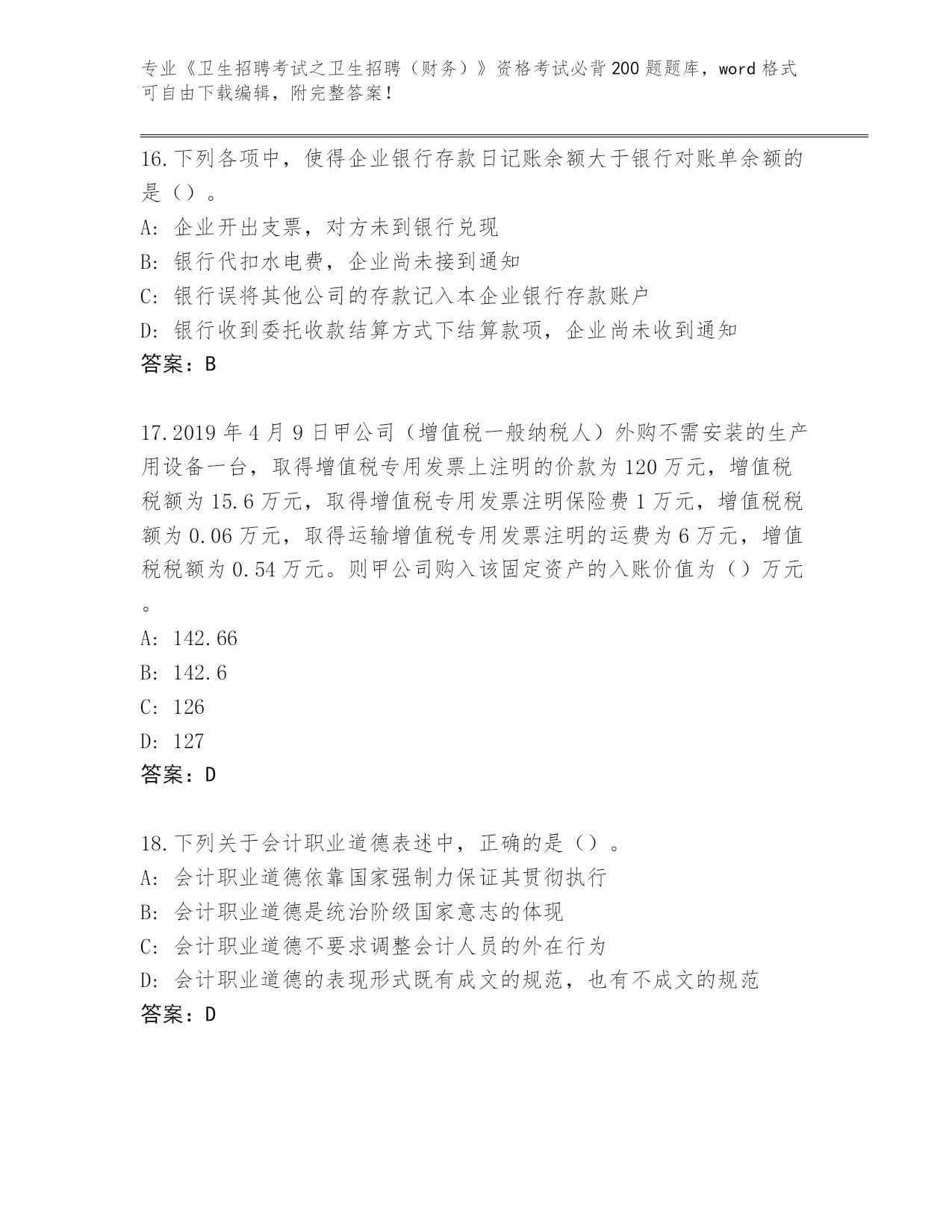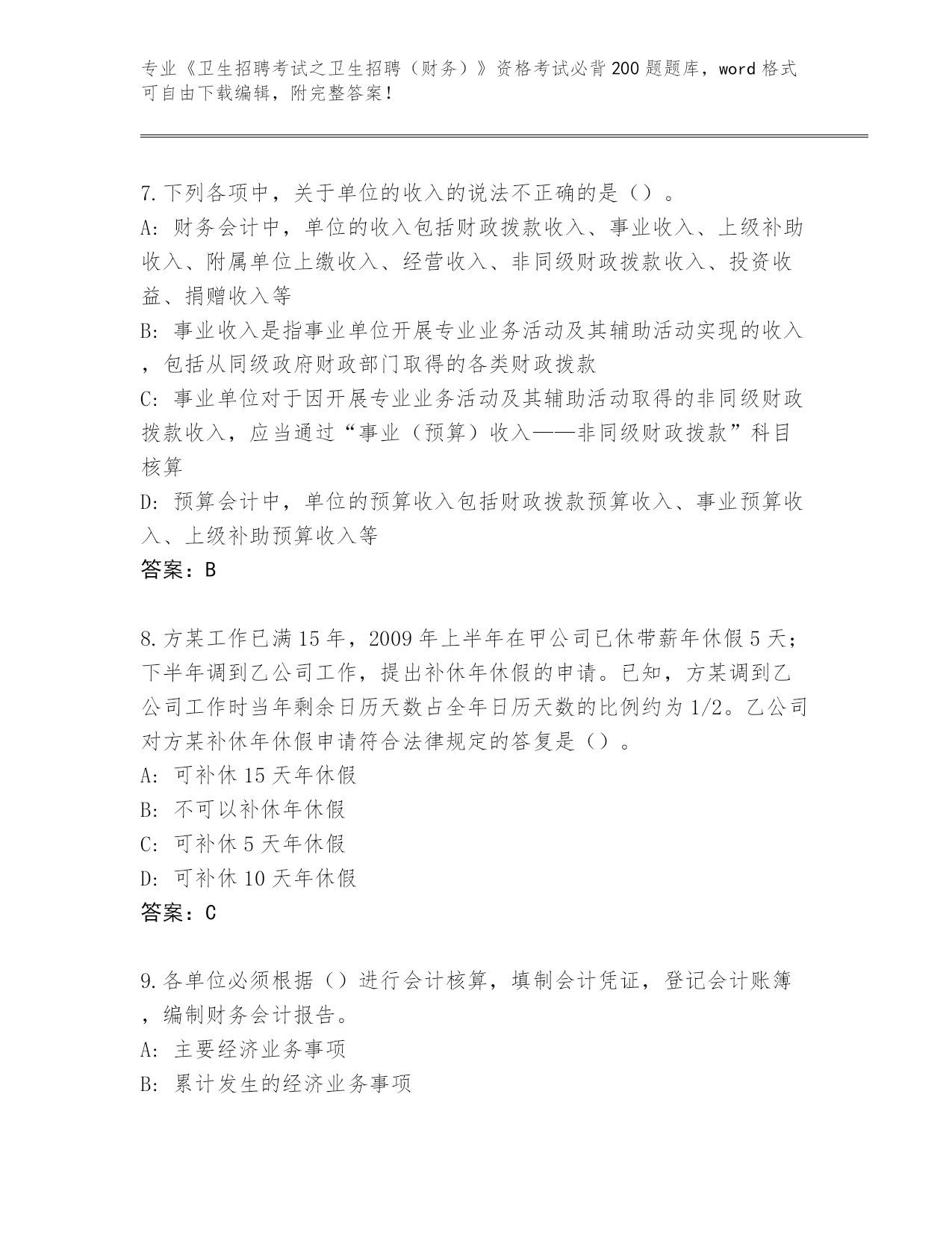 河北省望都县《卫生招聘考试之卫生招聘(财务)》资格考试必背200题大全及答案(名师系列)
