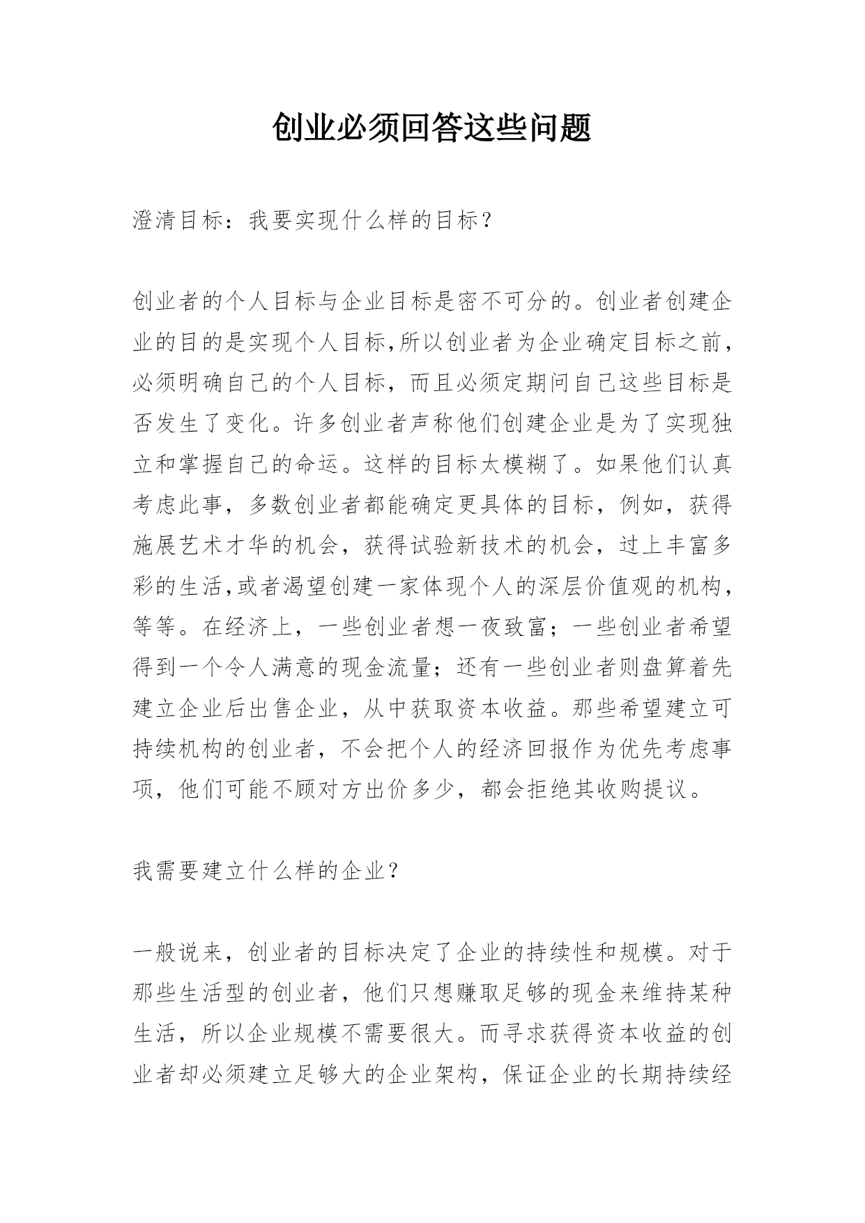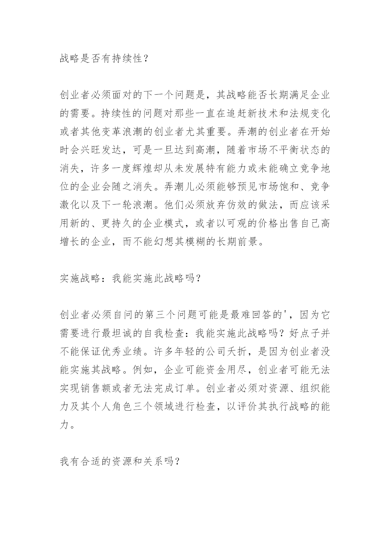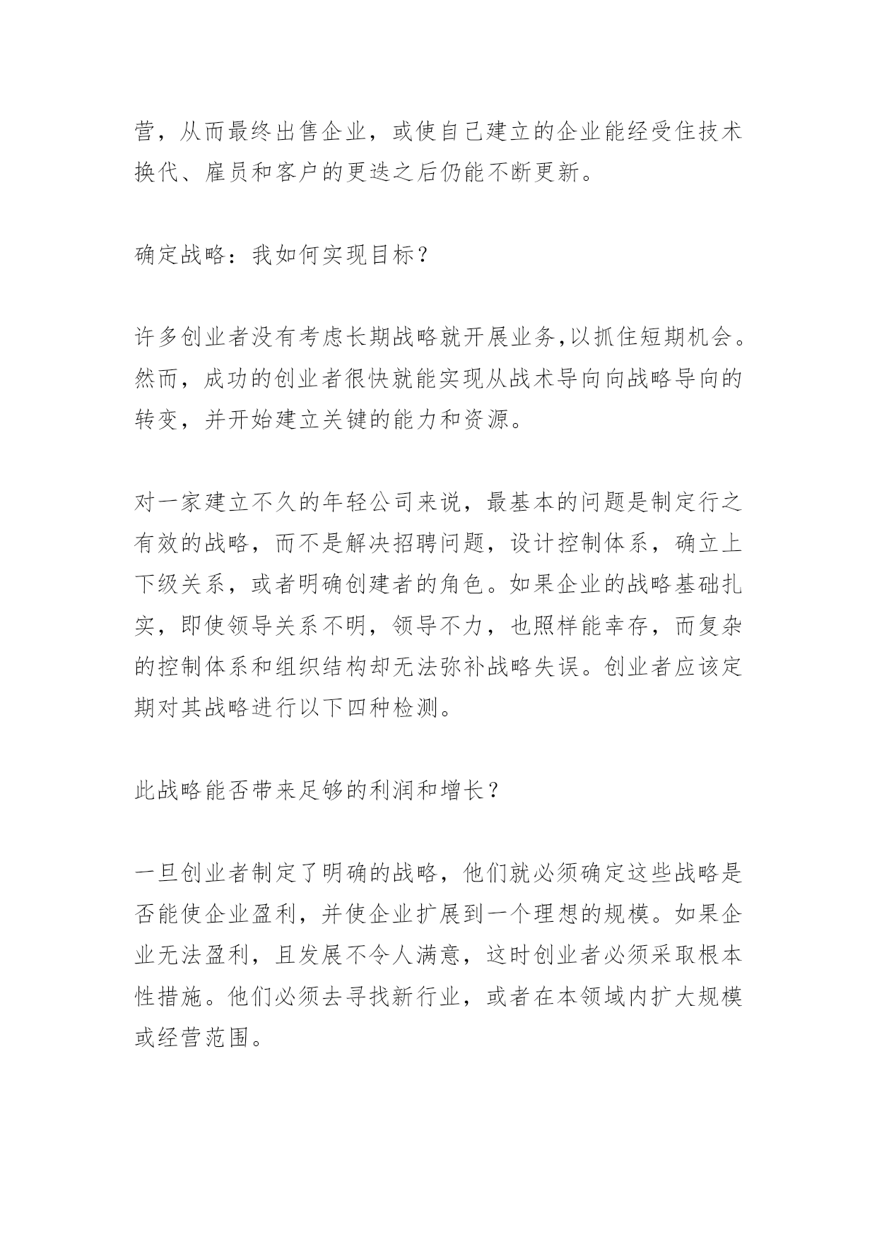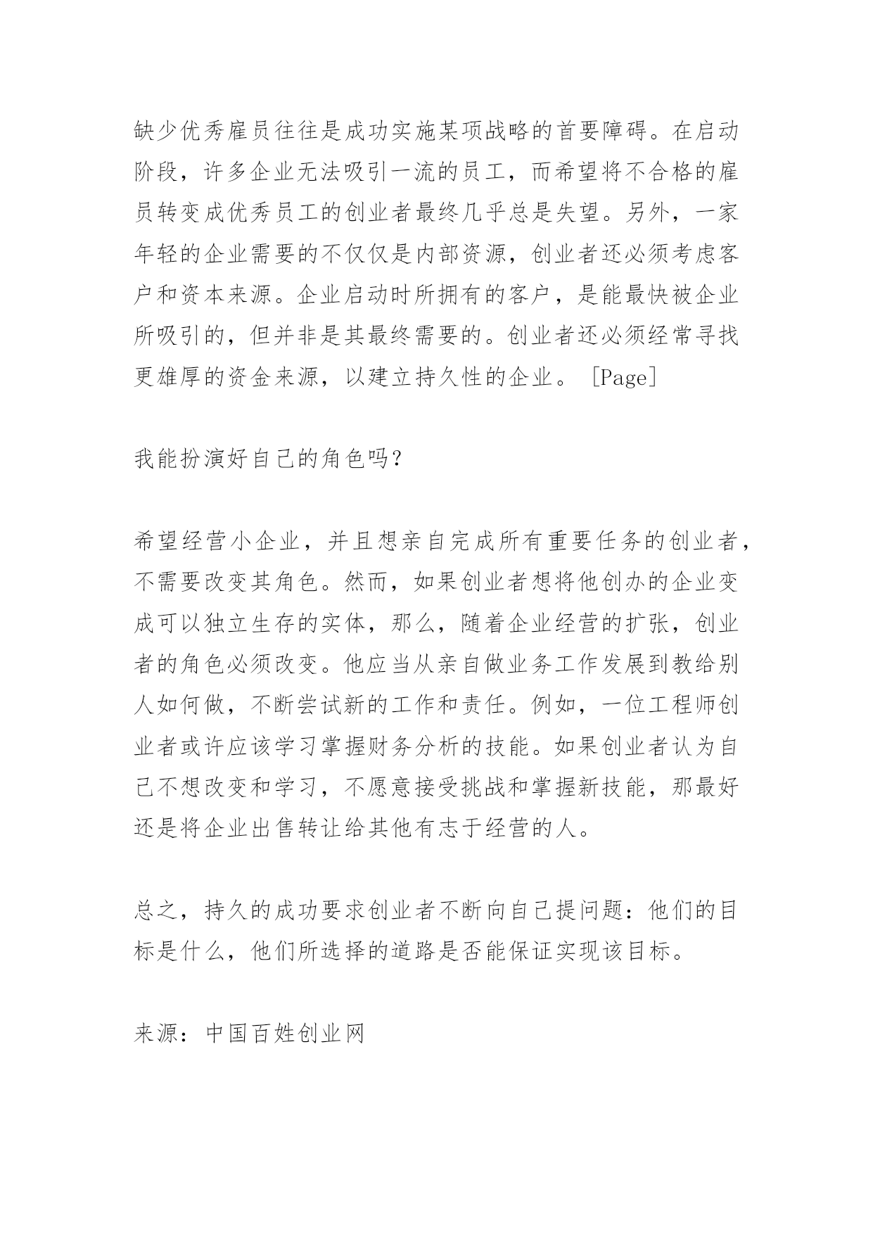 创业必须回答这些问题澄清目标:我要实现什么样的目标?创业者的个人目标与企业目标是密不可分的。创业者创建企业的目的是实现个人目标,所以创业者为企业确定目标之前,必须明确自己的个人目标,而且必须定期问自己这些目标是否发生了变化。许多创业者声称他们创建企业是为了实现独立和掌握自己的命运。这样的目标太模糊了。如果他们认真考虑此事,多数创业者都能确定更具体的目标,例如,获得施展艺术才华的机会,获得试验新技术的机会,过上丰富多彩的生活,或者渴望创建一家体现个人的深层价值观的机构,等等。在经济上,一些创业者想一夜致富;一些创业者希望得到一个令人满意的现金流量;还有一些创业者则盘算着先建立企业后出售企业,从中获取资本收益。那些希望建立可持续机构的创业者,不会把个人的经济回报作为优先考虑事项,他们可能不顾对方出价多少,都会拒绝其收购提议。我需要建立什么样的企业?一般说来,创业者的目标决定了企业的持续性和规模。对于那些生活型的创业者,他们只想赚取足够的现金来维持某种生活,所以企业规模不需要很大。而寻求获得资本收益的创业者却必须建立足够大的企业架构,保证企业的长期持续经营,从而最终出售企业,或使自己建立的企业能经受住技术换代、雇员和客户的更迭之后仍能不断更新。确定战略:我如何实现目标?许多创业者没有考虑长期战略就开展业务,以抓住短期机会。然而,成功的创业者很快就能实现从战术导向向战略导向的转变,并开始建立关键的能力和资源。对一家建立不久的年轻公司来说,最基本的问题是制定行之有效的战略,而不是解决招聘问题,设计控制体系,确立上下级关系,或者明确创建者的角色。如果企业的战略基础扎实,即使领导关系不明,领导不力,也照样能幸存,而复杂的控制体系和组织结构却无法弥补战略失误。创业者应该定期对其战略进行以下四种检测。此战略能否带来足够的利润和增长?一旦创业者制定了明确的战略,他们就必须确定这些战略是否能使企业盈利,并使企业扩展到一个理想的规模。如果企业无法盈利,且发展不令人满意,这时创业者必须采取根本性措施。他们必须去寻找新行业,或者在本领域内扩大规模或经营范围。战略是否有持续性?创业者必须面对的下一个问题是,其战略能否长期满足企业的需要。持续性的问题对那些一直在追赶新技术和法规变化或者其他变革浪潮的创业者尤其重要。弄潮的创业者在开始时会兴旺发达,可是一旦达到高潮,随着市场不平衡状态的消失,许多一度辉煌却从未发展特有能力或未能确立竞争地位的企业会随之消失。弄潮儿必须能够预见市场饱和、竞争激化以及下一轮浪潮。他们必须放弃仿效的做法,而应该采用新的、更持久的企业模式,或者以可观的价格出售自己高增长的企业,而不能幻想其模糊的长期前景。实施战略:我能实施此战略吗?创业者必须自问的第三个问题可能是最难回答的',因为它需要进行最坦诚的自我检查:我能实施此战略吗?好点子并不能保证优秀业绩。许多年轻的公司夭折,是因为创业者没能实施其战略。例如,企业可能资金用尽,创业者可能无法实现销售额或者无法完成订单。创业者必须对资源、组织能力及其个人角色三个领域进行检查,以评价其执行战略的能力。我有合适的资源和关系吗?缺少优秀雇员往往是成功实施某项战略的首要障碍。在启动阶段,许多企业无法吸引一流的员工,而希望将不合格的雇员转变成优秀员工的创业者最终几乎总是失望。另外,一家年轻的企业需要的不仅仅是内部资源,创业者还必须考虑客户和资本来源。企业启动时所拥有的客户,是能最快被企业所吸引的,但并非是其最终需要的。创业者还必须经常寻找更雄厚的资金来源,以建立持久性的企业。[Page]我能扮演好自己的角色吗?希望经营小企业,并且想亲自完成所有重要任务的创业者,不需要改变其角色。然而,如果创业者想将他创办的企业变成可以独立生存的实体,那么,随着企业经营的扩张,创业者的角色必须改变。他应当从亲自做业务工作发展到教给别人如何做,不断尝试新的工作和责任。例如,一位工程师创业者或许应该学习掌握财务分析的技能。如果创业者认为自己不想改变和学习,不愿意接受挑战和掌握新技能,那最好还是将企业出售转让给其他有志于经营的人。总之,持久的成功要求创业者不断向自己提问题:他们的目标是什么,他们所选择的道路是否能保证实现该目标。来源:中国百姓创业网