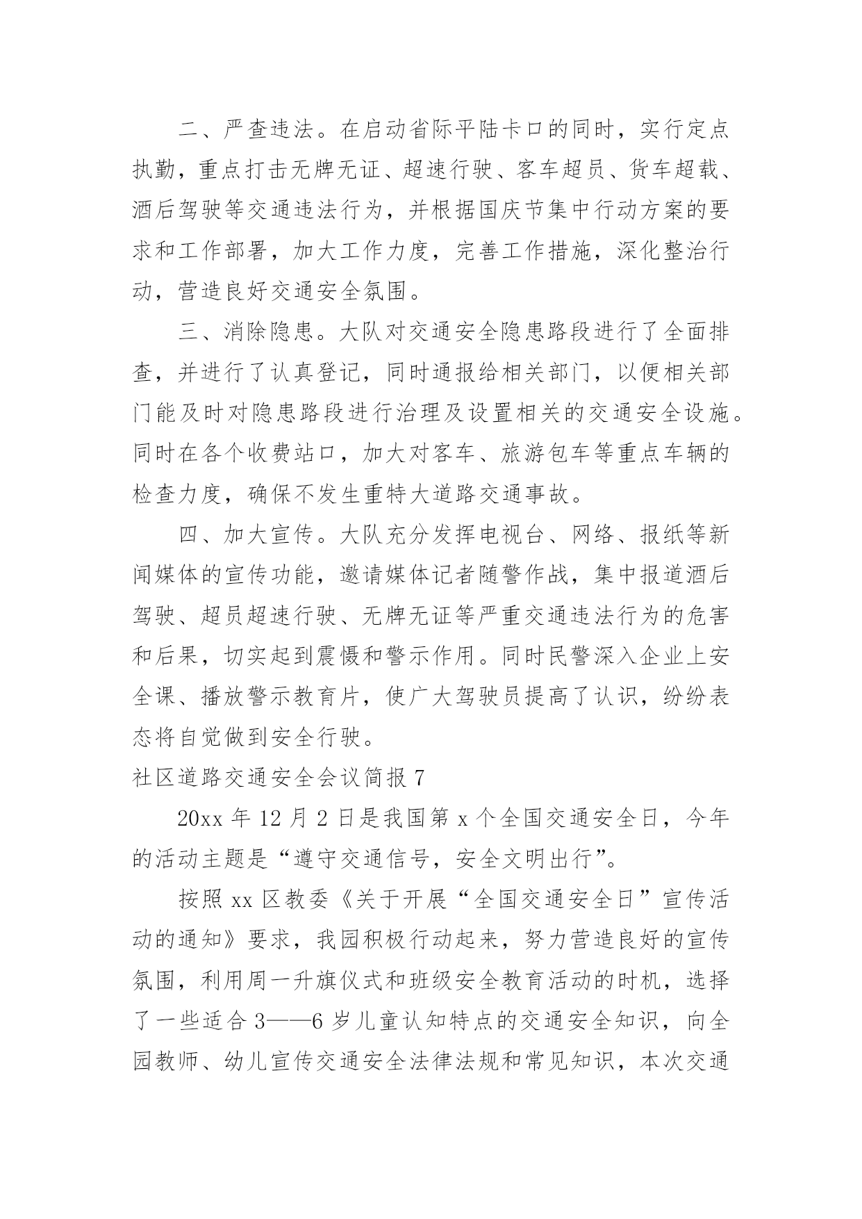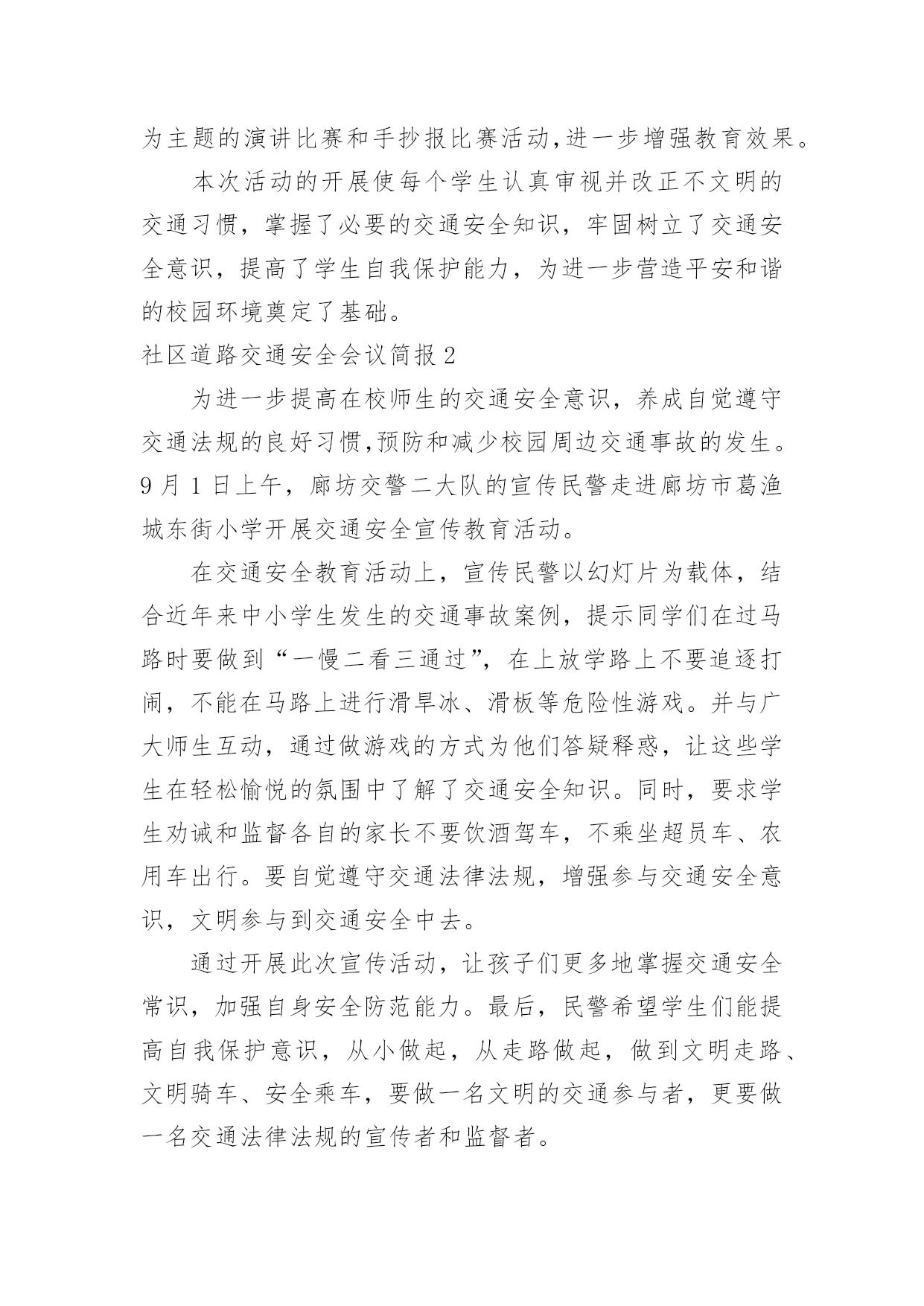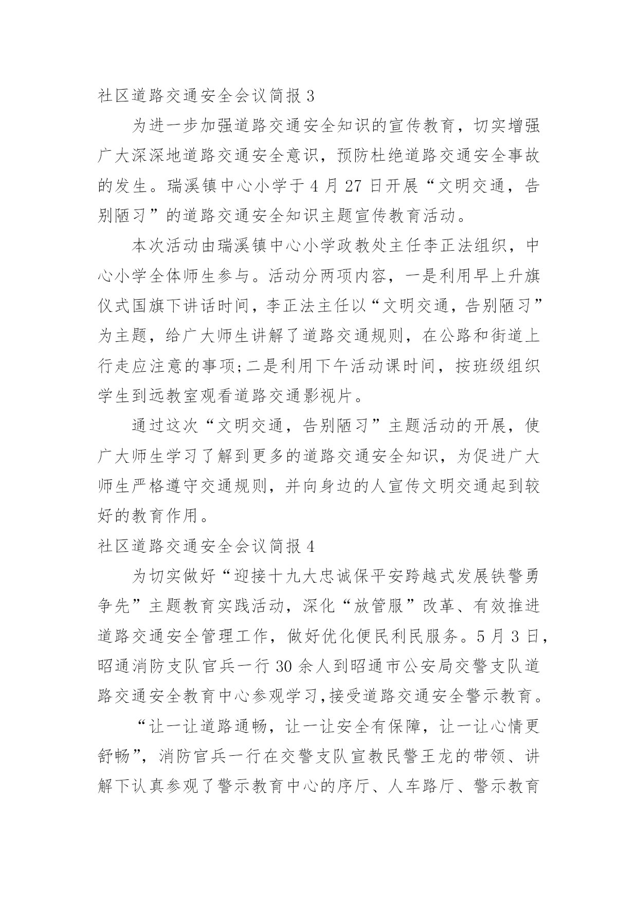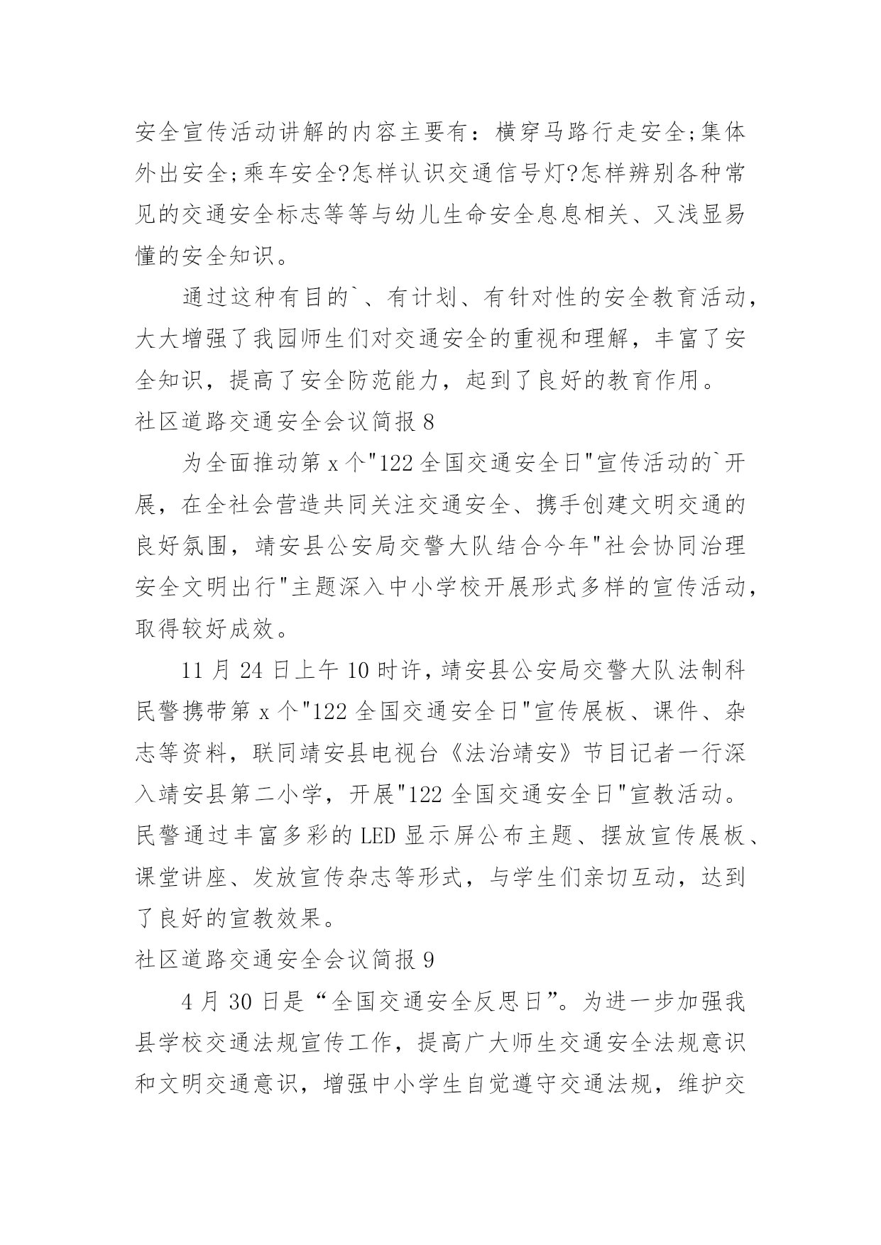 社区道路交通安全会议简报社区道路交通安全会议简报15篇在快速变化和不断变革的新时代,简报使用的情况越来越多,简报是指我们日常就一个题目而简单向听众简述报告内容的过程。你写简报时总是无从下手?以下是小编精心整理的社区道路交通安全会议简报,欢迎阅读,希望大家能够喜欢。社区道路交通安全会议简报1为了进一步构建“和谐校园”,培养学生的交通安全意识,提高自我防范能力,在“全国交通安全反思日”和五一假期来临之际,高青县寨子小学开展了“关爱生命、安全出行”为主题的教育活动。学校利用教室的多媒体让学生观看了各种安全教育宣传片,用真实的交通事故案例教育全体学生要遵守交通规则,珍惜生命;通过班队会、黑板报、宣传栏等形式,积极倡导与教育学生遵守公共秩序,保障交通安全,切实预防和减少道路交通事故的发生;通过与家长沟通交通安全等常识,要求家长也自觉遵守交通法规,加强对孩子的交通安全宣传教育,督促孩子过马路走人行道、过路口不闯信号灯、不在路上玩耍、不进入机动车道、接送孩子不乱停车,要到学校指定位置,自觉维护校门口的交通秩序,促进学生交通平安、永远祥和;进行了一次以“遵守交通规则,保障生命安全”为主题的演讲比赛和手抄报比赛活动,进一步增强教育效果。本次活动的开展使每个学生认真审视并改正不文明的交通习惯,掌握了必要的交通安全知识,牢固树立了交通安全意识,提高了学生自我保护能力,为进一步营造平安和谐的校园环境奠定了基础。社区道路交通安全会议简报2为进一步提高在校师生的交通安全意识,养成自觉遵守交通法规的良好习惯,预防和减少校园周边交通事故的发生。9月1日上午,廊坊交警二大队的宣传民警走进廊坊市葛渔城东街小学开展交通安全宣传教育活动。在交通安全教育活动上,宣传民警以幻灯片为载体,结合近年来中小学生发生的交通事故案例,提示同学们在过马路时要做到“一慢二看三通过”,在上放学路上不要追逐打闹,不能在马路上进行滑旱冰、滑板等危险性游戏。并与广大师生互动,通过做游戏的方式为他们答疑释惑,让这些学生在轻松愉悦的氛围中了解了交通安全知识。同时,要求学生劝诫和监督各自的家长不要饮酒驾车,不乘坐超员车、农用车出行。要自觉遵守交通法律法规,增强参与交通安全意识,文明参与到交通安全中去。通过开展此次宣传活动,让孩子们更多地掌握交通安全常识,加强自身安全防范能力。最后,民警希望学生们能提高自我保护意识,从小做起,从走路做起,做到文明走路、文明骑车、安全乘车,要做一名文明的交通参与者,更要做一名交通法律法规的宣传者和监督者。社区道路交通安全会议简报3为进一步加强道路交通安全知识的宣传教育,切实增强广大深深地道路交通安全意识,预防杜绝道路交通安全事故的发生。瑞溪镇中心小学于4月27日开展“文明交通,告别陋习”的道路交通安全知识主题宣传教育活动。本次活动由瑞溪镇中心小学政教处主任李正法组织,中心小学全体师生参与。活动分两项内容,一是利用早上升旗仪式国旗下讲话时间,李正法主任以“文明交通,告别陋习”为主题,给广大师生讲解了道路交通规则,在公路和街道上行走应注意的事项;二是利用下午活动课时间,按班级组织学生到远教室观看道路交通影视片。通过这次“文明交通,告别陋习”主题活动的开展,使广大师生学习了解到更多的道路交通安全知识,为促进广大师生严格遵守交通规则,并向身边的人宣传文明交通起到较好的教育作用。社区道路交通安全会议简报4为切实做好“迎接十九大忠诚保平安跨越式发展铁警勇争先”主题教育实践活动,深化“放管服”改革、有效推进道路交通安全管理工作,做好优化便民利民服务。5月3日,昭通消防支队官兵一行30余人到昭通市公安局交警支队道路交通安全教育中心参观学习,接受道路交通安全警示教育。“让一让道路通畅,让一让安全有保障,让一让心情更舒畅”,消防官兵一行在交警支队宣教民警王龙的带领、讲解下认真参观了警示教育中心的序厅、人车路厅、警示教育厅、安全行车影视播放及审验厅、安全教育厅及感悟生命厅五个功能展区,展览有实物、图片、文字、影音等,通过观看交通安全警示教育片,潜移默化中熟悉了安全出行常识。在交通标志标线区,民警向官兵们耐心讲解各种道路交通标识的意义,通过动手实践操作交通标牌、标识活动翻转牌,醉酒驾驶体验,更深入了解更多的交通安全知识,鼓励大家做个合格驾驶员、义务的交通安全宣传员。最后,王警官还运用真实案例剖析了不文明行车交通事故发生的原因,向消防官兵介绍了不遵守交通规则带来的危害,进一步提升了大家的自我安全责任感,为源头预防道路交通事故的发生起到了积极推动作用,为牢固交通安全防线打下了基础。社区道路交通安全会议简报5市地方海事局多措并举确保冬季水上交通安全一是认真落实各项防范措施和应急预案,督促水运企业、港口、渡口、施工单位切实做好防雾、防风、防冻等各项准备工作。二是深入开展打击水上交通非法违法行为专