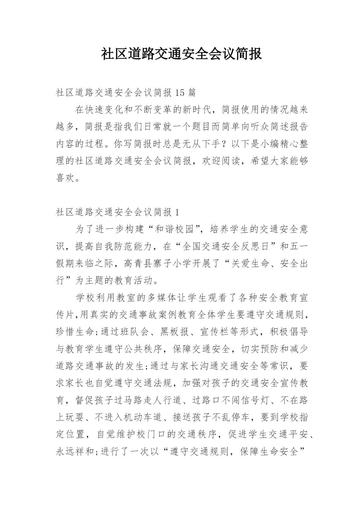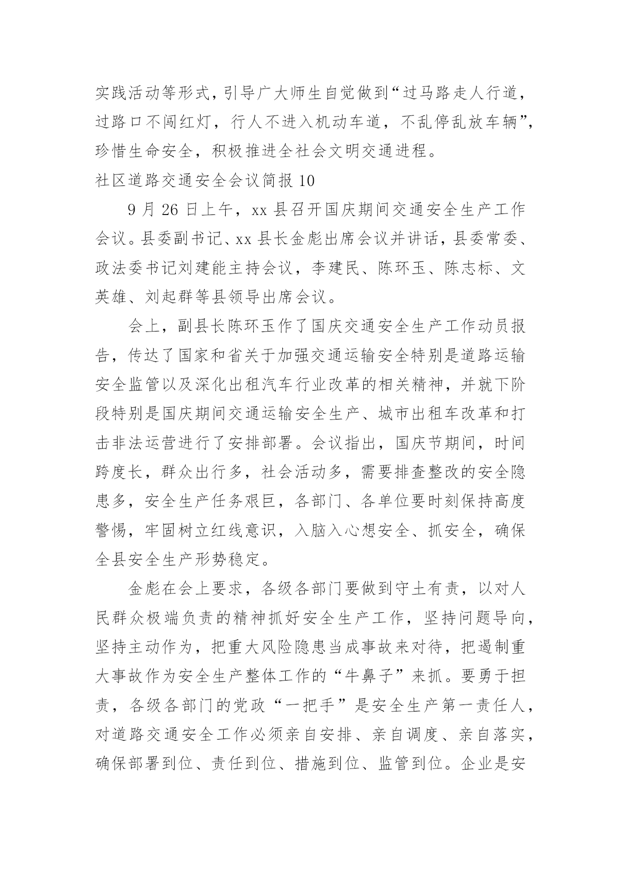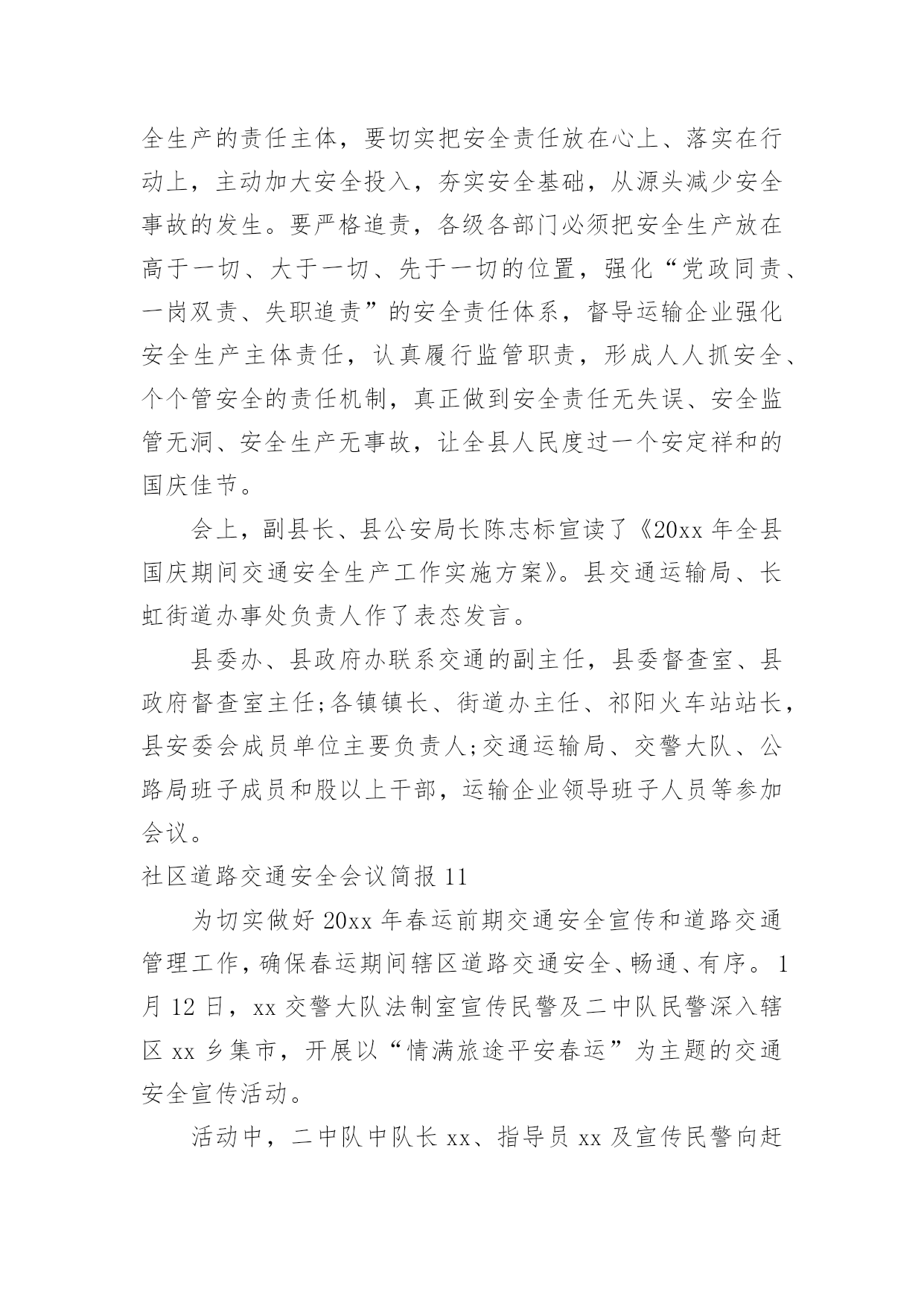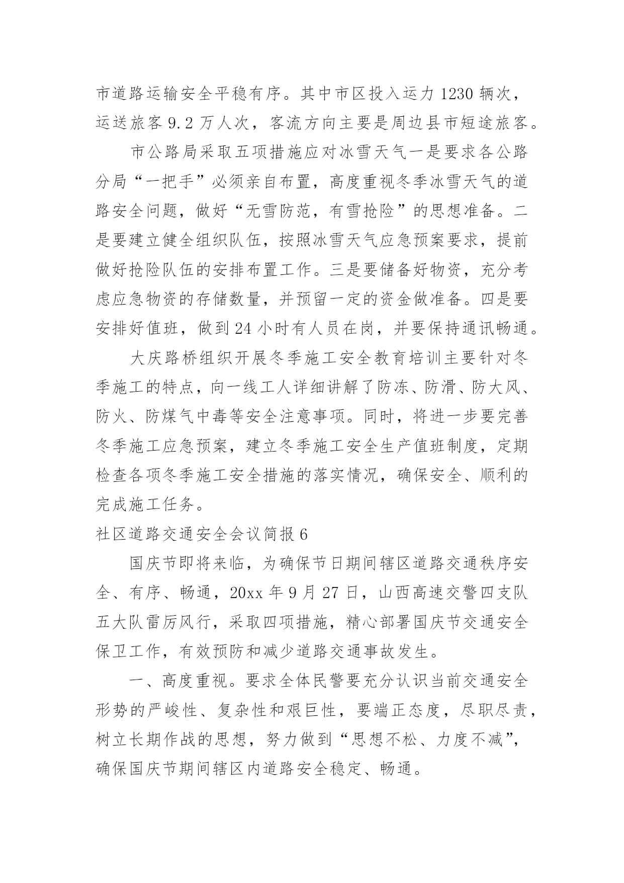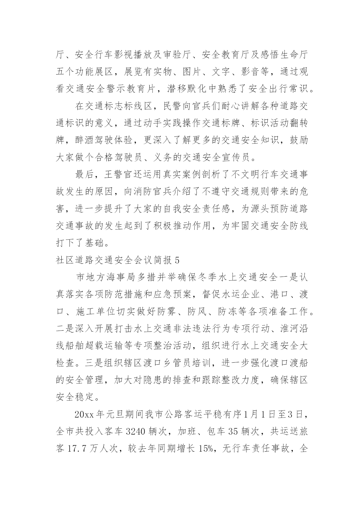 社区道路交通安全会议简报社区道路交通安全会议简报15篇在快速变化和不断变革的新时代,简报使用的情况越来越多,简报是指我们日常就一个题目而简单向听众简述报告内容的过程。你写简报时总是无从下手?以下是小编精心整理的社区道路交通安全会议简报,欢迎阅读,希望大家能够喜欢。社区道路交通安全会议简报1为了进一步构建“和谐校园”,培养学生的交通安全意识,提高自我防范能力,在“全国交通安全反思日”和五一假期来临之际,高青县寨子小学开展了“关爱生命、安全出行”为主题的教育活动。学校利用教室的多媒体让学生观看了各种安全教育宣传片,用真实的交通事故案例教育全体学生要遵守交通规则,珍惜生命;通过班队会、黑板报、宣传栏等形式,积极倡导与教育学生遵守公共秩序,保障交通安全,切实预防和减少道路交通事故的发生;通过与家长沟通交通安全等常识,要求家长也自觉遵守交通法规,加强对孩子的交通安全宣传教育,督促孩子过马路走人行道、过路口不闯信号灯、不在路上玩耍、不进入机动车道、接送孩子不乱停车,要到学校指定位置,自觉维护校门口的交通秩序,促进学生交通平安、永远祥和;进行了一次以“遵守交通规则,保障生命安全”为主题的演讲比赛和手抄报比赛活动,进一步增强教育效果。本次活动的开展使每个学生认真审视并改正不文明的交通习惯,掌握了必要的交通安全知识,牢固树立了交通安全意识,提高了学生自我保护能力,为进一步营造平安和谐的校园环境奠定了基础。社区道路交通安全会议简报2为进一步提高在校师生的交通安全意识,养成自觉遵守交通法规的良好习惯,预防和减少校园周边交通事故的发生。9月1日上午,廊坊交警二大队的宣传民警走进廊坊市葛渔城东街小学开展交通安全宣传教育活动。在交通安全教育活动上,宣传民警以幻灯片为载体,结合近年来中小学生发生的交通事故案例,提示同学们在过马路时要做到“一慢二看三通过”,在上放学路上不要追逐打闹,不能在马路上进行滑旱冰、滑板等危险性游戏。并与广大师生互动,通过做游戏的方式为他们答疑释惑,让这些学生在轻松愉悦的氛围中了解了交通安全知识。同时,要求学生劝诫和监督各自的家长不要饮酒驾车,不乘坐超员车、农用车出行。要自觉遵守交通法律法规,增强参与交通安全意识,文明参与到交通安全中去。通过开展此次宣传活动,让孩子们更多地掌握交通安全常识,加强自身安全防范能力。最后,民警希望学生们能提高自我保护意识,从小做起,从走路做起,做到文明走路、文明骑车、安全乘车,要做一名文明的交通参与者,更要做一名交通法律法规的宣传者和监督者。社区道路交通安全会议简报3为进一步加强道路交通安全知识的宣传教育,切实增强广大深深地道路交通安全意识,预防杜绝道路交通安全事故的发生。瑞溪镇中心小学于4月27日开展“文明交通,告别陋习”的道路交通安全知识主题宣传教育活动。本次活动由瑞溪镇中心小学政教处主任李正法组织,中心小学全体师生参与。活动分两项内容,一是利用早上升旗仪式国旗下讲话时间,李正法主任以“文明交通,告别陋习”为主题,给广大师生讲解了道路交通规则,在公路和街道上行走应注意的事项;二是利用下午活动课时间,按班级组织学生到远教室观看道路交通影视片。通过这次“文明交通,告别陋习”主题活动的开展,使广大师生学习了解到更多的道路交通安全知识,为促进广大师生严格遵守交通规则,并向身边的人宣传文明交通起到较好的教育作用。社区道路交通安全会议简报4为切实做好“迎接十九大忠诚保平安跨越式发展铁警勇争先”主题教育实践活动,深化“放管服”改革、有效推进道路交通安全管理工作,做好优化便民利民服务。5月3日,昭通消防支队官兵一行30余人到昭通市公安局交警支队道路交通安全教育中心参观学习,接受道路交通安全警示教育。“让一让道路通畅,让一让安全有保障,让一让心情更舒畅”,消防官兵一行在交警支队宣教民警王龙的带领、讲解下认真参观了警示教育中心的序厅、人车路厅、警示教育厅、安全行车影视播放及审验厅、安全教育厅及感悟生命厅五个功能展区,展览有实物、图片、文字、影音等,通过观看交通安全警示教育片,潜移默化中熟悉了安全出行常识。在交通标志标线区,民警向官兵们耐心讲解各种道路交通标识的意义,通过动手实践操作交通标牌、标识活动翻转牌,醉酒驾驶体验,更深入了解更多的交通安全知识,鼓励大家做个合格驾驶员、义务的交通安全宣传员。最后,王警官还运用真实案例剖析了不文明行车交通事故发生的原因,向消防官兵介绍了不遵守交通规则带来的危害,进一步提升了大家的自我安全责任感,为源头预防道路交通事故的发生起到了积极推动作用,为牢固交通安全防线打下了基础。社区道路交通安全会议简报5市地方海事局多措并举确保冬季水上交通安全一是认真落实各项防范措施和应急预案,督促水运企业、港口、渡口、施工单位切实做好防雾、防风、防冻等各项准备工作。二是深入开展打击水上交通非法违法行为专